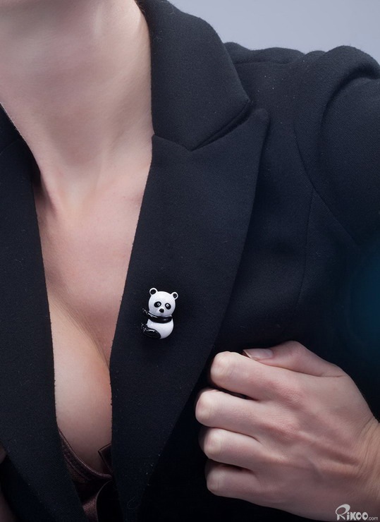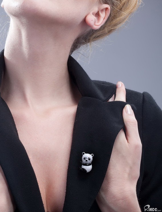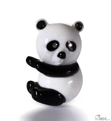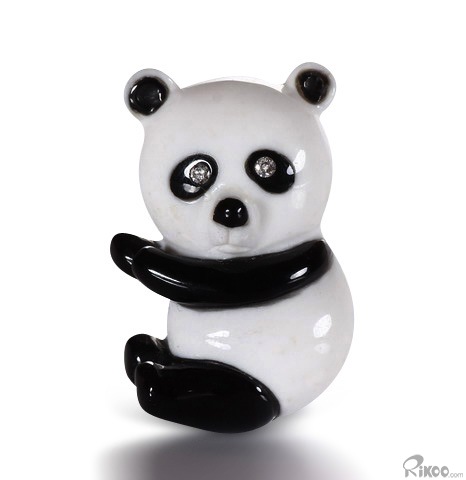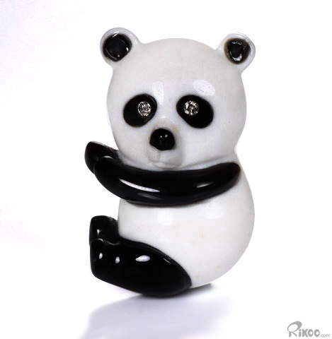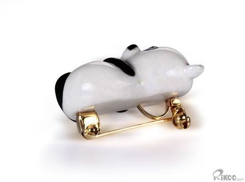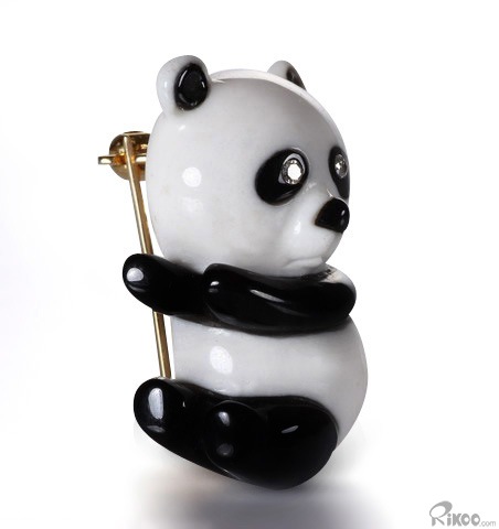 1.1" White Jade & Black Obsidian Carved Panda Brooch, Solid Gold, Diamond Eyes, Crystal Healing