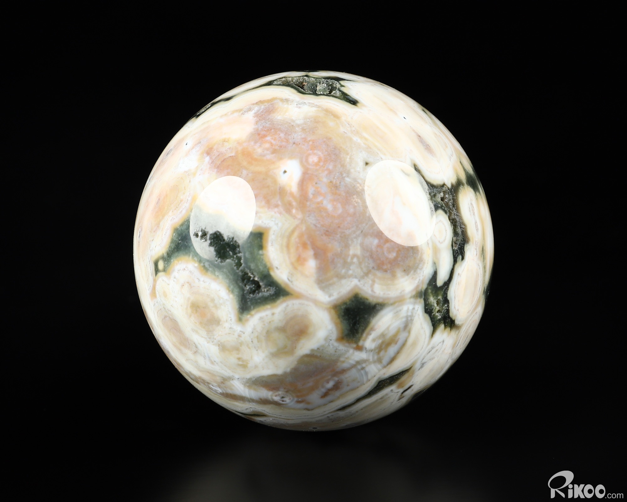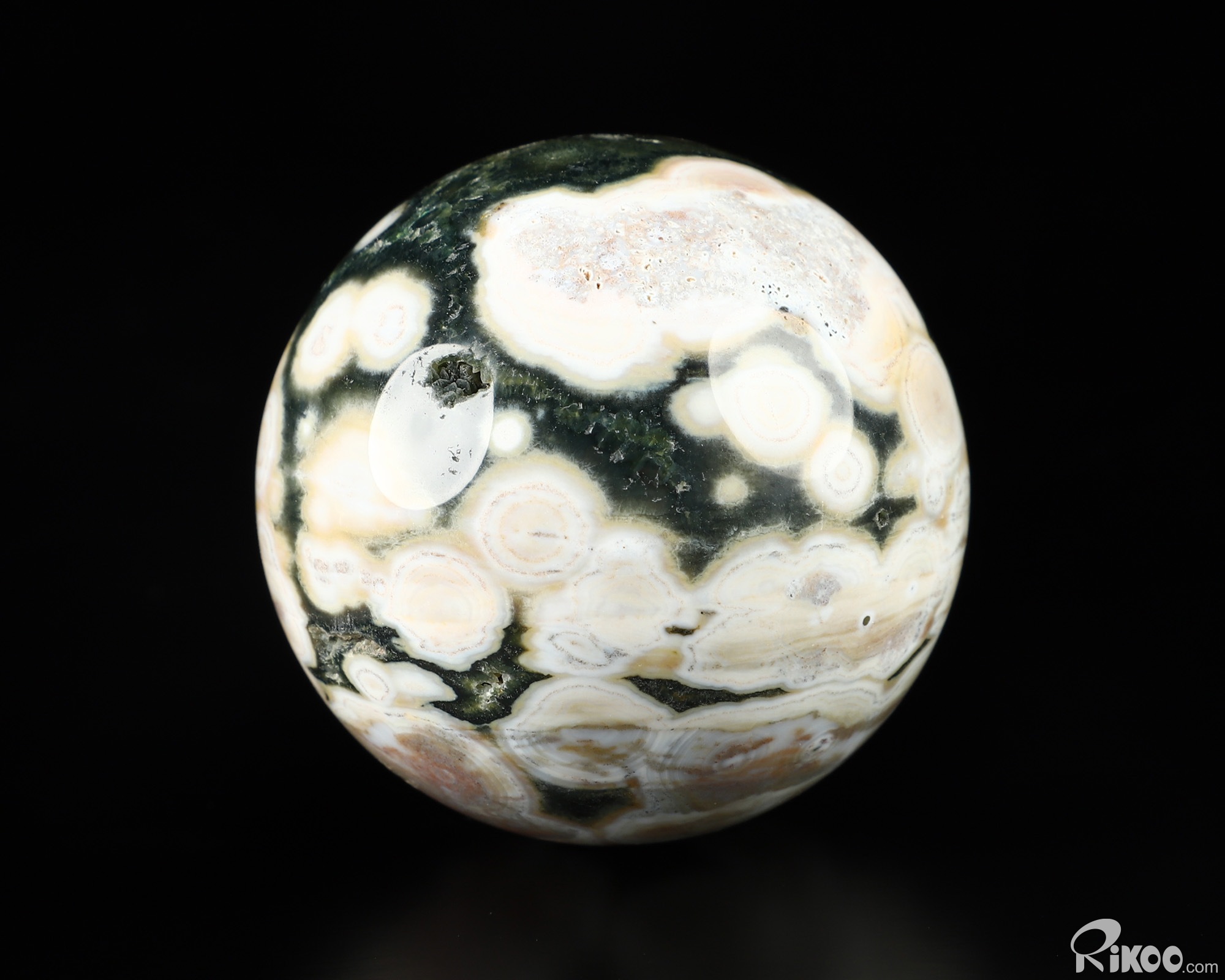 Another exceptional quality of Ocean Jasper is translucency. Many specimens are opaque and still very beautiful while others, when held in front of a strong light source, display what can only be described as another world! When viewed in front of a bright light the translucent, clear, or just foggy background illuminates and displays the contrasting solid perfect circles –the orbs- which then reveal exactly why Ocean Jasper is sometimes called "Fish Eye Jasper". These solid, soft looking spheres appear suspended in the illuminated quartz, and they can make one tempted to reach in and try to touch them!