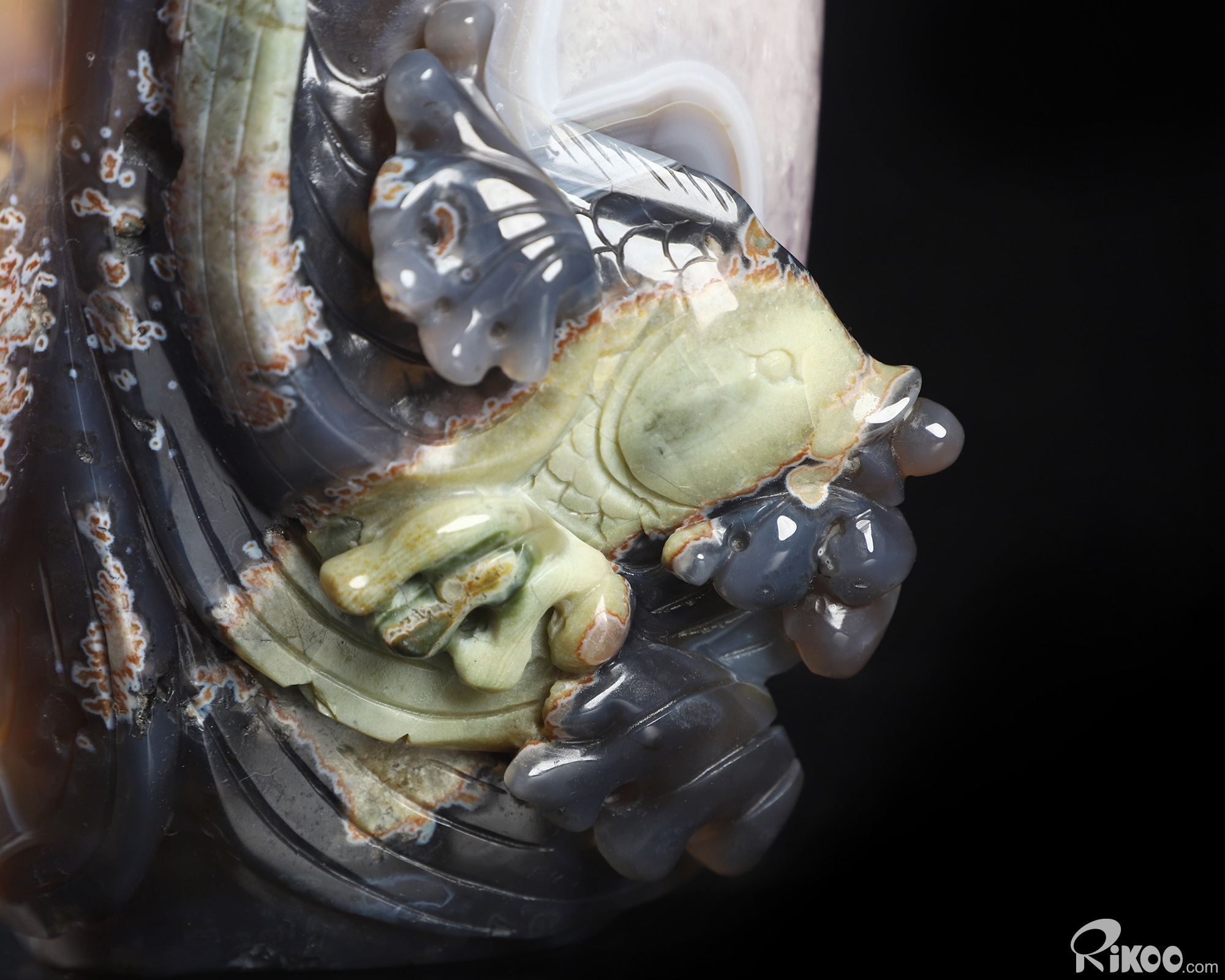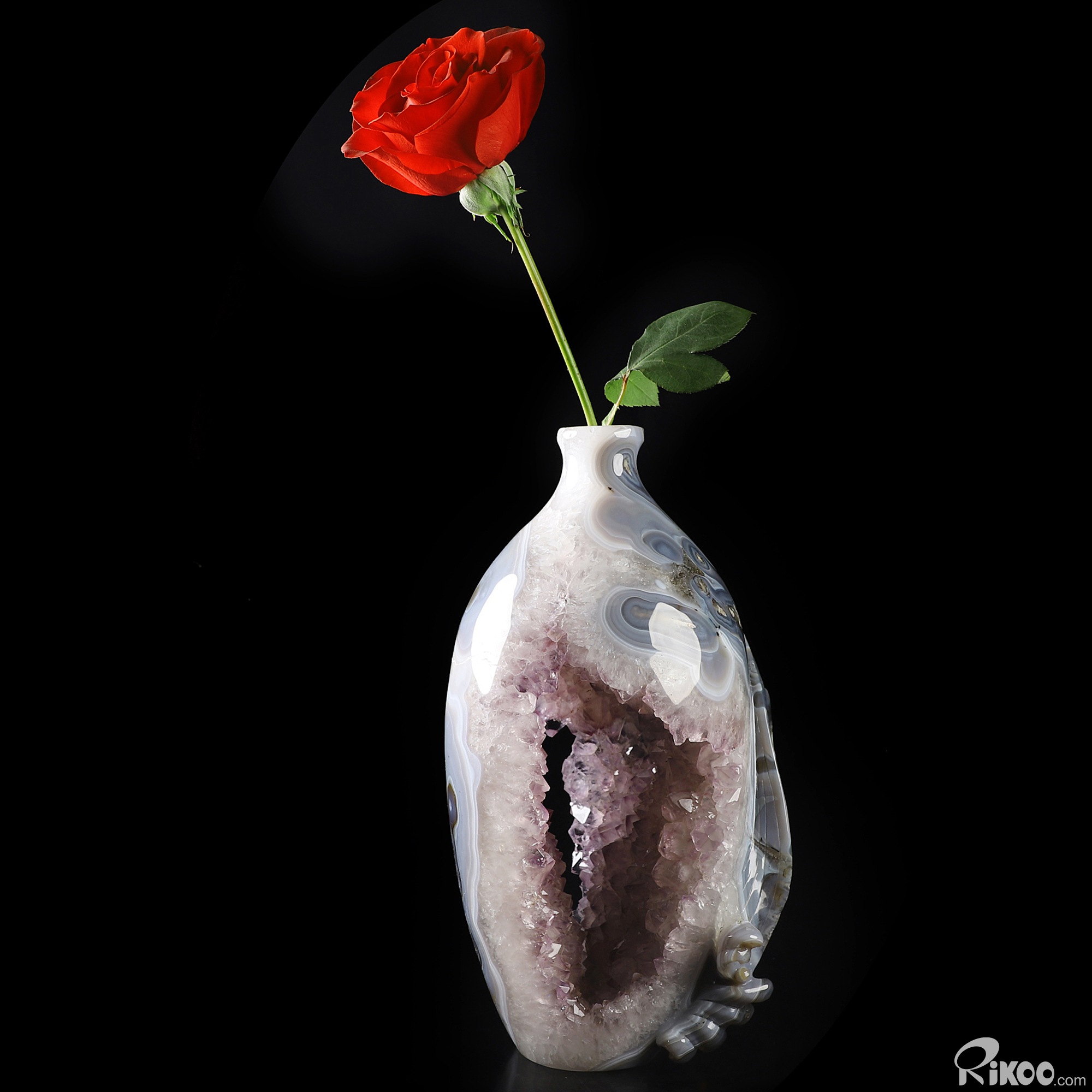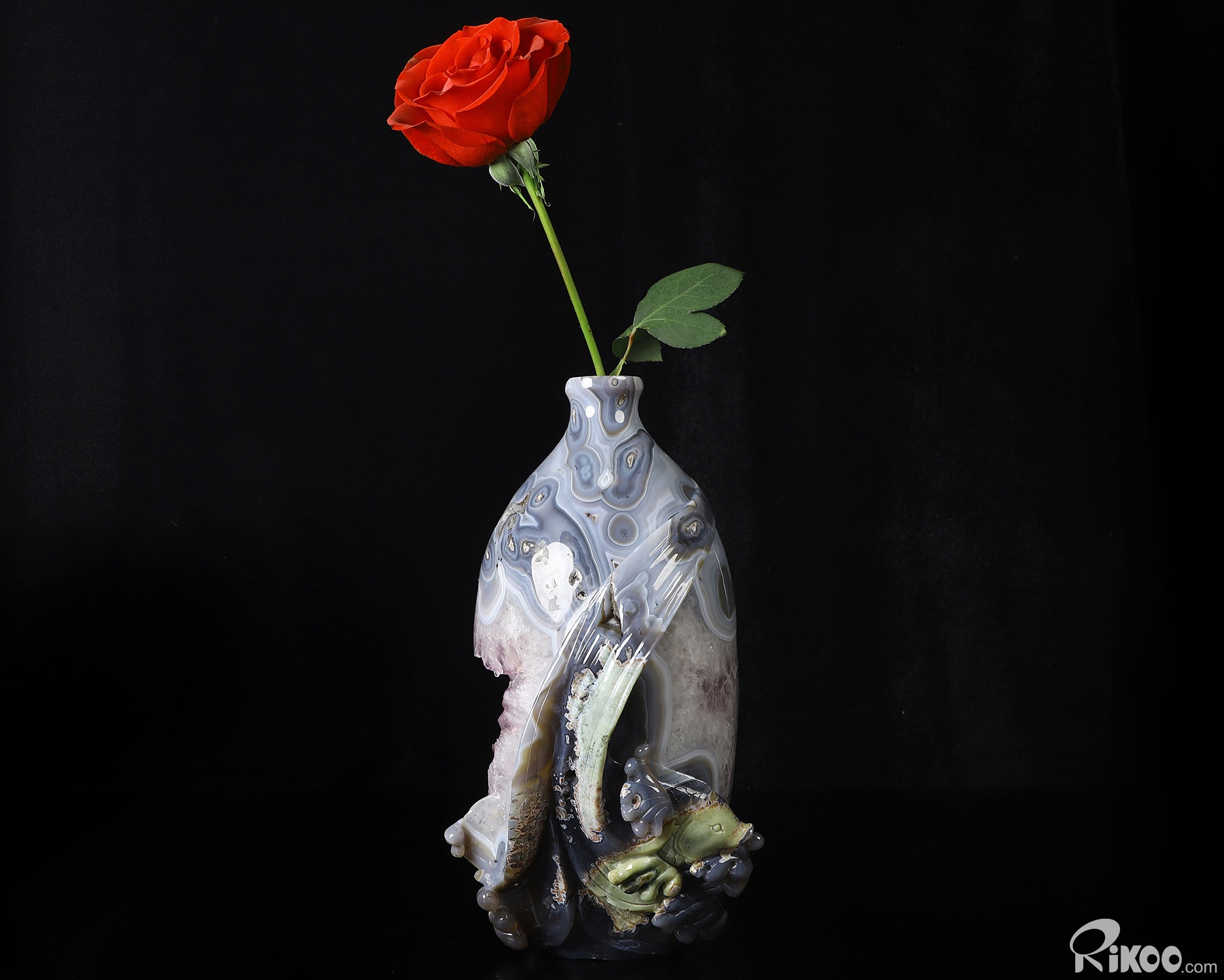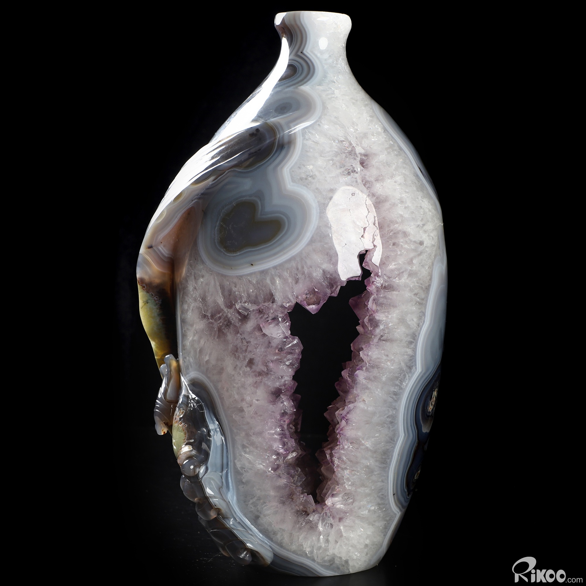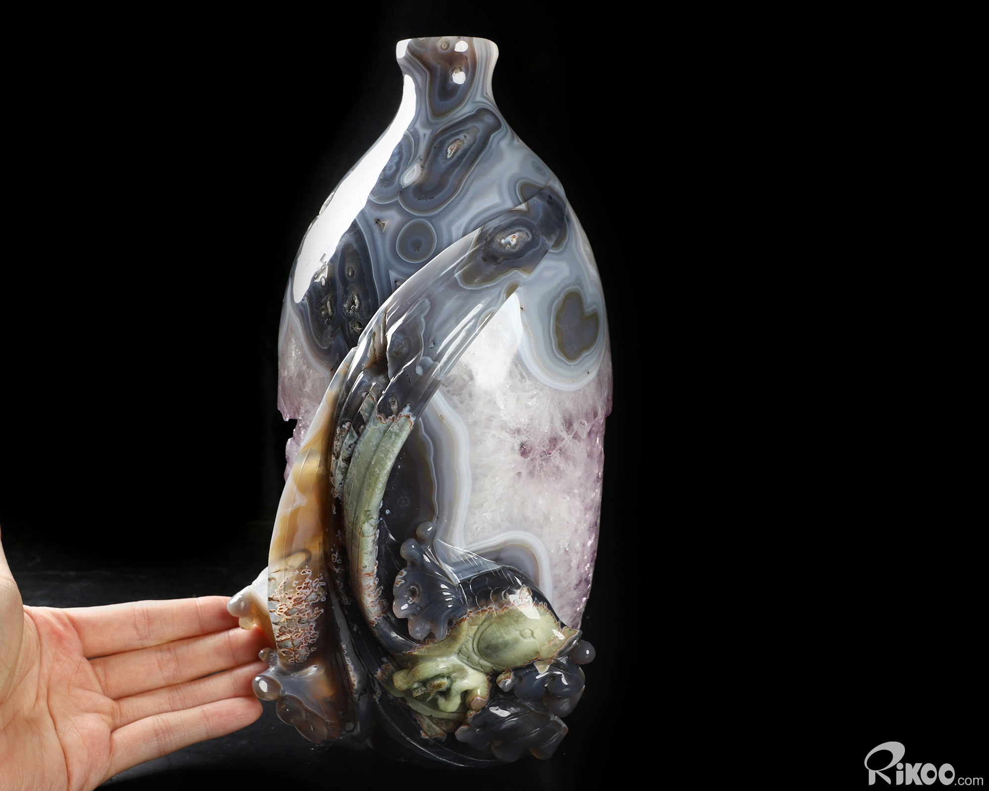 Geode 10.4" Agate Amethyst Geode Hand Carved Crystal Fish & Waves Vase Sculpture, Crystal Healing