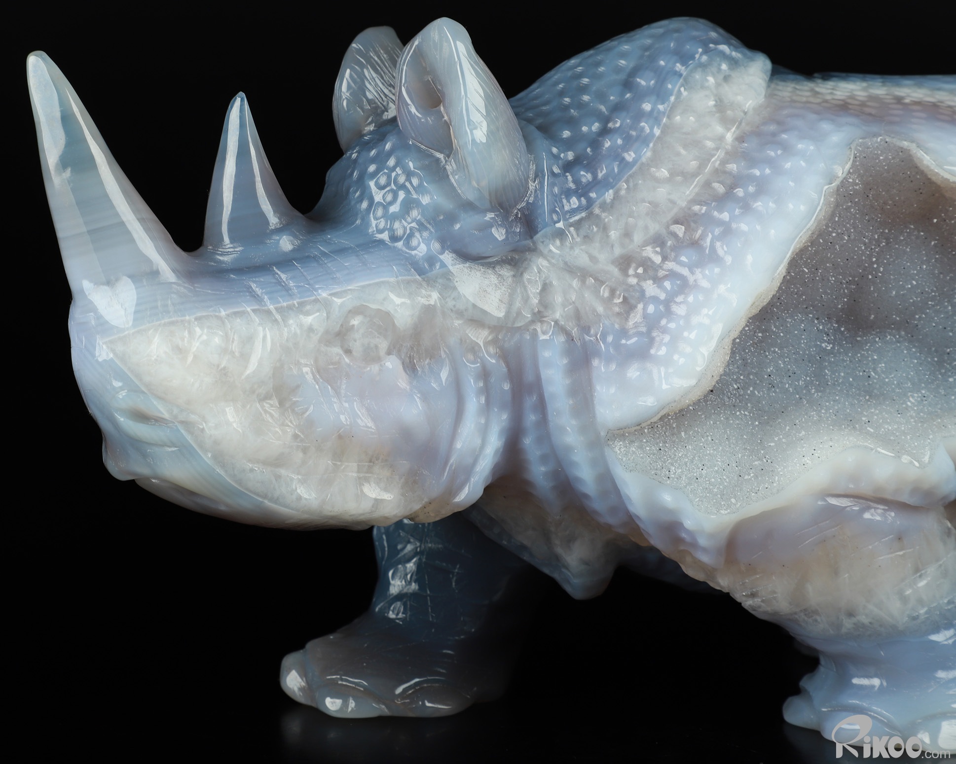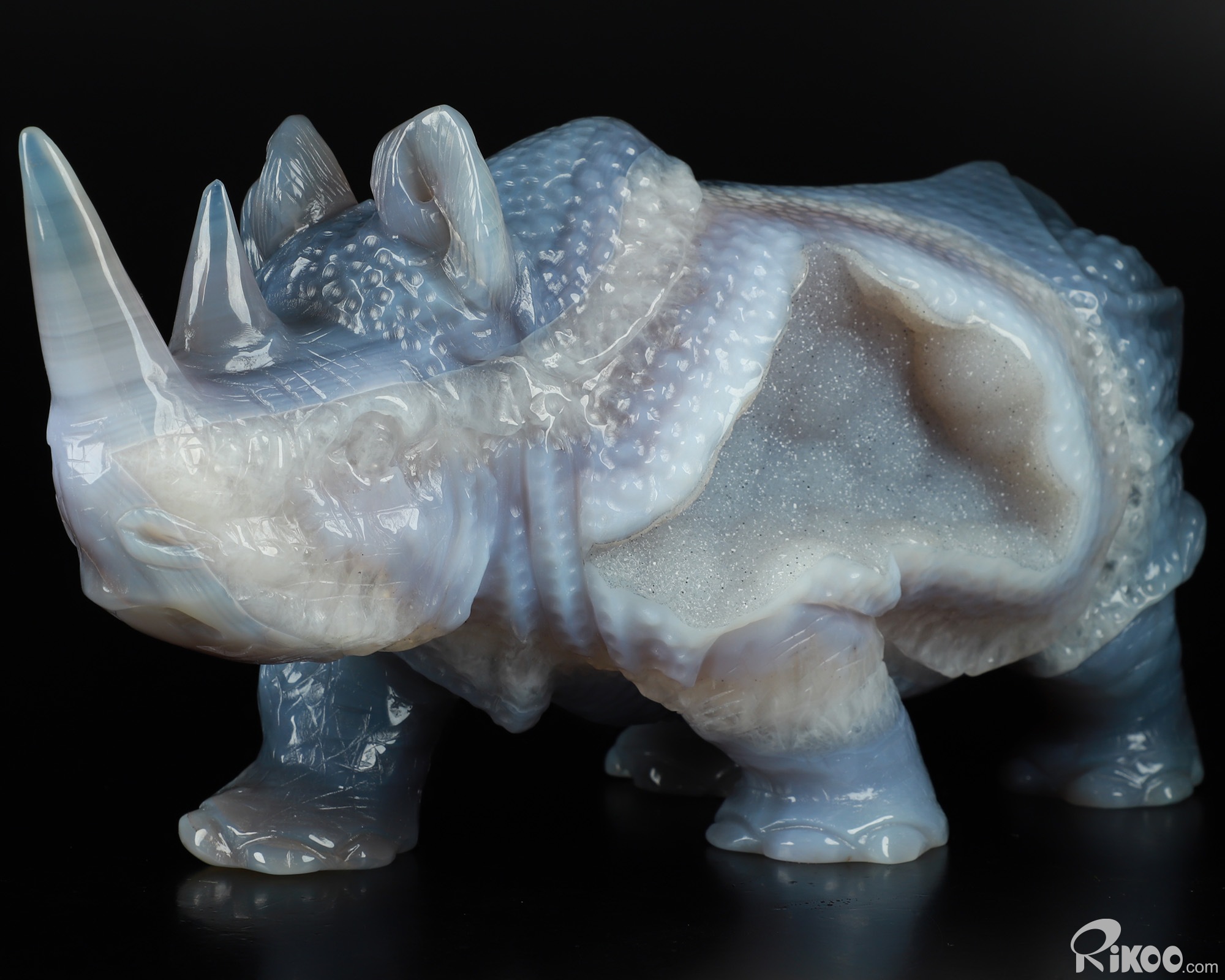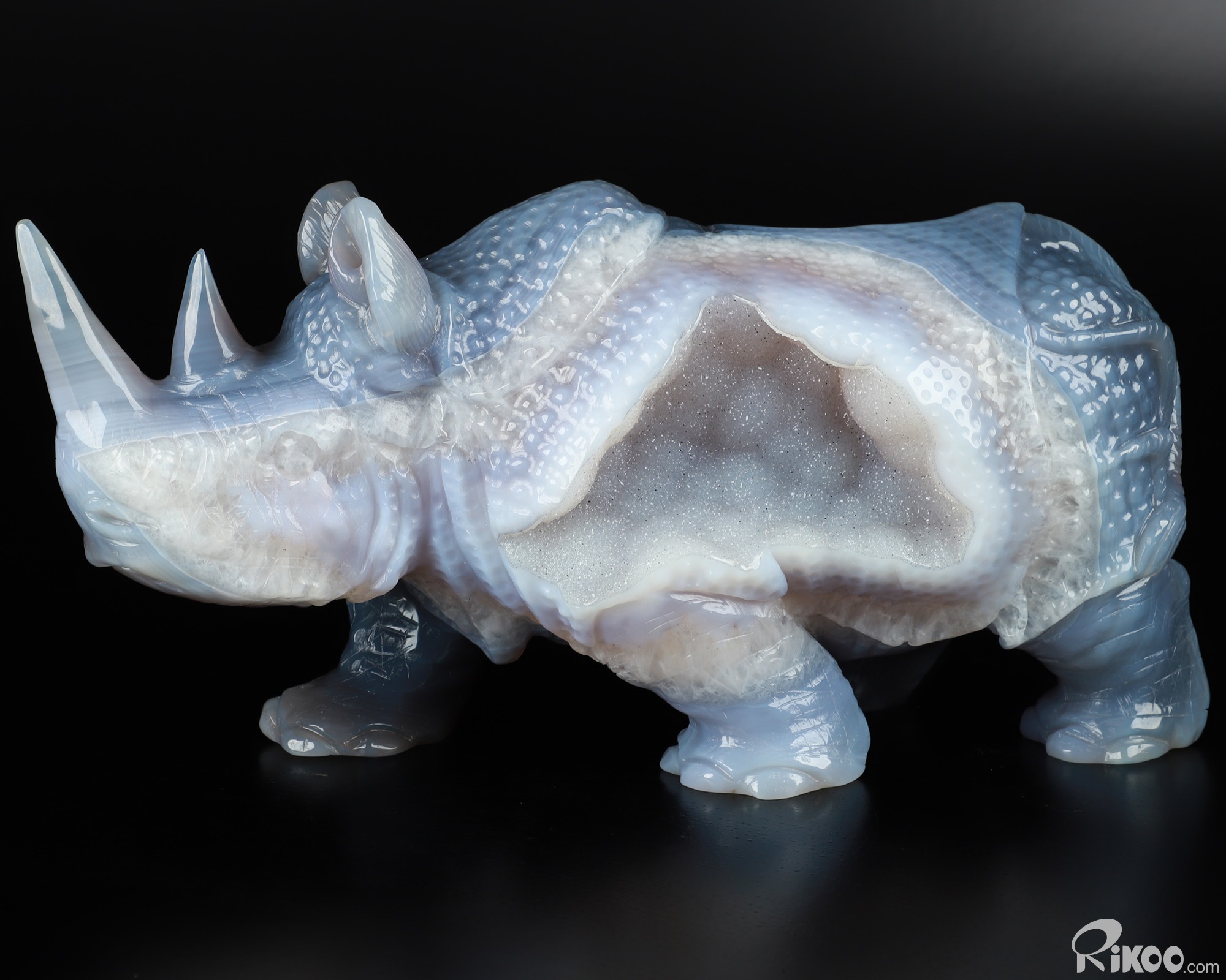 You are looking at a Agate Geode Rhinoceros. The Rhinoceros is 11.4 inches long from front to back.