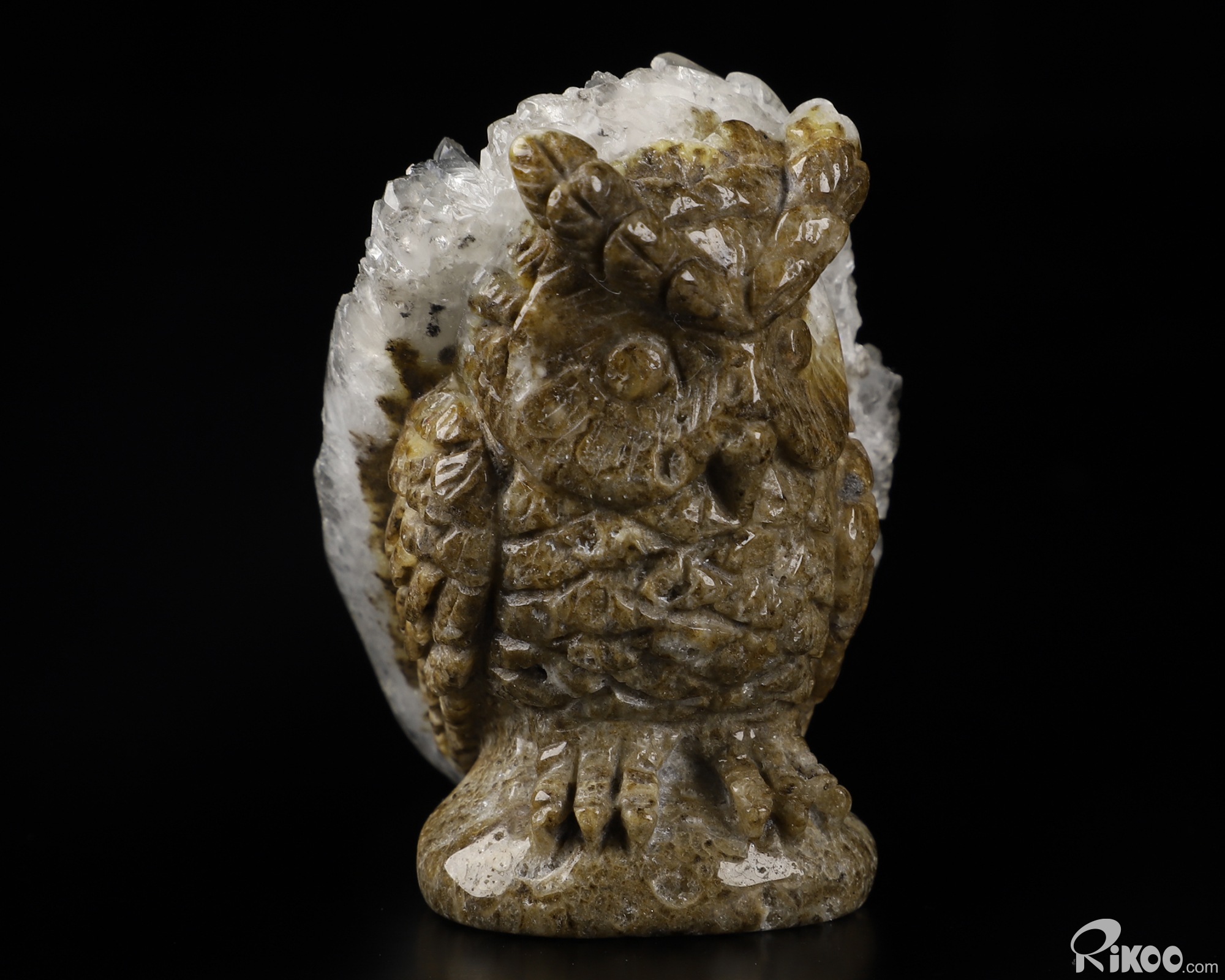 You are looking at a Quartz rock druse Owl. The Owl is 2.1 inches long from top to bottom.