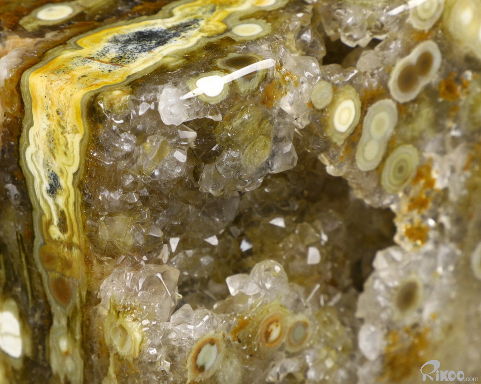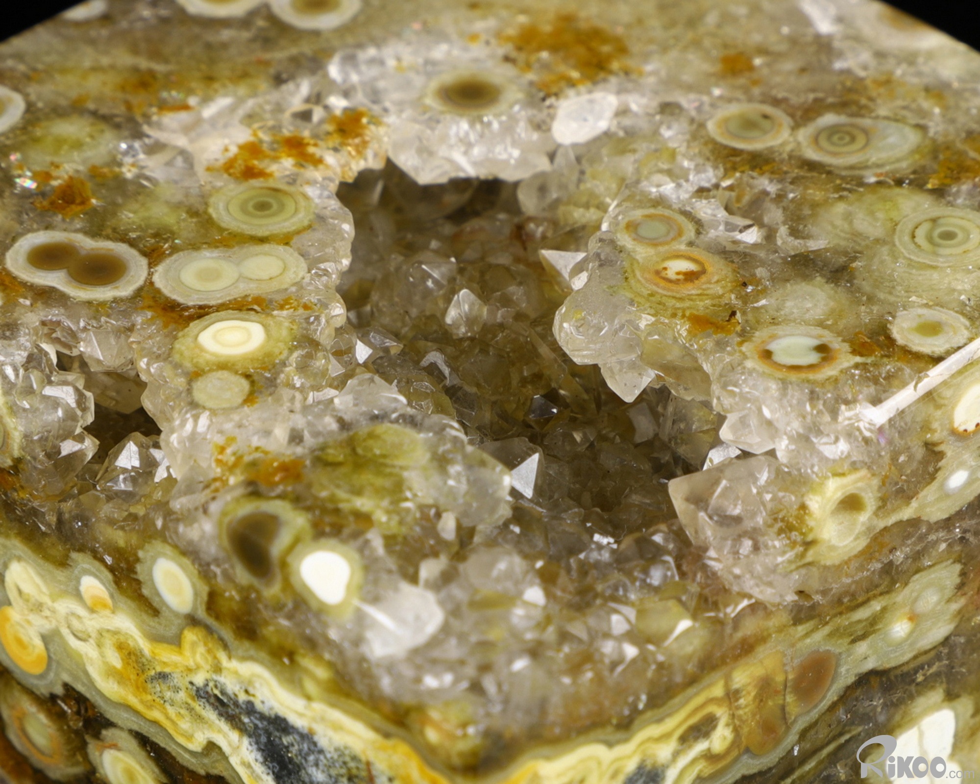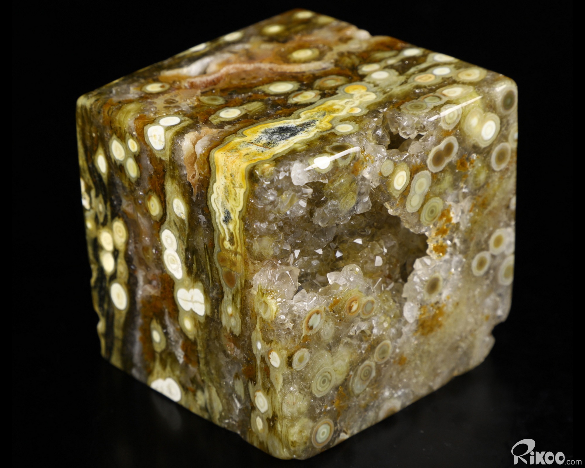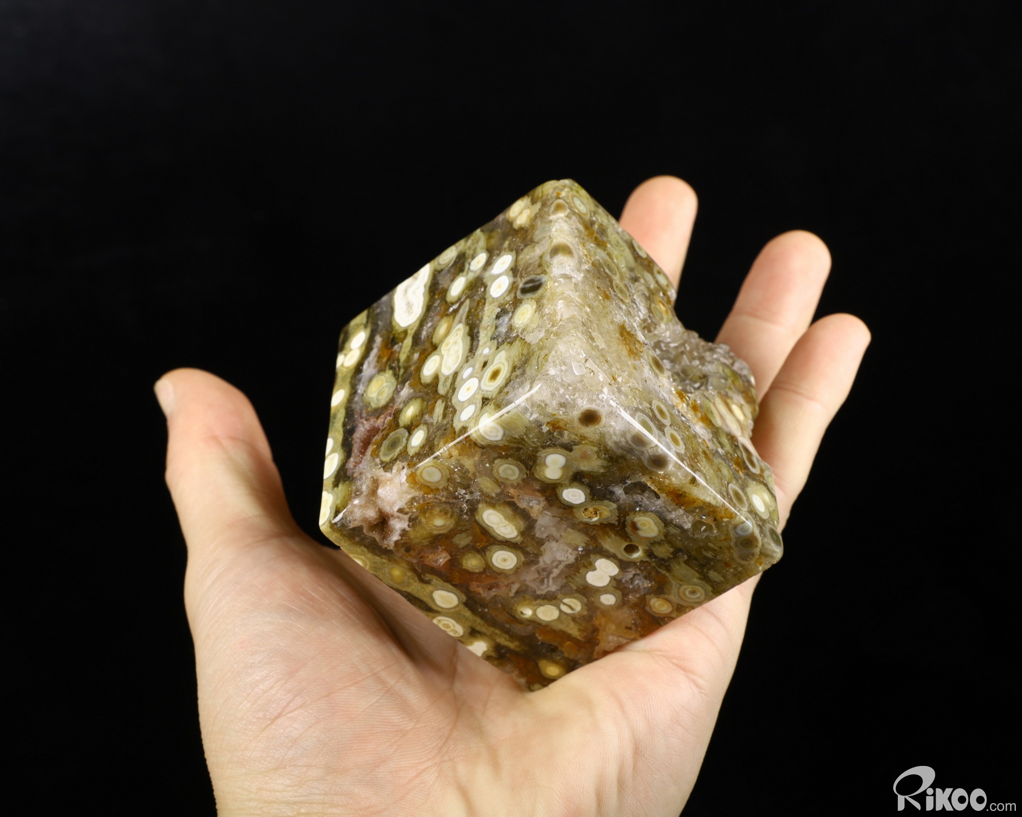 Another exceptional quality of Ocean Jasper is translucency. Many specimens are opaque and still very beautiful while others, when held in front of a strong light source, display what can only be described as another world! When viewed in front of a bright light the translucent, clear, or just foggy background illuminates and displays the contrasting solid perfect circles –the orbs- which then reveal exactly why Ocean Jasper is sometimes called "Fish Eye Jasper". These solid, soft looking spheres appear suspended in the illuminated quartz, and they can make one tempted to reach in and try to touch them!
