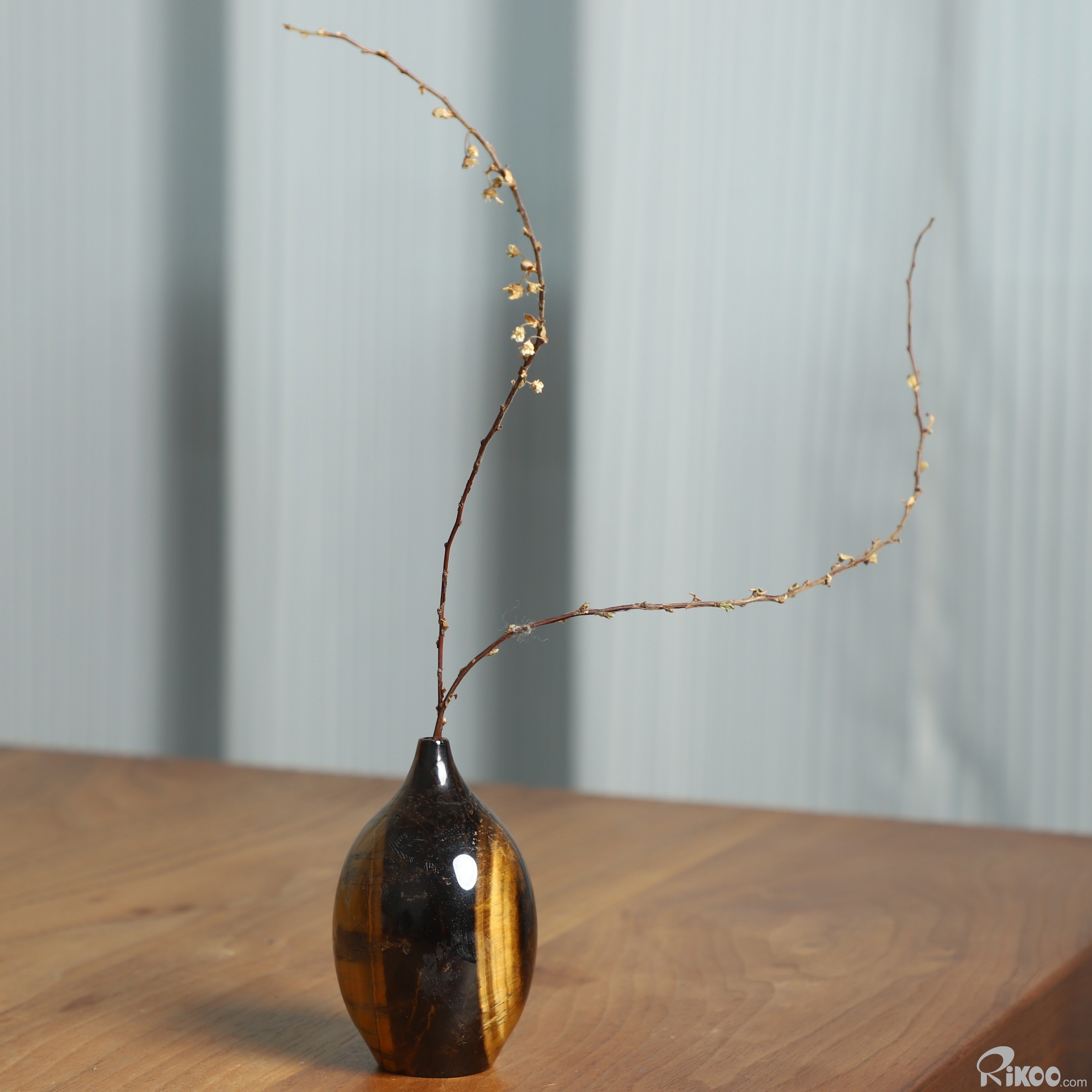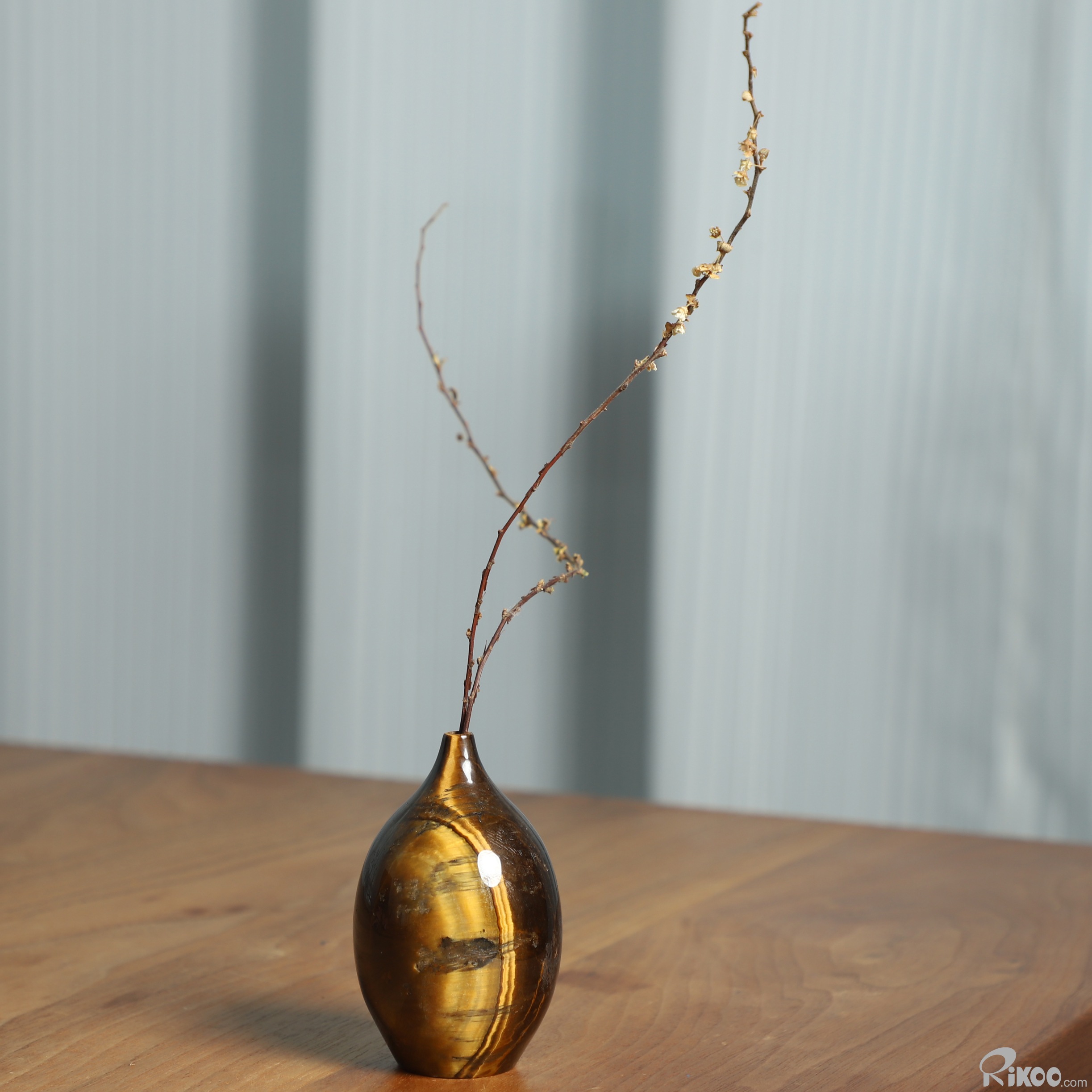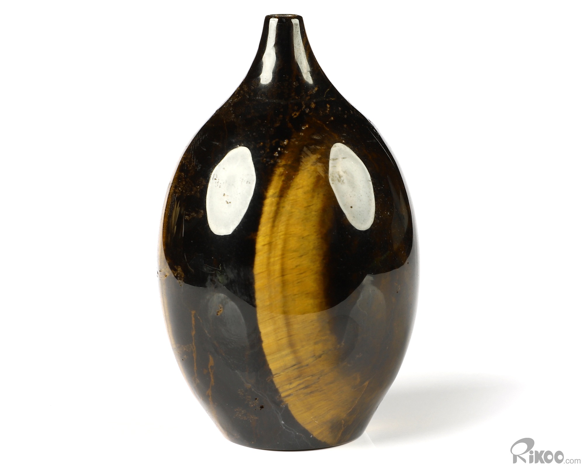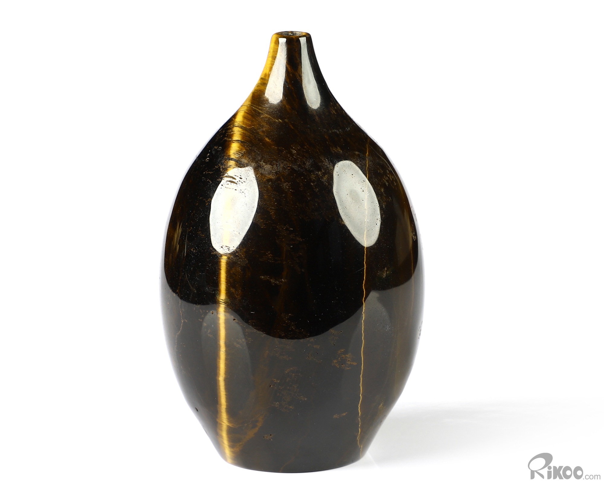 This vase with limited functionality is mainly for display.This stone is most recognized for bringing money, psychic protection, courage, luck confidence, willpower, clear thinking and speaking to show us the personal power in life that we have. Very versatile for the Yellow/Solar Plexus and Crown Chakra. Tiger's Eye works on our mental plane by amplifying thinking and manifesting what you think about. Helps separate thoughts from feelings, more centered, less emotional. Tiger's Eye allows us to recognize both our talents and our faults. It can reveal your true needs without our self-serving or rigid mental attitudes getting in the way. Use Tiger's Eye with malachite or pearl to benefit from their synergy for mental/emotional balance and true understanding. This stone helps change anxiety, fear and obsessiveness into practicality and logic. Has the grounding energy of the earth, but is embellished with a glowing warmth. A stone for people who need more confidence to accomplish their goals. Draws helpful people and material things to the wearer. Centers energy and mental focus. This stone helps us to find our closest version of perfectionism without obsessive behavior.