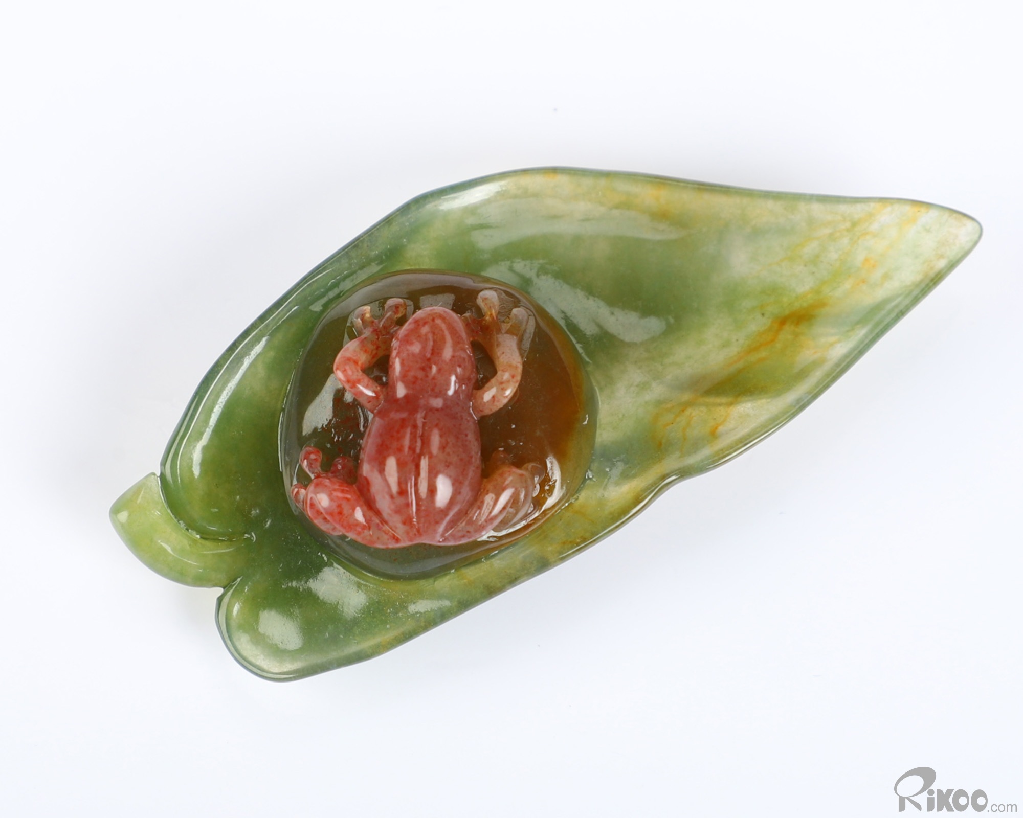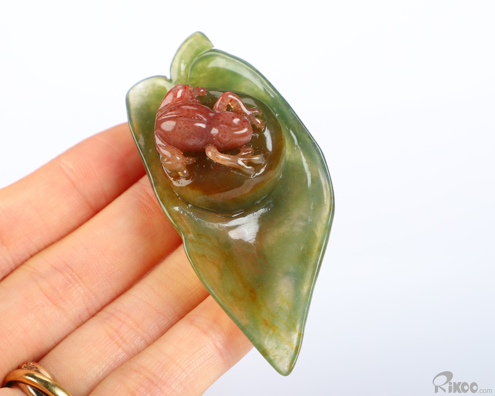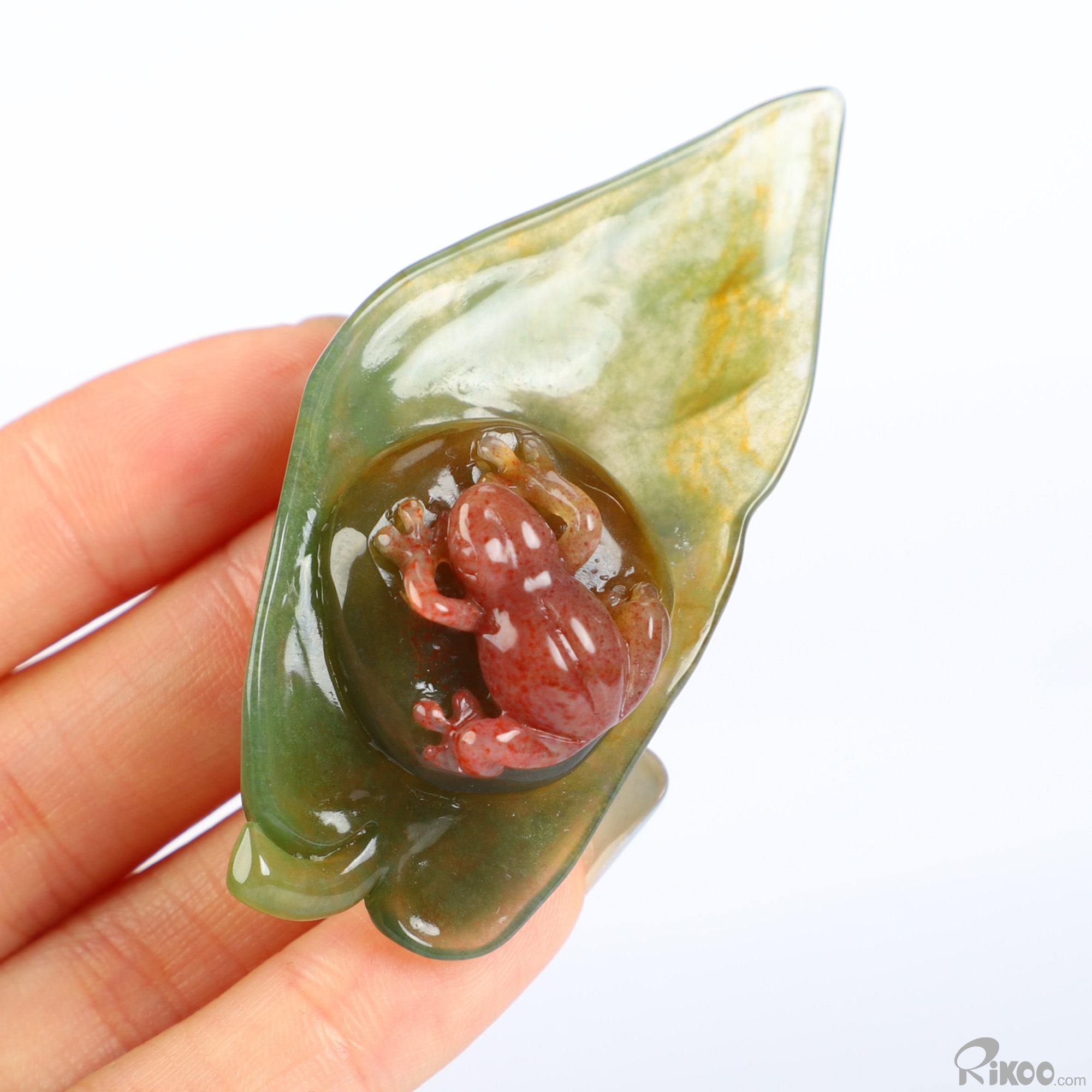 2.6" Indian Agate Hand Carved Crystal Frog and Leaf Sculpture, Crystal Healing
