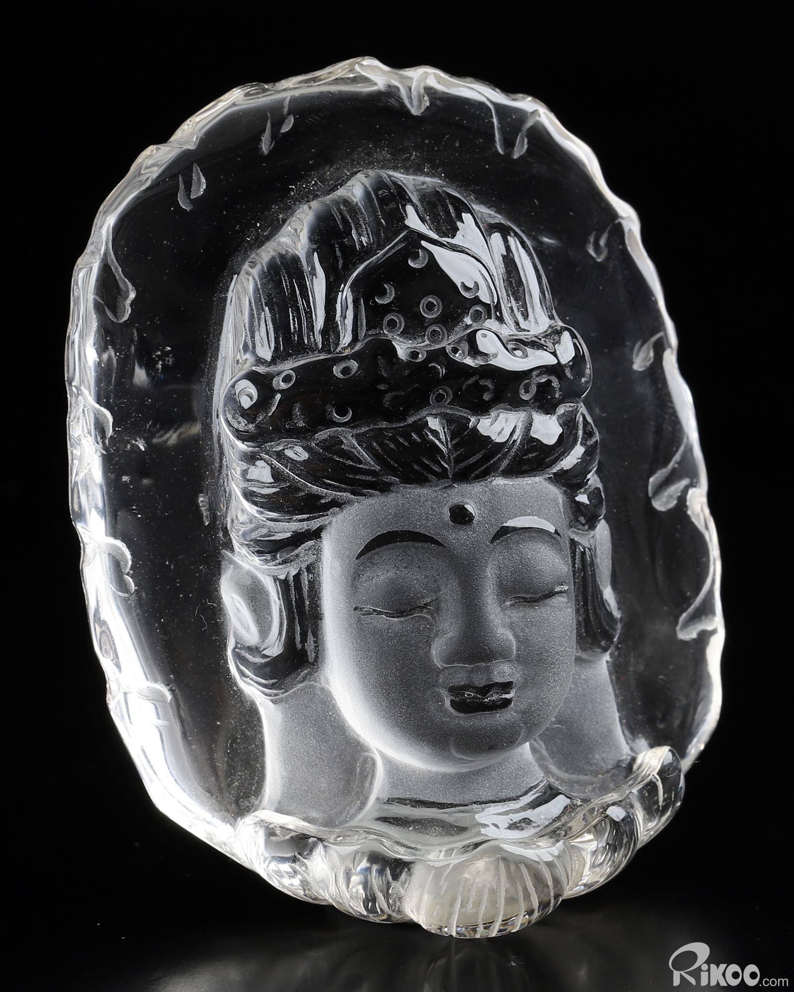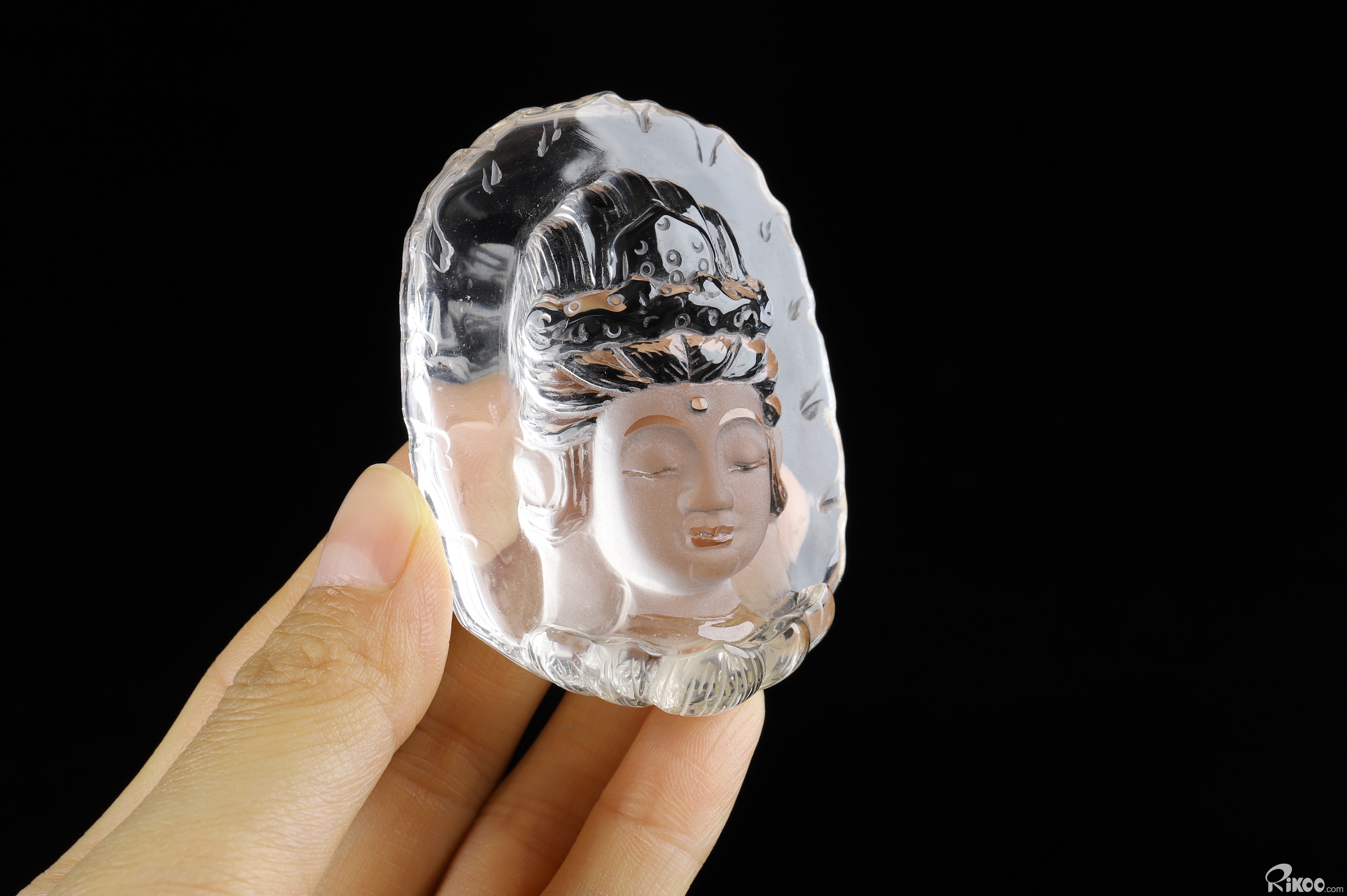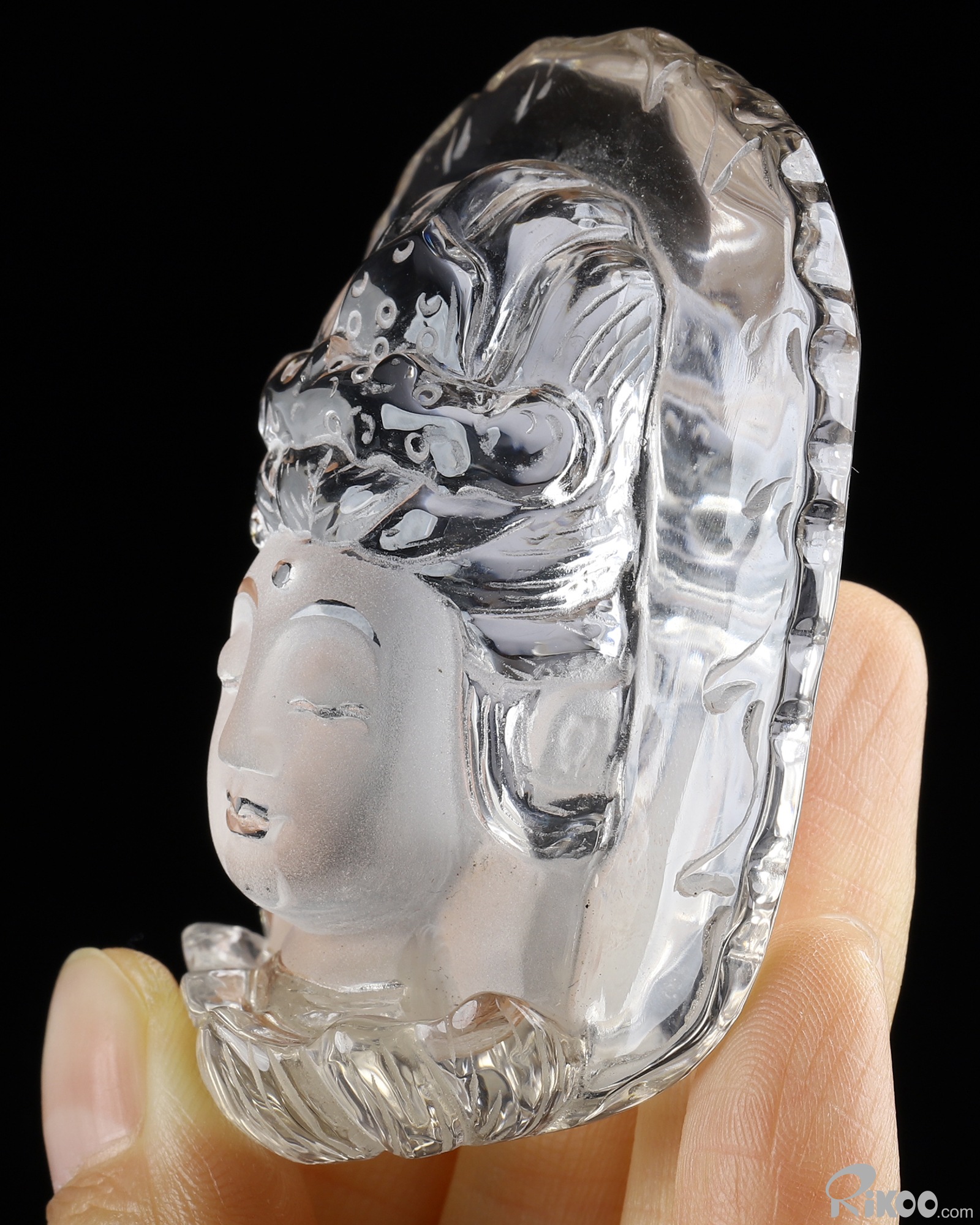 You are looking at a Quartz Rock Crystal Kwan-yin. The Kwan-yin is 2.6 inches long from front to back.