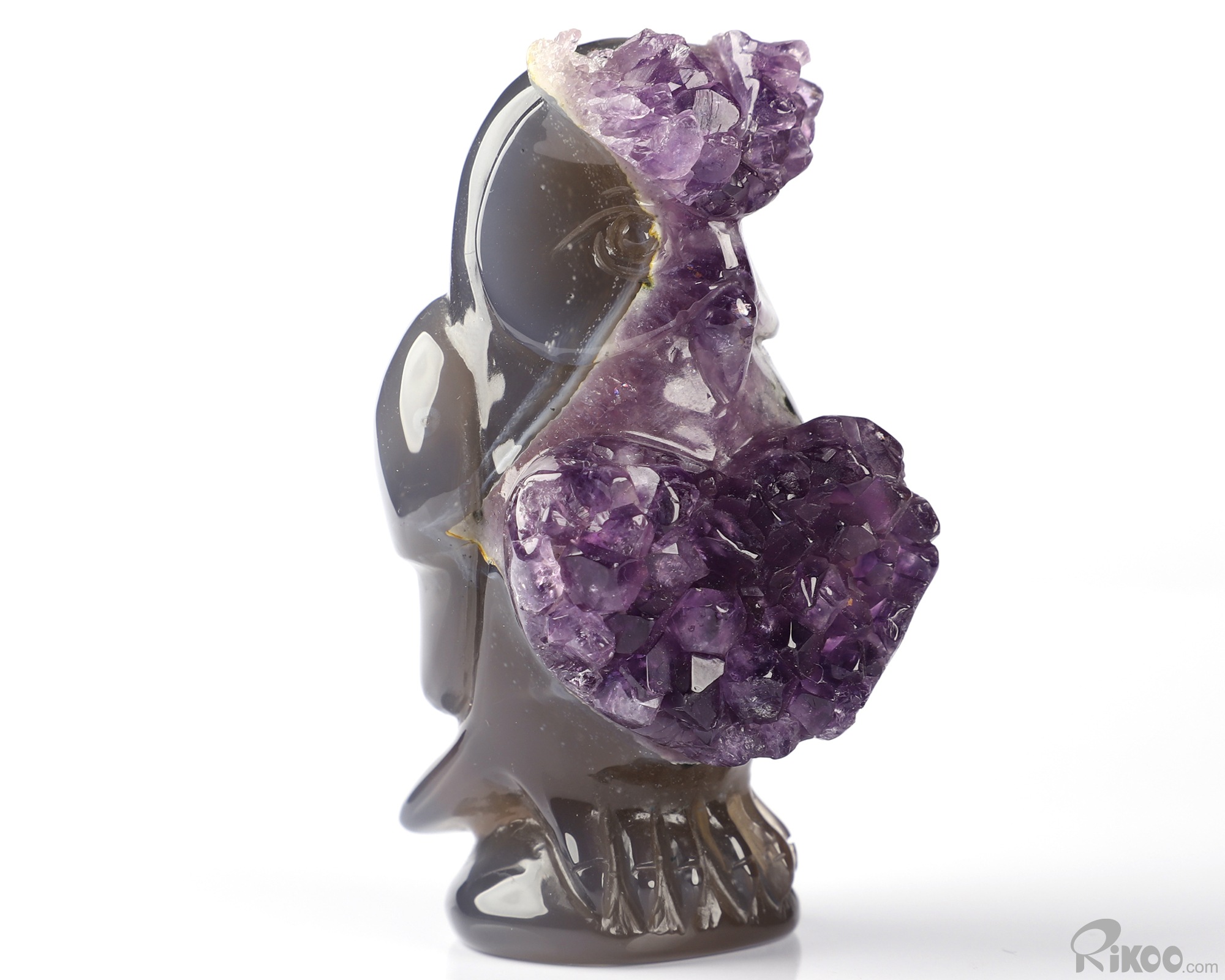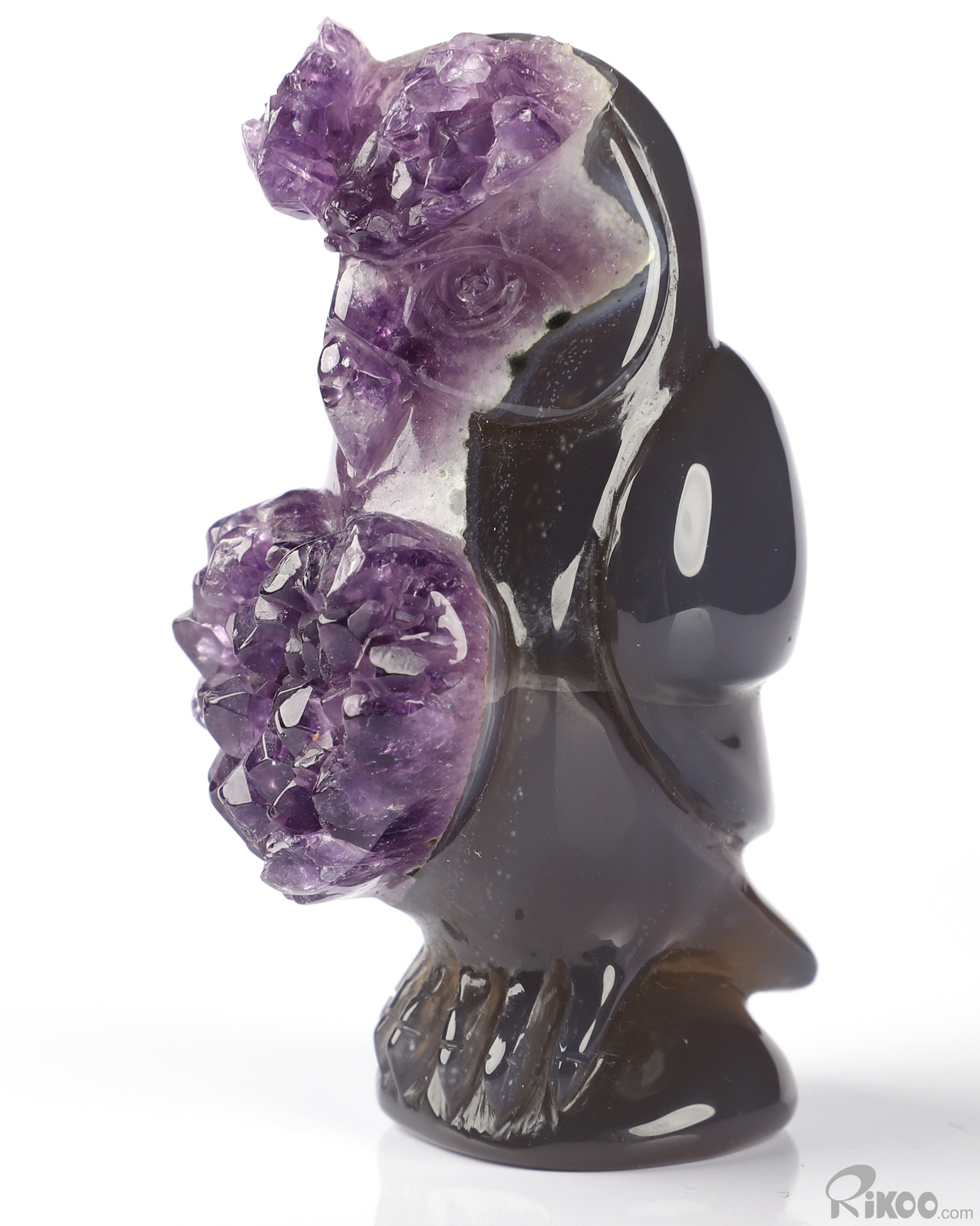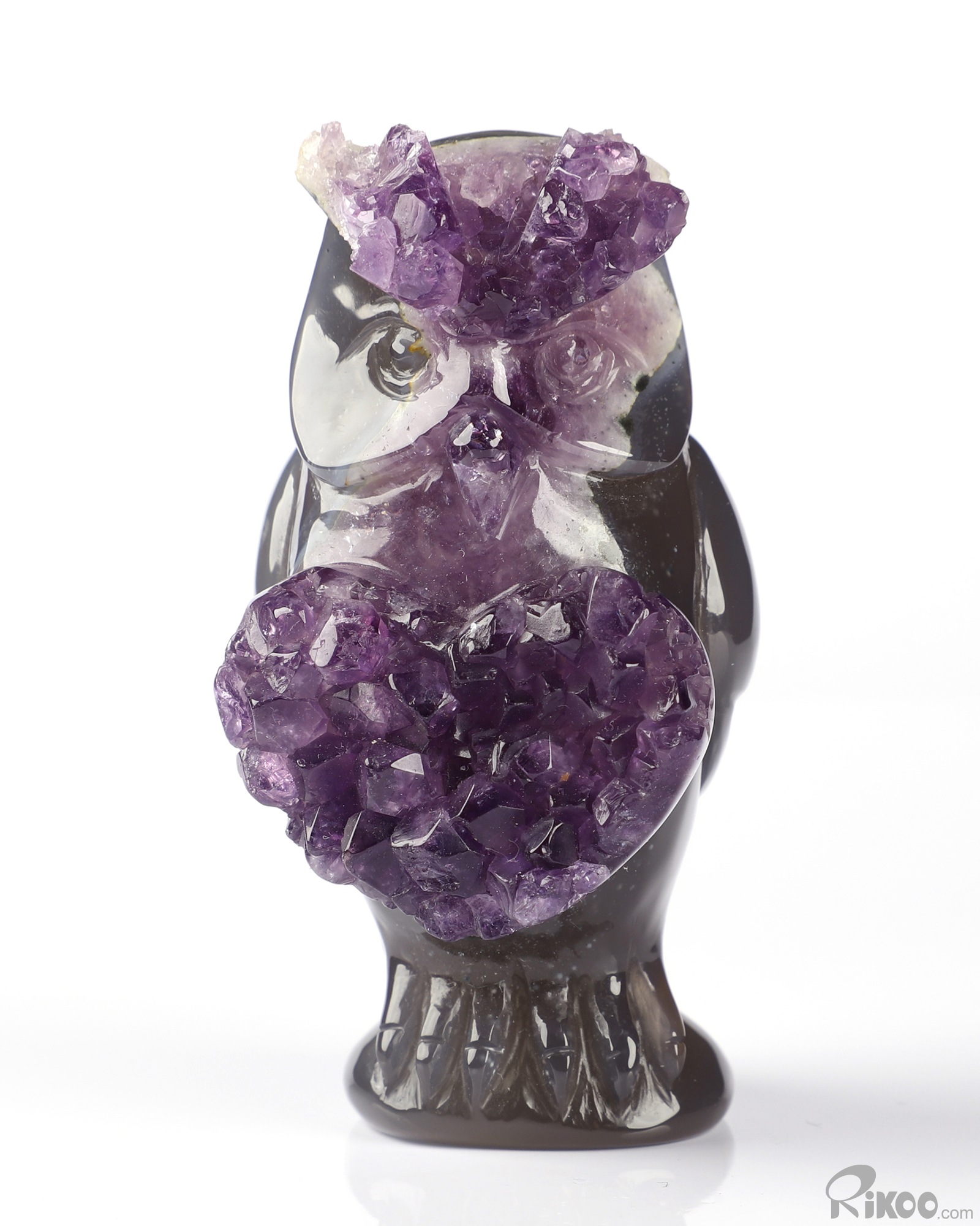 2.7" Agate Amethyst Druse Hand Carved Crystal Owl Sculpture, Crystal Healing