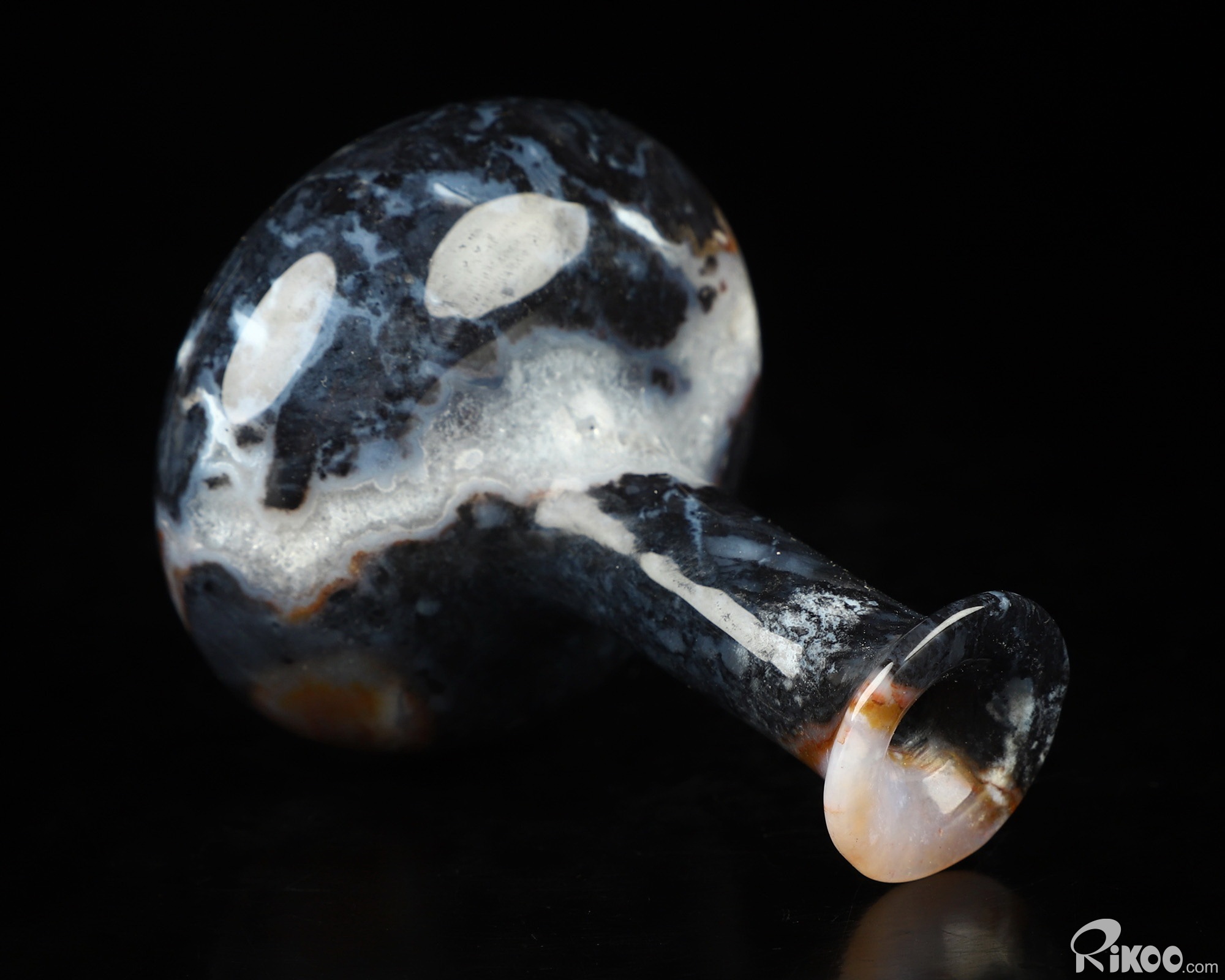 You are looking at a Black Zebra Agate sculpture. The sculpture is 2.7 inches long.