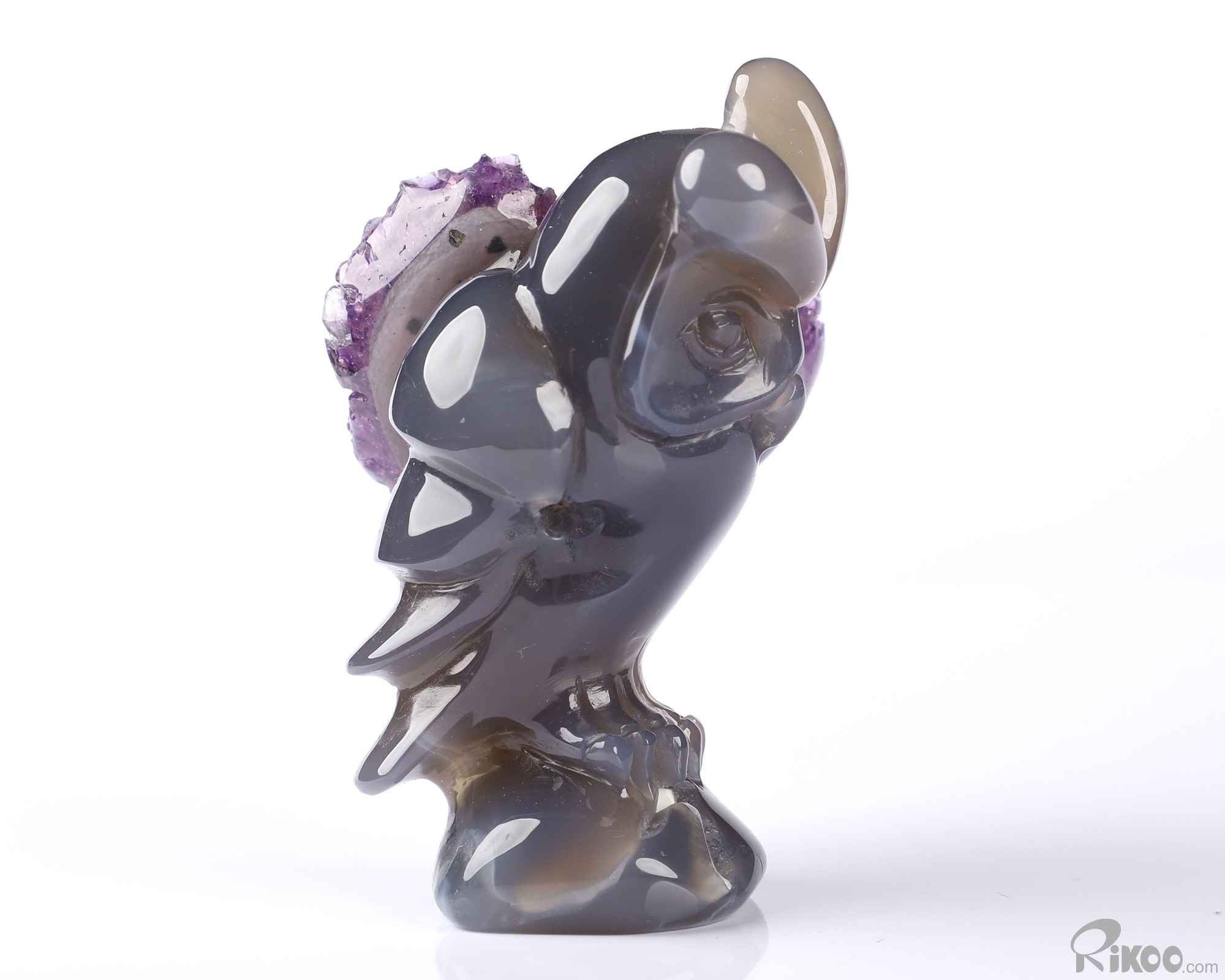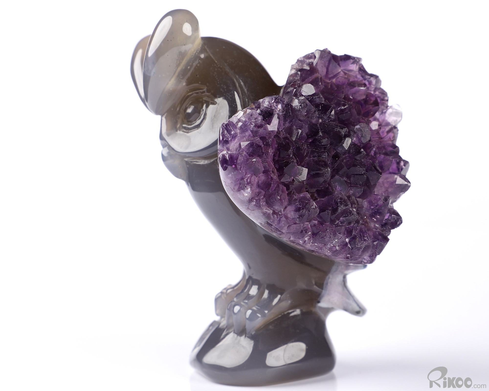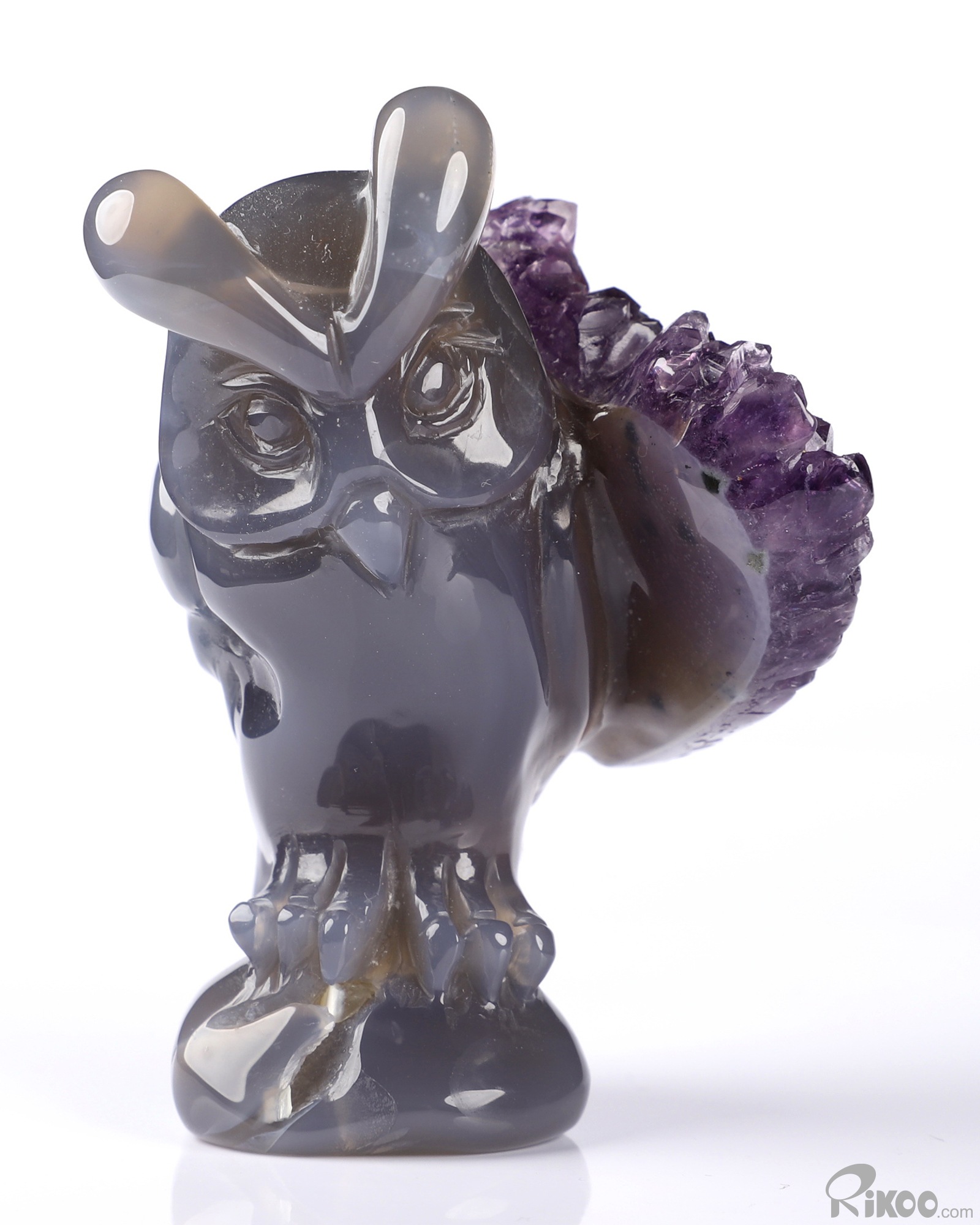 2.9" Agate Amethyst Heart Druse Hand Carved Crystal Owl Sculpture, Crystal Healing