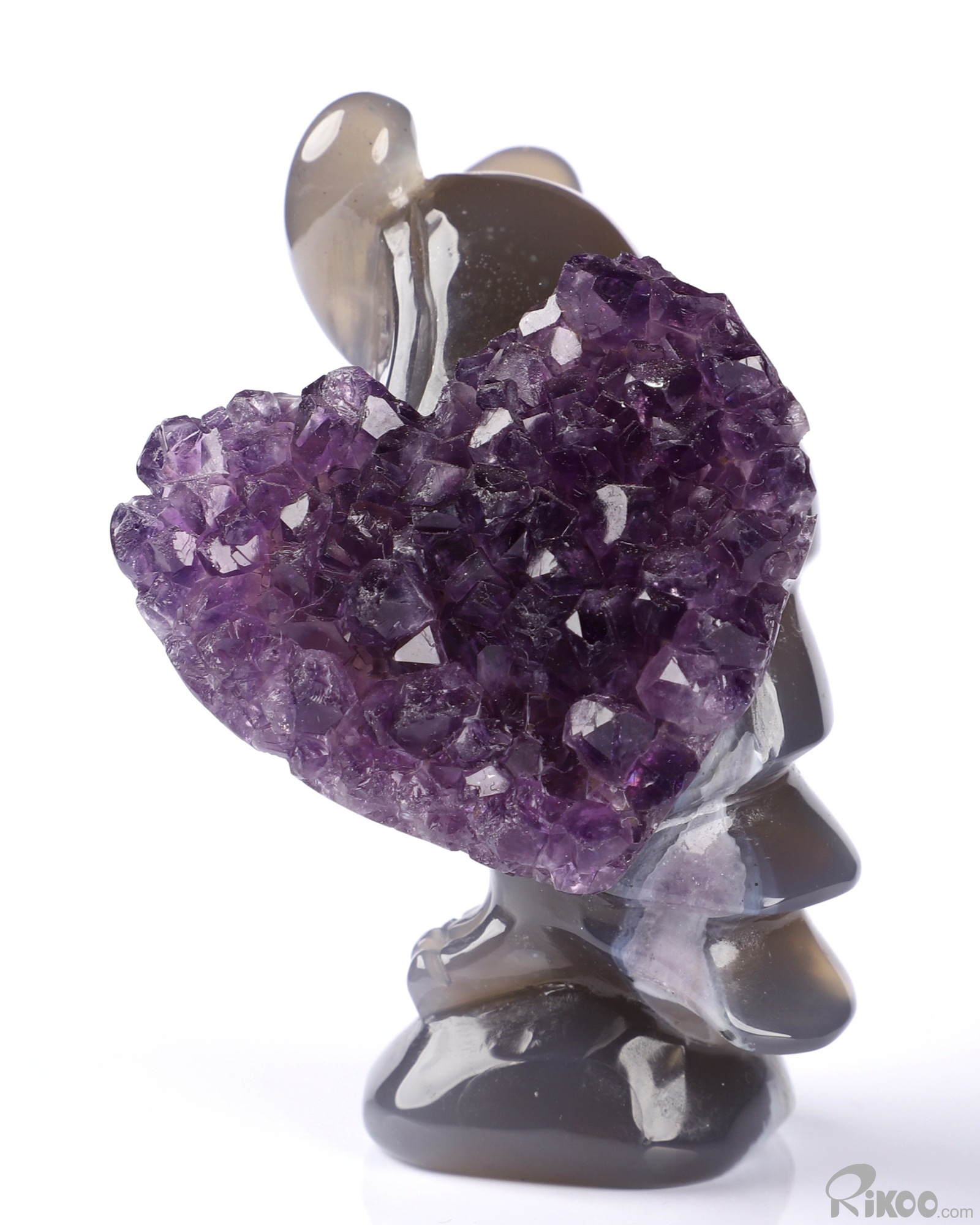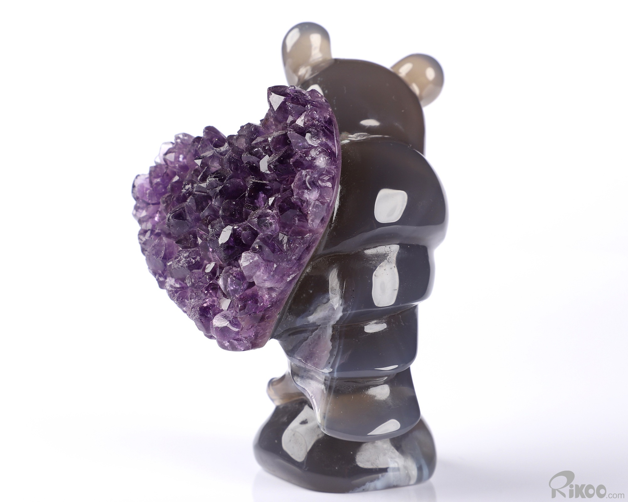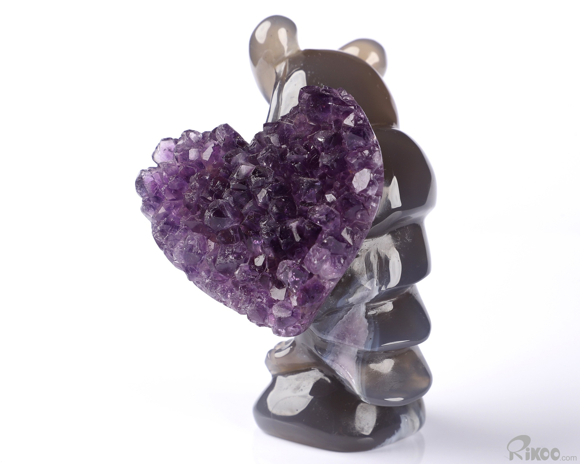 2.9" Agate Amethyst Heart Druse Hand Carved Crystal Owl Sculpture, Crystal Healing