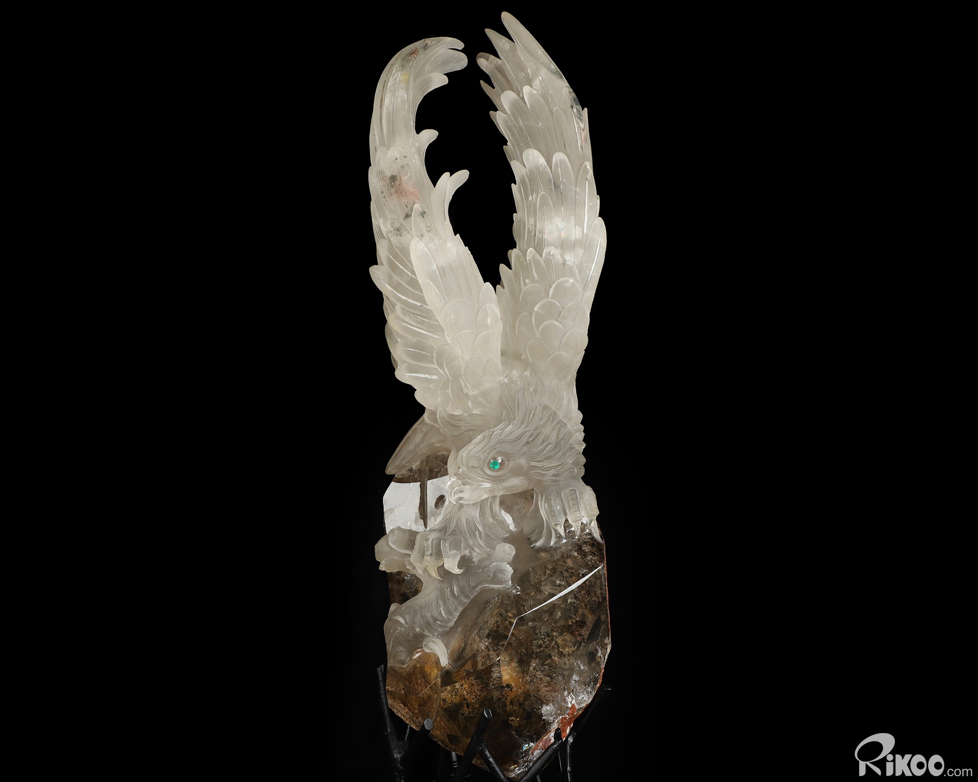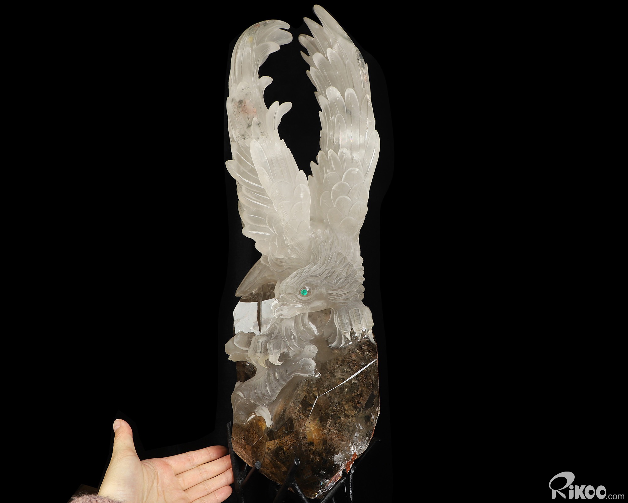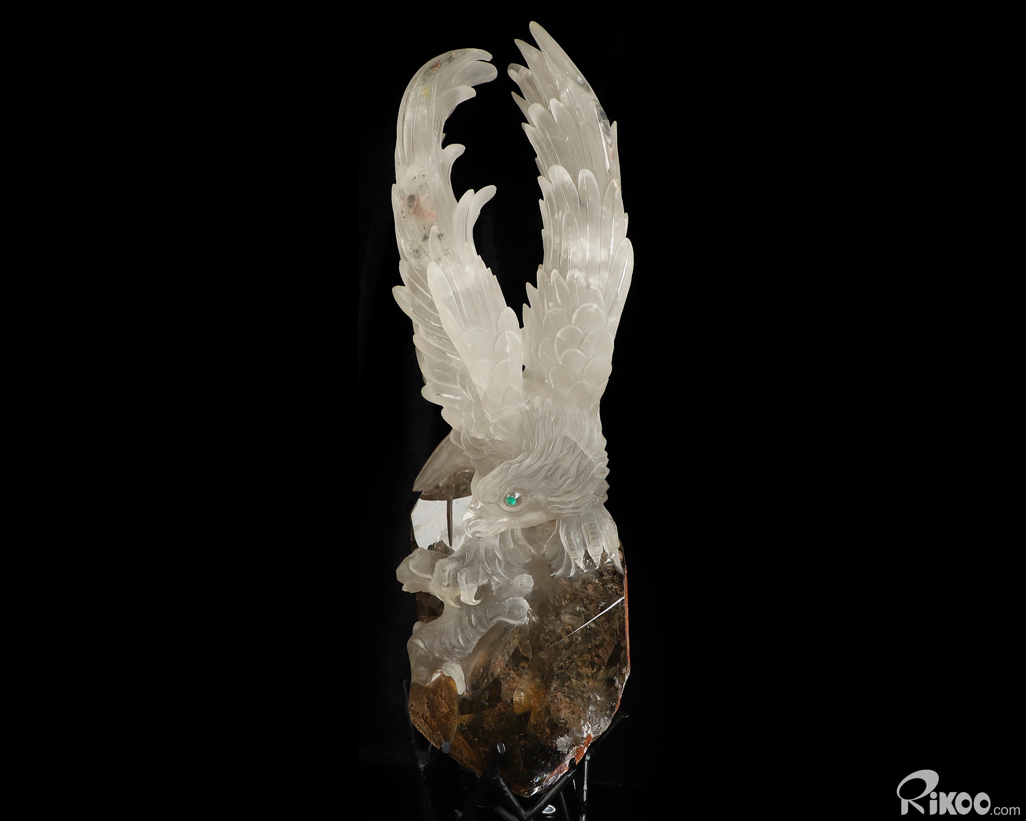 21.3" Smoky Phantom Quartz Rock Crystal Hand Carved Crystal Eagle with Emerald Eyes Sculpture, Crystal Healing