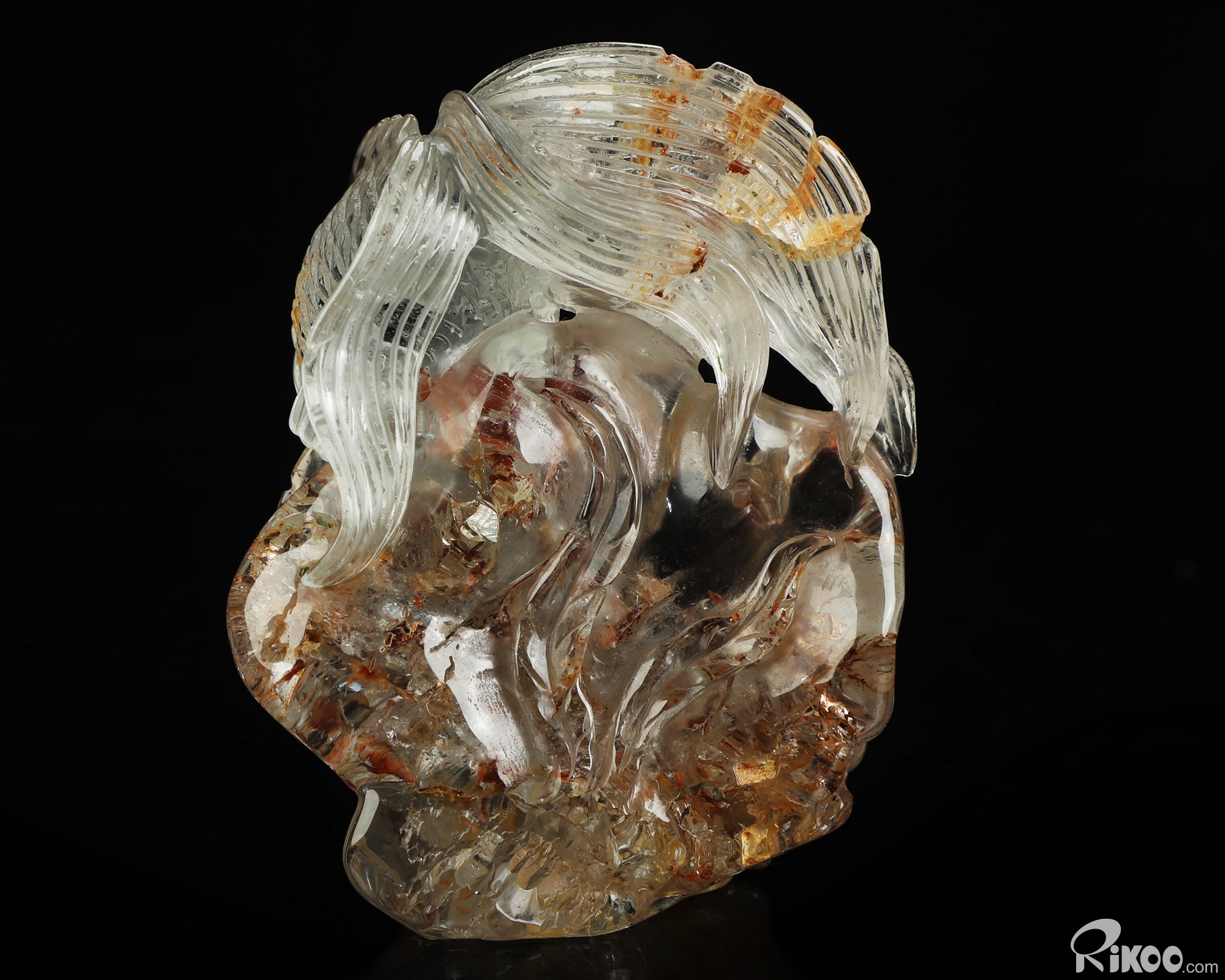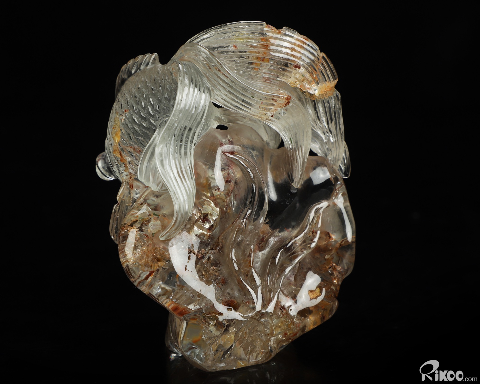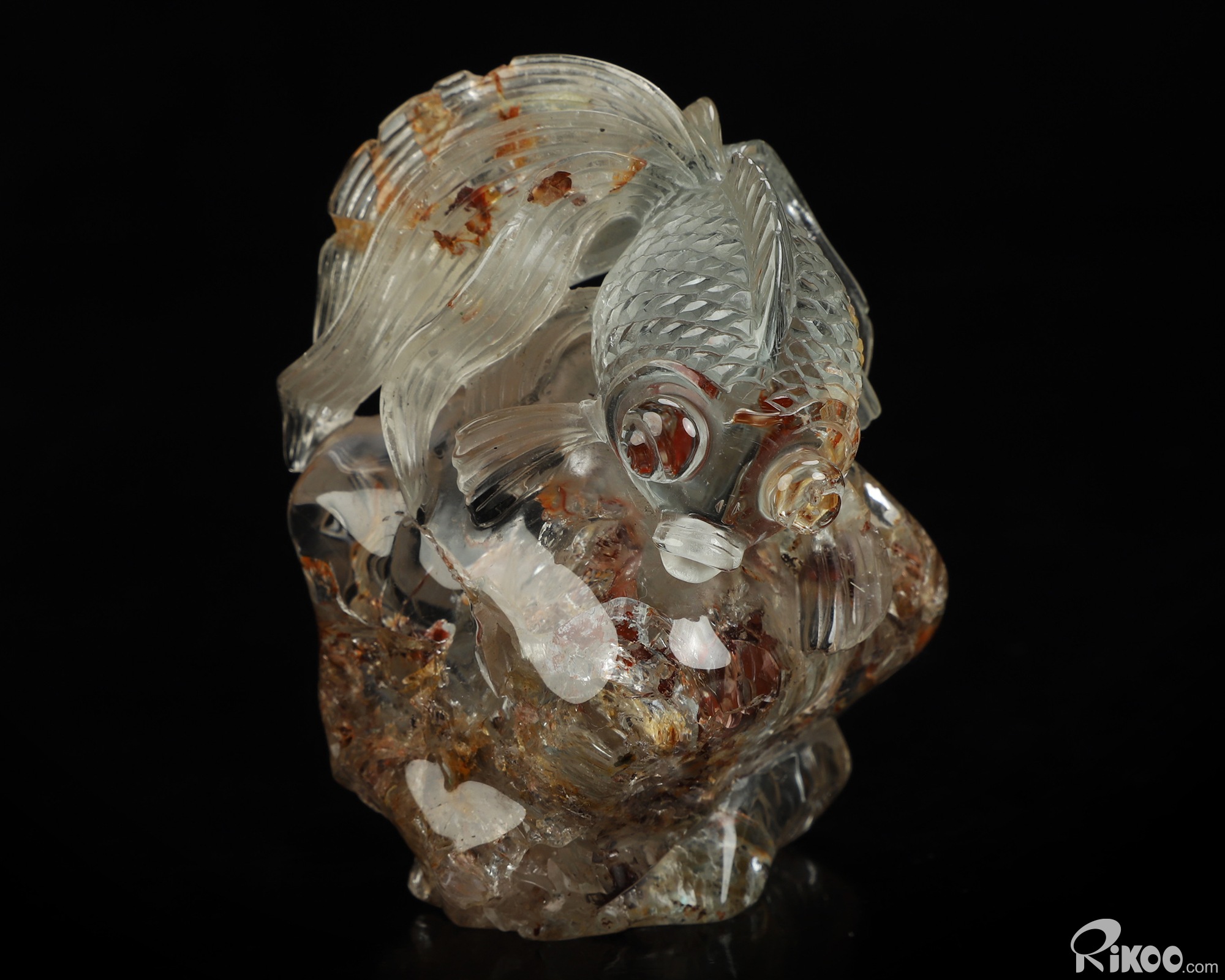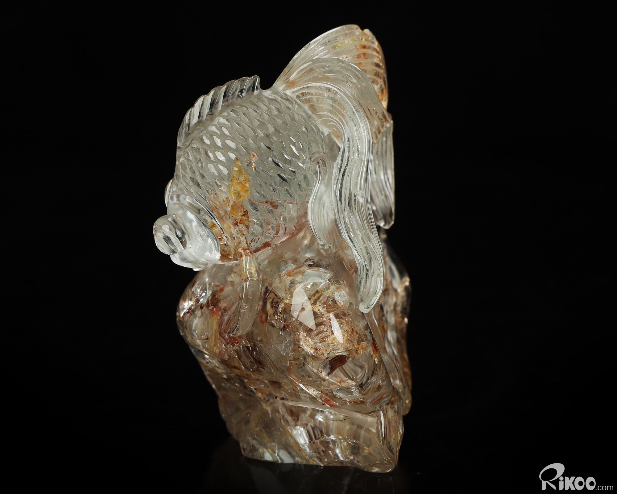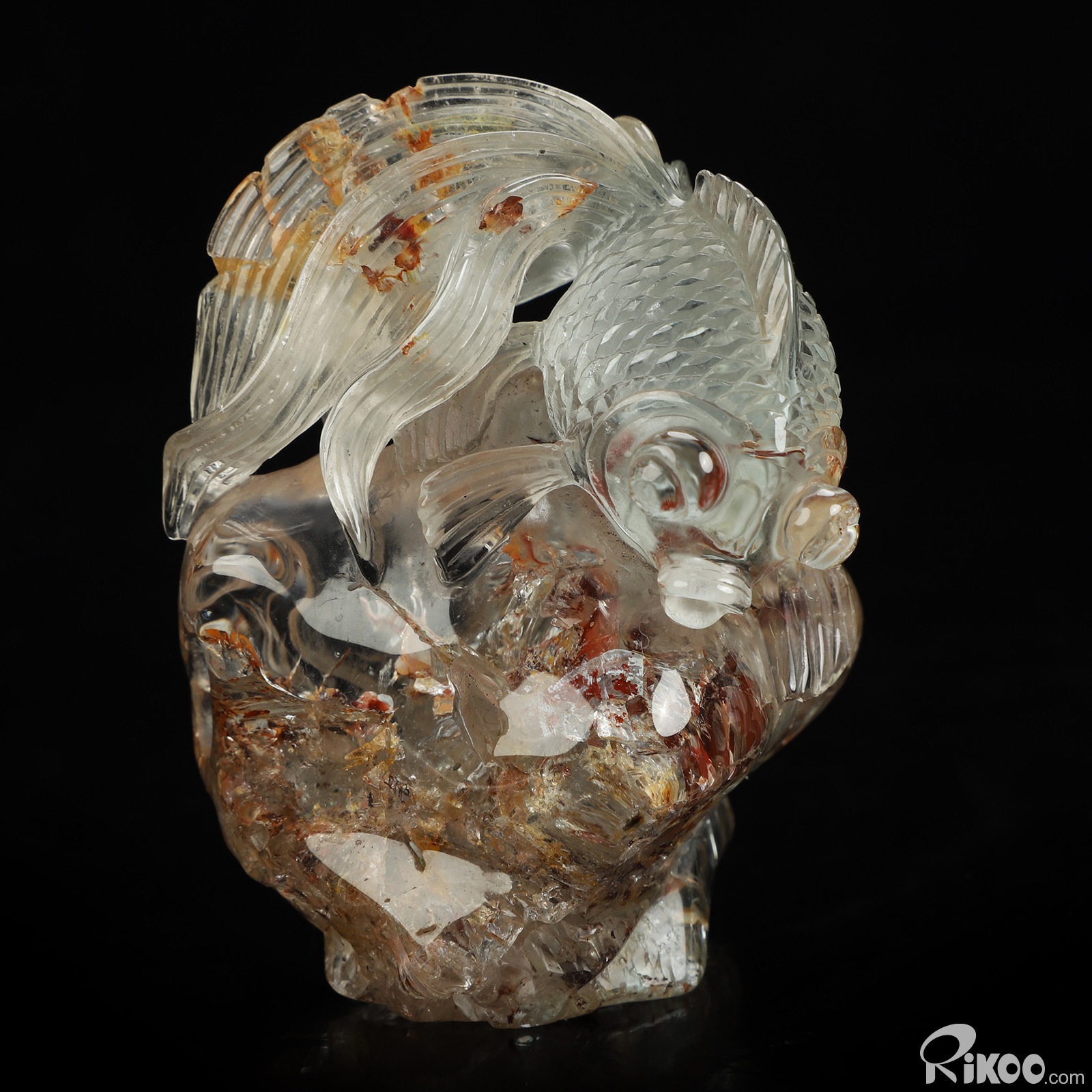 You are looking at a Phantom Quartz Rock Crystal Goldfish sculpture. The sculpture is 3 inches long.