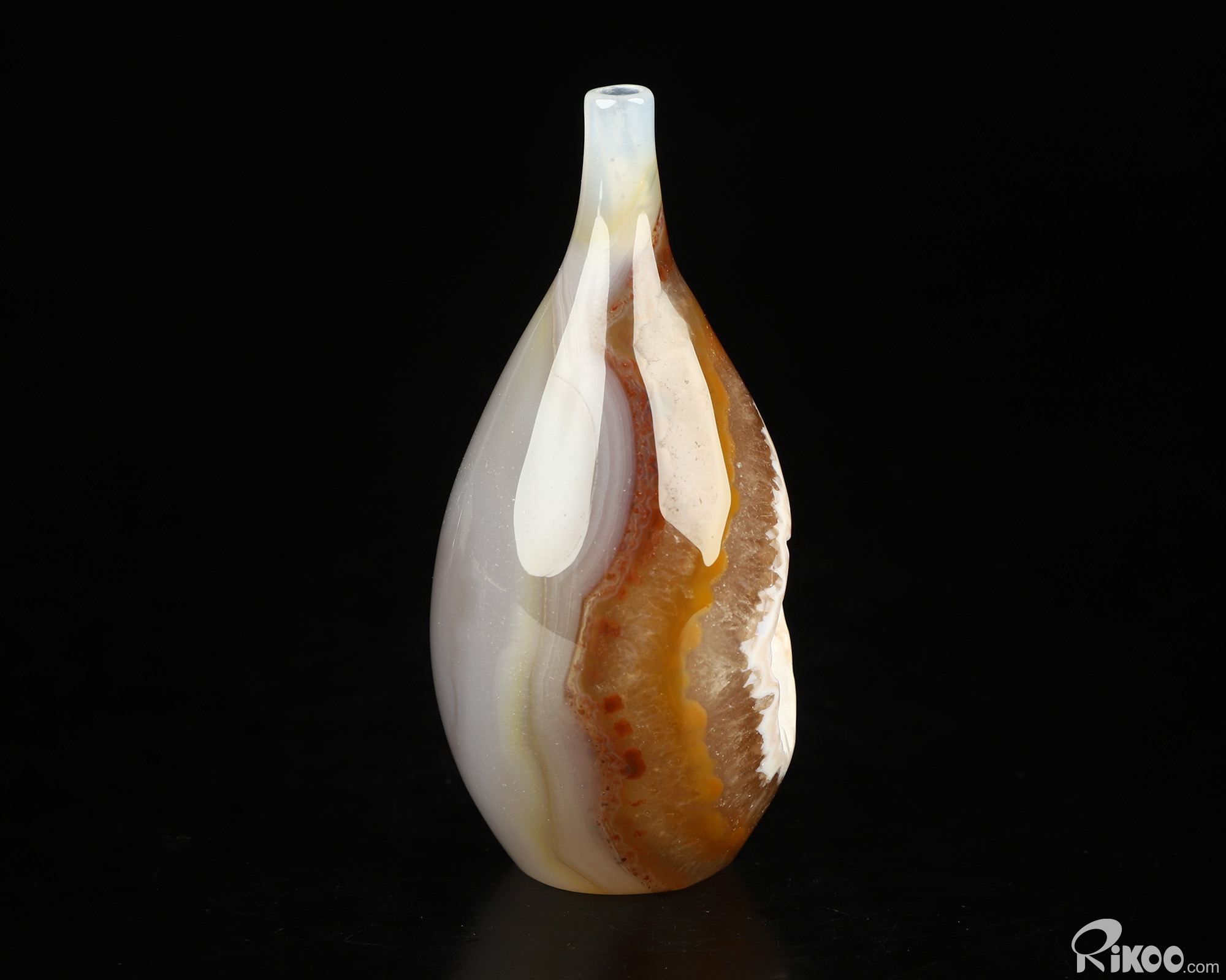 This vase with limited functionality is mainly for display. Composed of microscopic crystals of Quartz laid down in colorful bands or ribbons. The appearance of the stone is waxy and soft. Almost always translucent and occasionally transparent. Agates are grounding stones. Agates are one of the oldest good luck stones. They help obtain a better physical/emotional balance. They work to raise consciousness. Builds self-confidence. Agate enables the person wearing it to choose their friends carefully. Used to avert from lighting and stormy weather (physically and metaphysically), agate brings prosperity. It is a protector of children. This stone helps us to have patience, and allows for inner peace. Use agate as a gazing tool for divination and meditation. Agate balances emotions and brings insight to any situation.