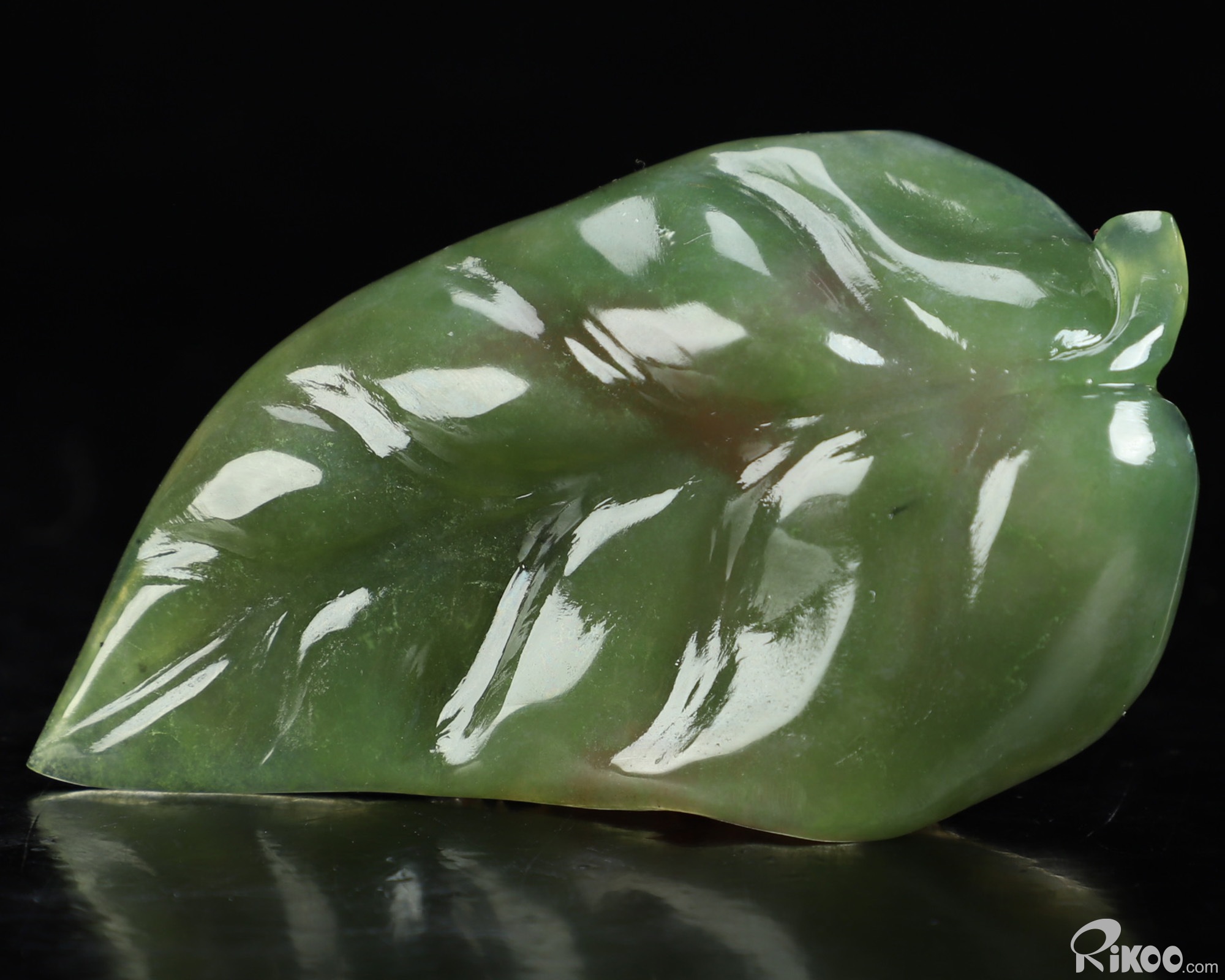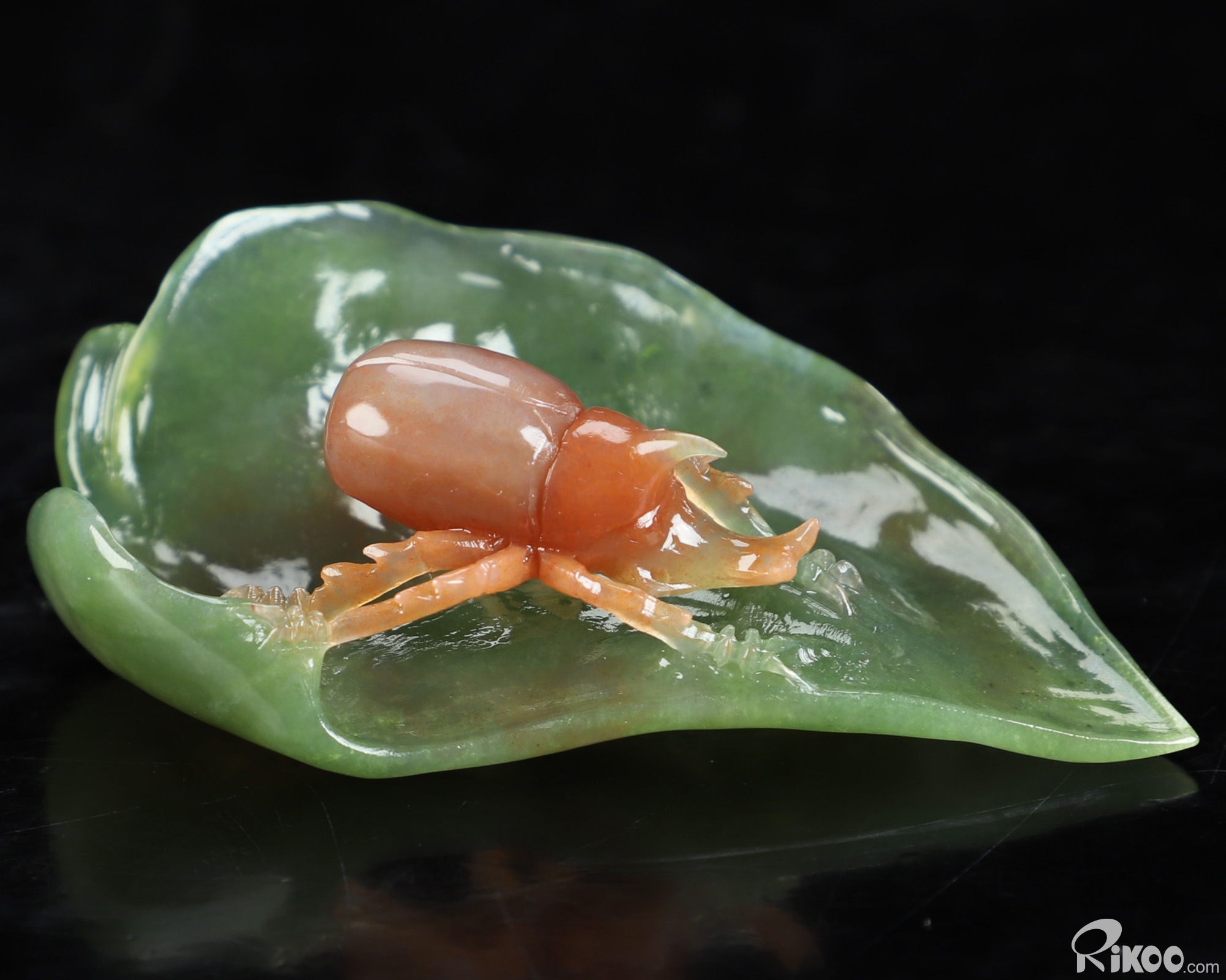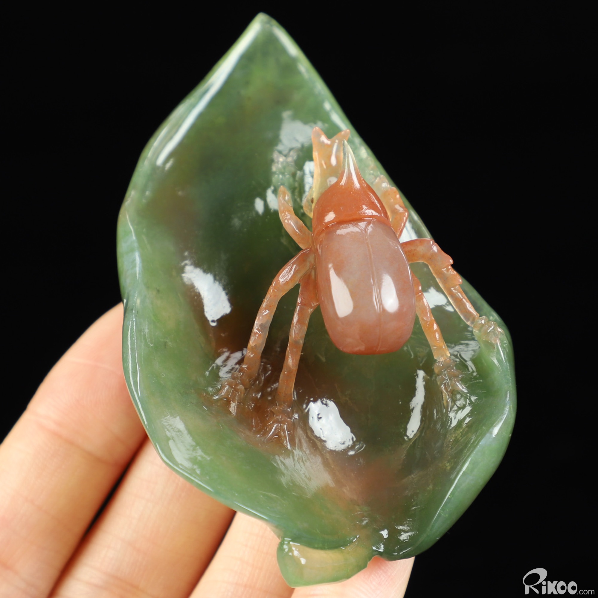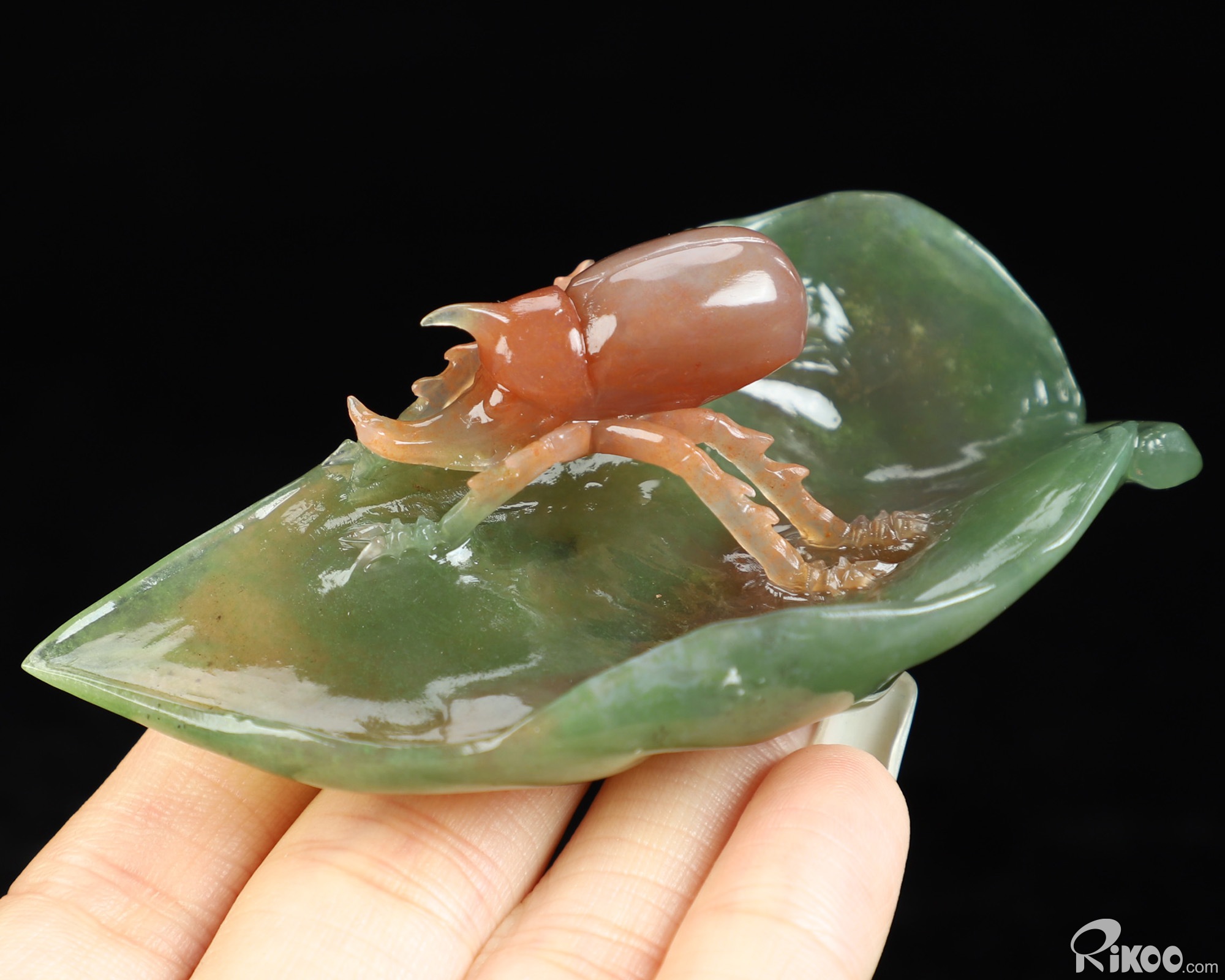 3.1" Indian Agate Hand Carved Crystal Hercules Beetle and Leaf Sculpture, Crystal Healing