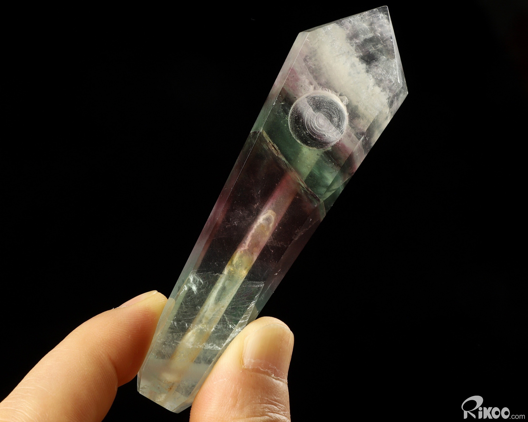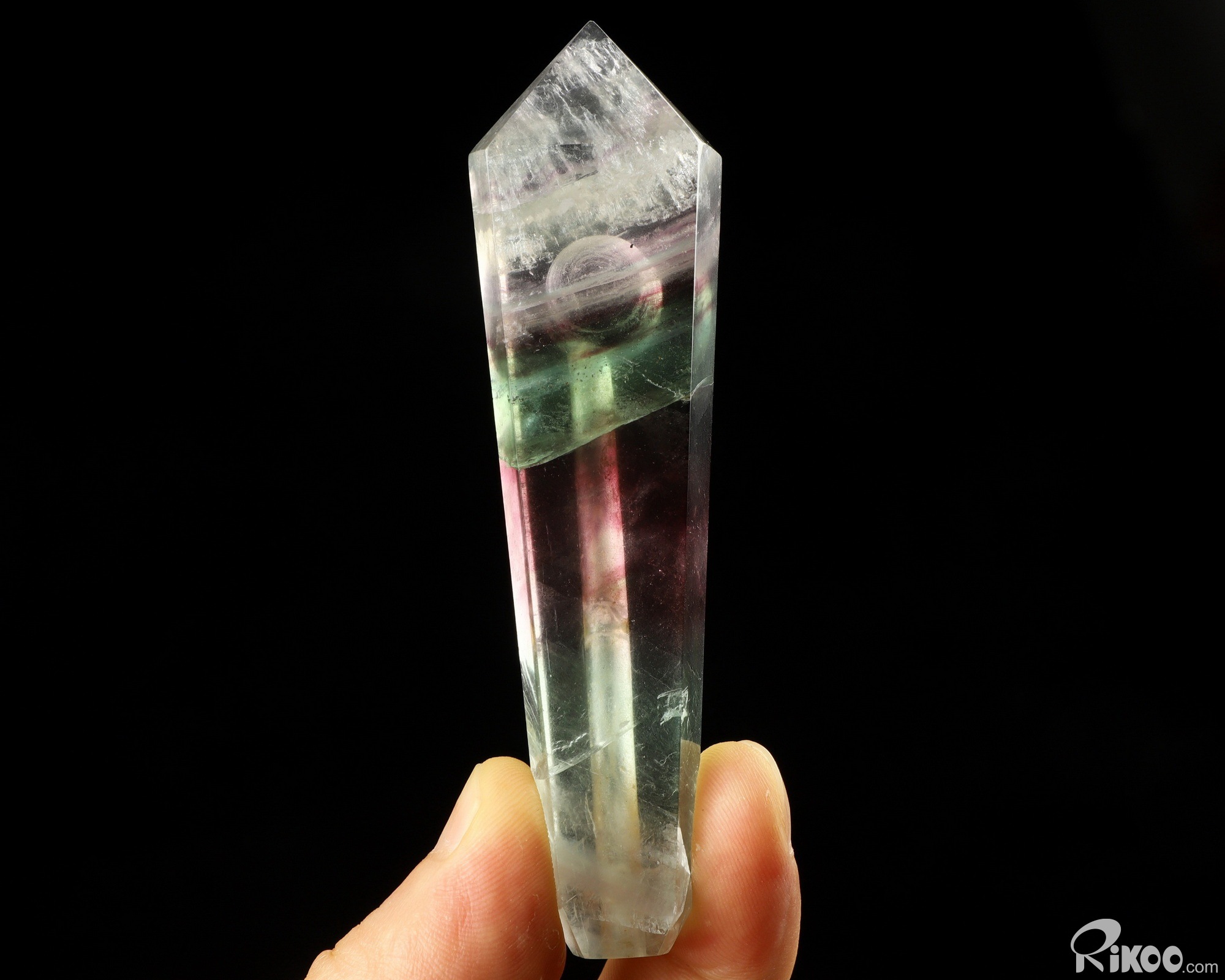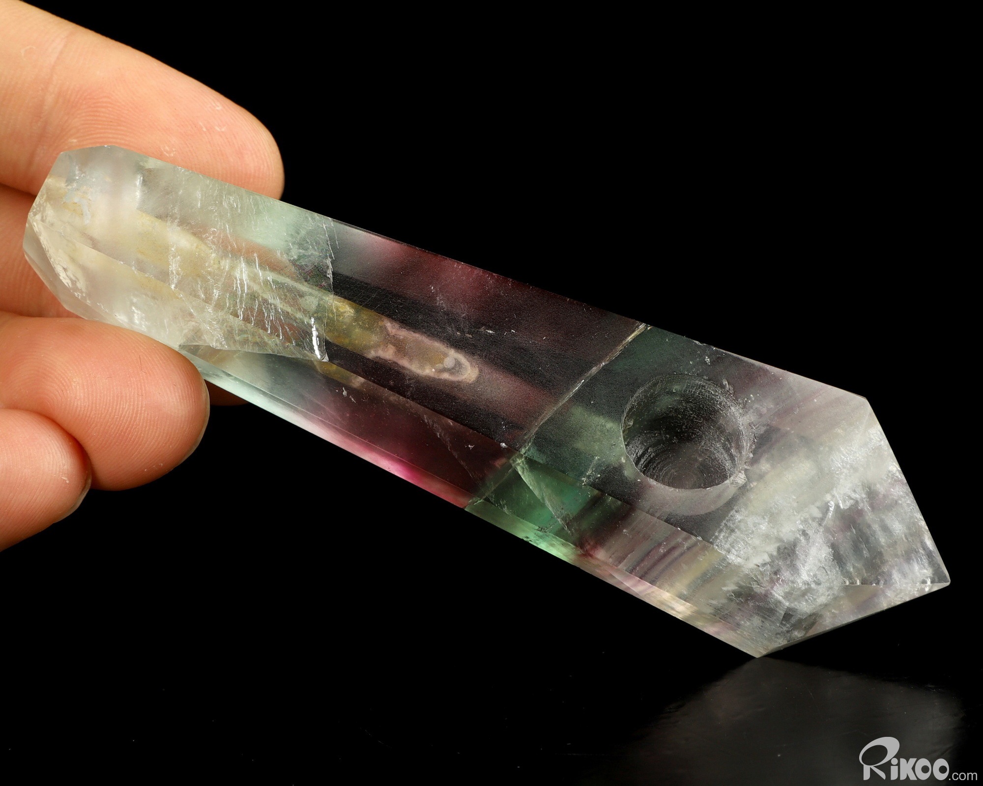 You are looking at a Fluorite Pointed Column. The Pointed Column is 3.9 inches long from front to back.