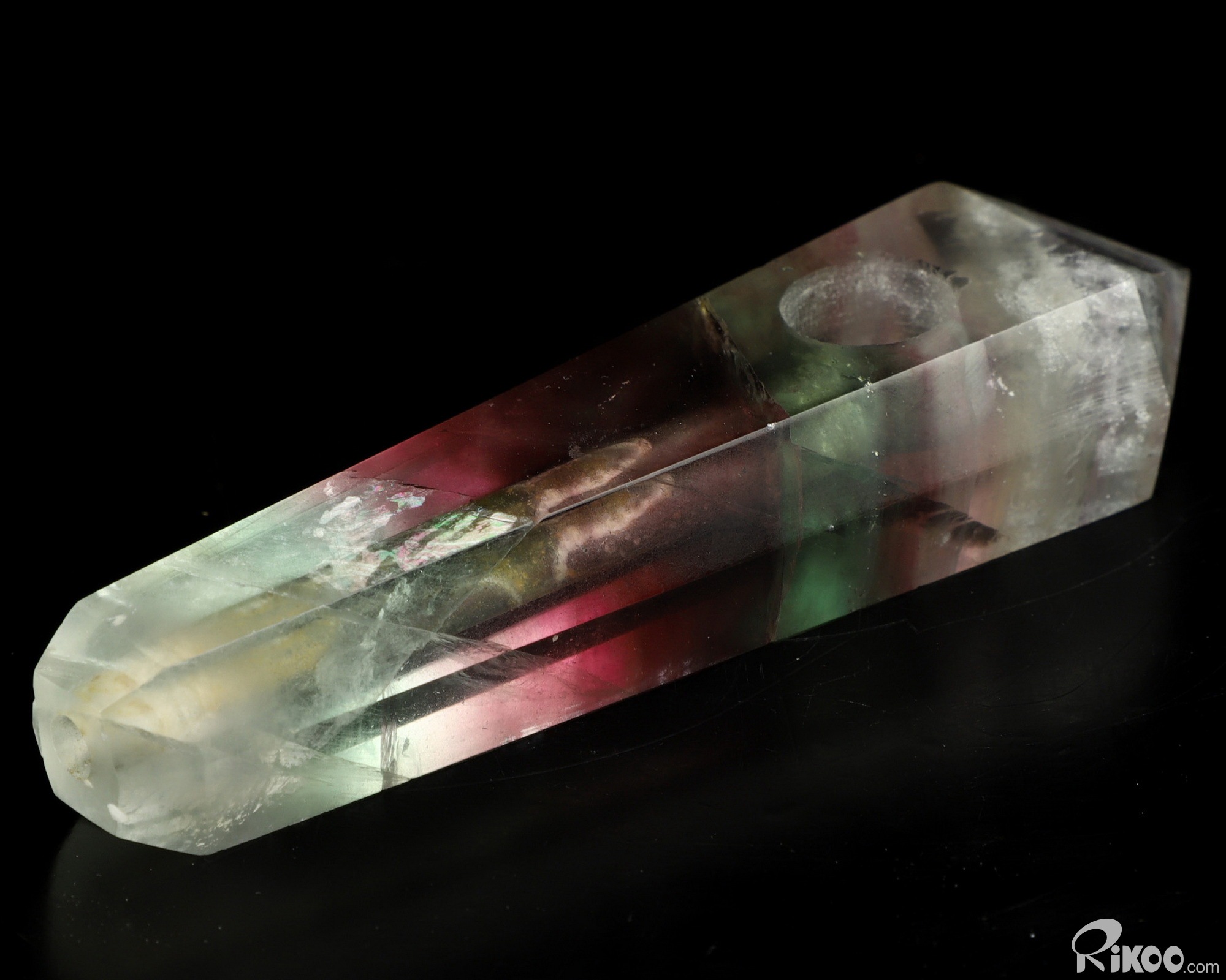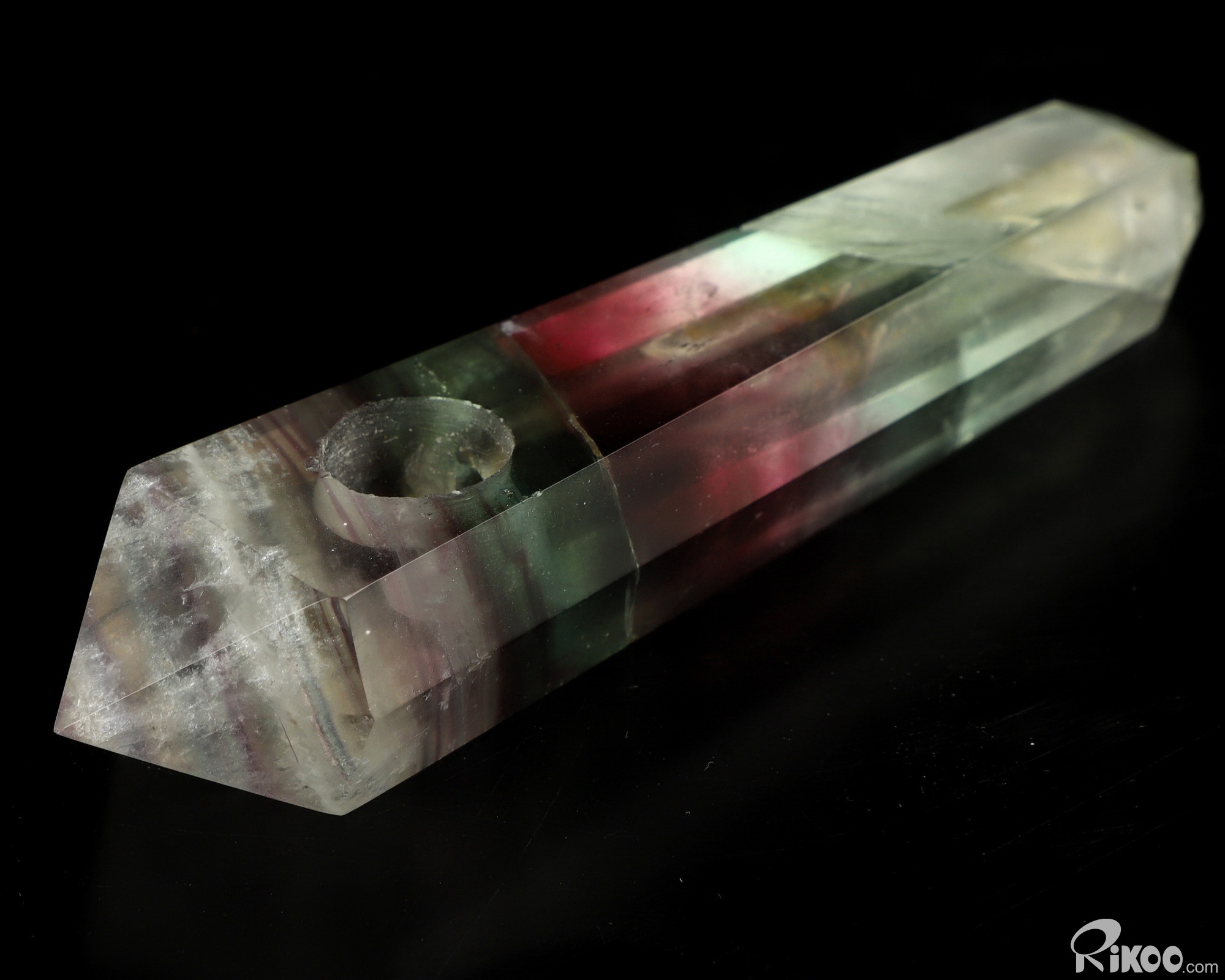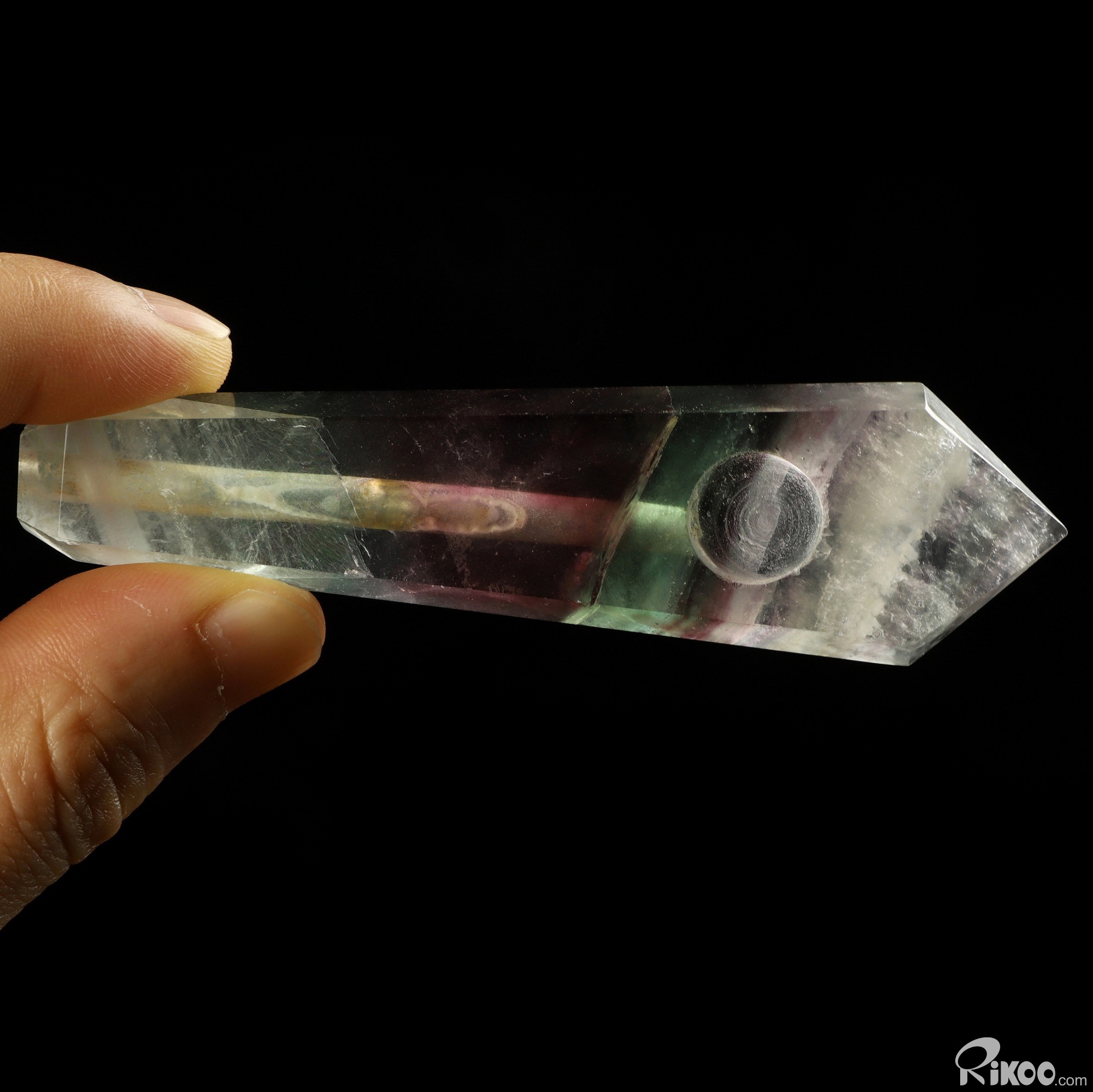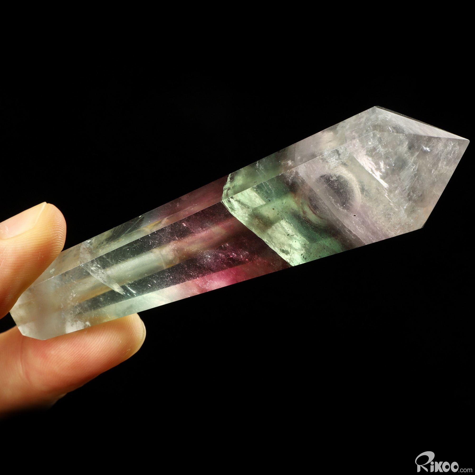 You are looking at a Fluorite Pointed Column. The Pointed Column is 3.9 inches long from front to back.