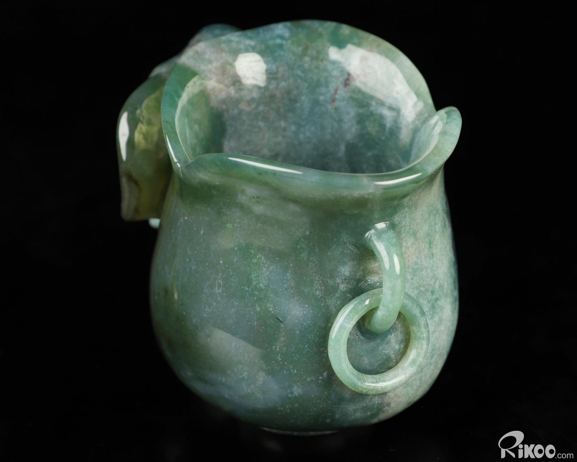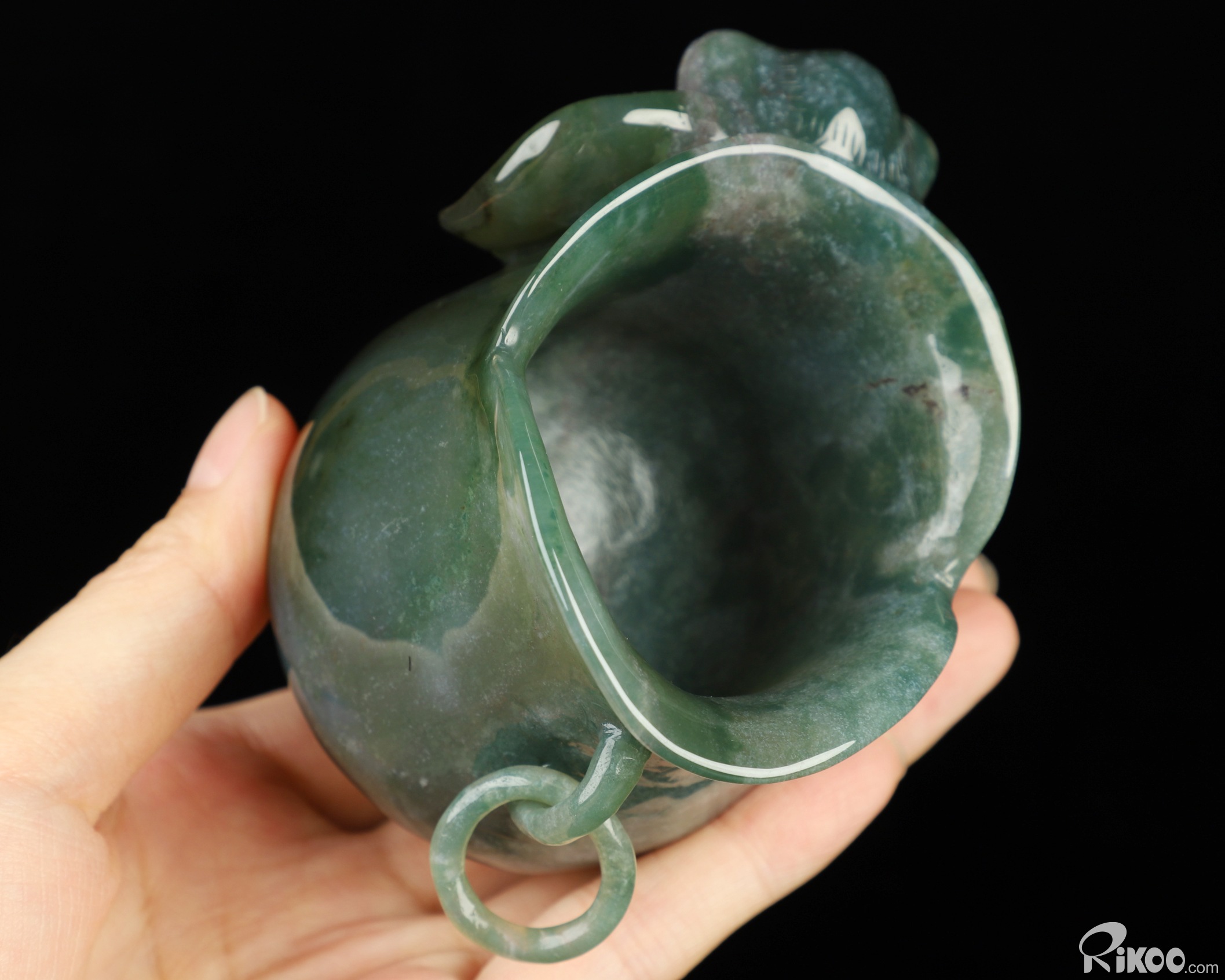 You are looking at a Green Moss Agate cup. The sculpture is 4 inches long.