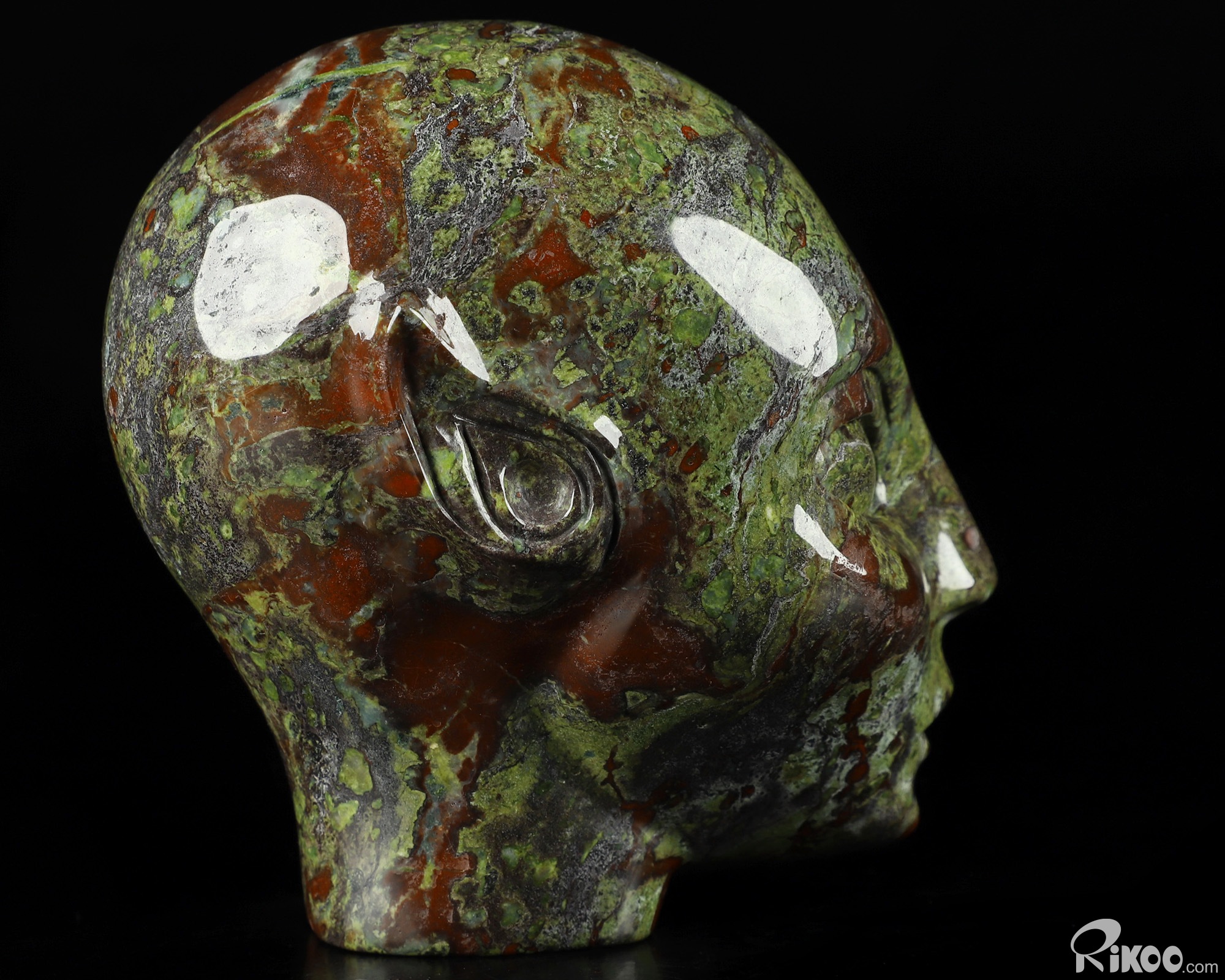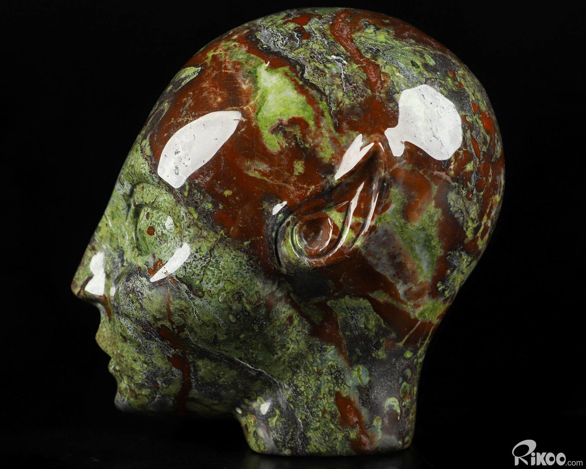 You are looking at a Dragon Blood Jasper skull. The skull is 4.1 inches long from front to back.