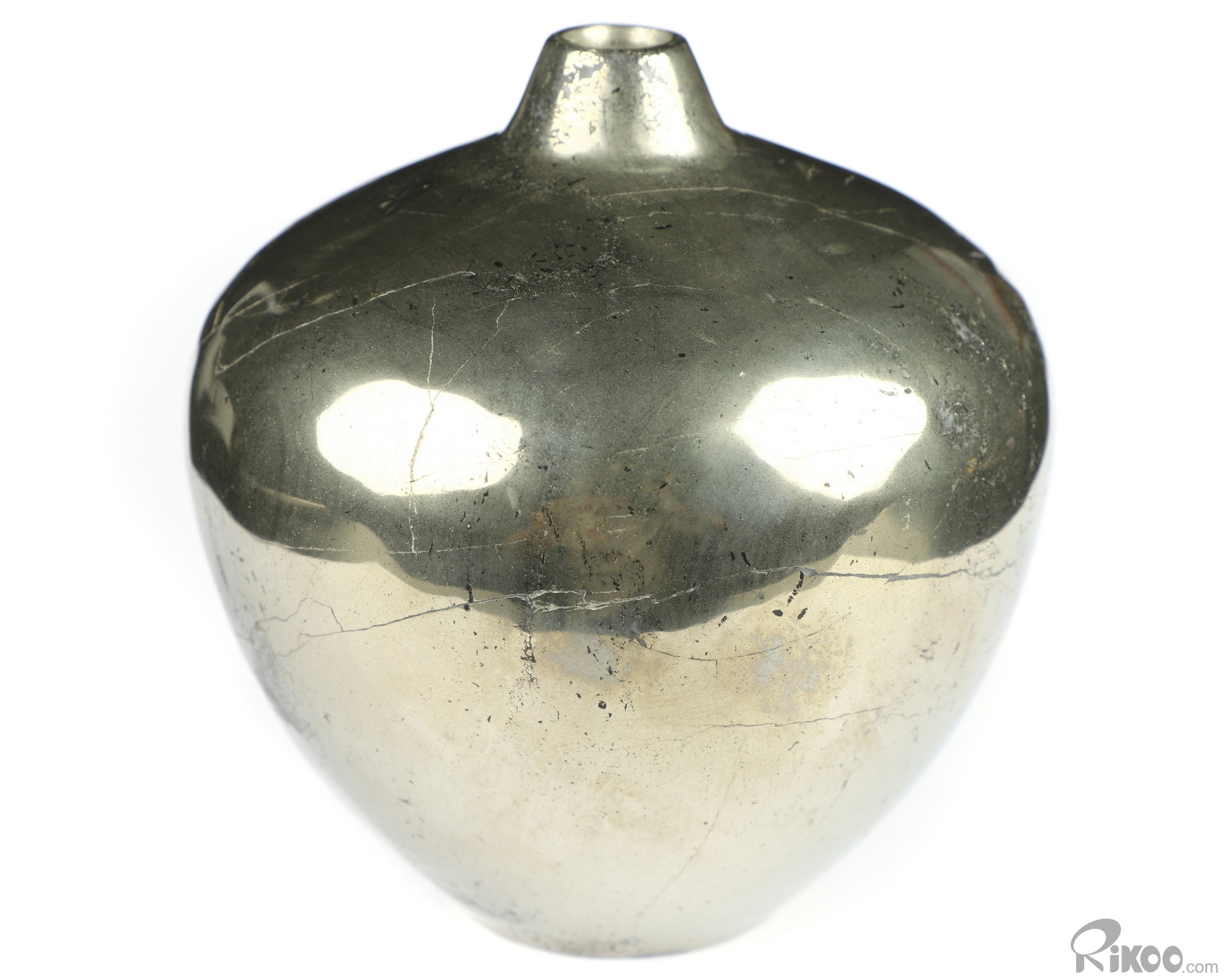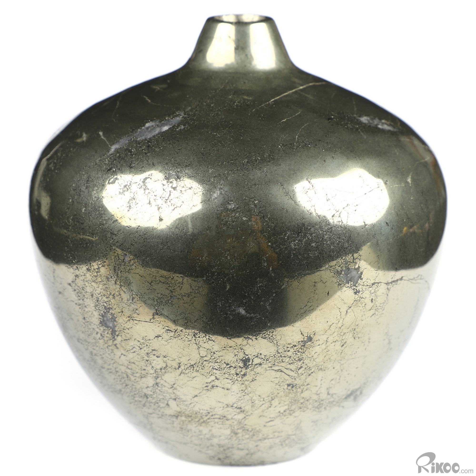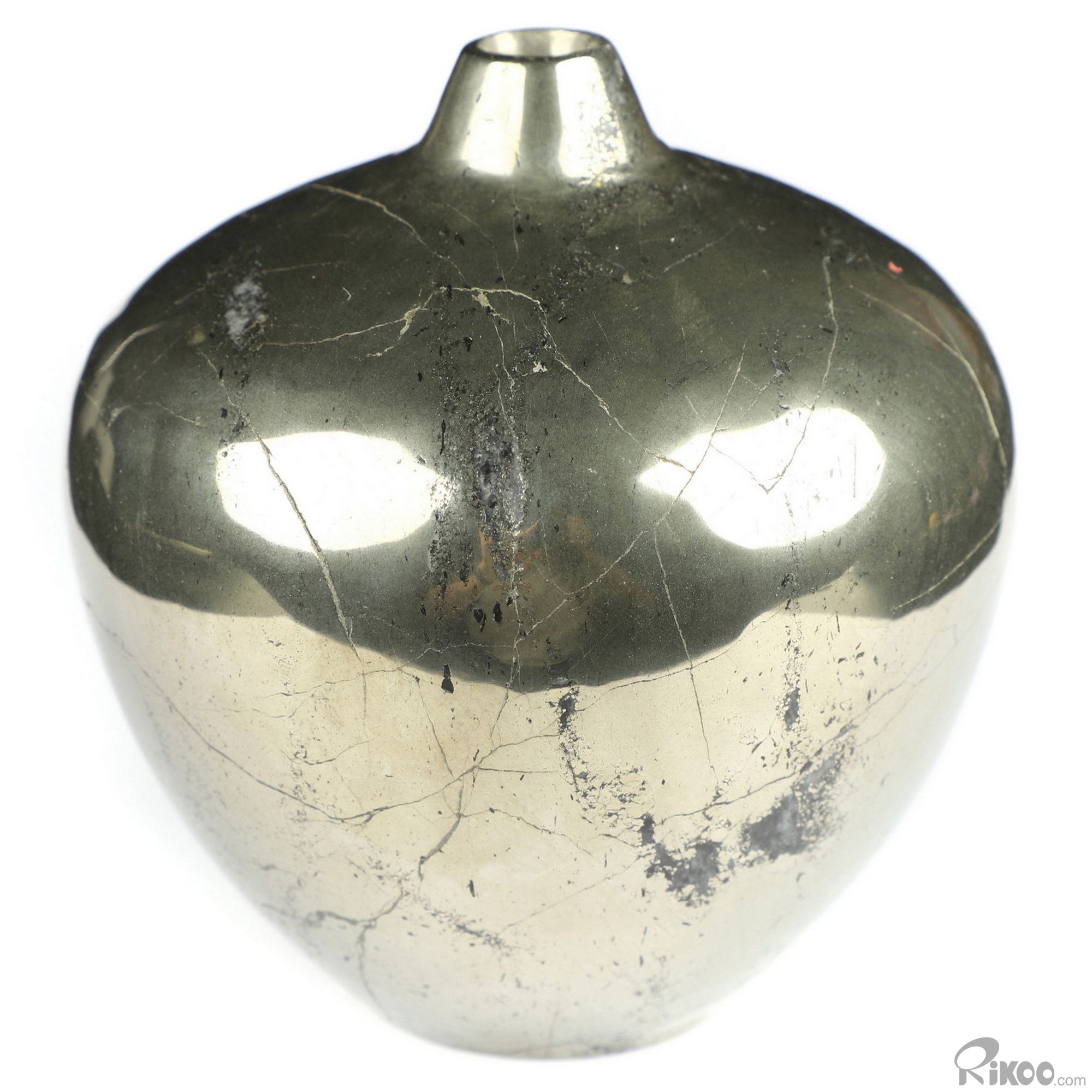 This vase with limited functionality is mainly for display.One of the most grounding stones in use today. Conducting, Energizing, Increases Wealth. Used for focus, practicality, logic, memory, clearing fuzzy thinking/scatteredness etc. like Hematite. Helps Yellow Chakra: Stomach, intestines, ulcers; sulfur and mineral assimilation, circulation, body acidity imbalances, depression, illusions/lack of clarity about situations/people. Great for grounding spiciness after meditation/psychic readings. Represents Sun's golden energy. A mineralized crystal that forms in clusters of metallic like cubes. Color varies from a bright gold or brass to shades of copper or green. Found in most of North America as well as in Chile and Peru. "Fool's Gold". Beneficial to the respiratory and circulatory systems. Connected to the transfer of oxygen from the lungs to the bloodstream. Helps the skin protect itself from the elements, and also aids the digestive tract, lessening irritation by ingested toxins. The most important gift of Pyrite, though, is its ability to aid mental capacity. Helps to balance creative and intuitive impulses with scientific and practical ones. communication skills can also improve with the help of Pyrite, which eases anxiety and frustration. Strongly suggested for people who tackle large conceptual ideas in business, the arts, or education. Effective in attracting money to its owner. The stimulation of the mind can be enhanced by using Pyrite in conjunction with Fluorite and Calcite.