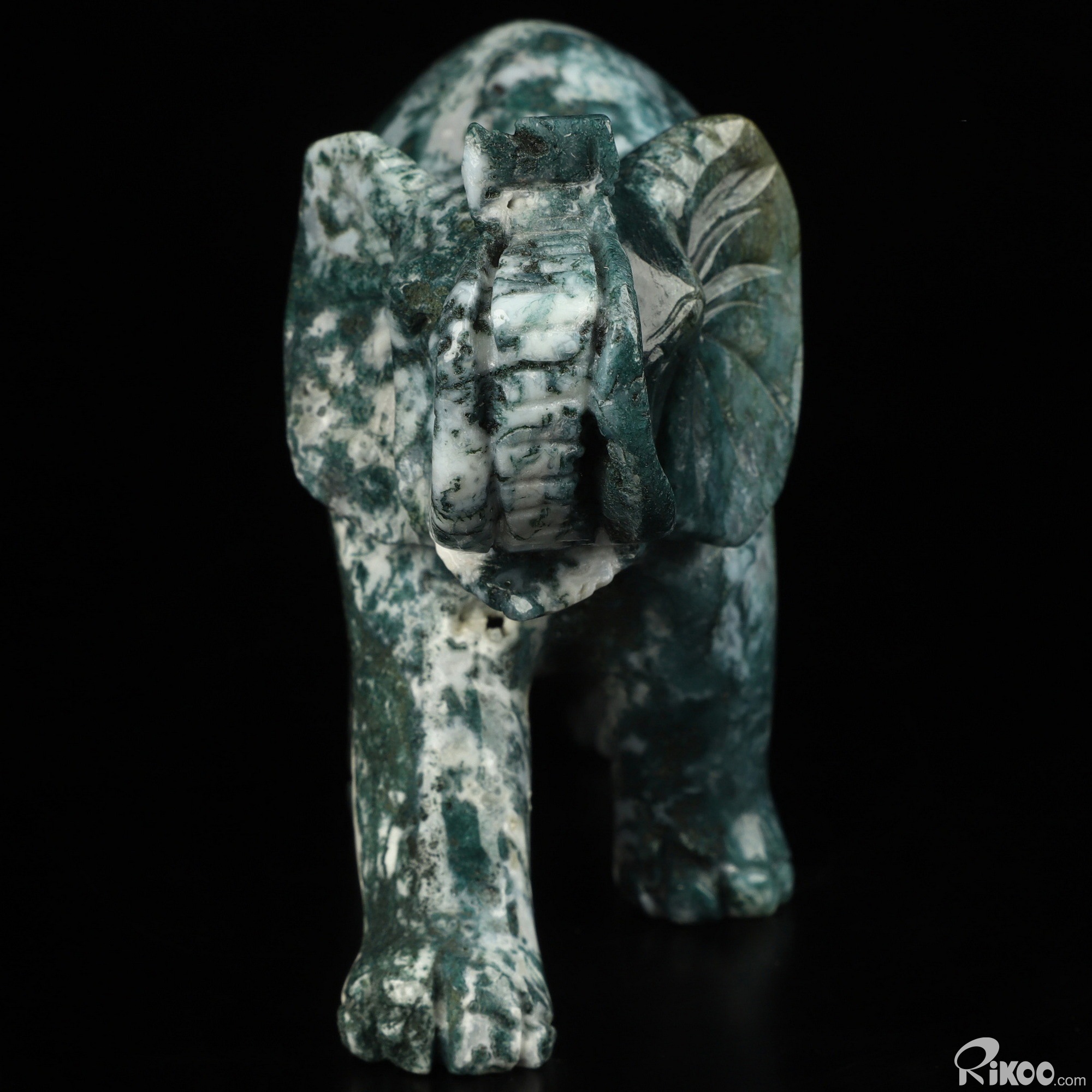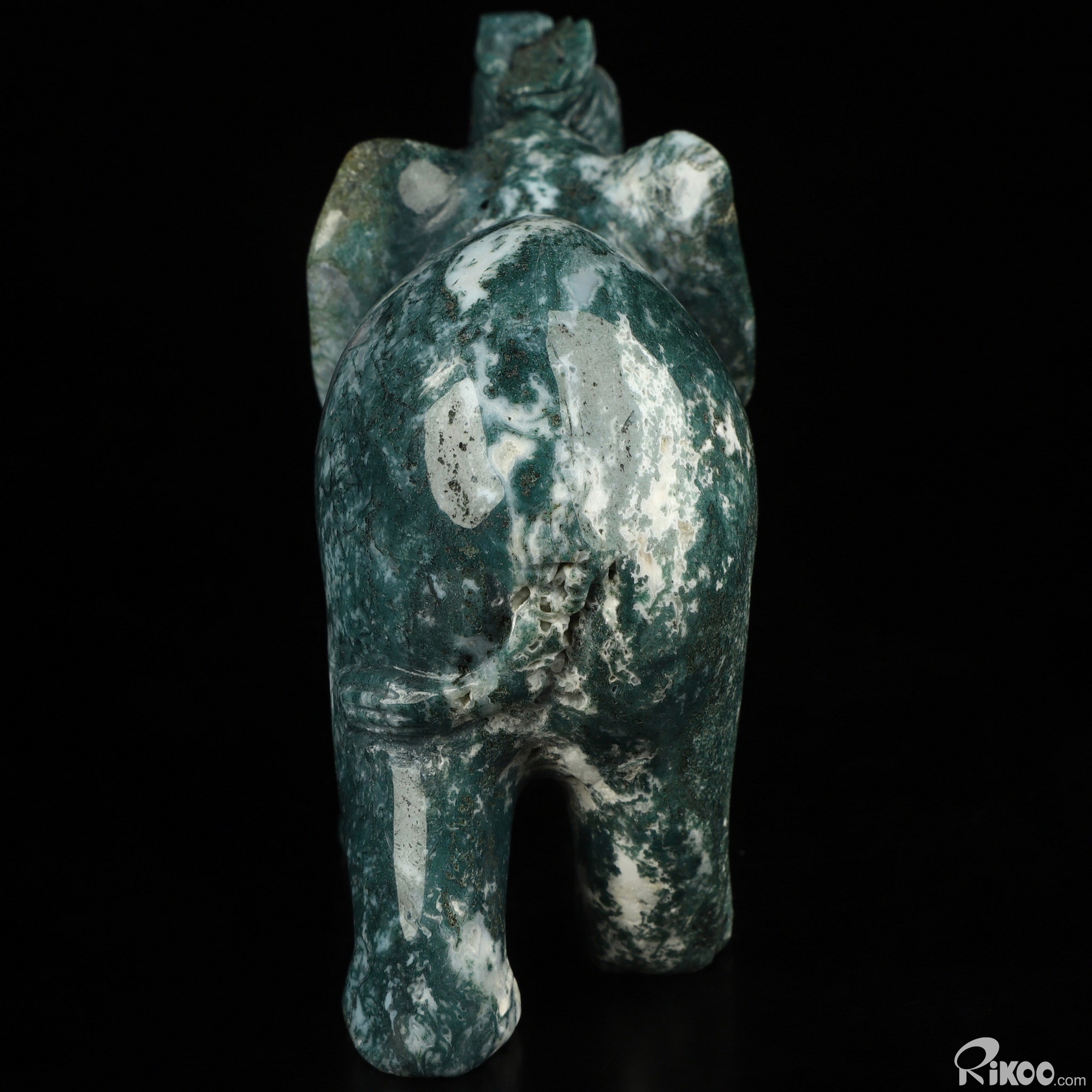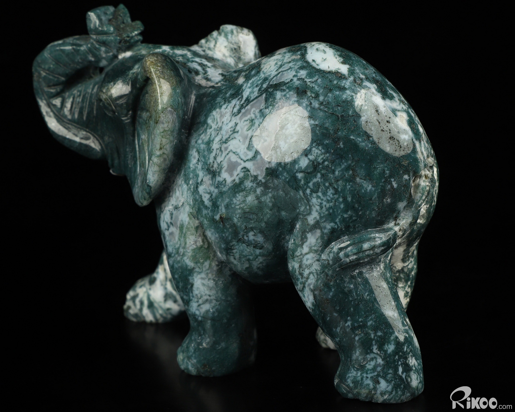 You are looking at a Green Moss Agate Elephant. The Elephant is 4.4 inches long from front to back.