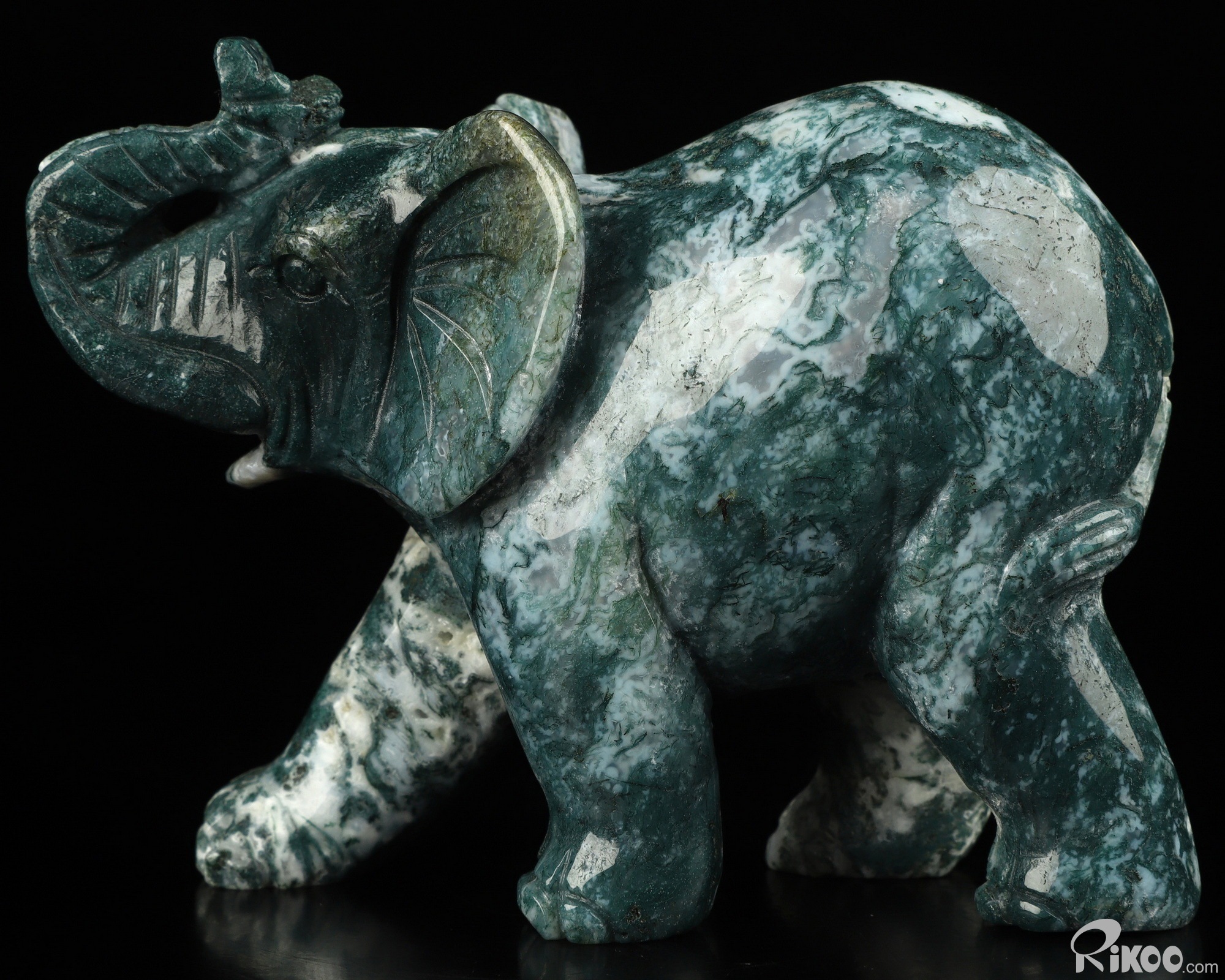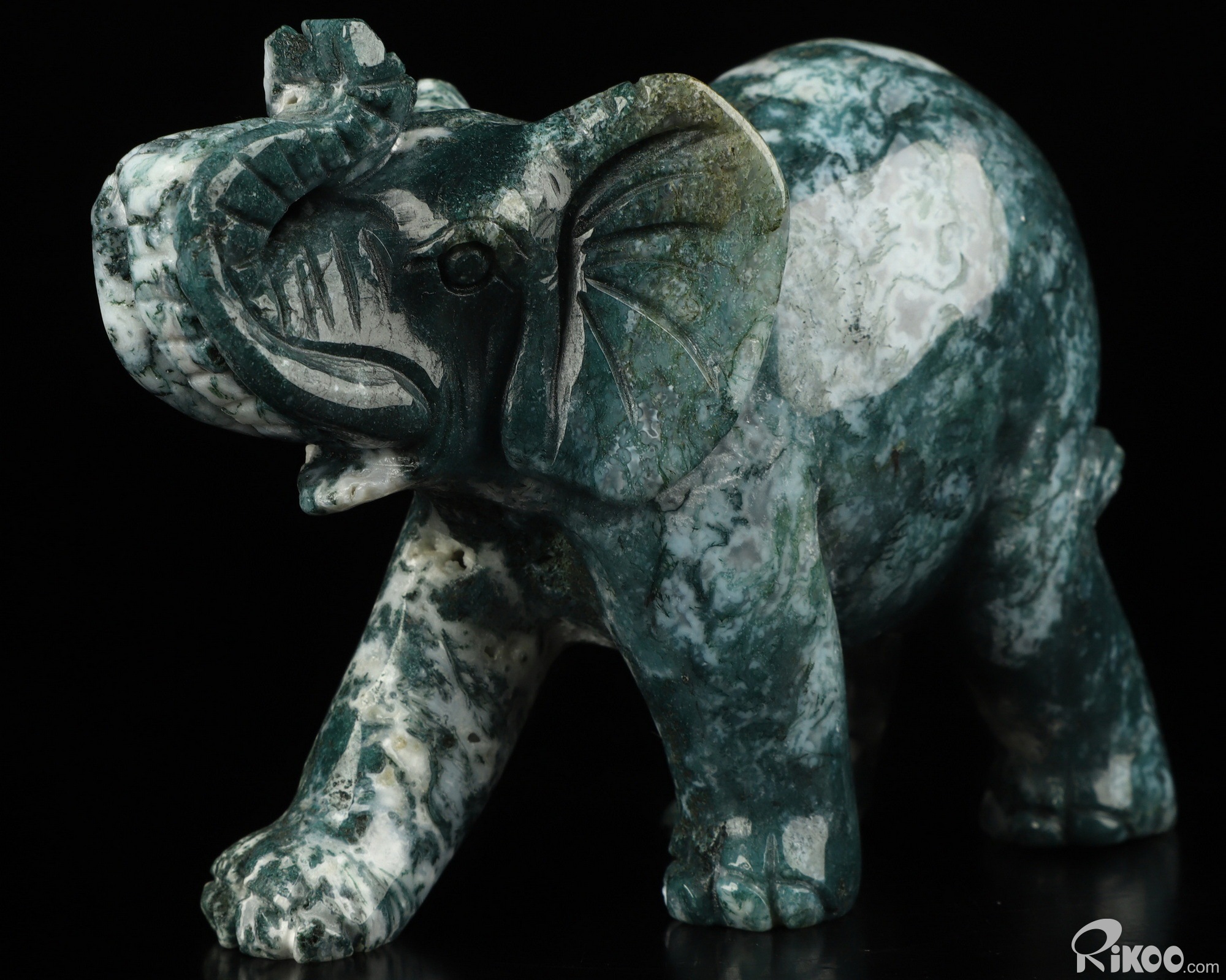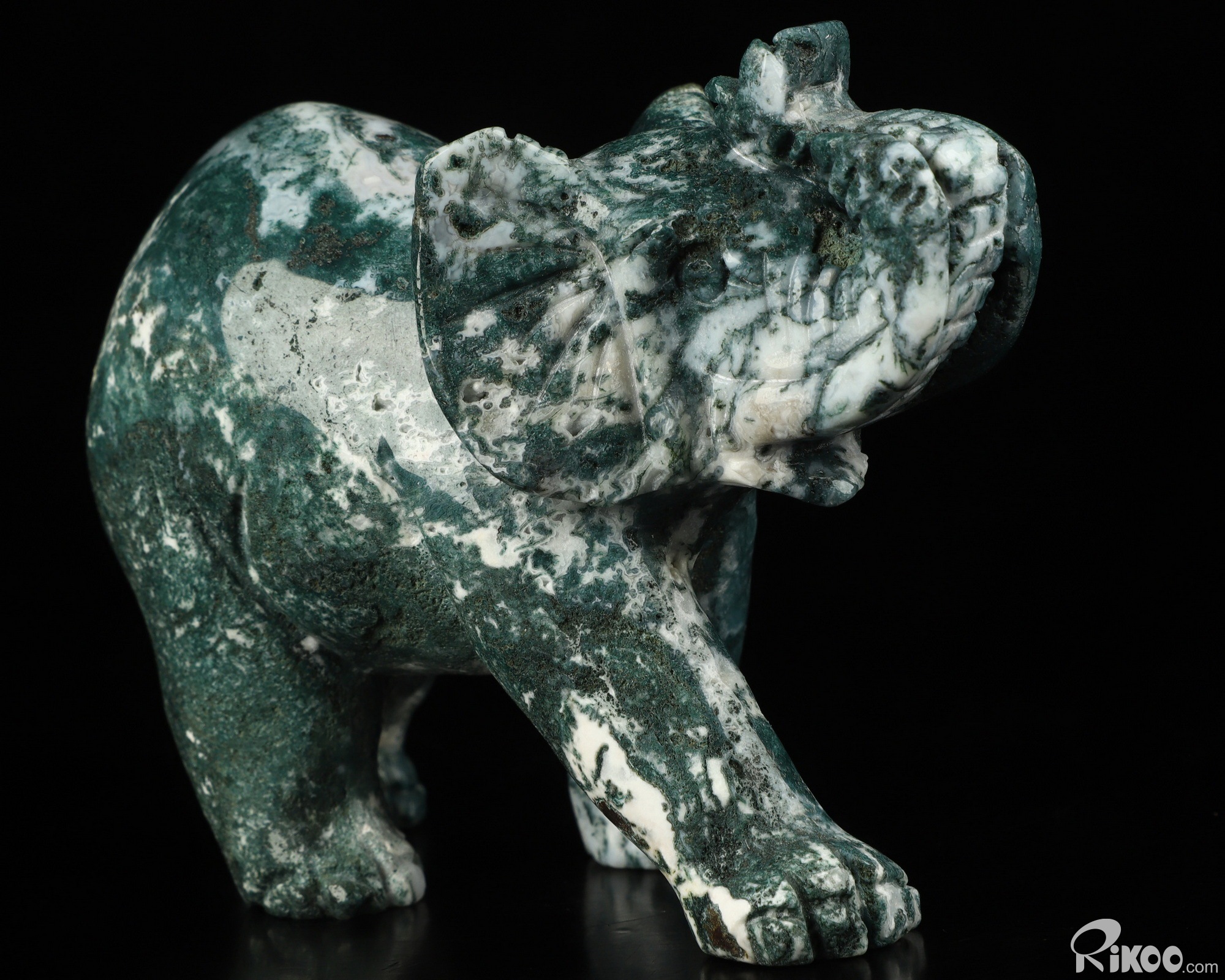 You are looking at a Green Moss Agate Elephant. The Elephant is 4.4 inches long from front to back.