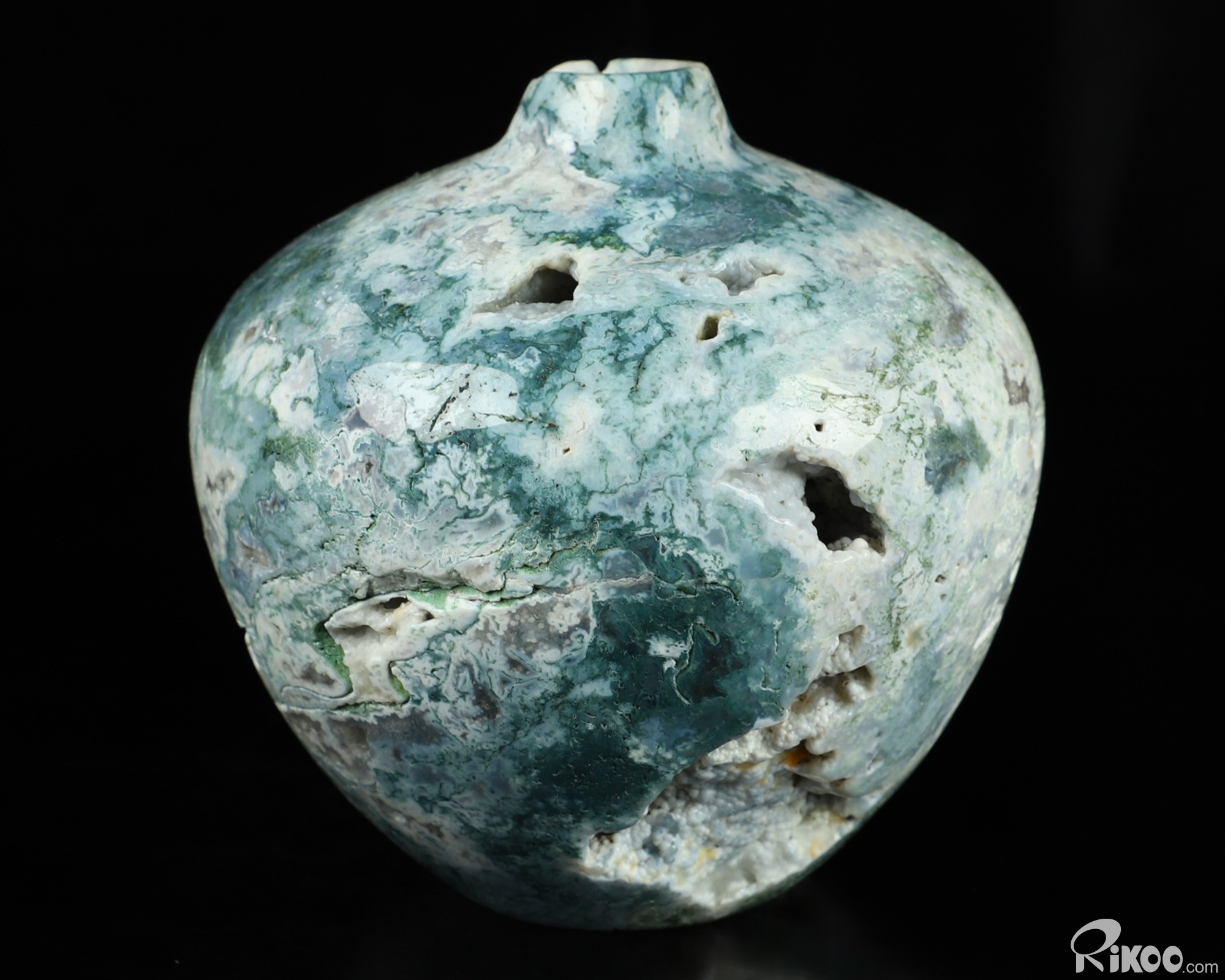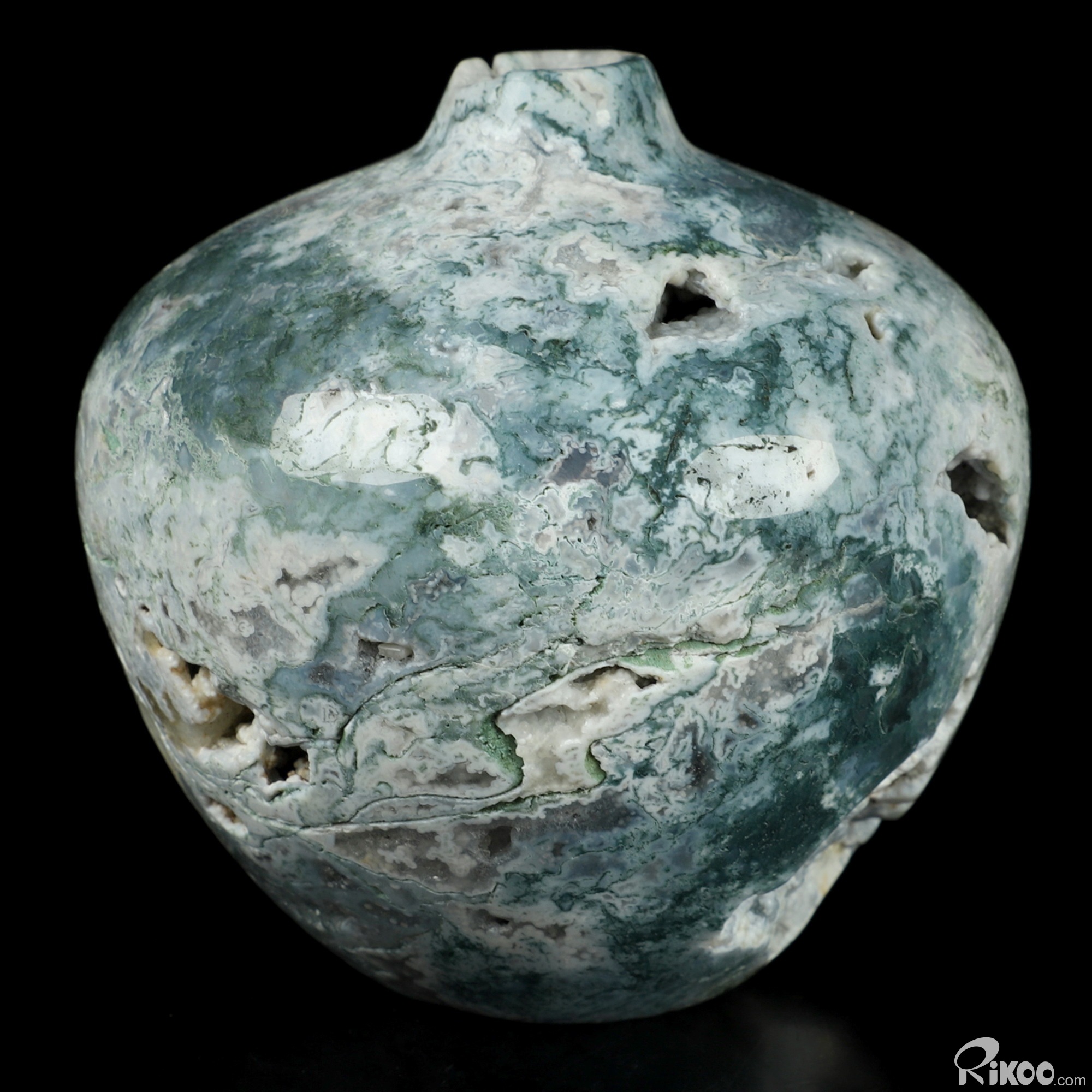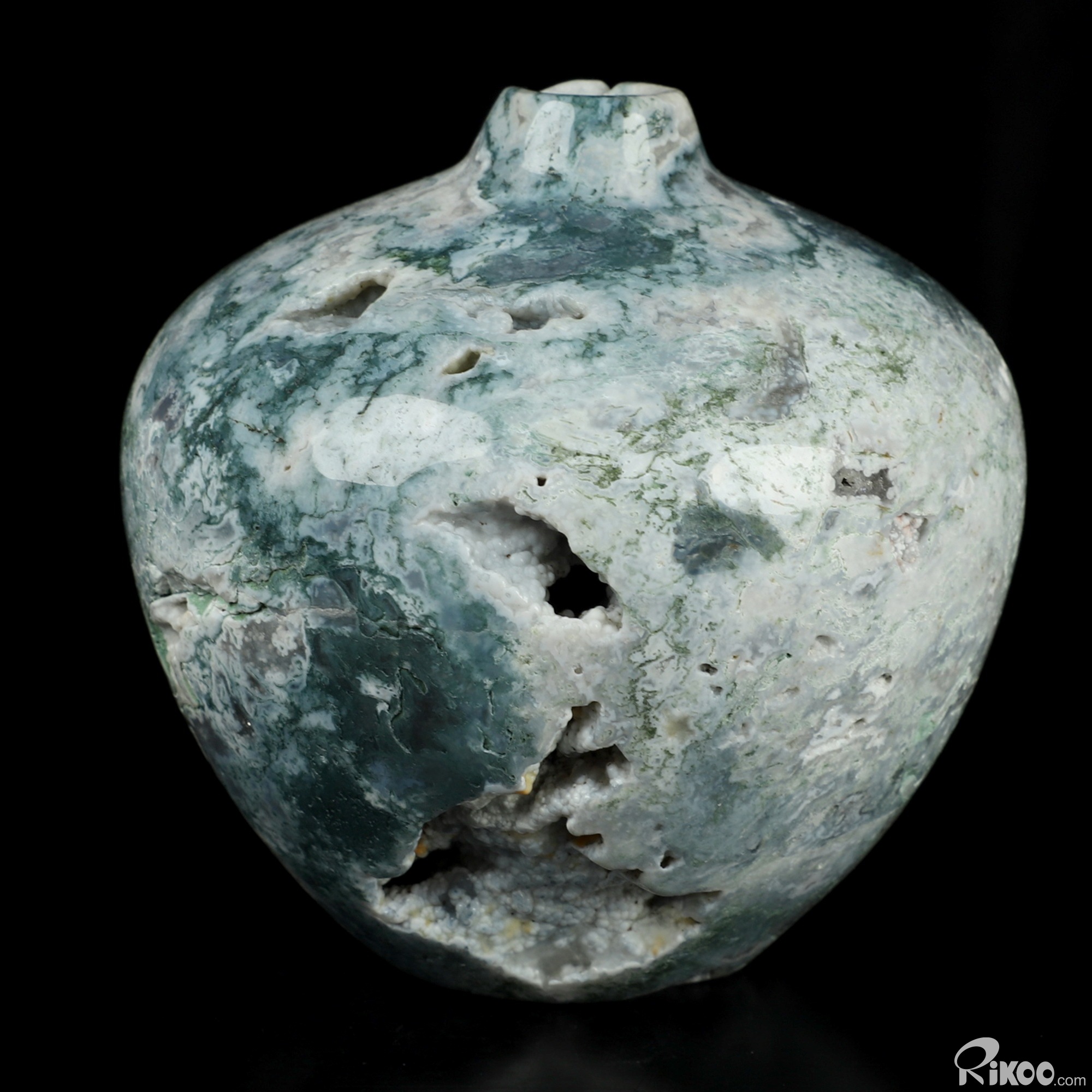 This vase with limited functionality is mainly for display.Connects one to Nature. Translucent, transparent agate containing inclusions of minerals that look like moss or foliage. Improves ego and self-esteem, emotional balance and strengthens positive personality traits. Allows one to see all the beauty one's eyes touch.