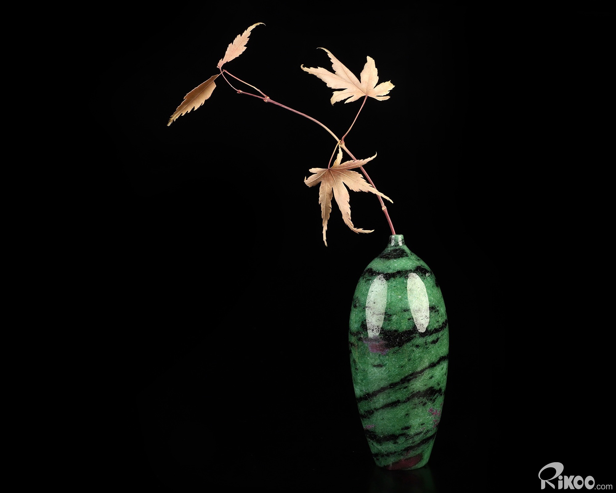 This vase with limited functionality is mainly for display.Green and black, often with red streaks of ruby. For trust in the universe, releasing fears. Strengthens heart, energy/adrenals and reproductive Chakra. General health. This stone can be used to dispel laziness and idleness. It is often used in treating disorders of the middle and upper jaios in Chinese Medicine, considered the heart, spleen, stomach, pancreas and lungs. When Zoisite is shared with ruby in it's matrix, it shares the same metaphysical properties of both stones. When this stone is found in the colors of the upper Chakra, clear, blue, purple, violet, it is considered the rare stone, Tanzanite.