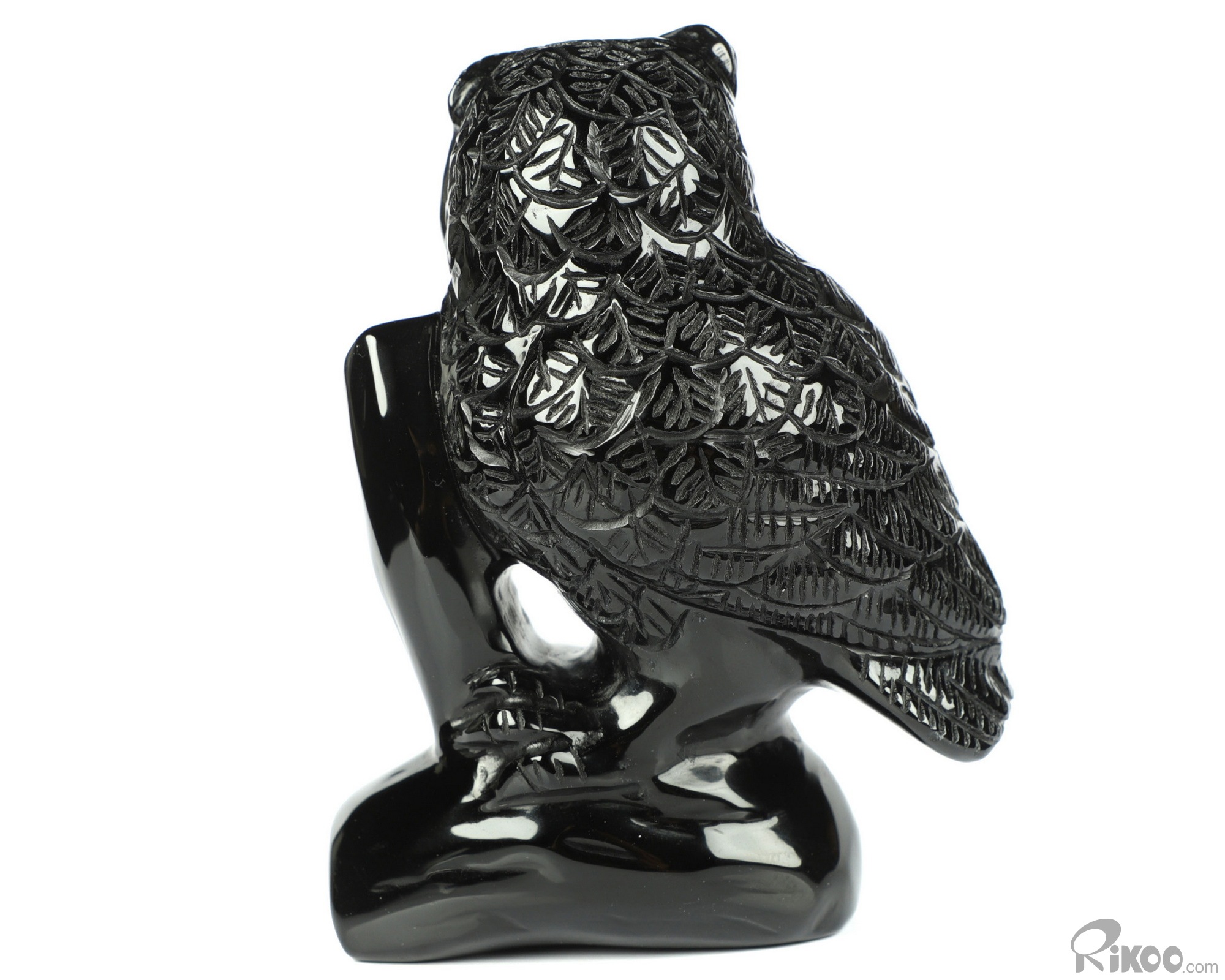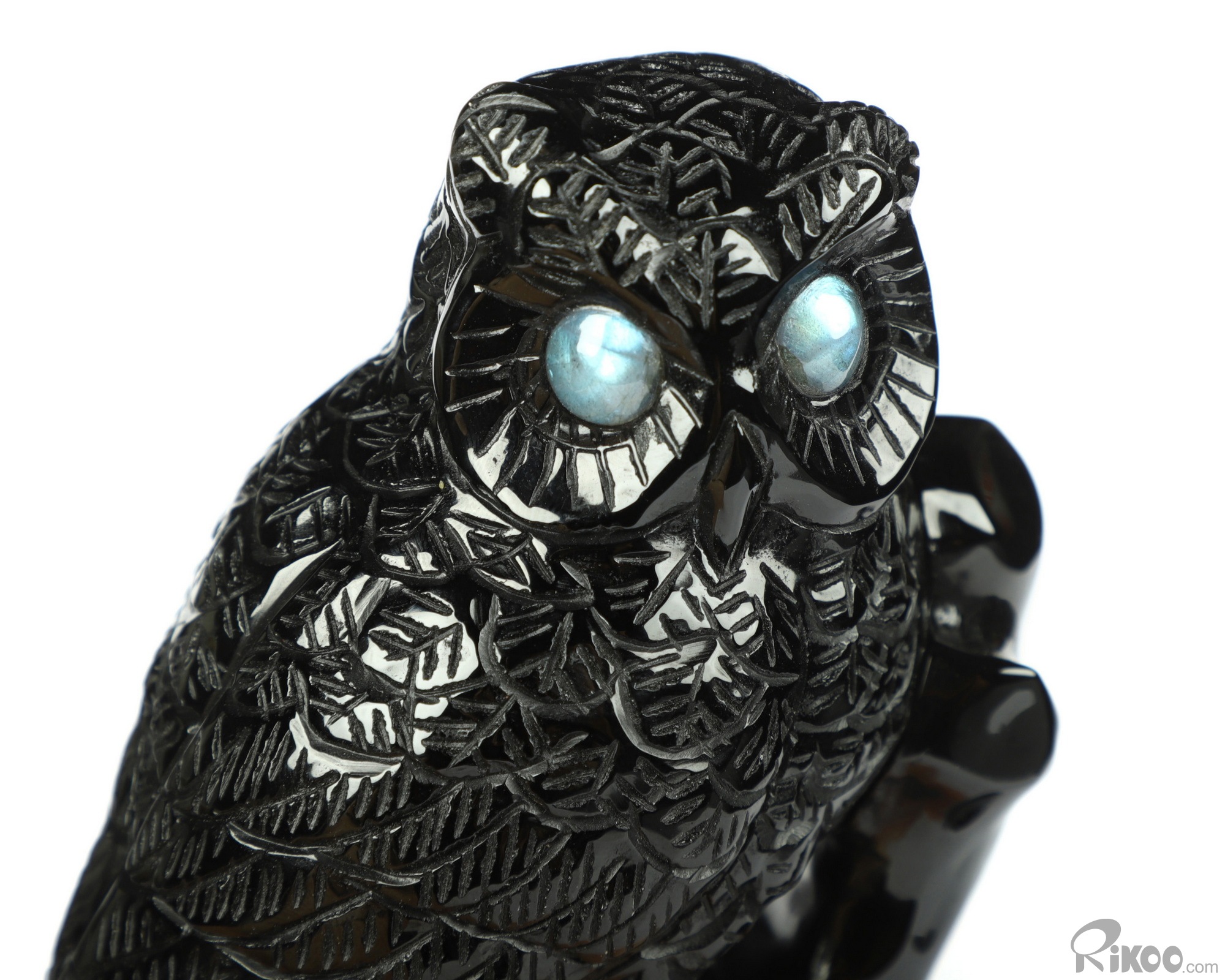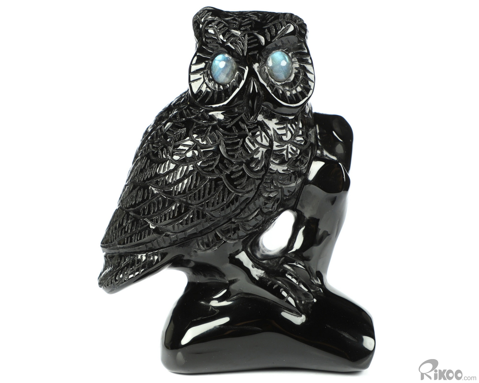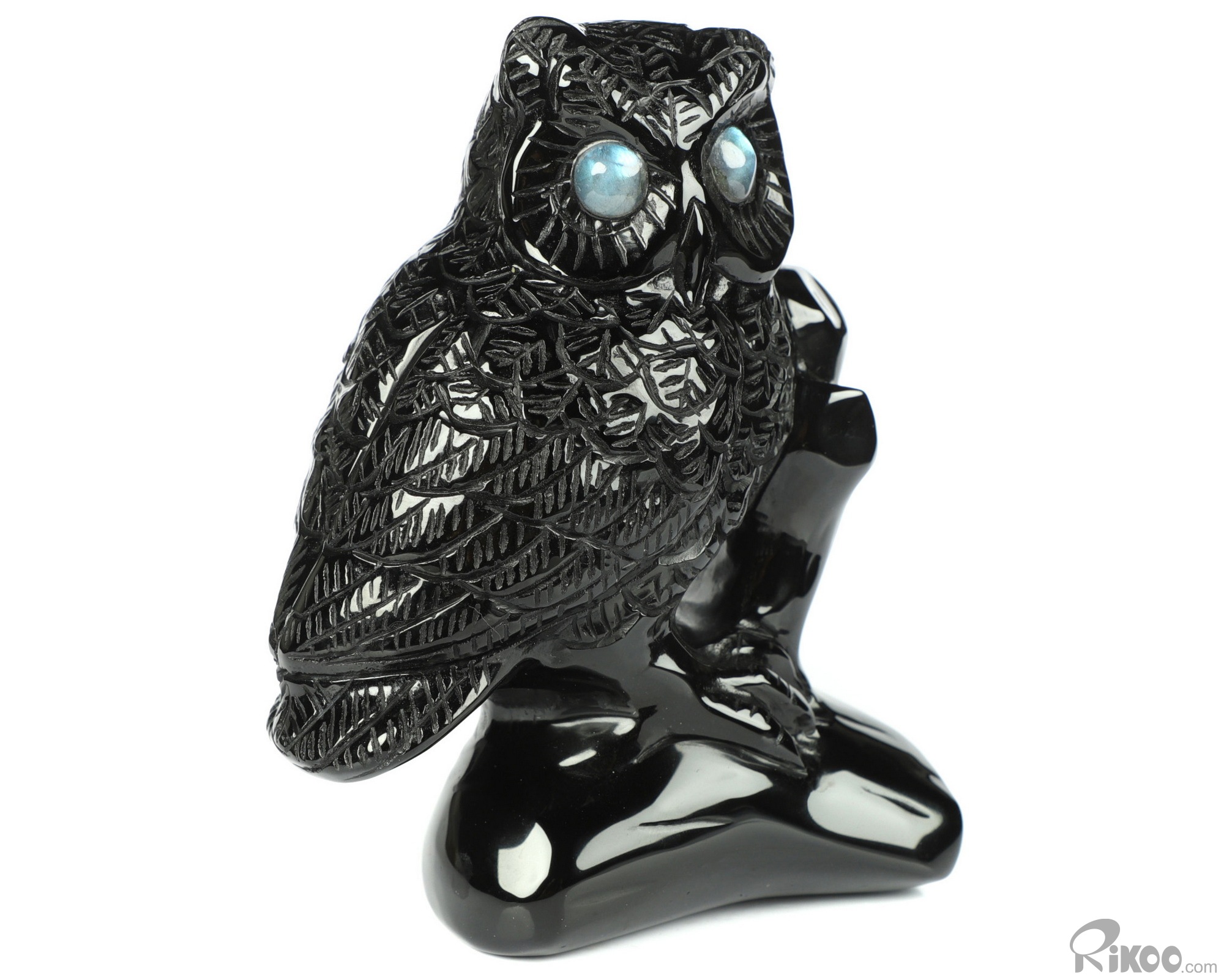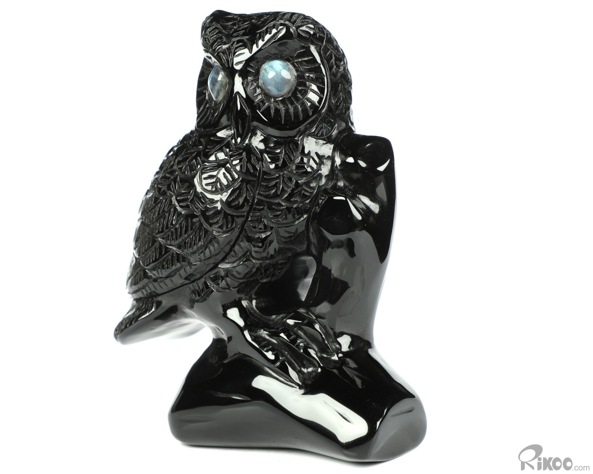 4.6" Black Obsidian Carved Crystal Owl & Labradorite Eyes Sculpture, Realistic