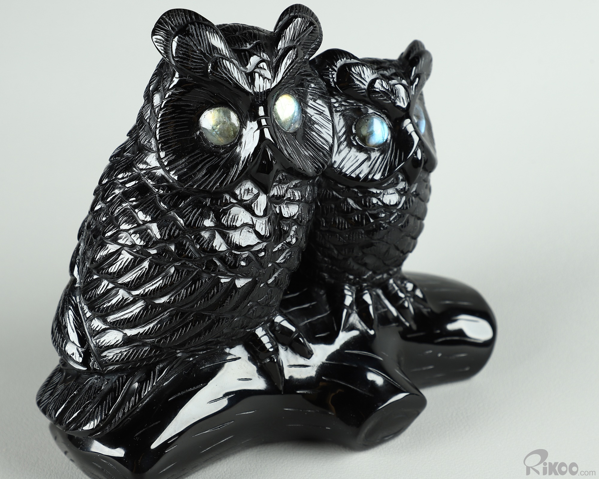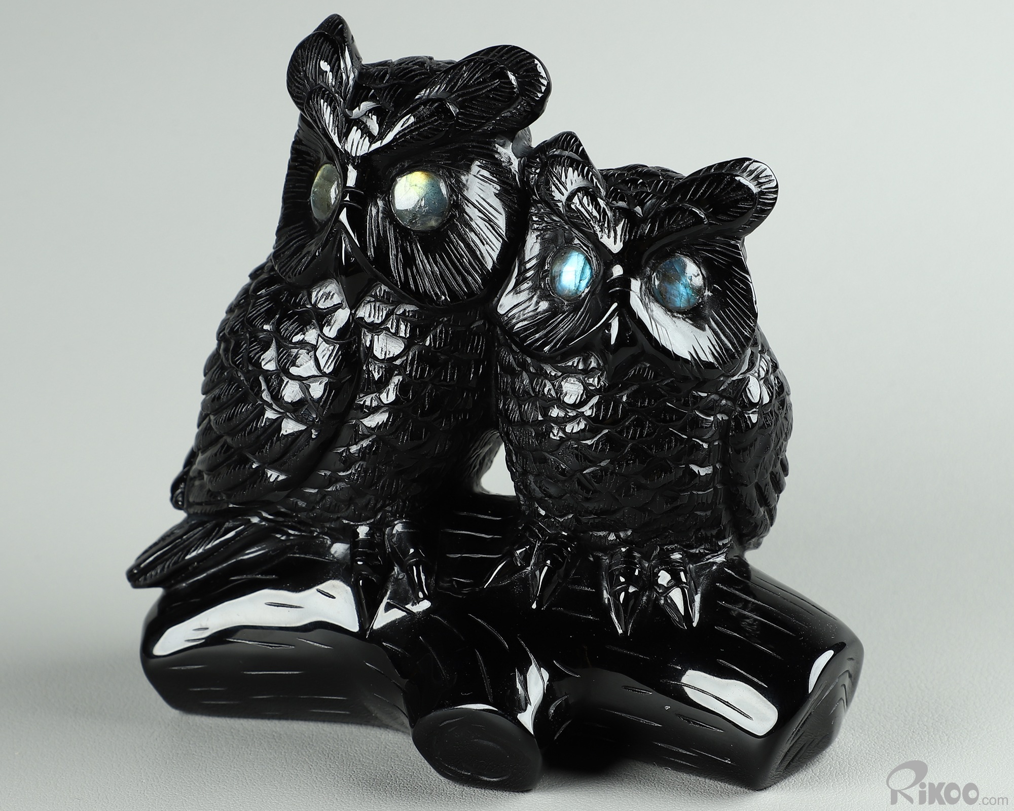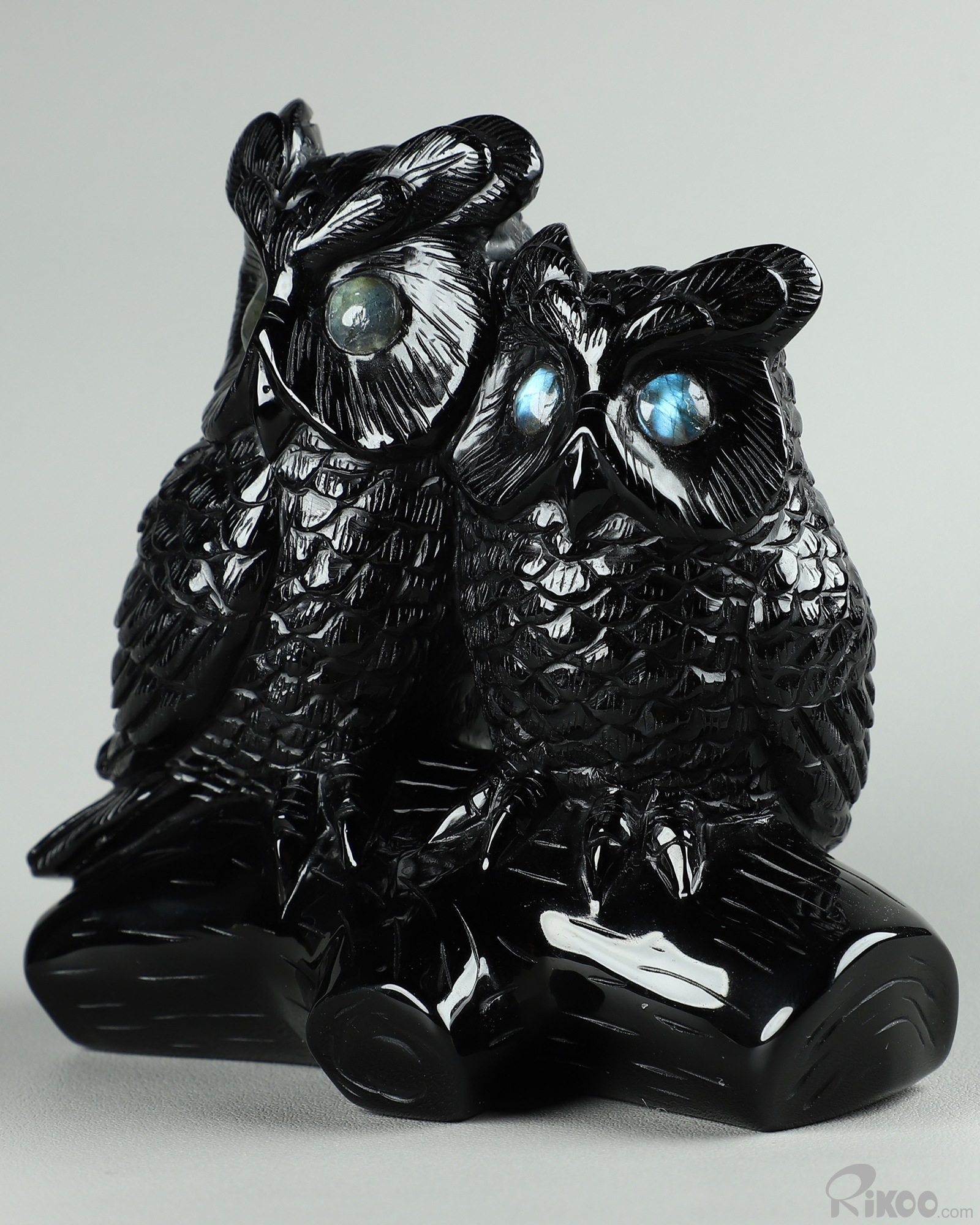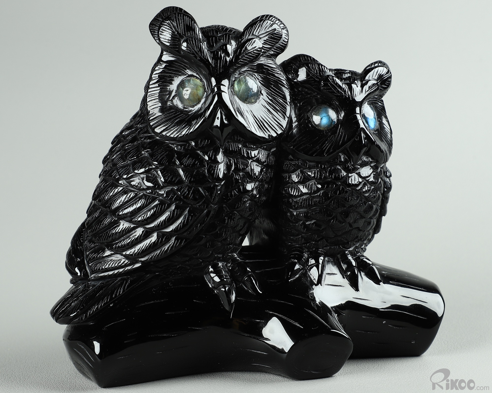 4.7" Black Obsidian Carved Owl Crystal Owls & Labradorite Eyes Sculpture, Realistic, Crystal Healing