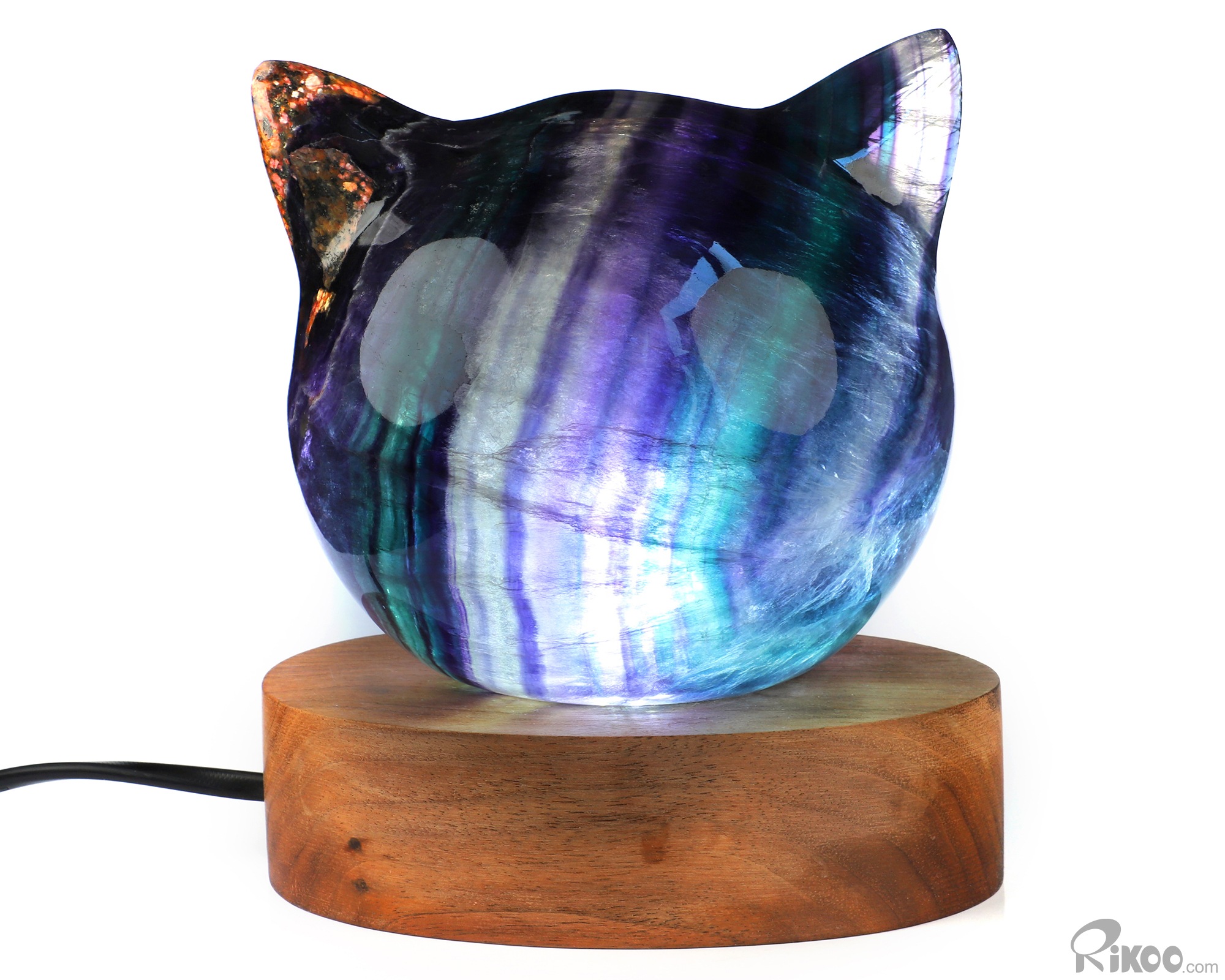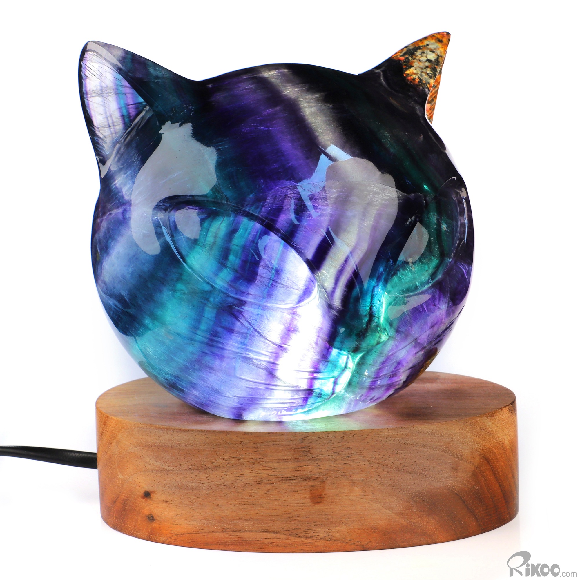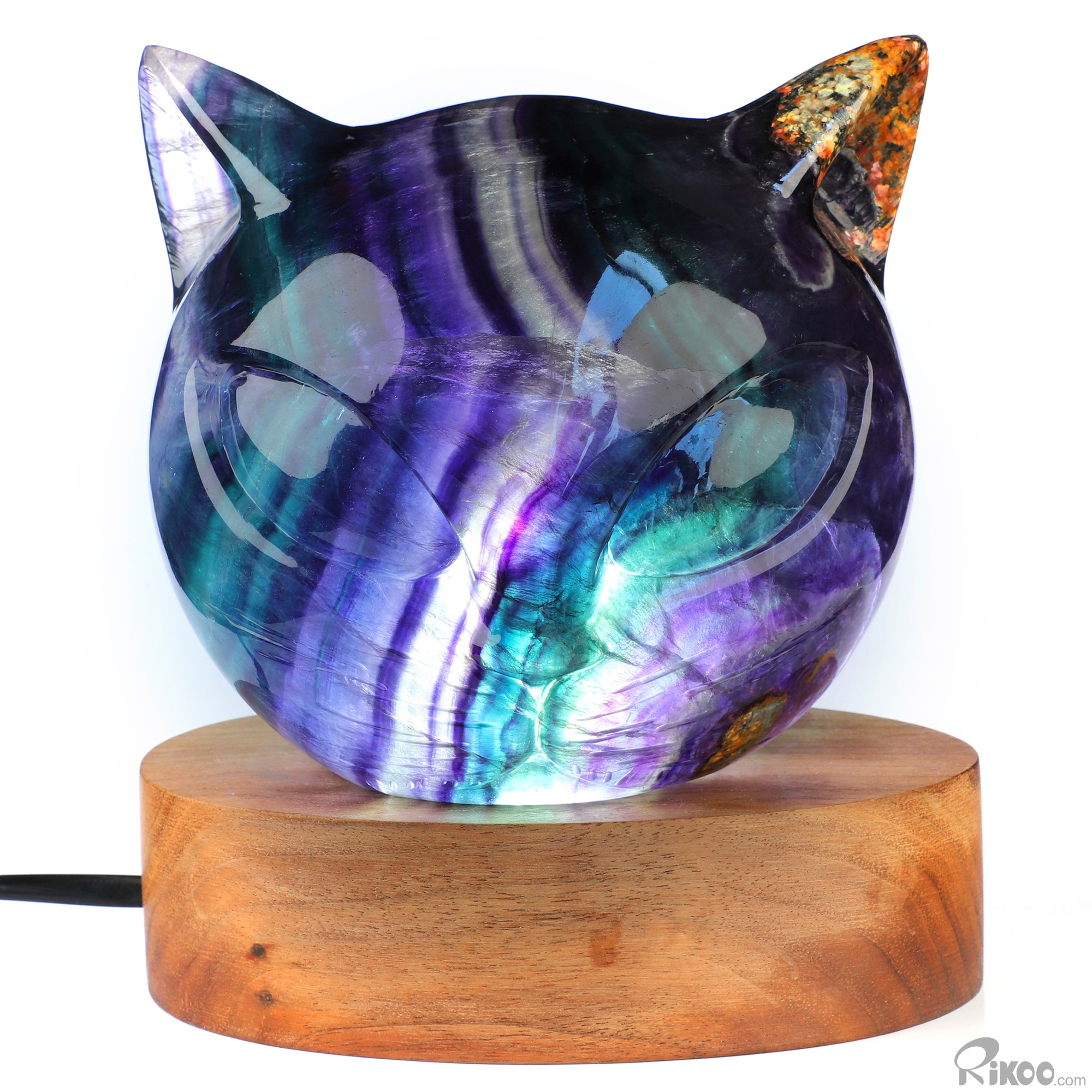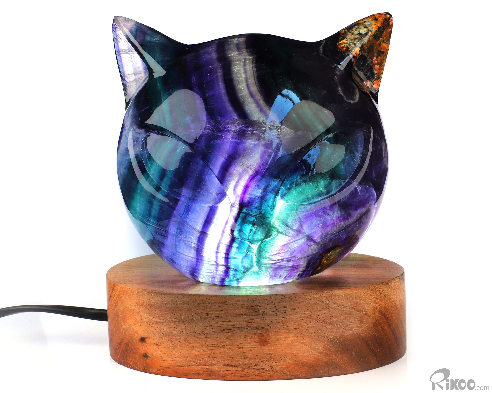 4.7" Fluorite Hand Carved Hollow Crystal Cat Head Sculpture Lamp/Light with Led Stand, Crystal Healing