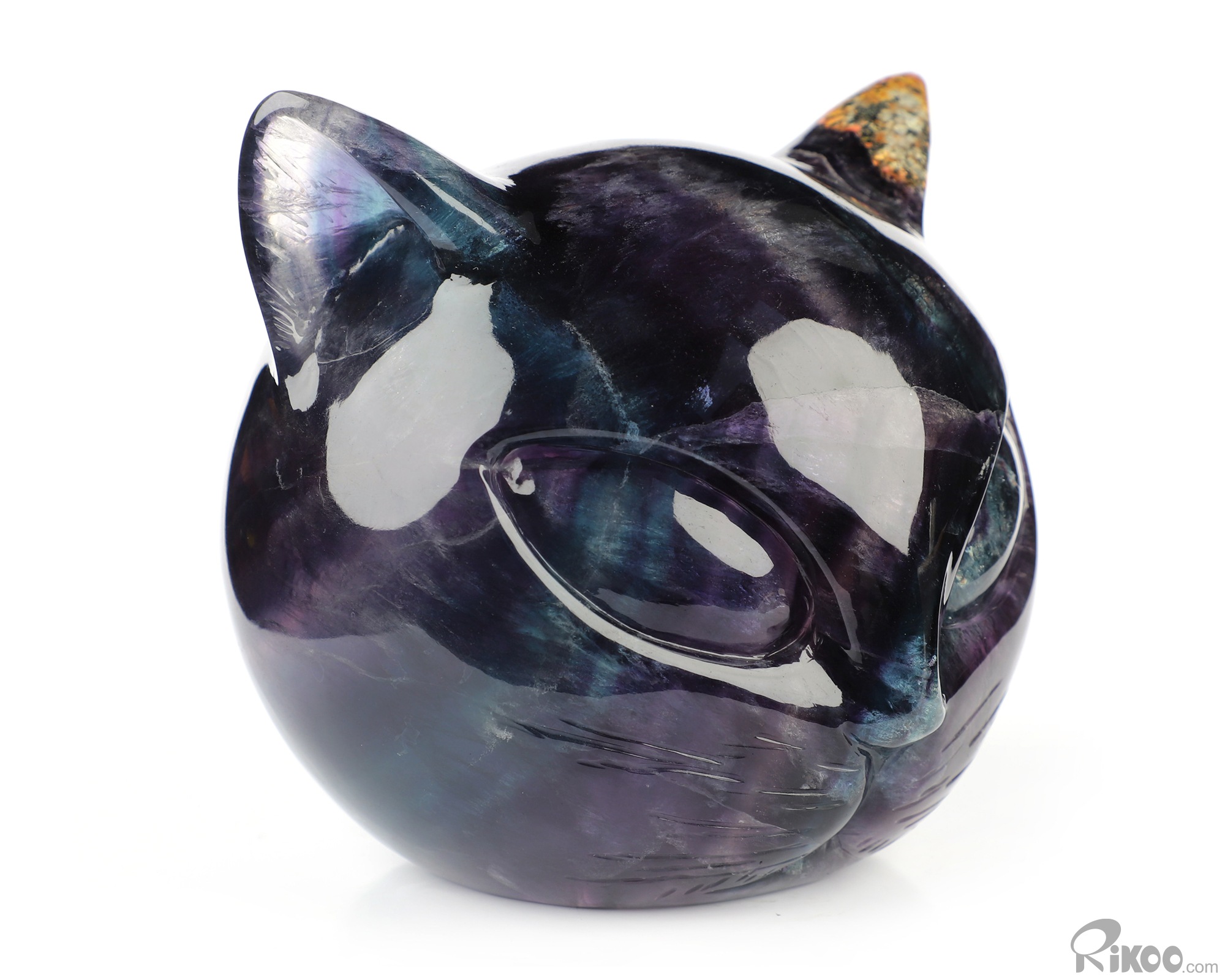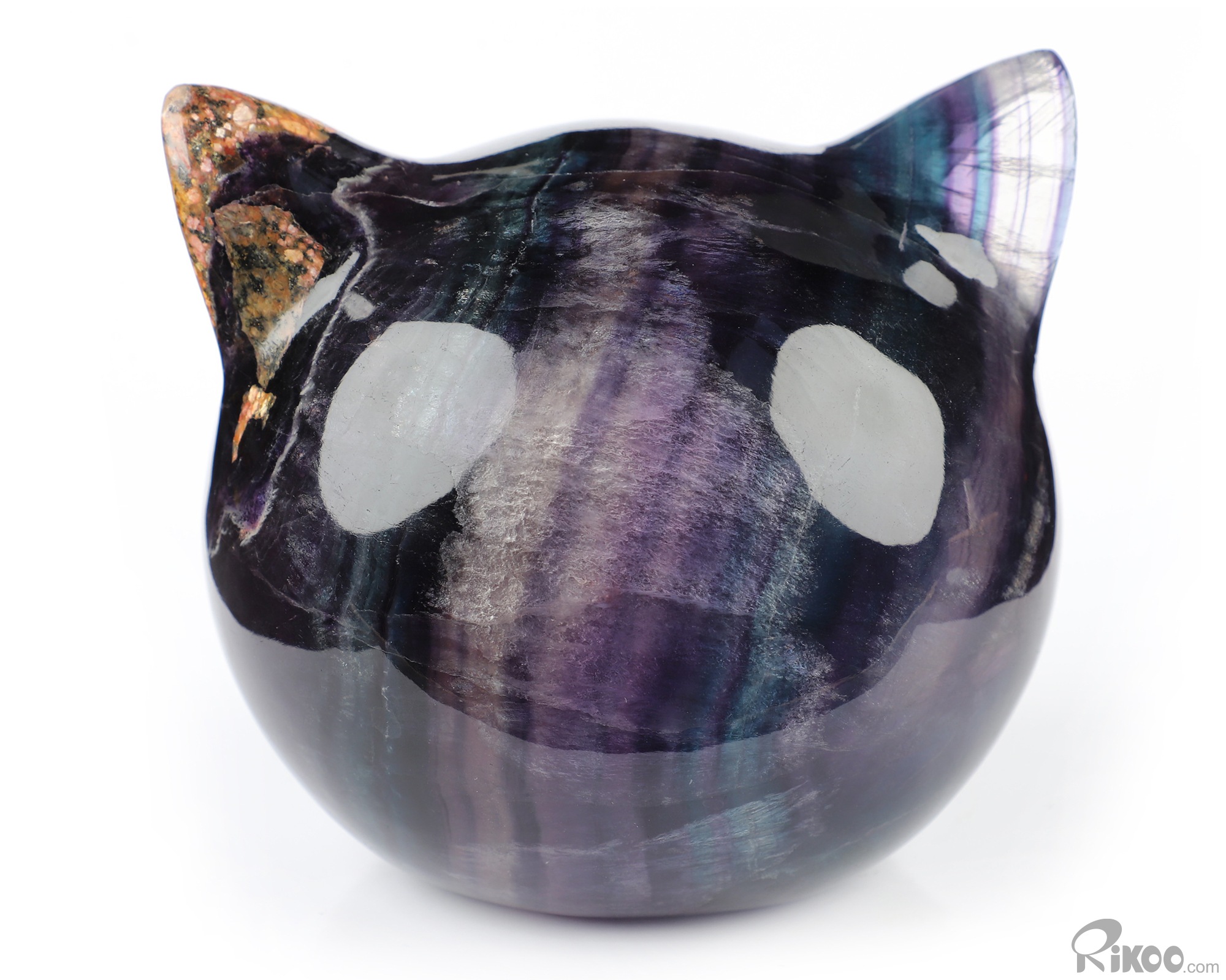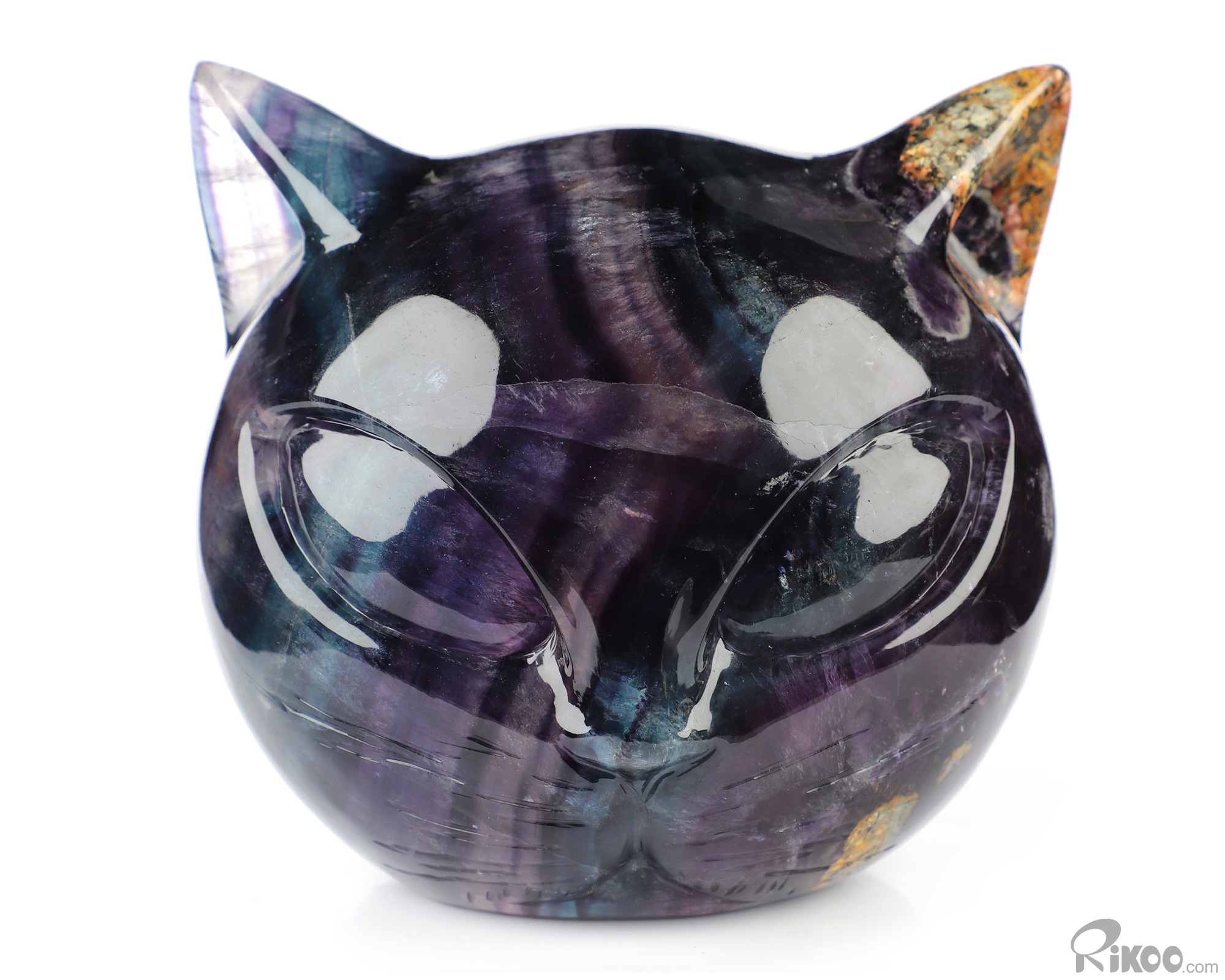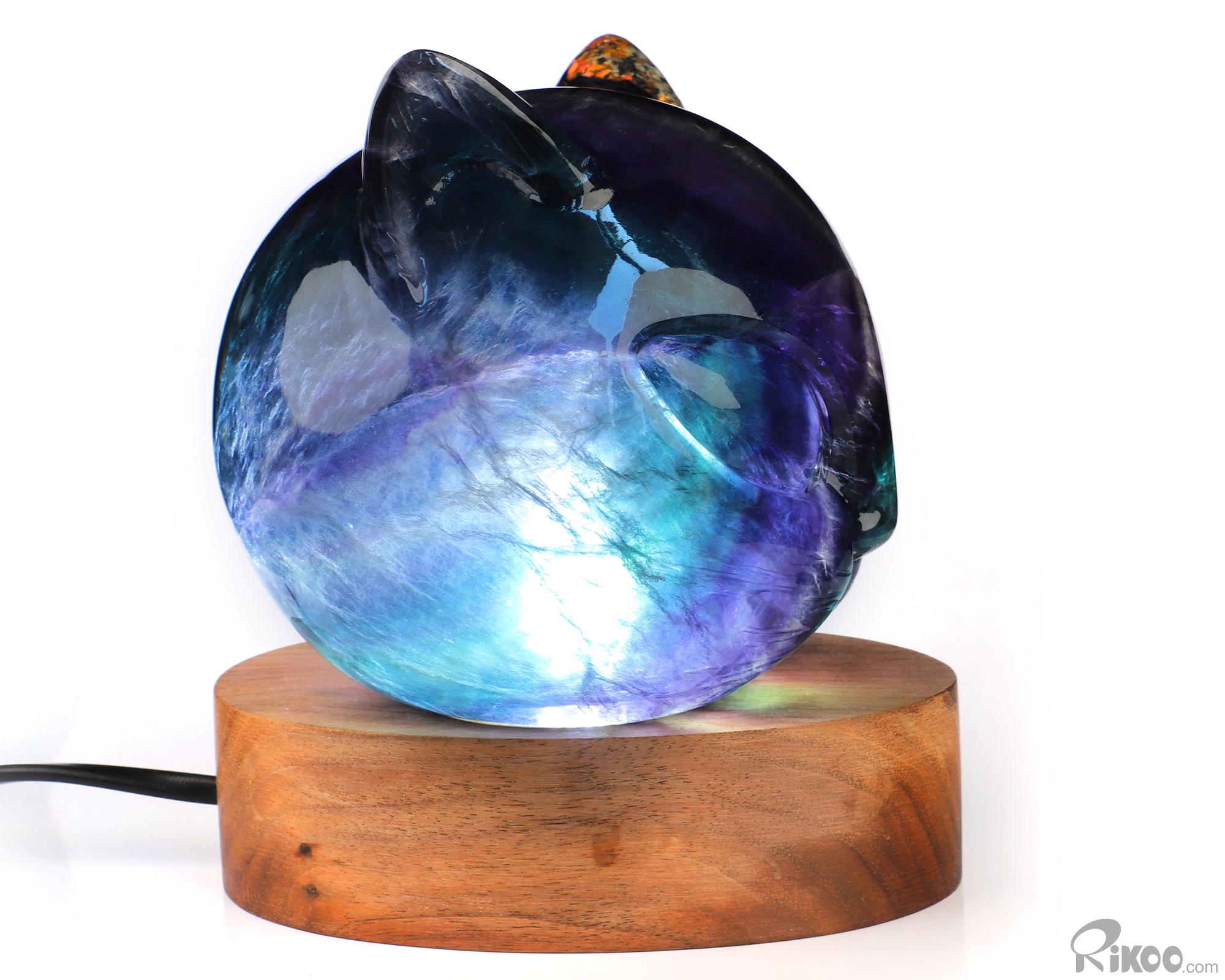 4.7" Fluorite Hand Carved Hollow Crystal Cat Head Sculpture Lamp/Light with Led Stand, Crystal Healing