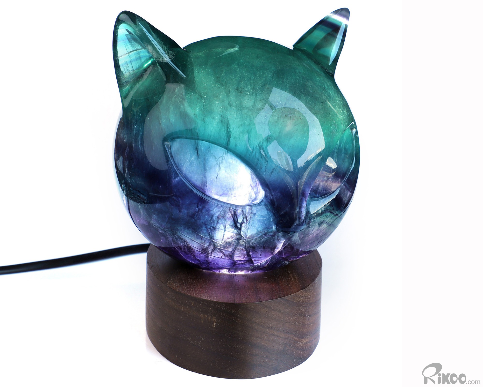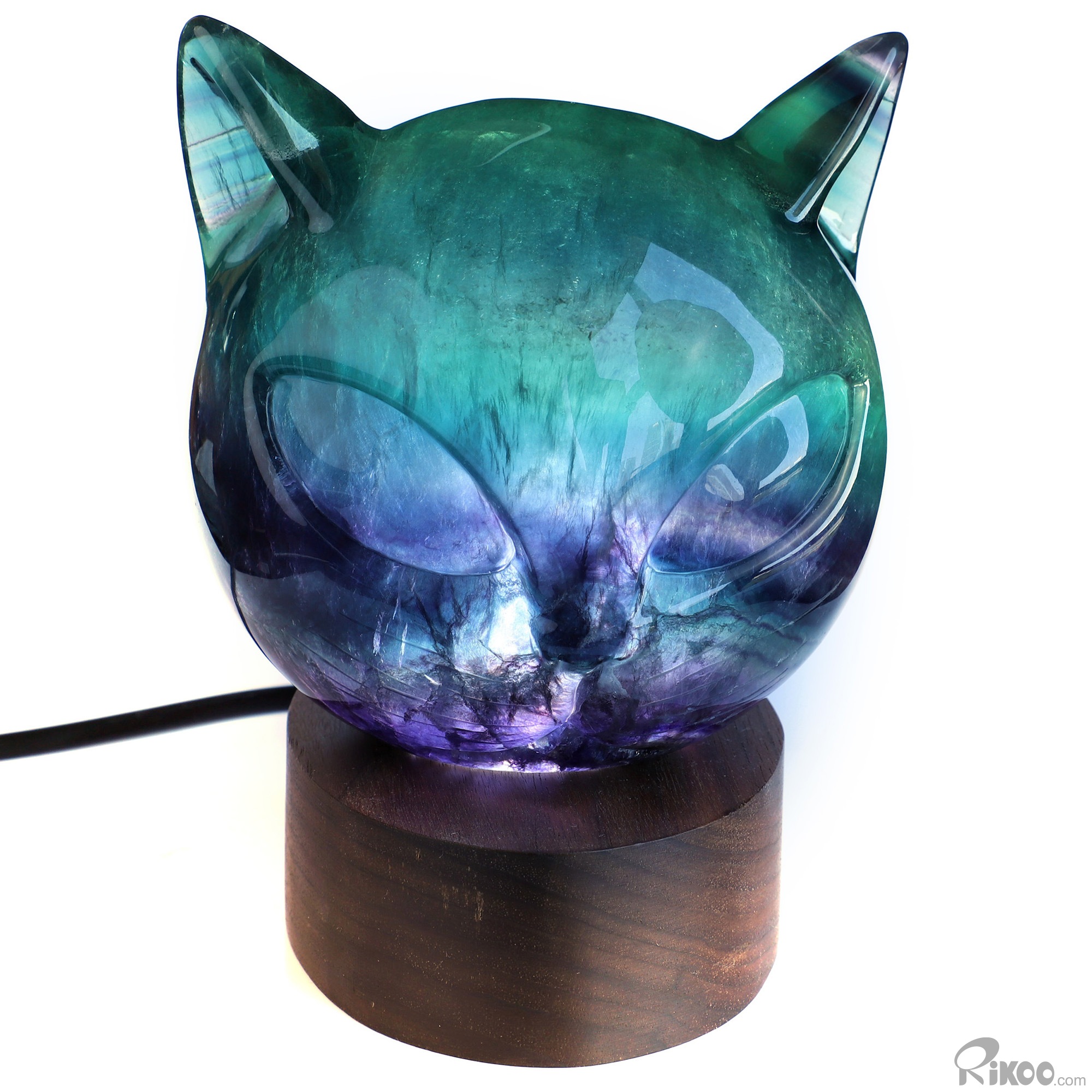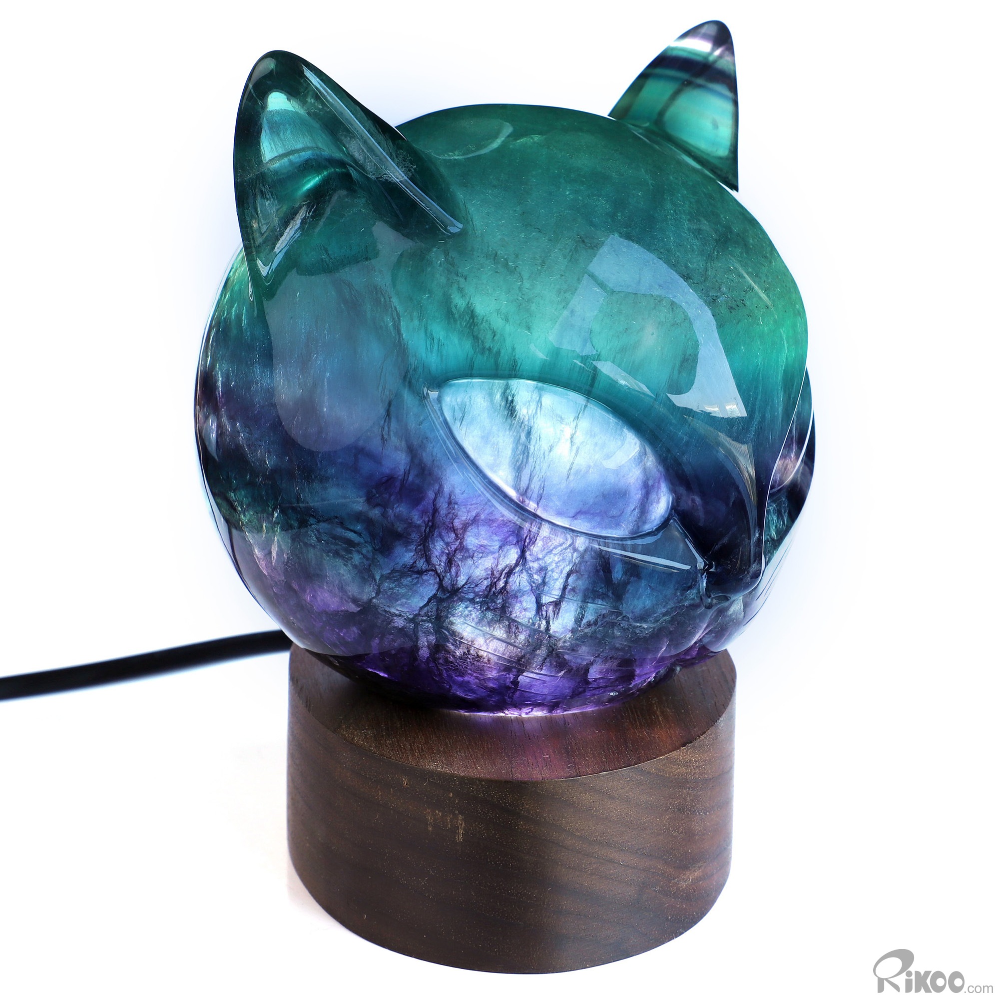 4.9" Fluorite Hand Carved Hollow Crystal Cat Sculpture with Led Stand, Crystal Healing