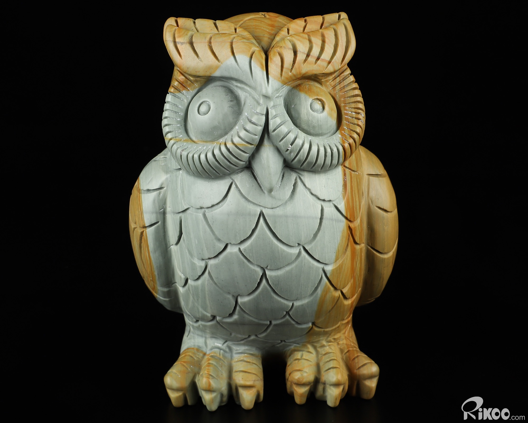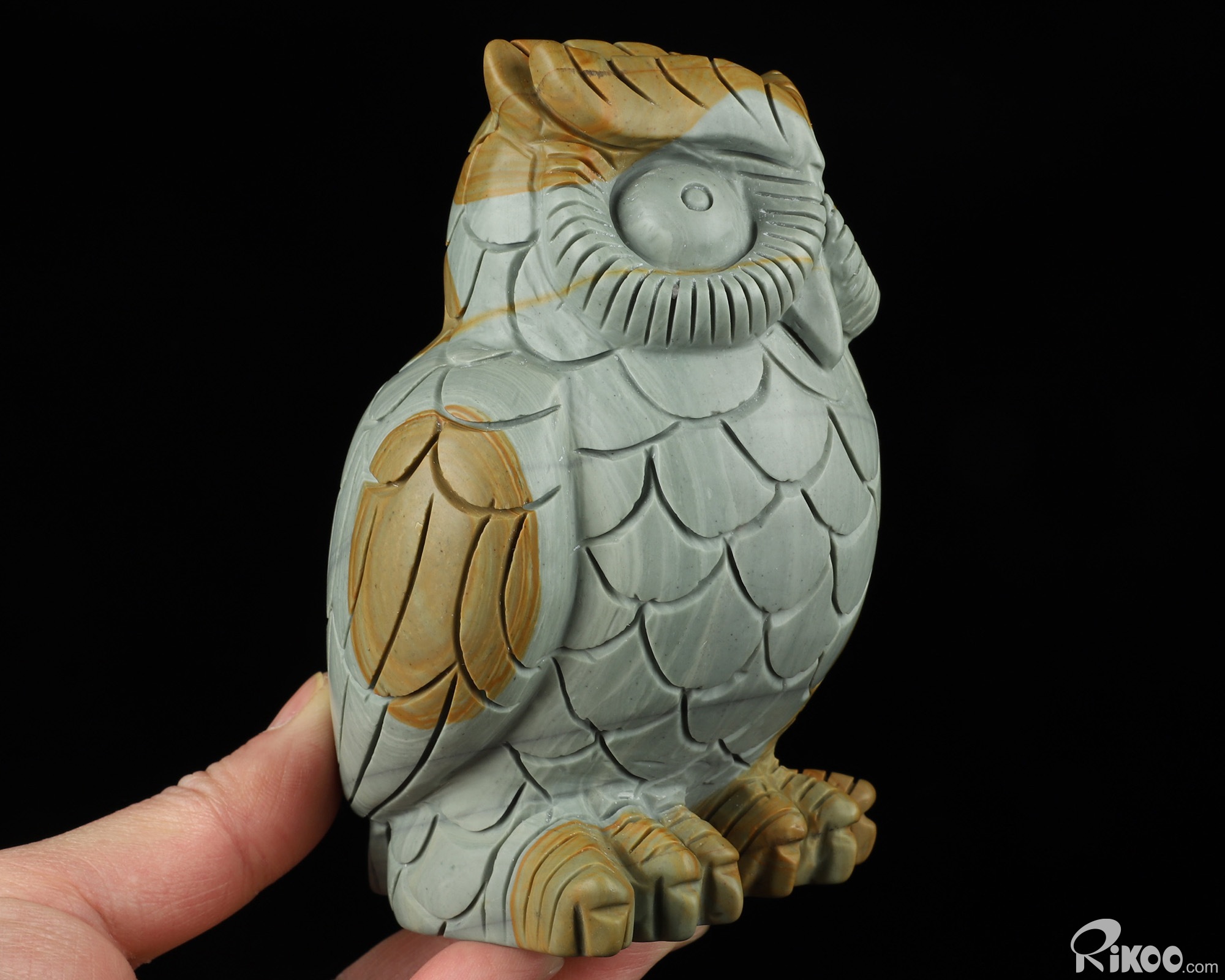 You are looking at a Polychrome Jasper Owl. The Owl is 4.9 inches long from front to back.