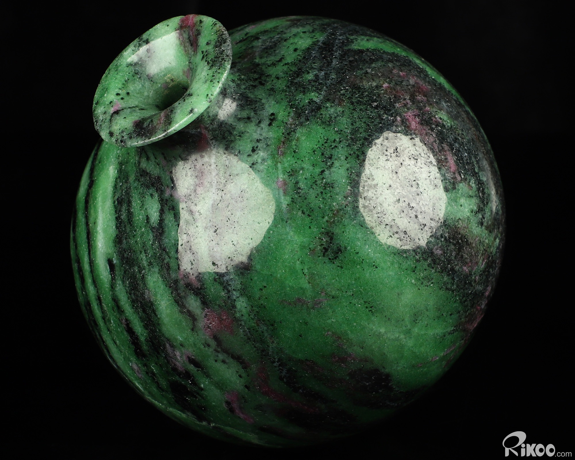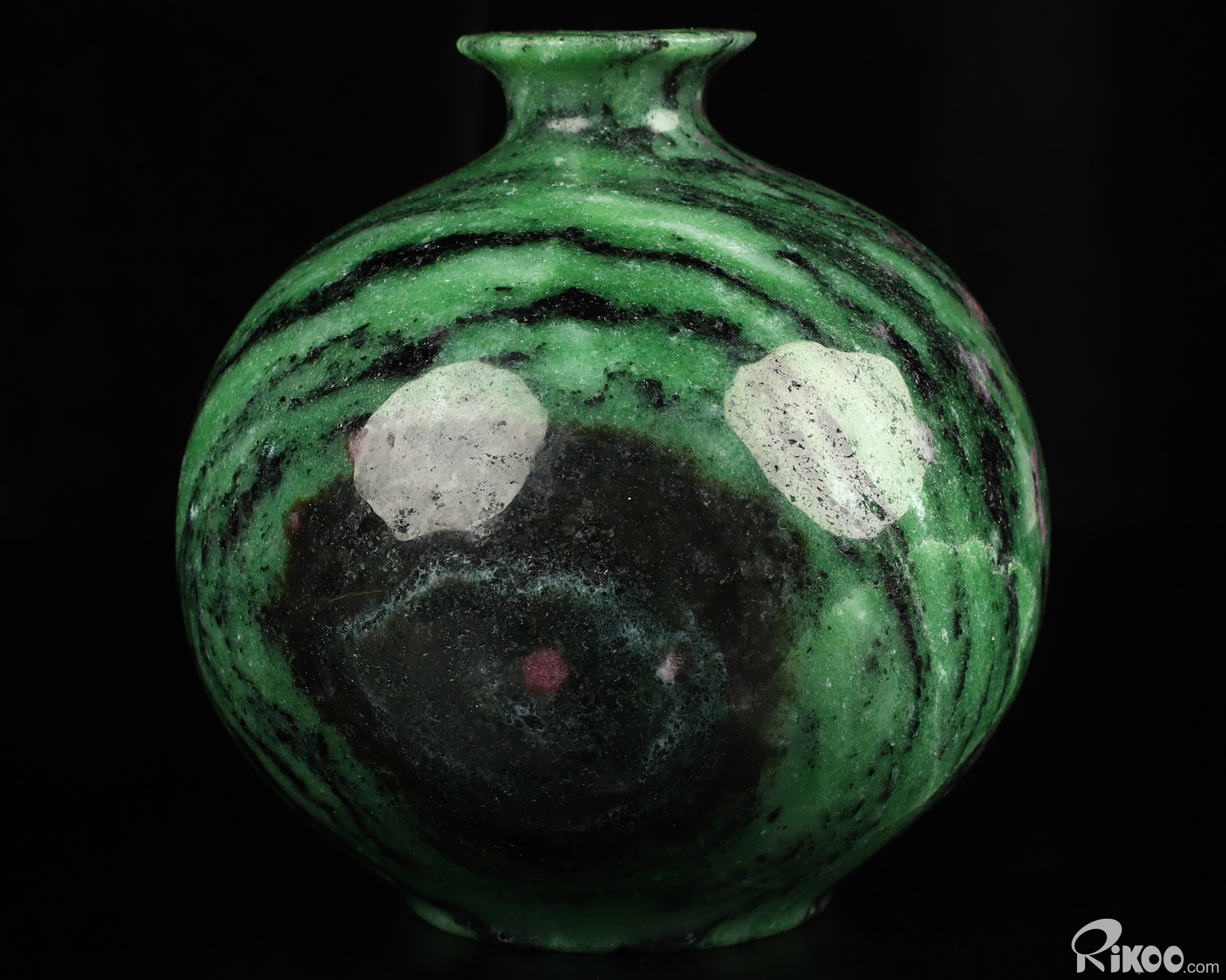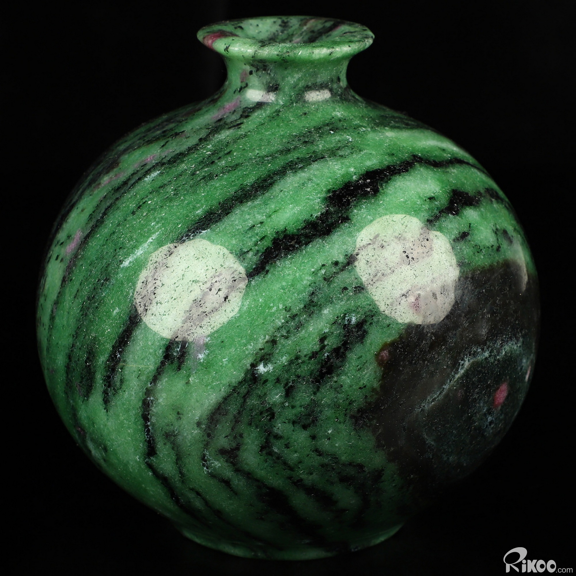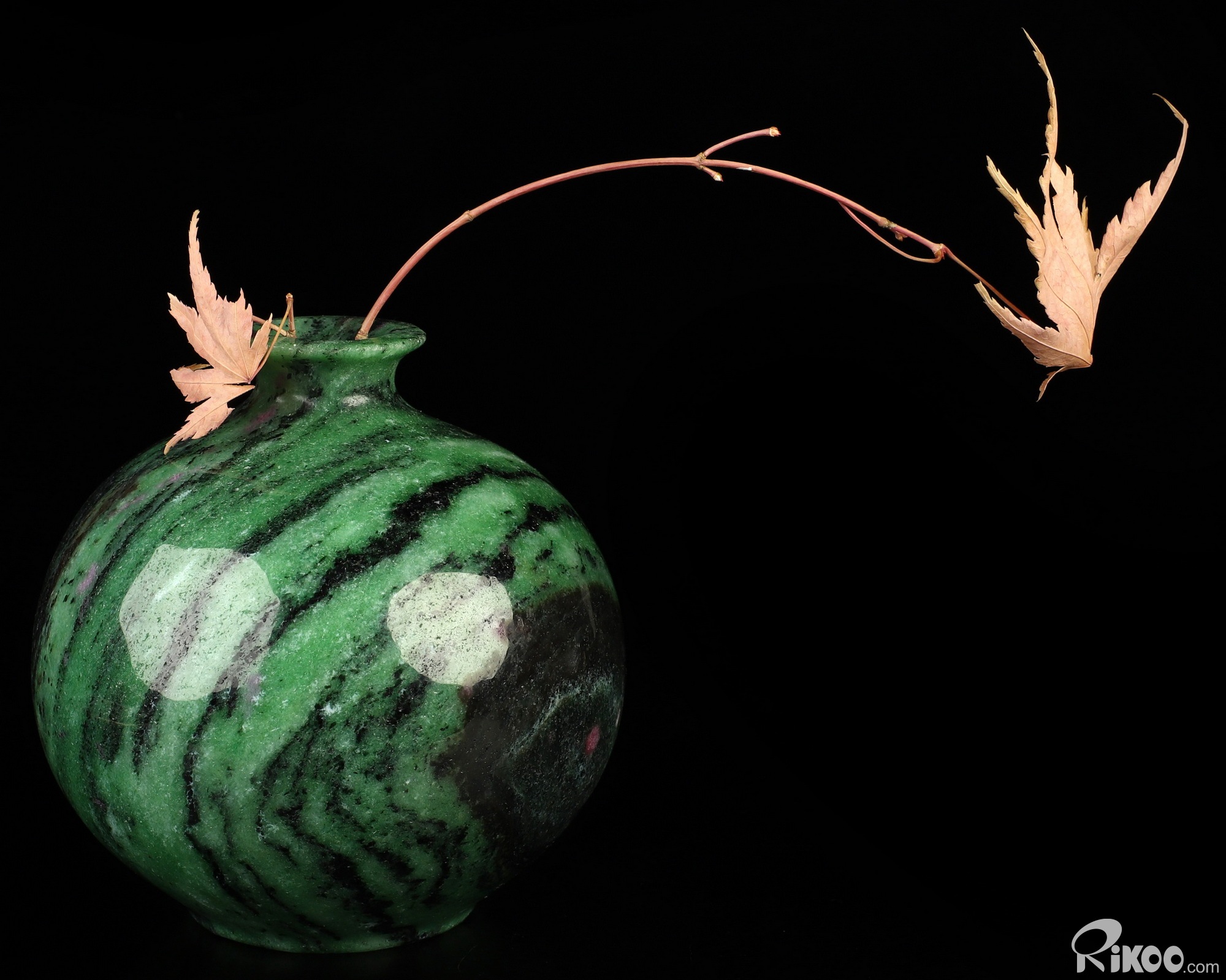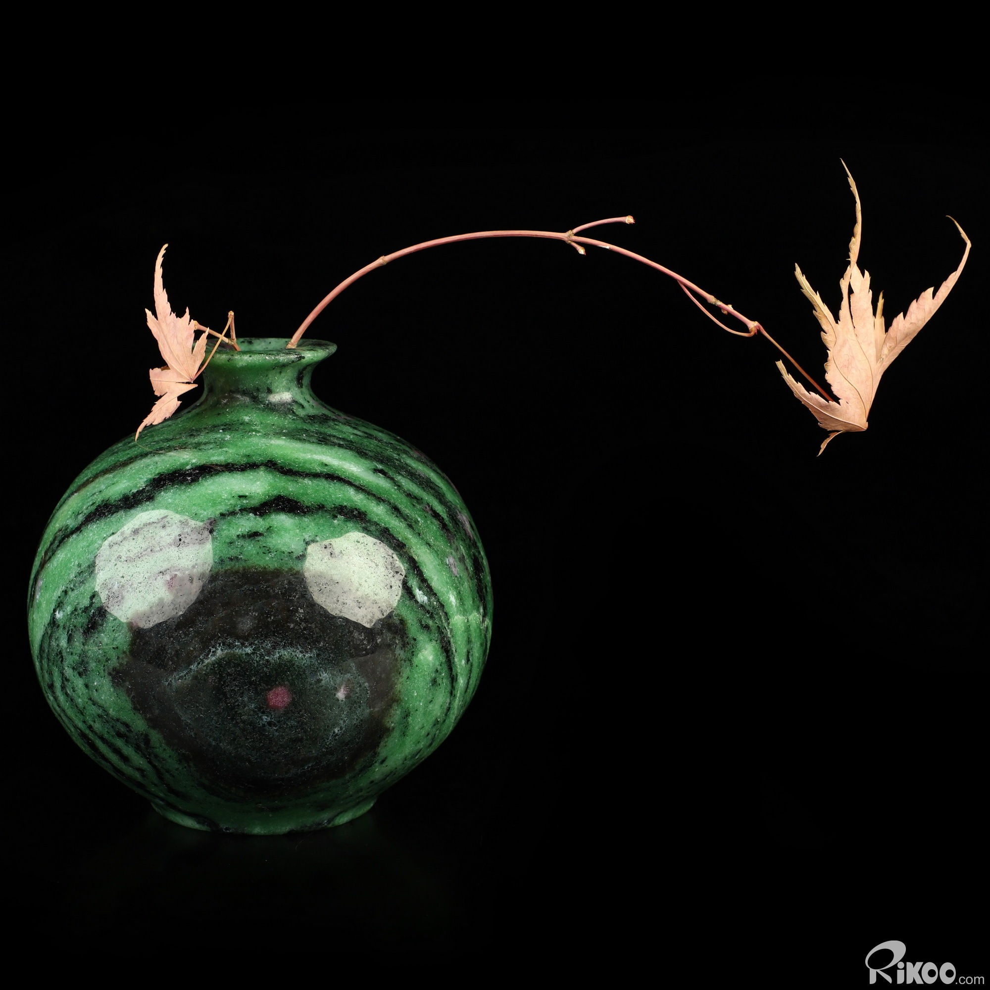 This vase with limited functionality is mainly for display.Green and black, often with red streaks of ruby. For trust in the universe, releasing fears. Strengthens heart, energy/adrenals and reproductive Chakra. General health. This stone can be used to dispel laziness and idleness. It is often used in treating disorders of the middle and upper jaios in Chinese Medicine, considered the heart, spleen, stomach, pancreas and lungs. When Zoisite is shared with ruby in it's matrix, it shares the same metaphysical properties of both stones. When this stone is found in the colors of the upper Chakra, clear, blue, purple, violet, it is considered the rare stone, Tanzanite.