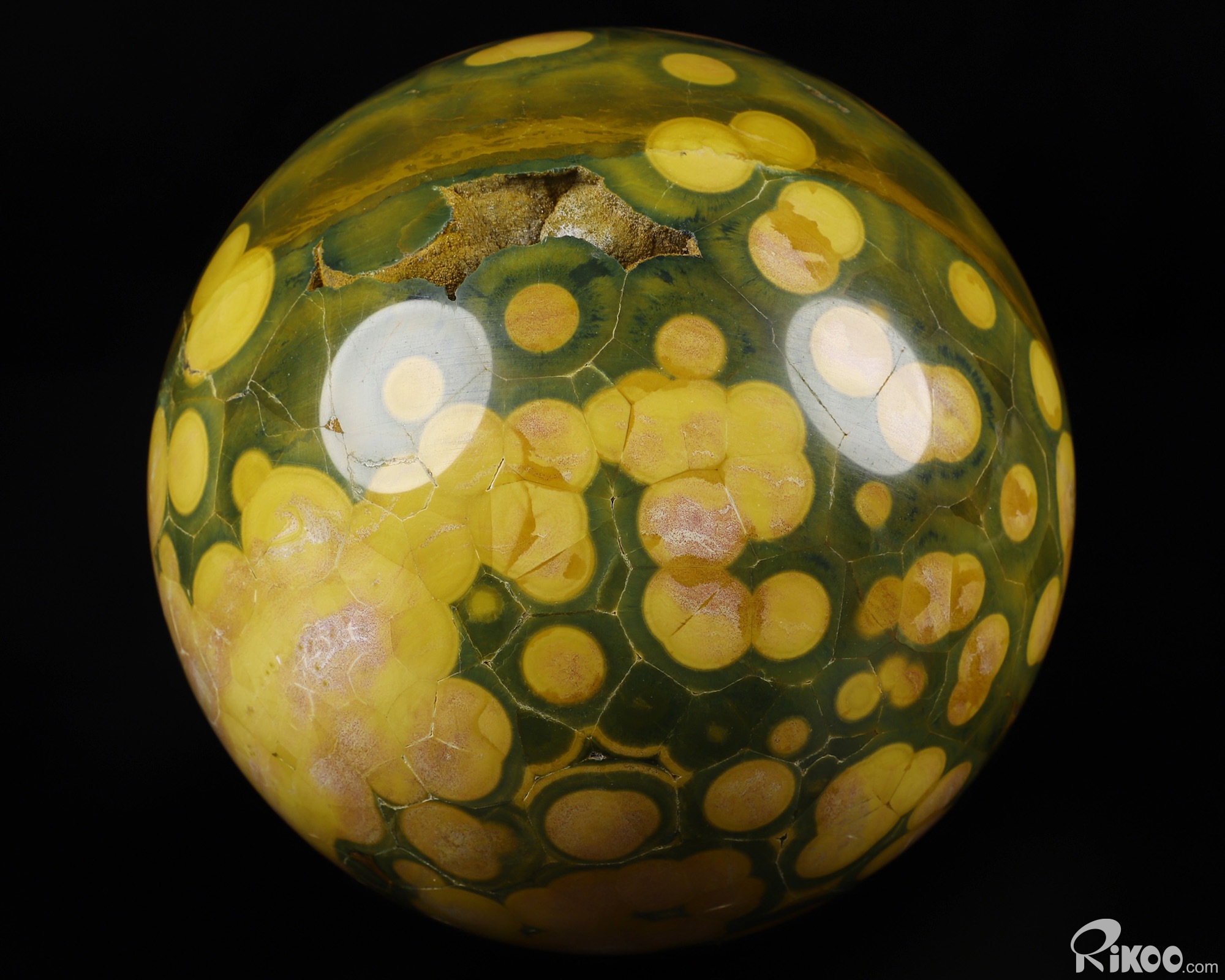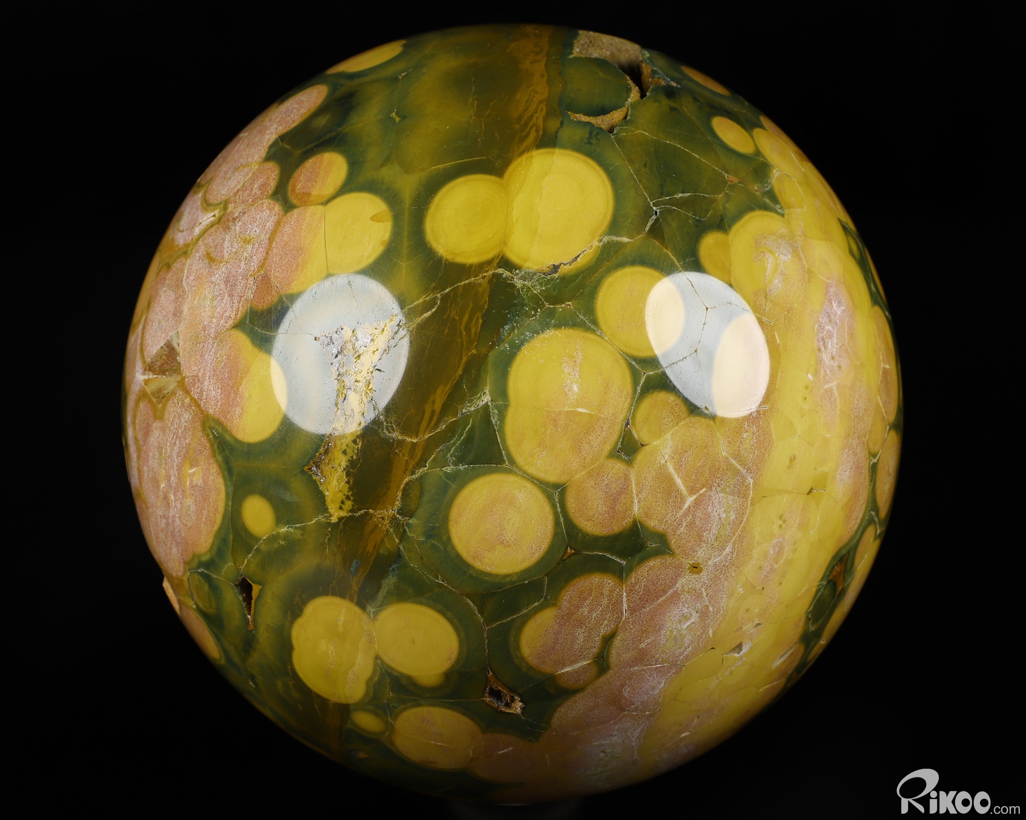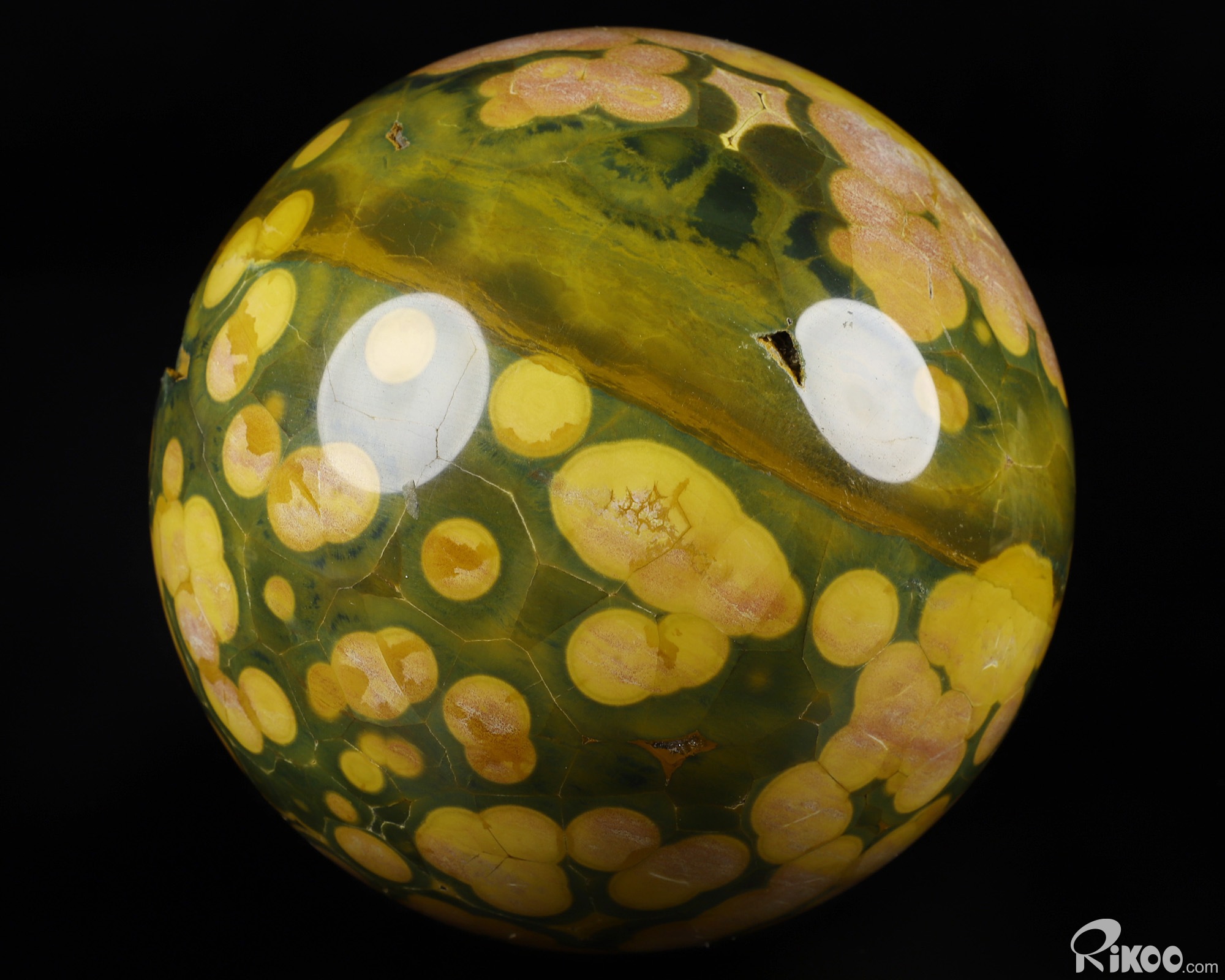 Another exceptional quality of Ocean Jasper is translucency. Many specimens are opaque and still very beautiful while others, when held in front of a strong light source, display what can only be described as another world! When viewed in front of a bright light the translucent, clear, or just foggy background illuminates and displays the contrasting solid perfect circles –the orbs- which then reveal exactly why Ocean Jasper is sometimes called "Fish Eye Jasper". These solid, soft looking spheres appear suspended in the illuminated quartz, and they can make one tempted to reach in and try to touch them!