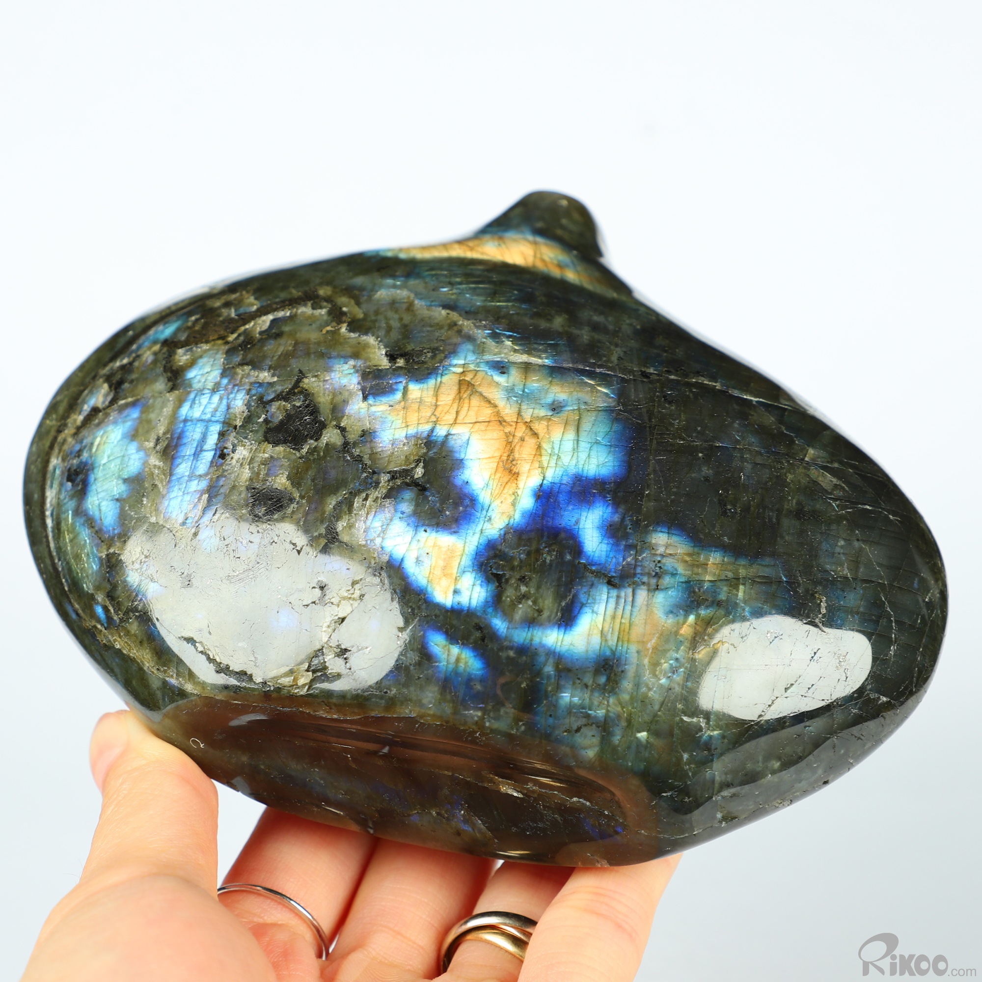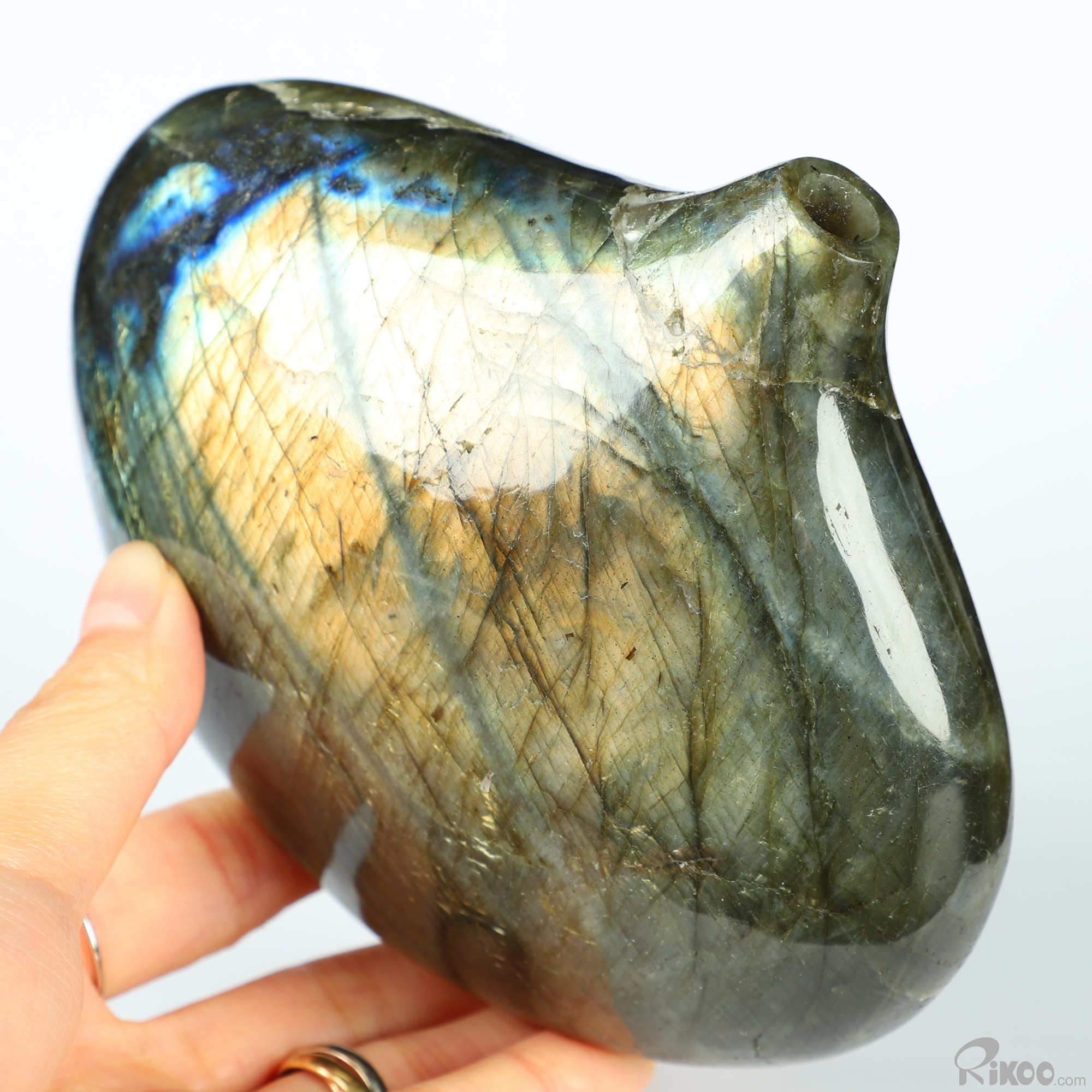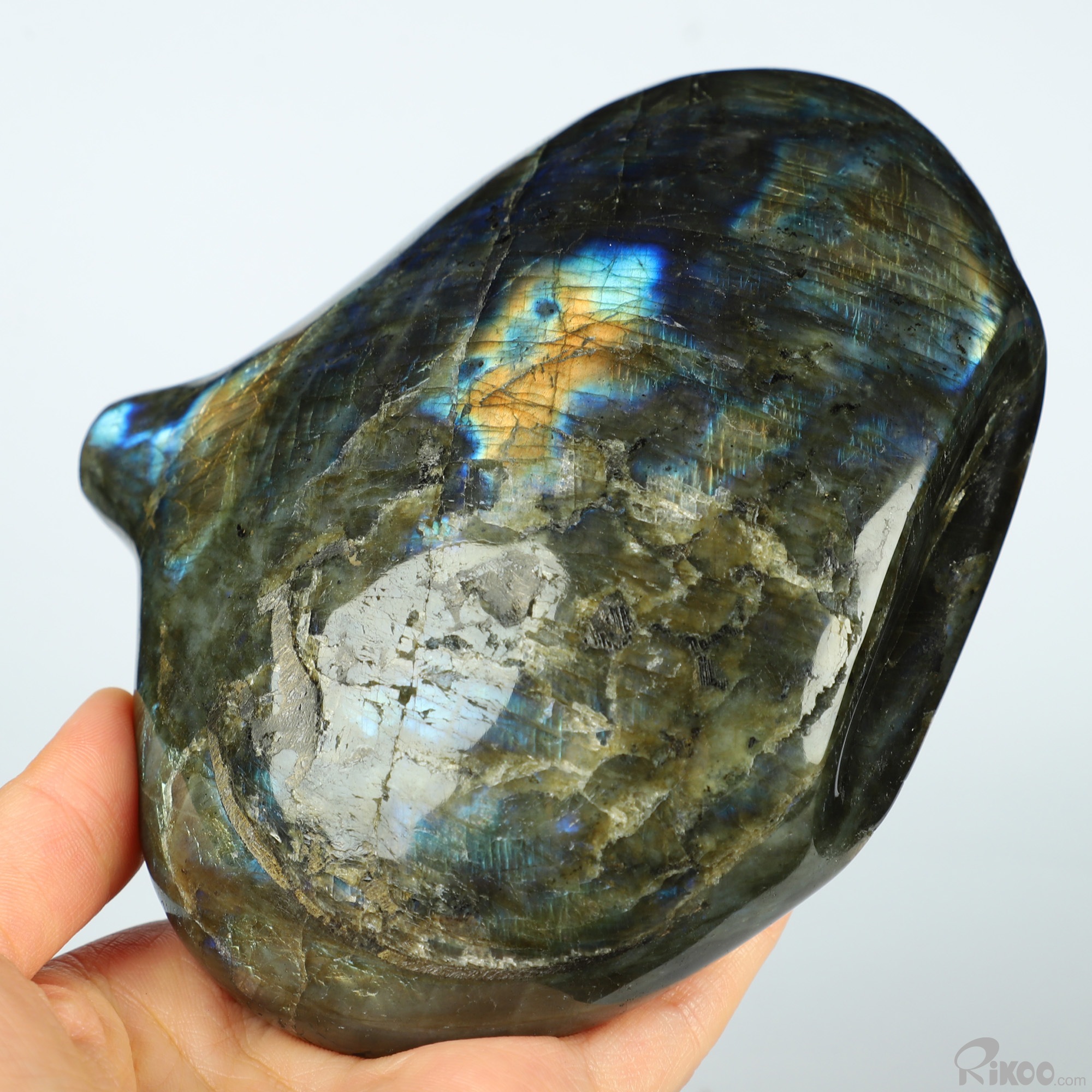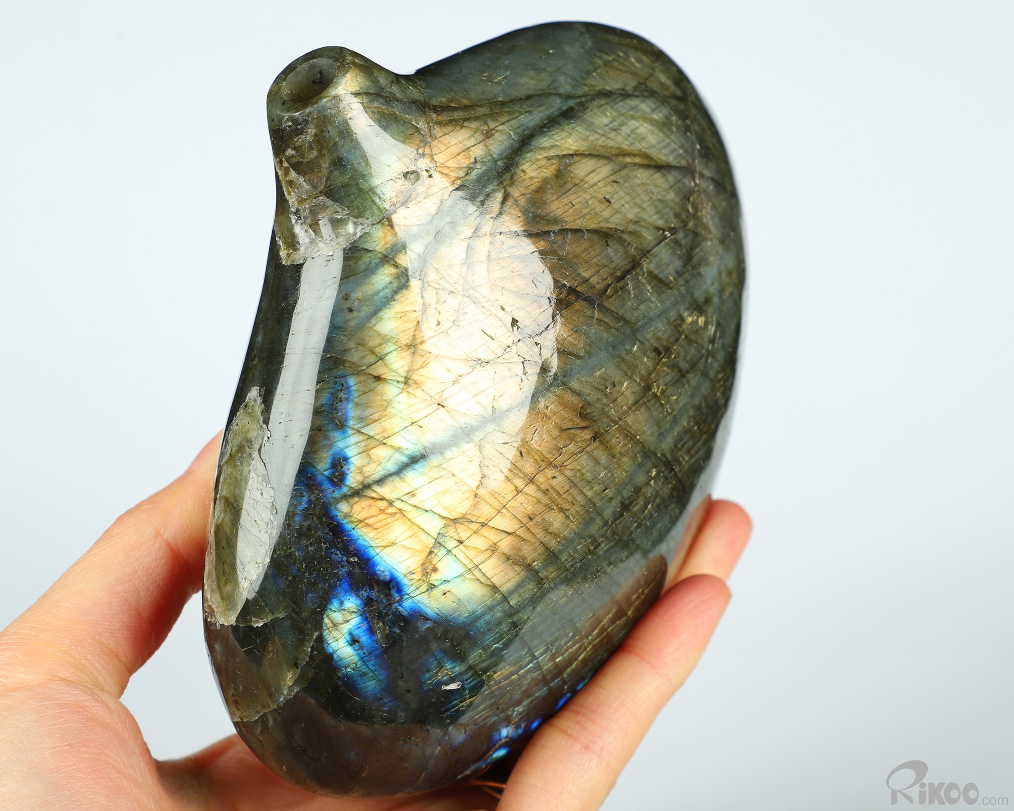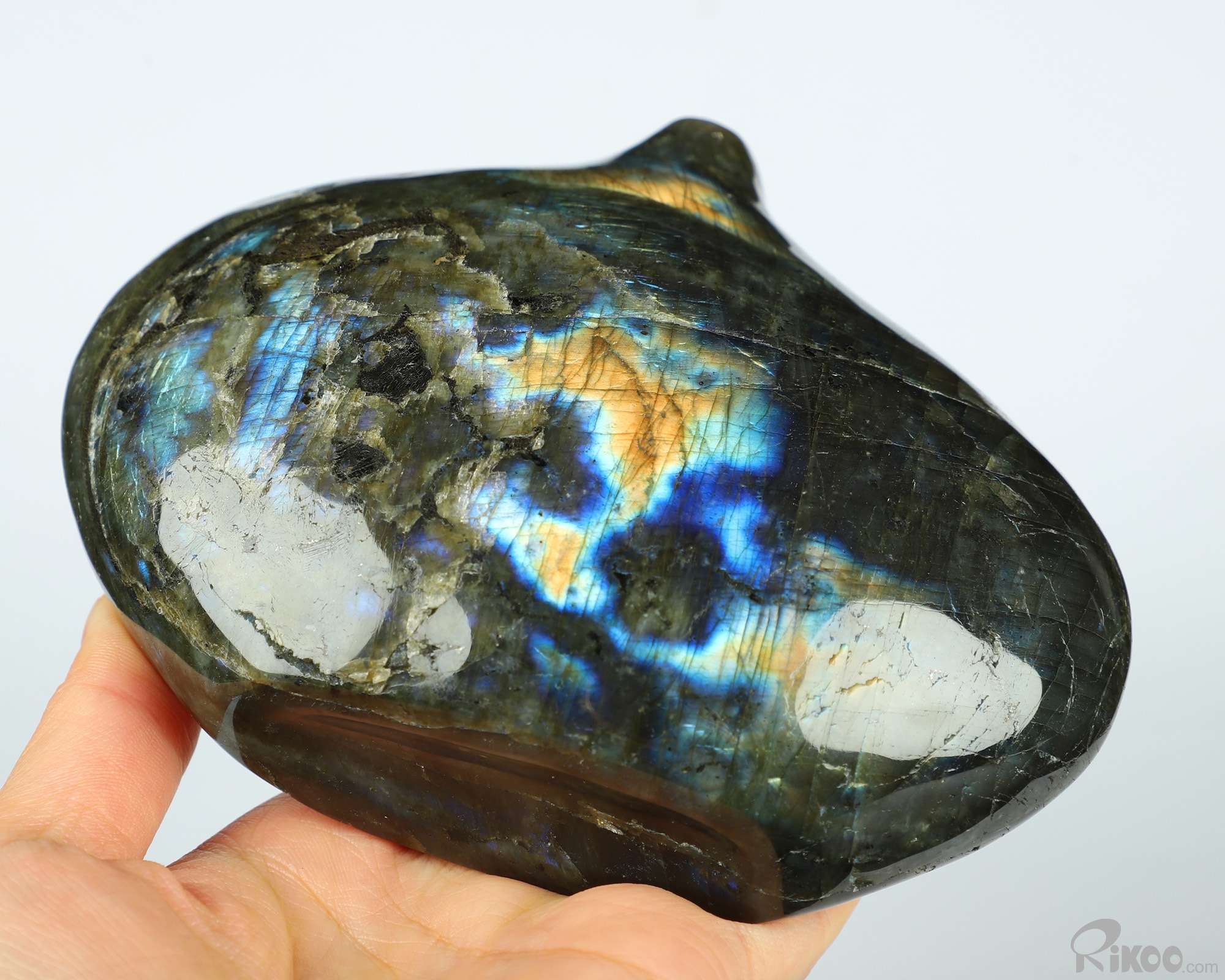 You are looking at a Labradorite sculpture. The sculpture is 5.4 inches long.