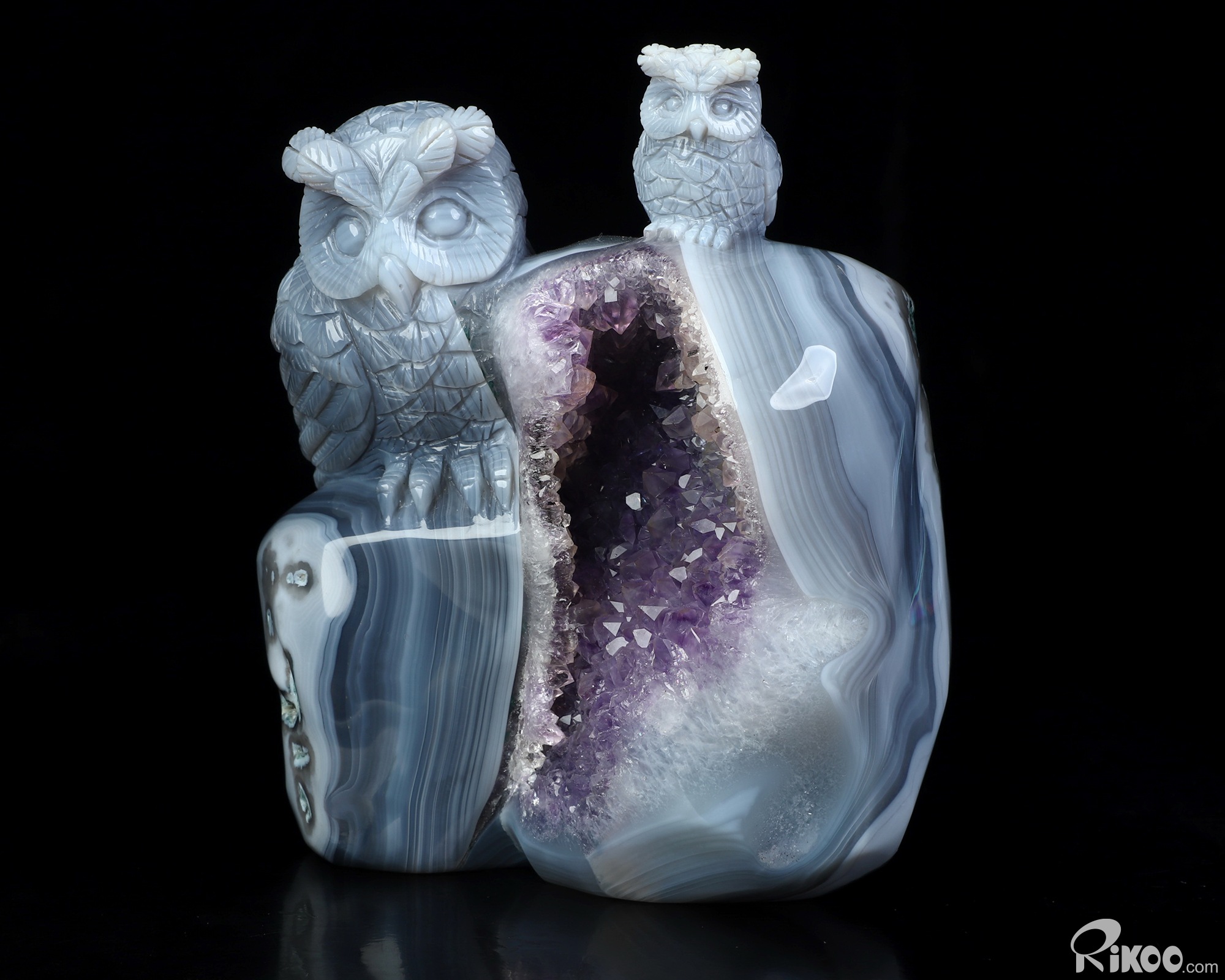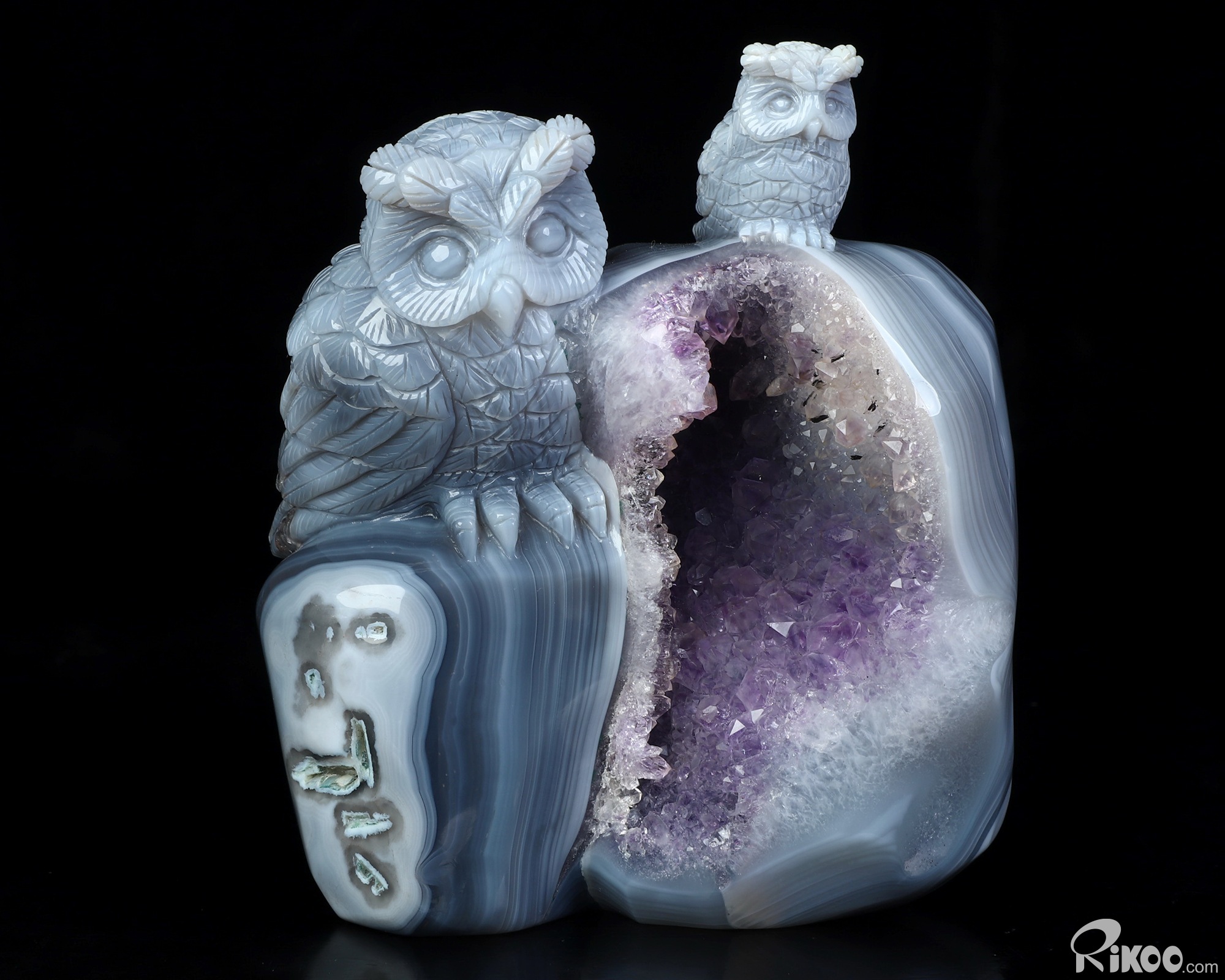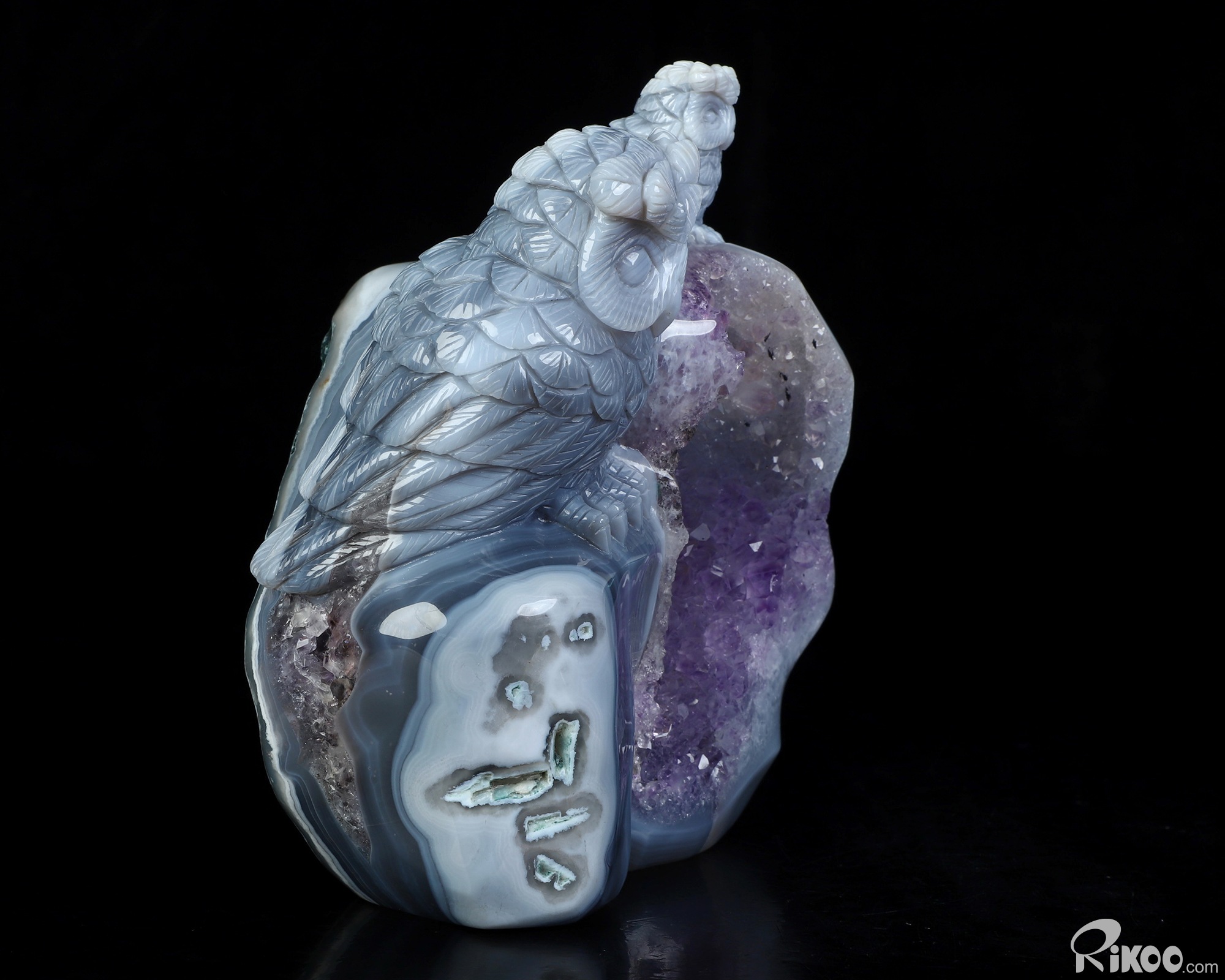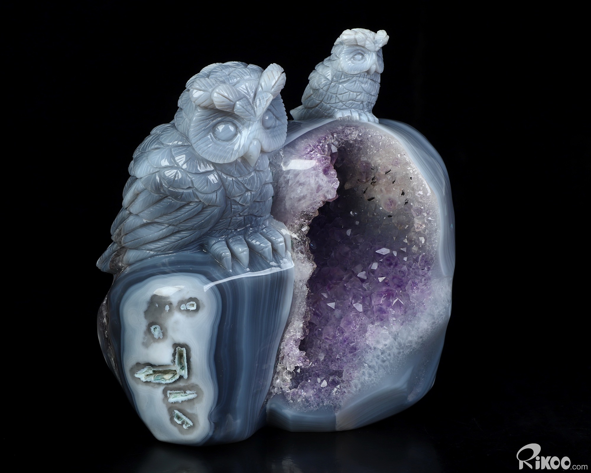 5.5" Agate Amethyst Geode Hand Carved Crystal Owl Sculpture, Crystal Healing