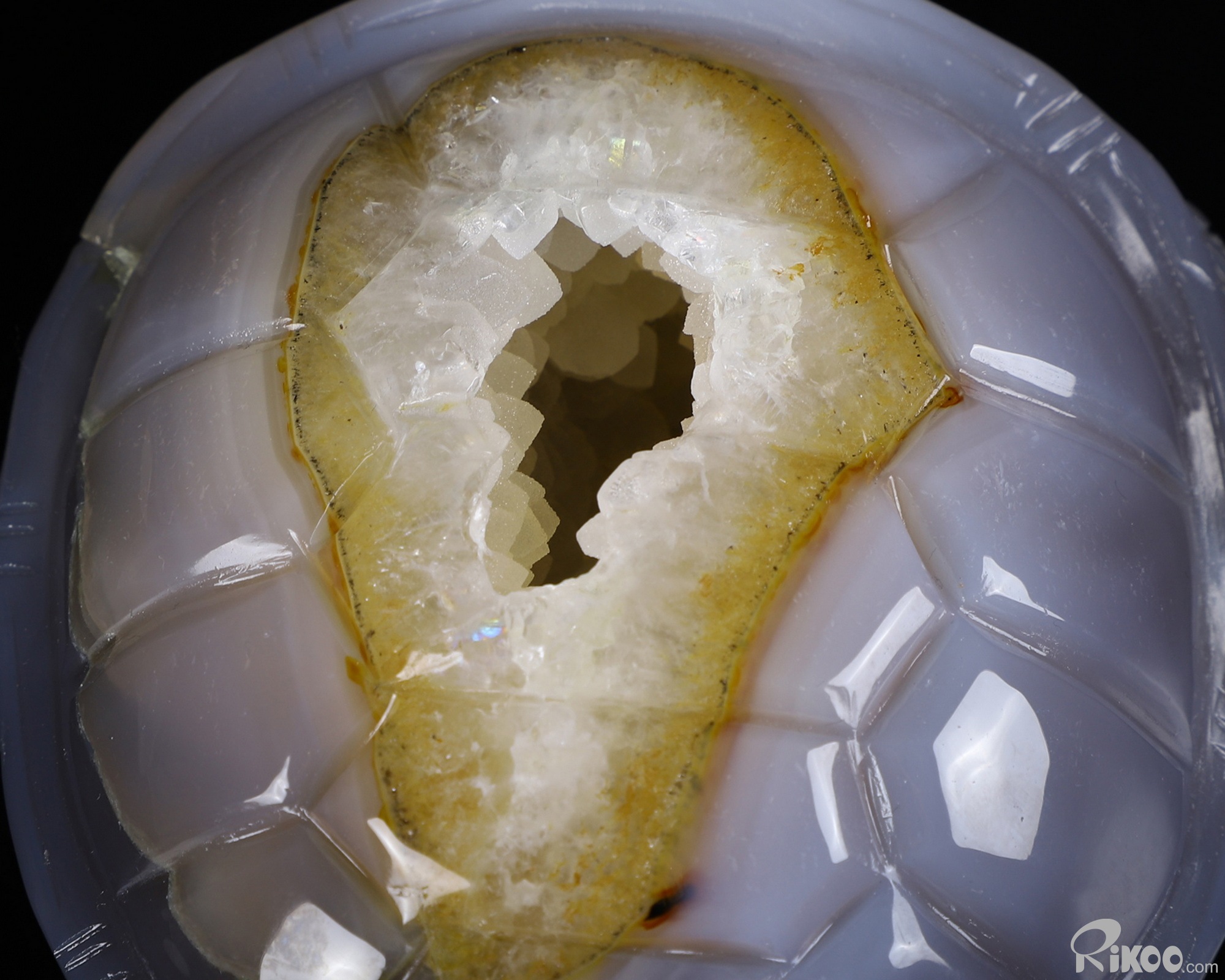 You are looking at a Agate Geode skull. The skull is 5.6 inches long from front to back.