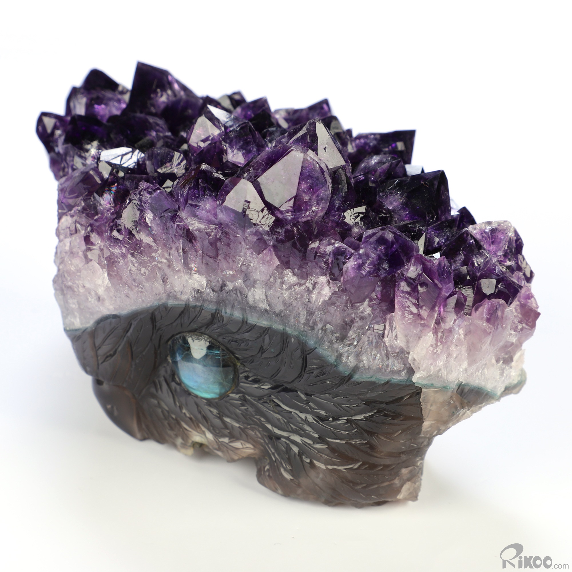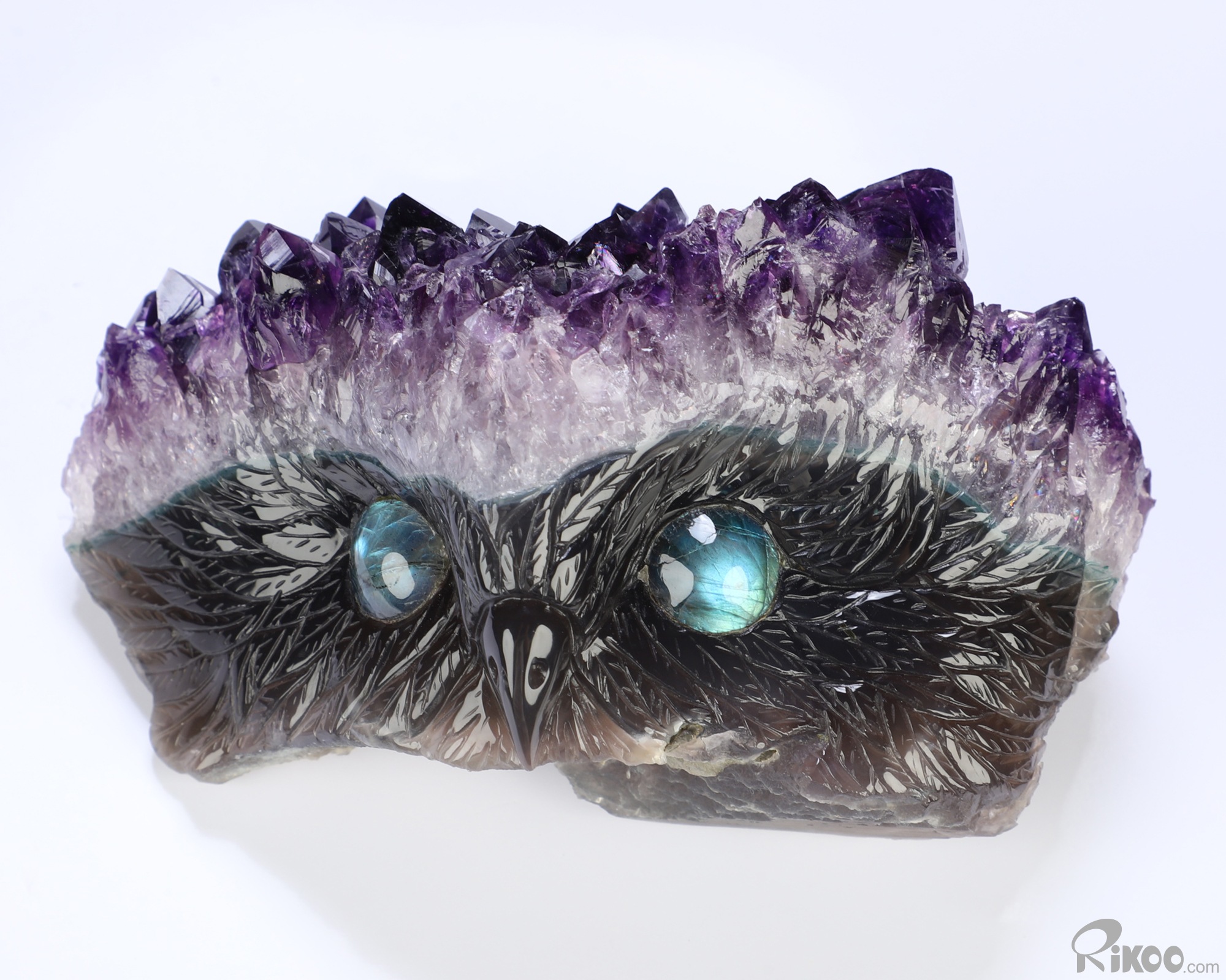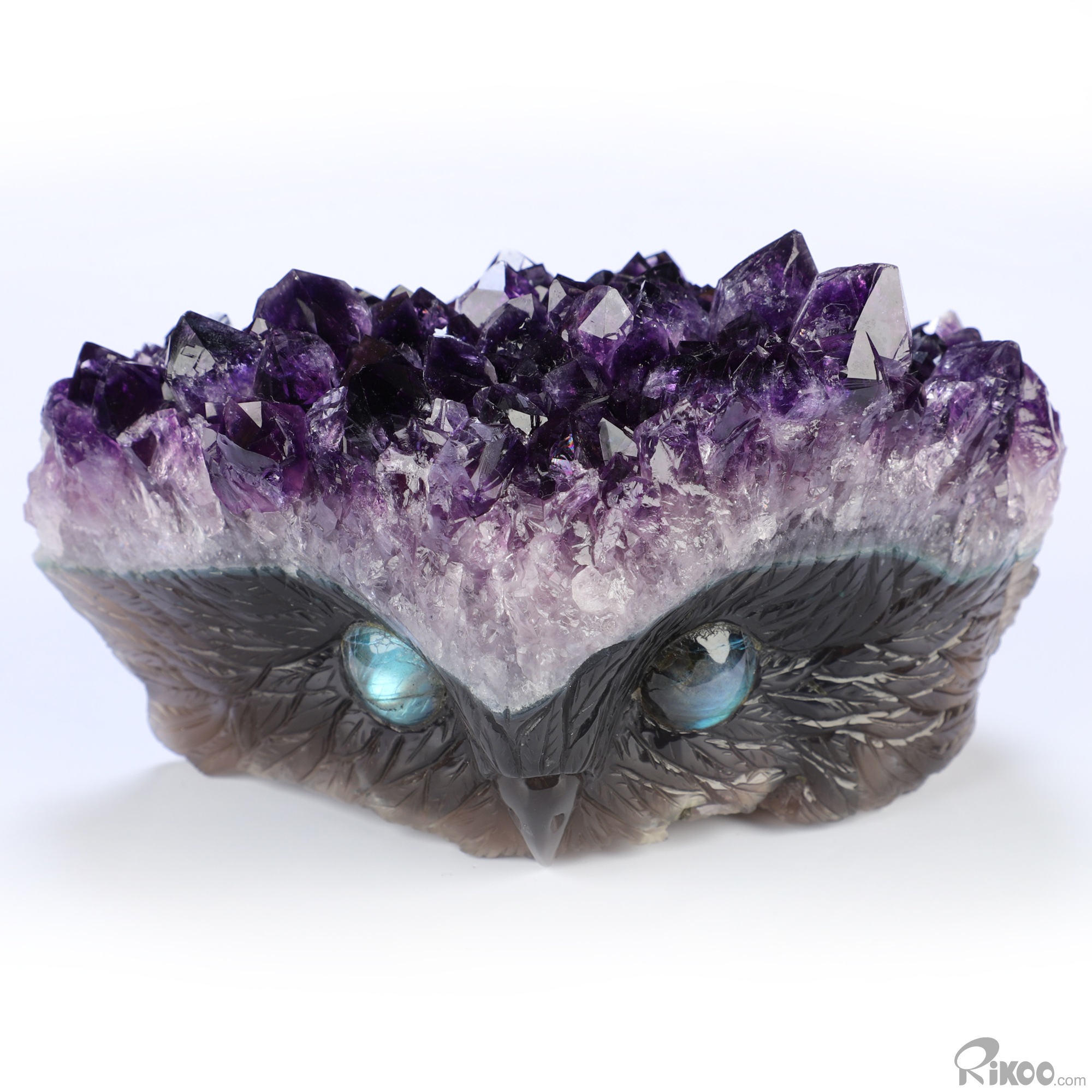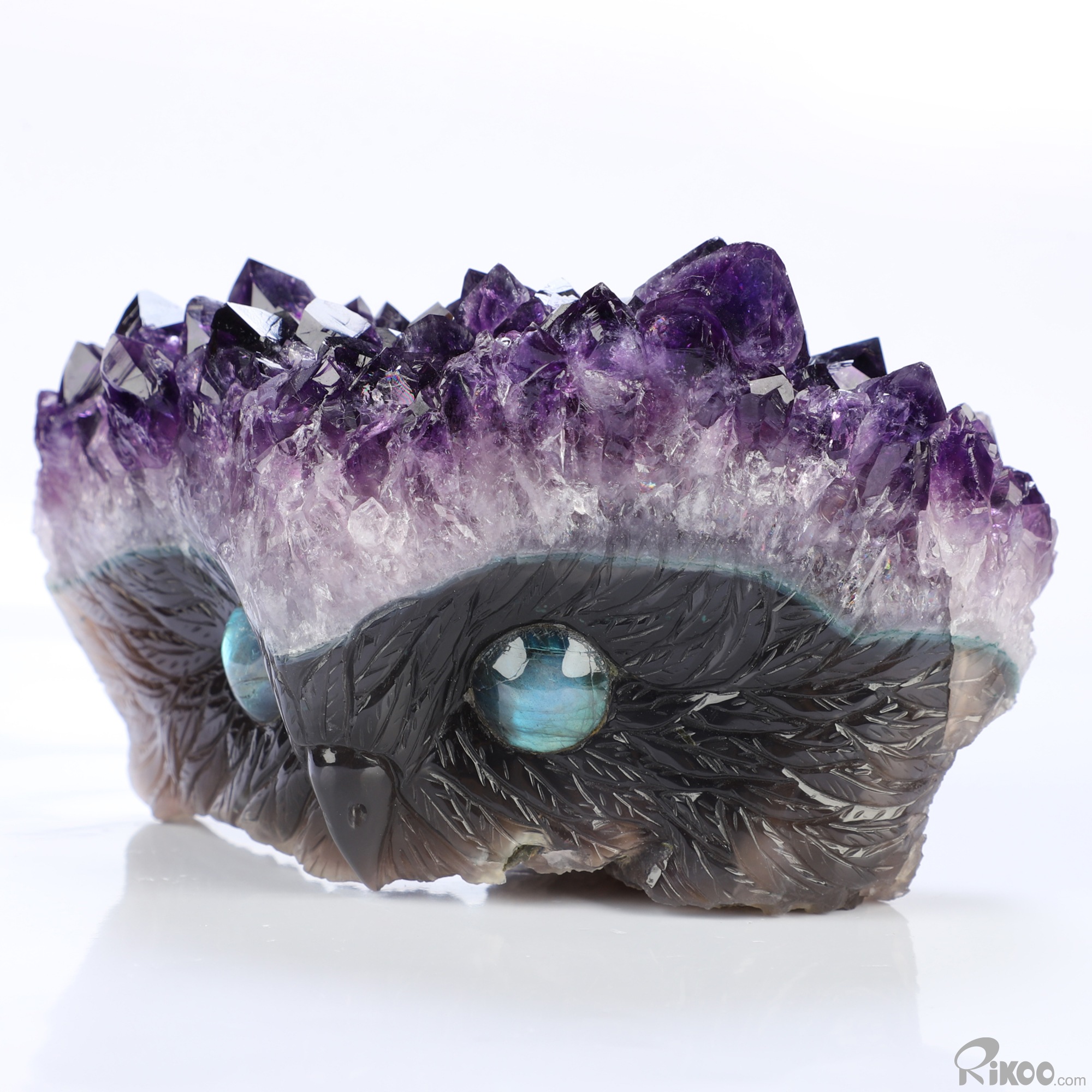 5.7" Agate Amethyst Druse Hand Carved Crystal Owl Sculpture, Crystal Healing