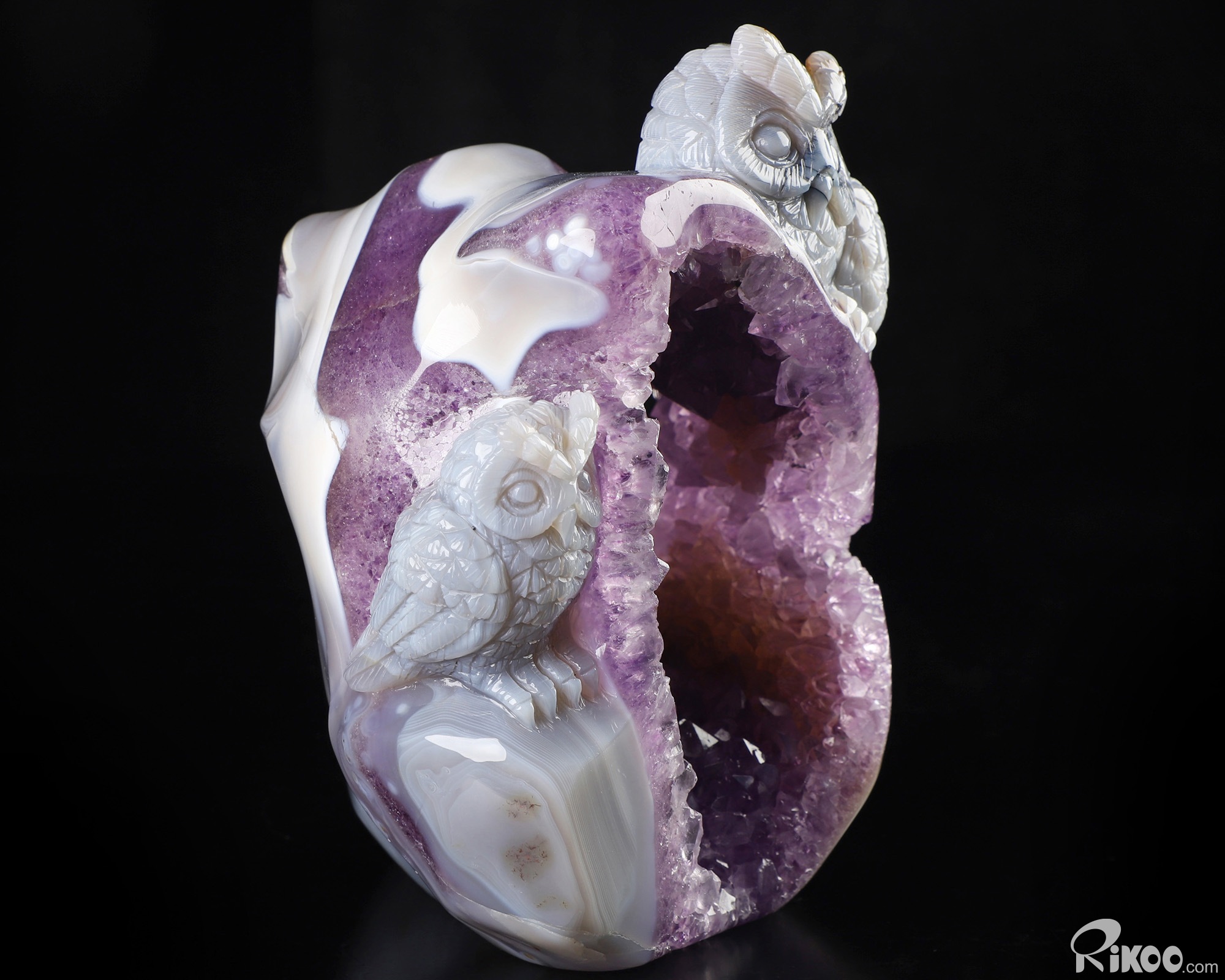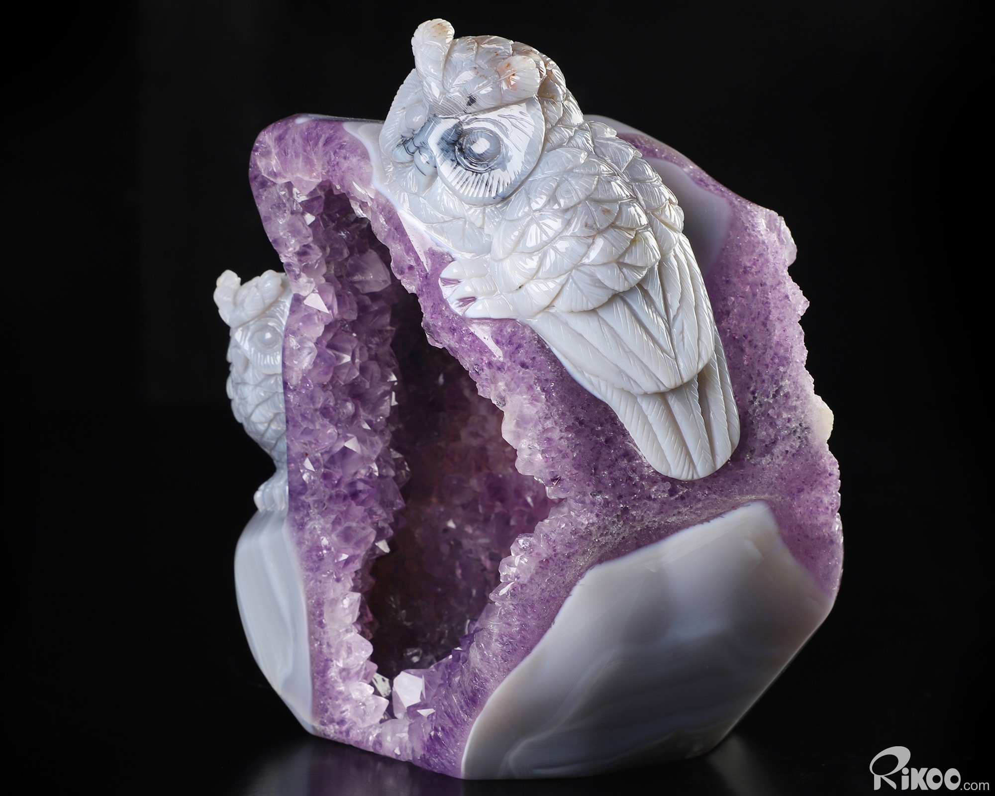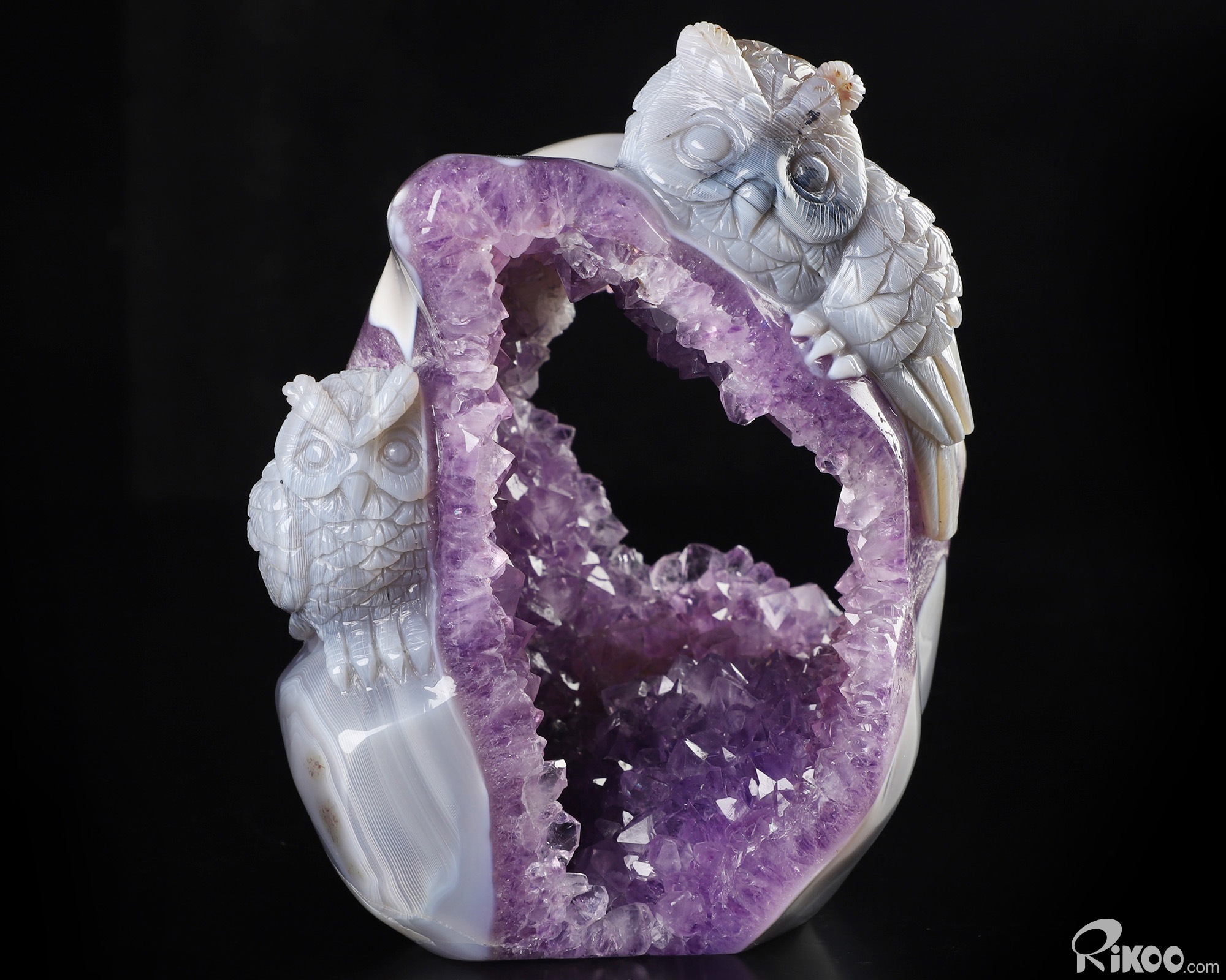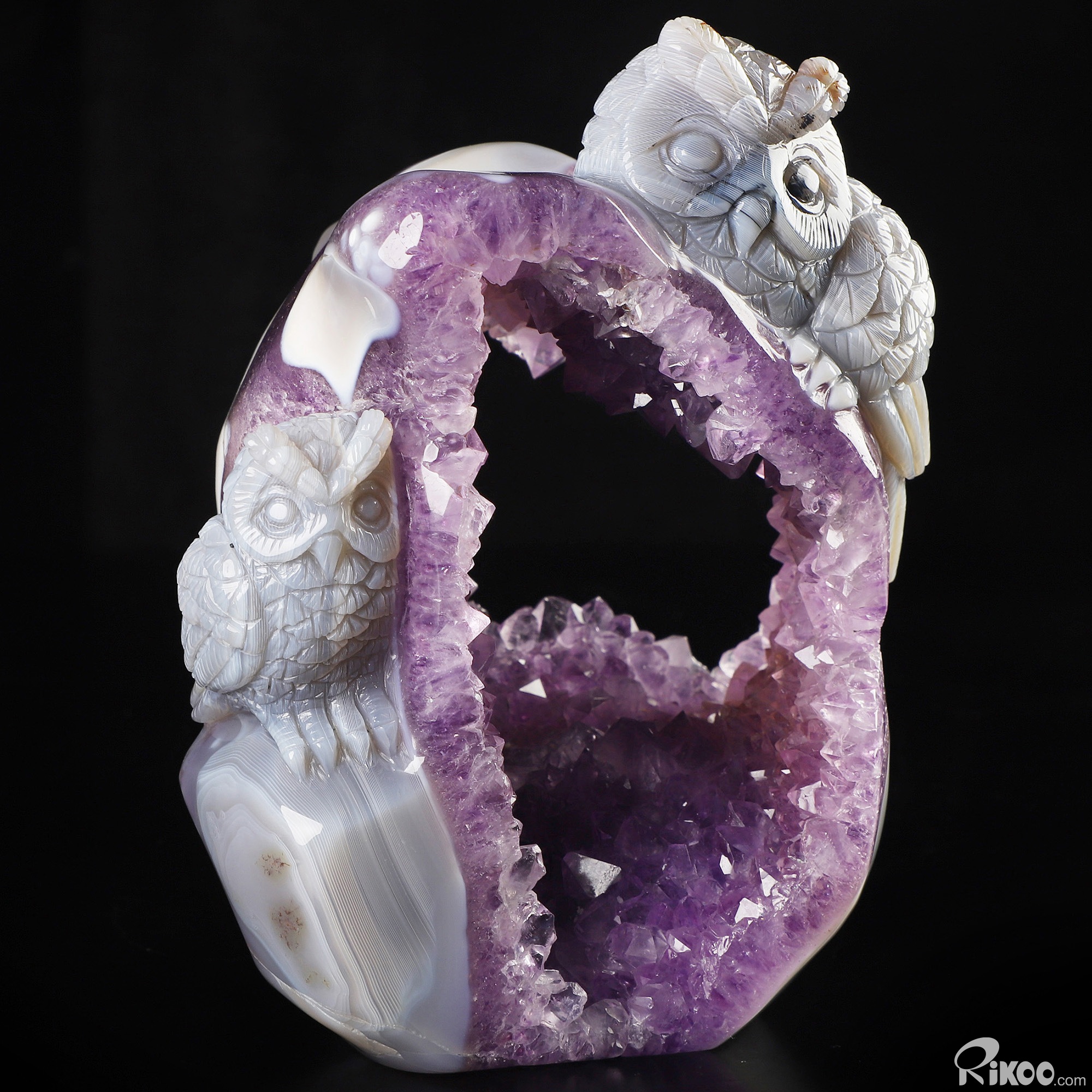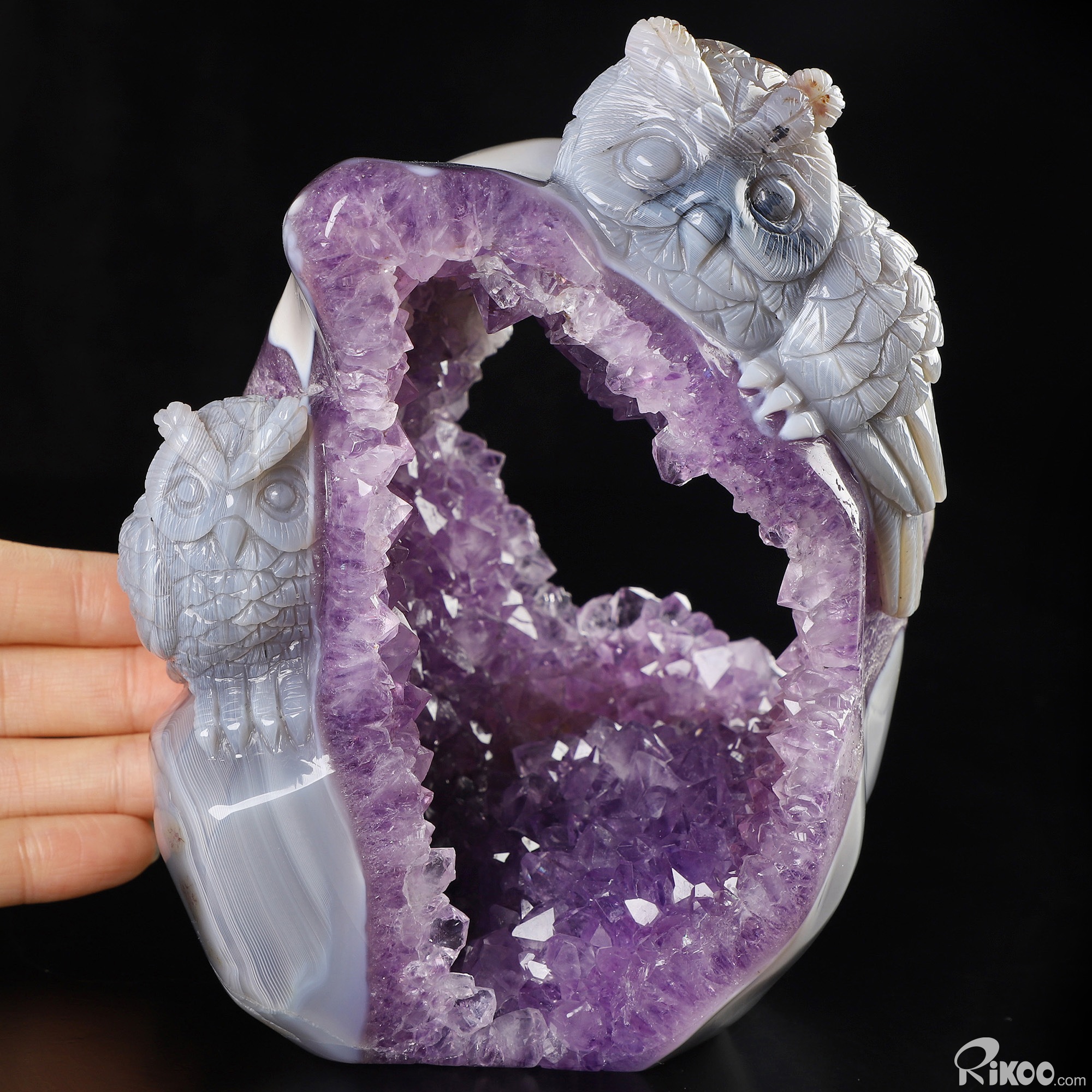 5.7" Agate Amethyst Geode Hand Carved Crystal Owl Sculpture, Crystal Healing