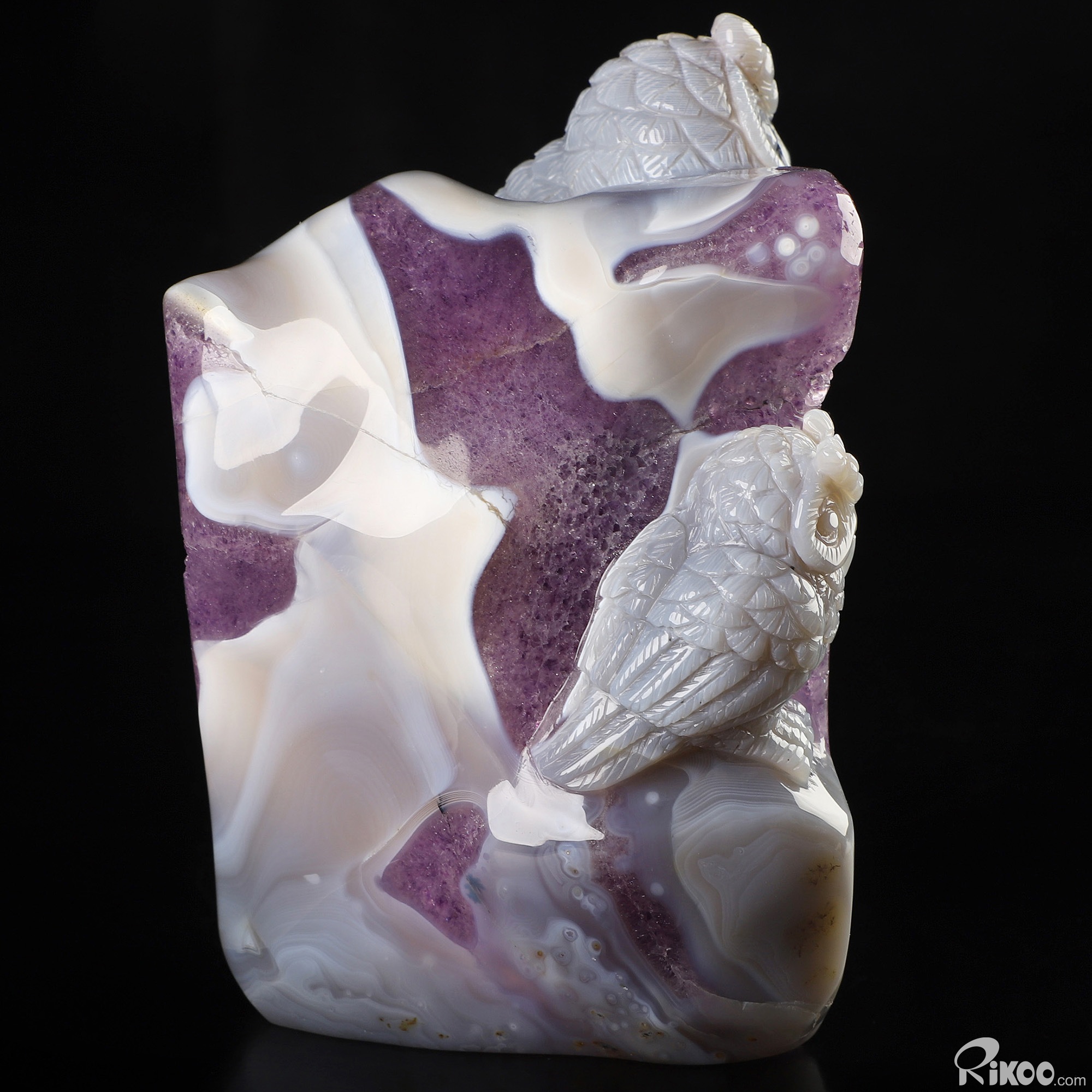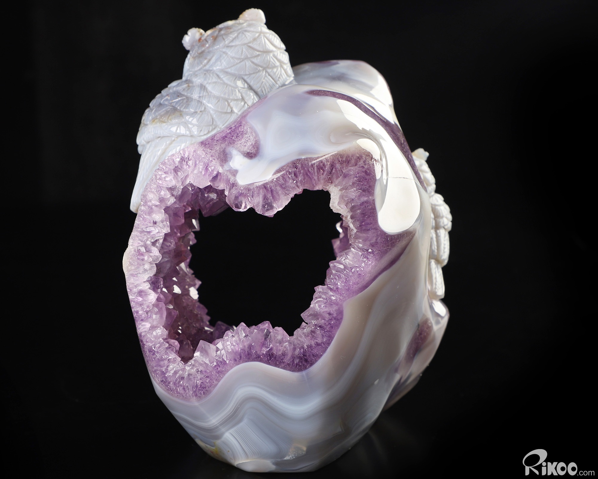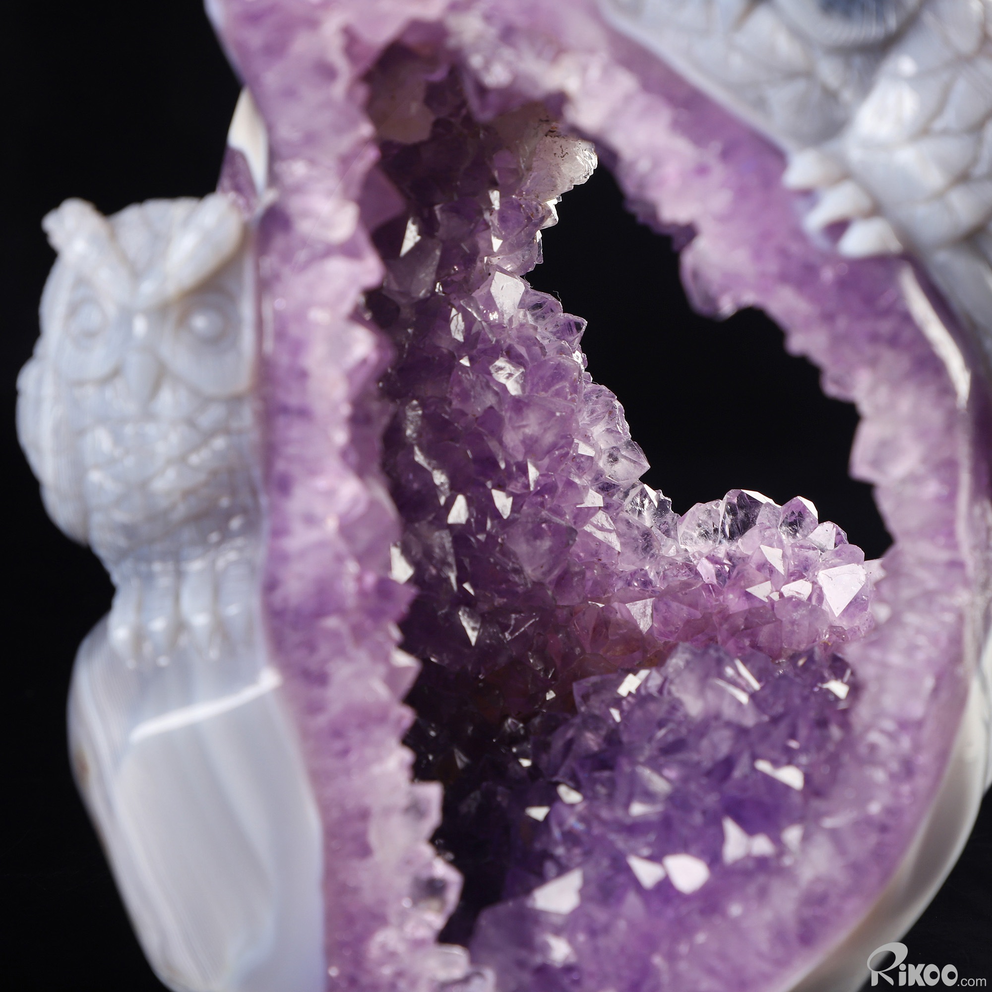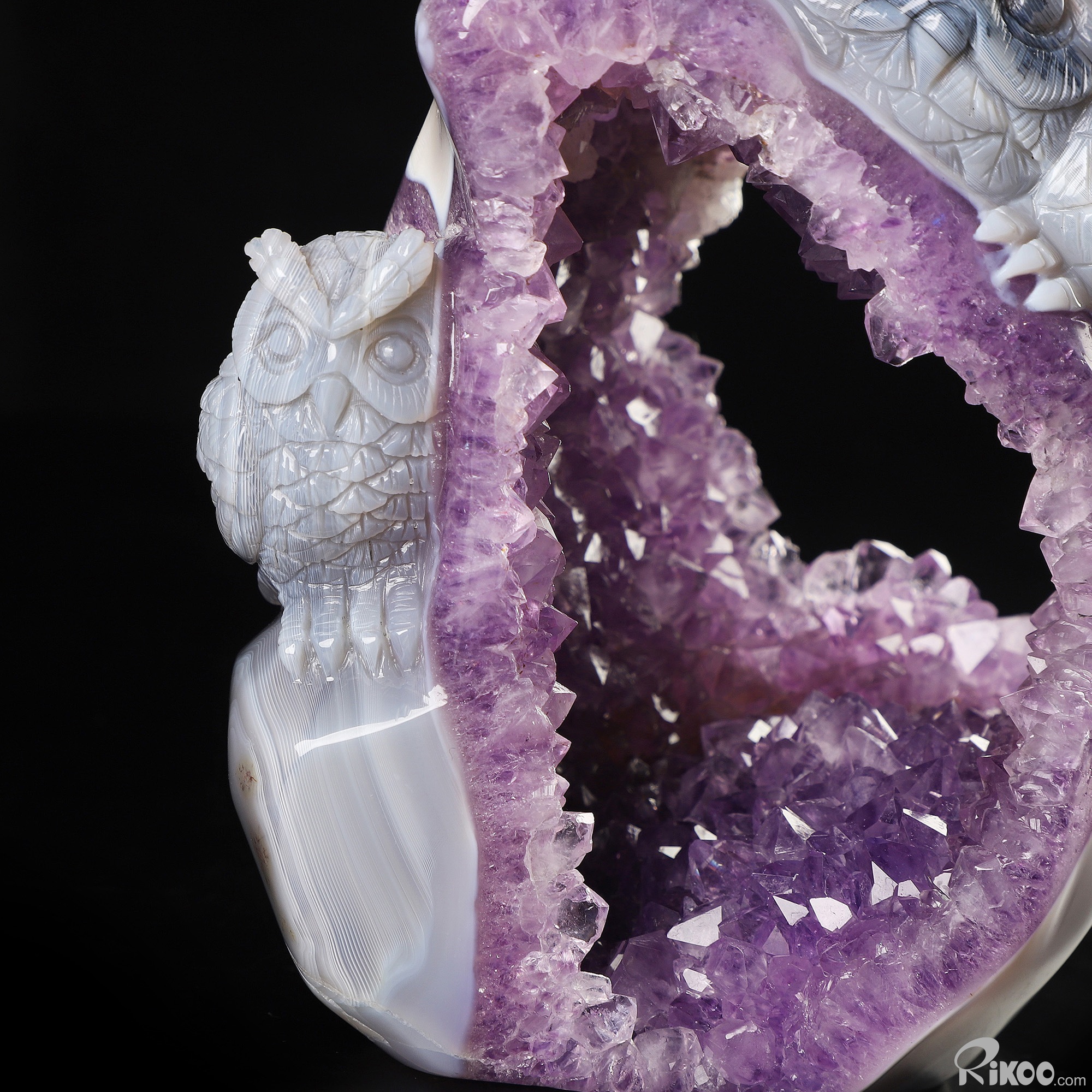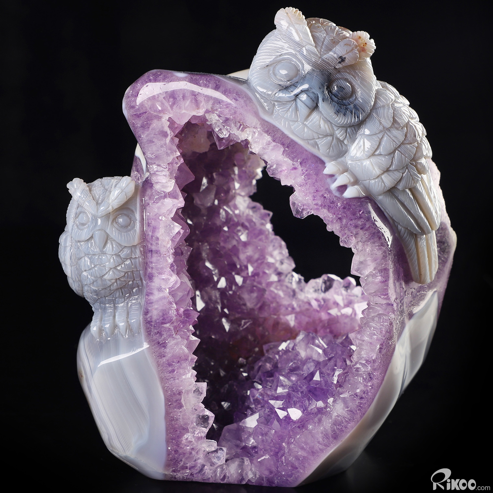 5.7" Agate Amethyst Geode Hand Carved Crystal Owl Sculpture, Crystal Healing