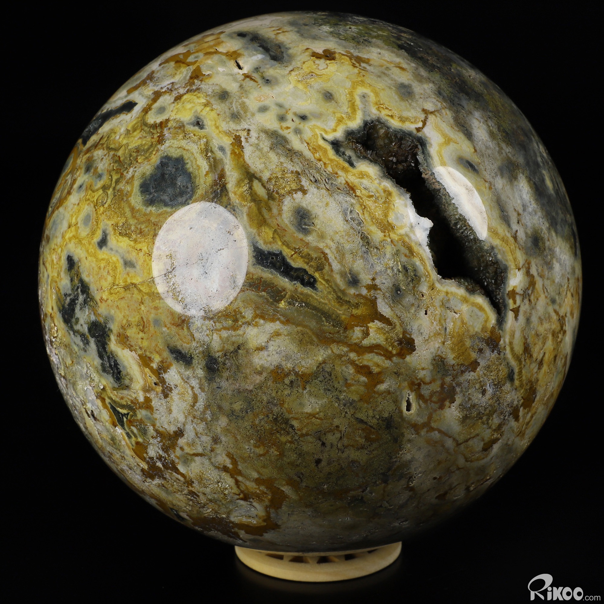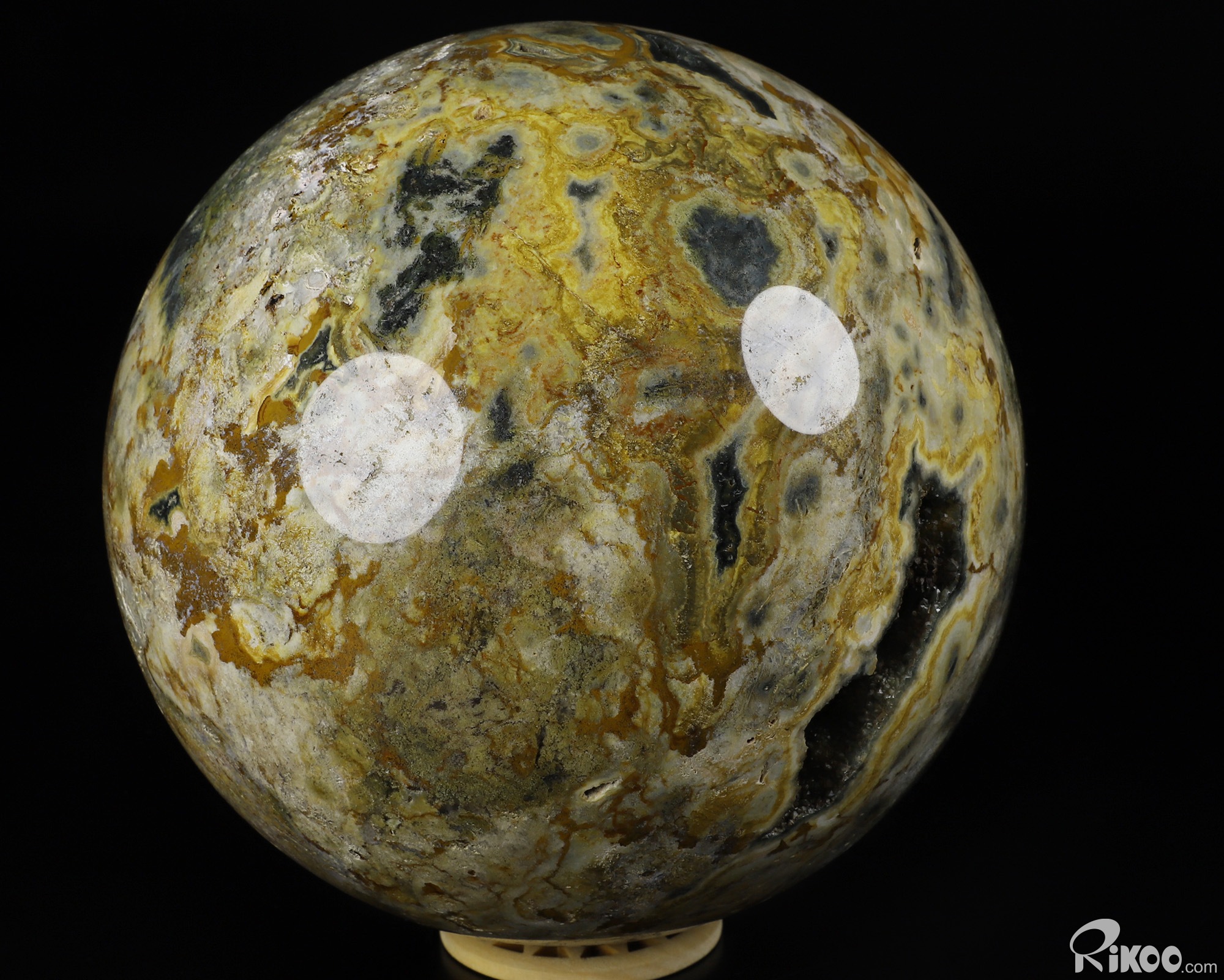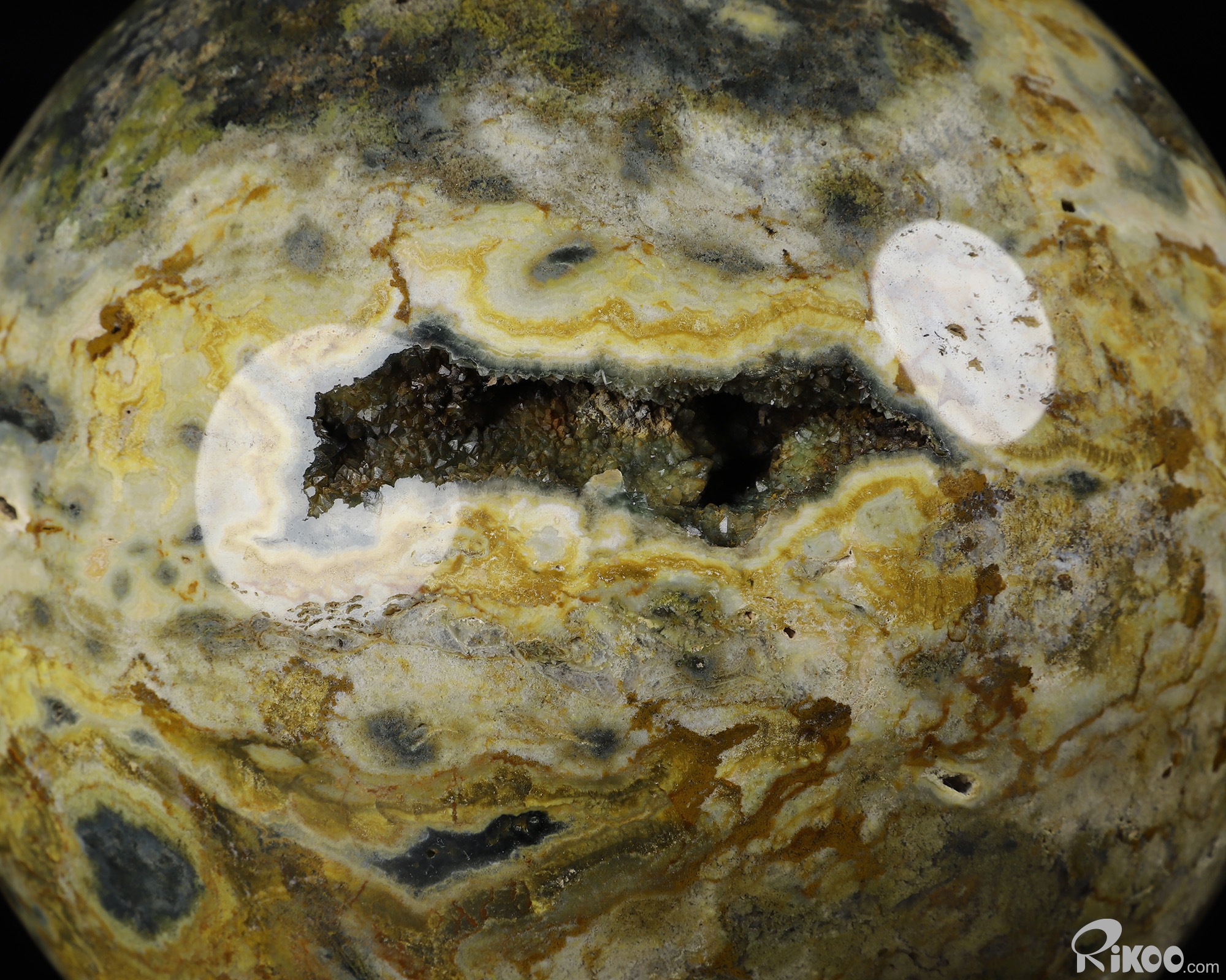 Another exceptional quality of Ocean Jasper is translucency. Many specimens are opaque and still very beautiful while others, when held in front of a strong light source, display what can only be described as another world! When viewed in front of a bright light the translucent, clear, or just foggy background illuminates and displays the contrasting solid perfect circles –the orbs- which then reveal exactly why Ocean Jasper is sometimes called "Fish Eye Jasper". These solid, soft looking spheres appear suspended in the illuminated quartz, and they can make one tempted to reach in and try to touch them!
