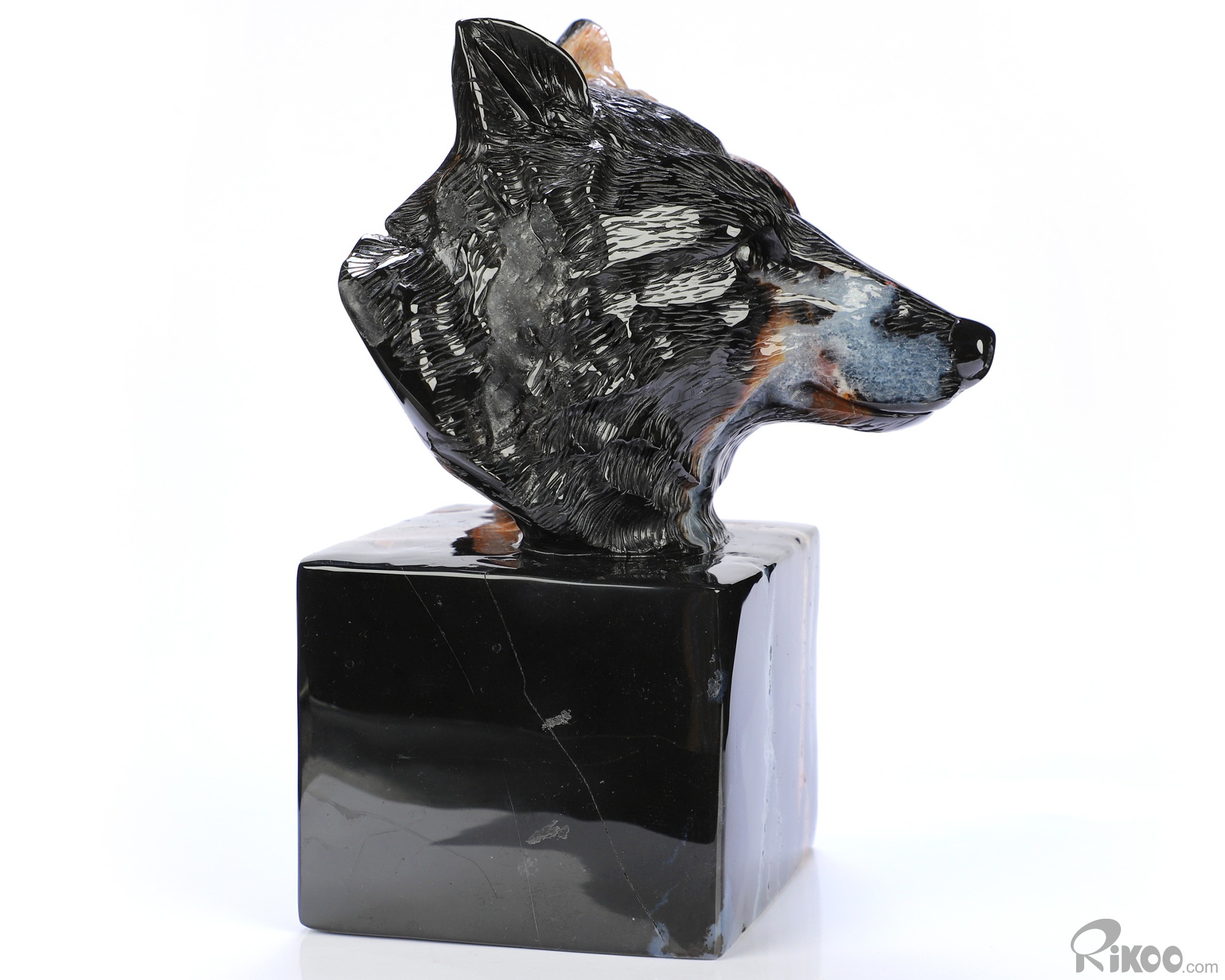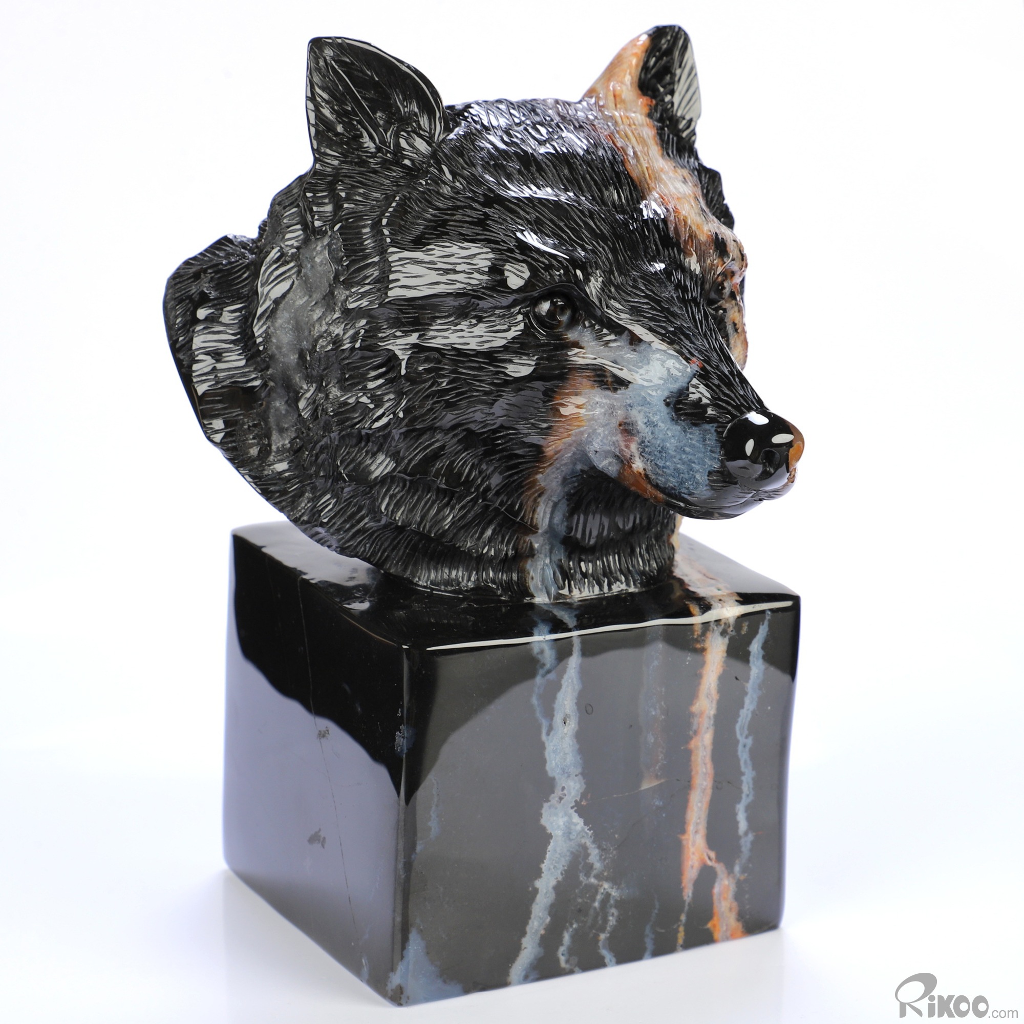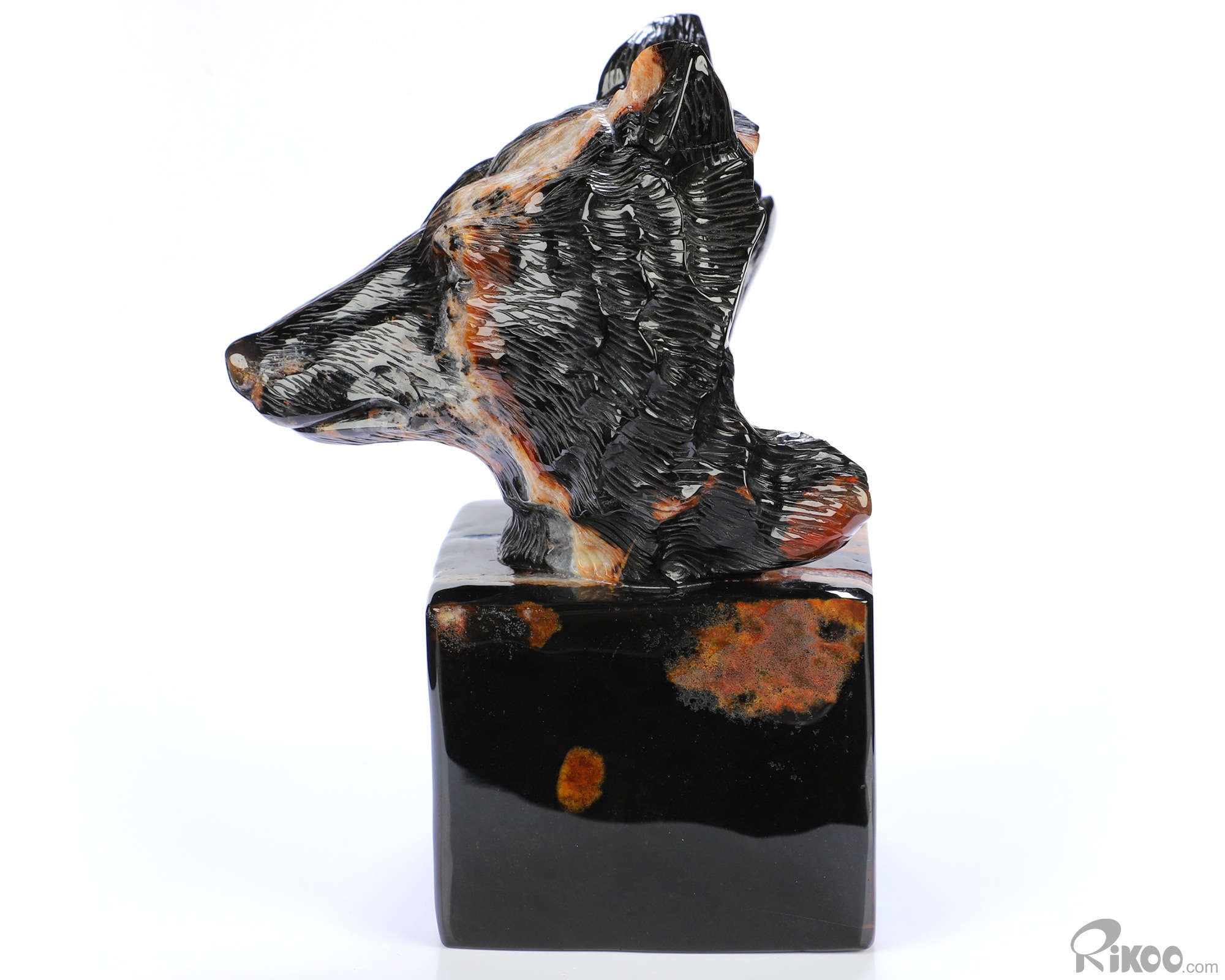 5.8" Black Zebra Agate Hand Carved Crystal Wolf Sculpture, Crystal Healing