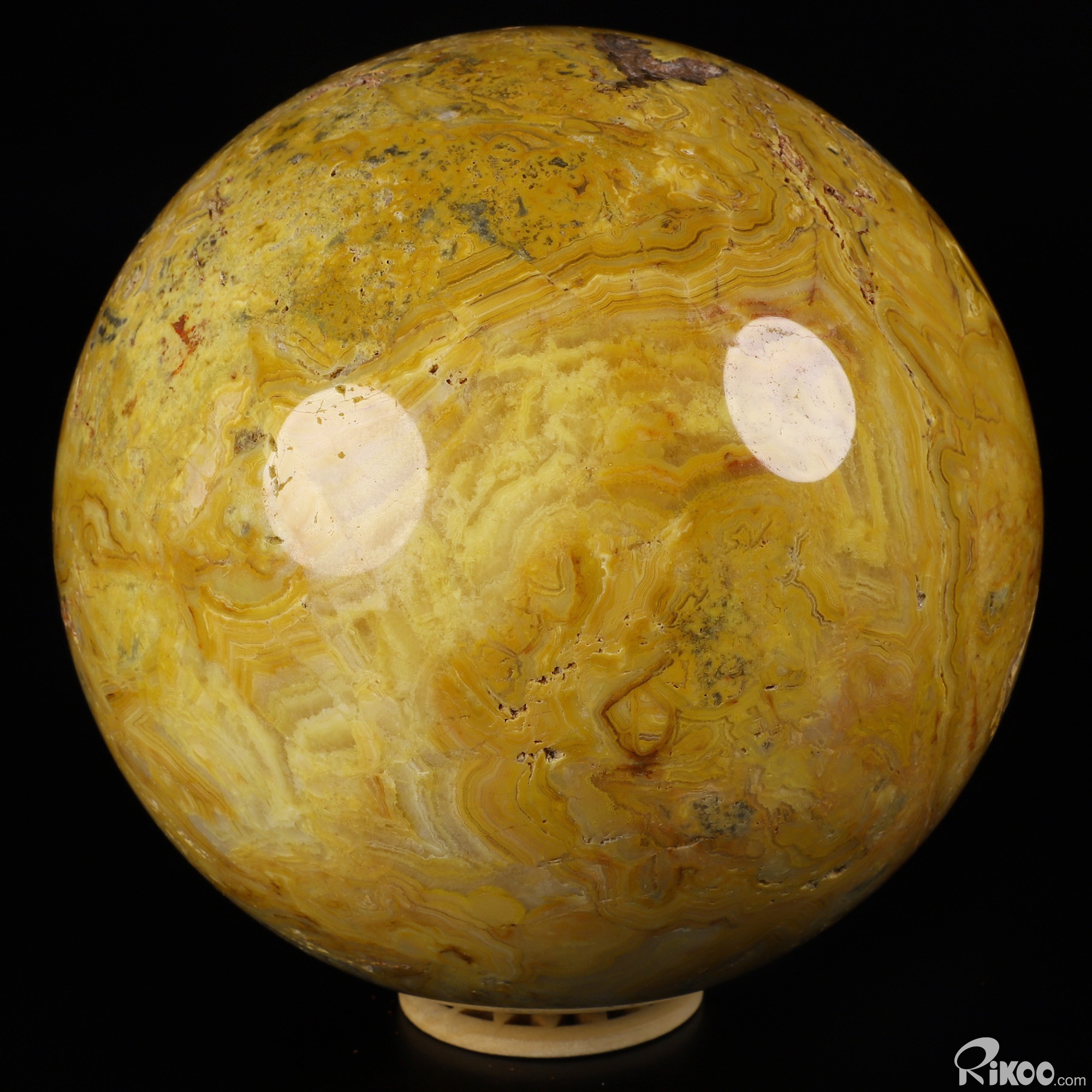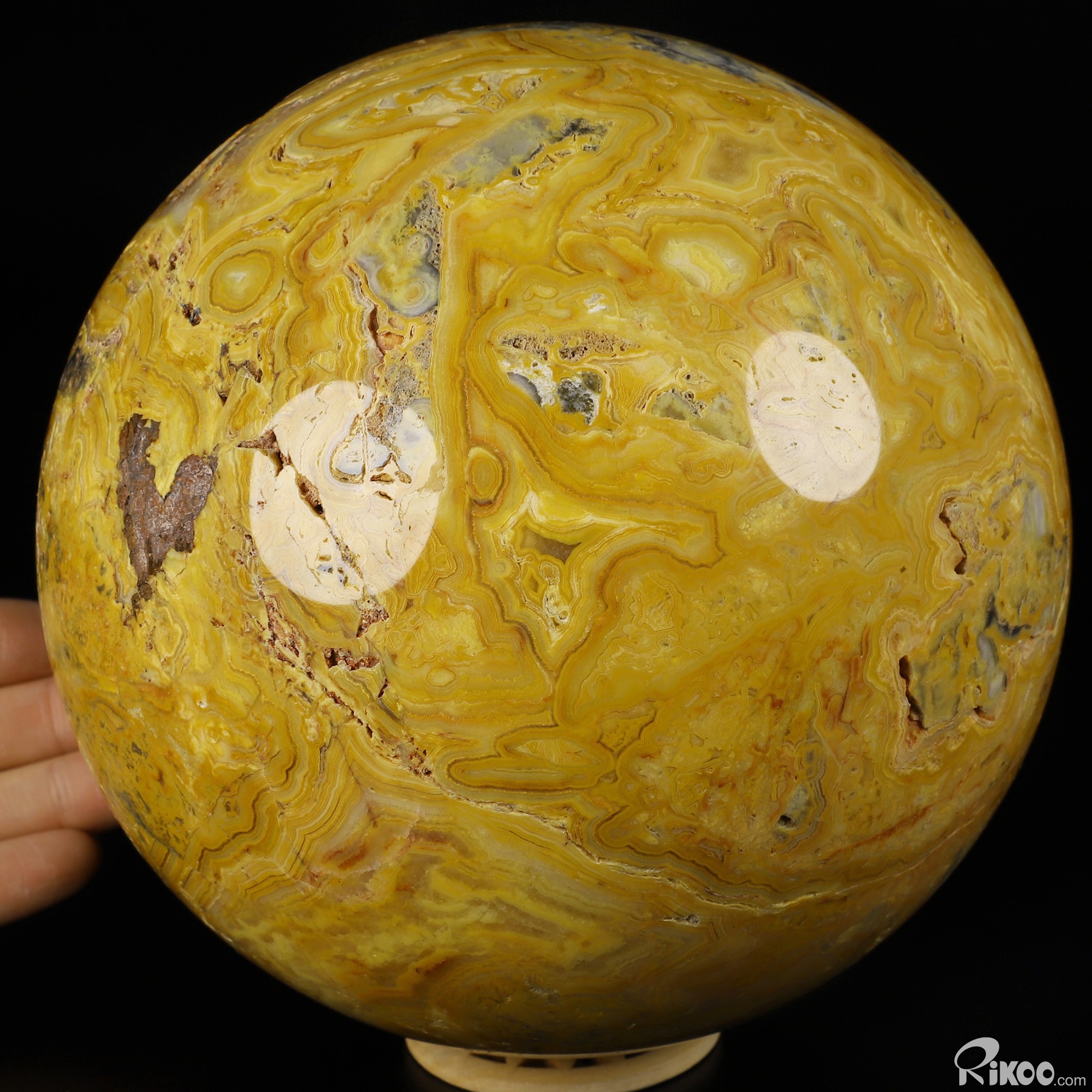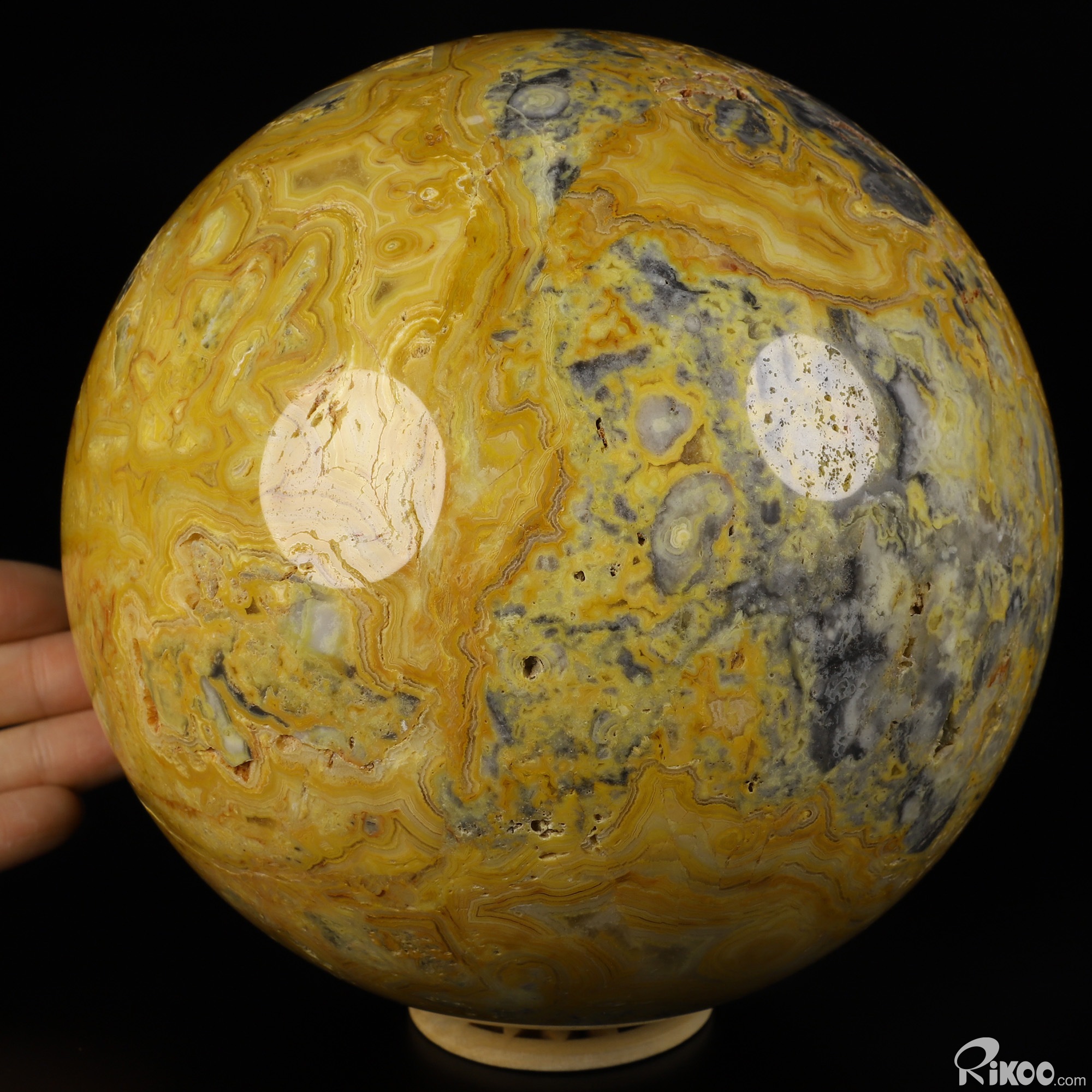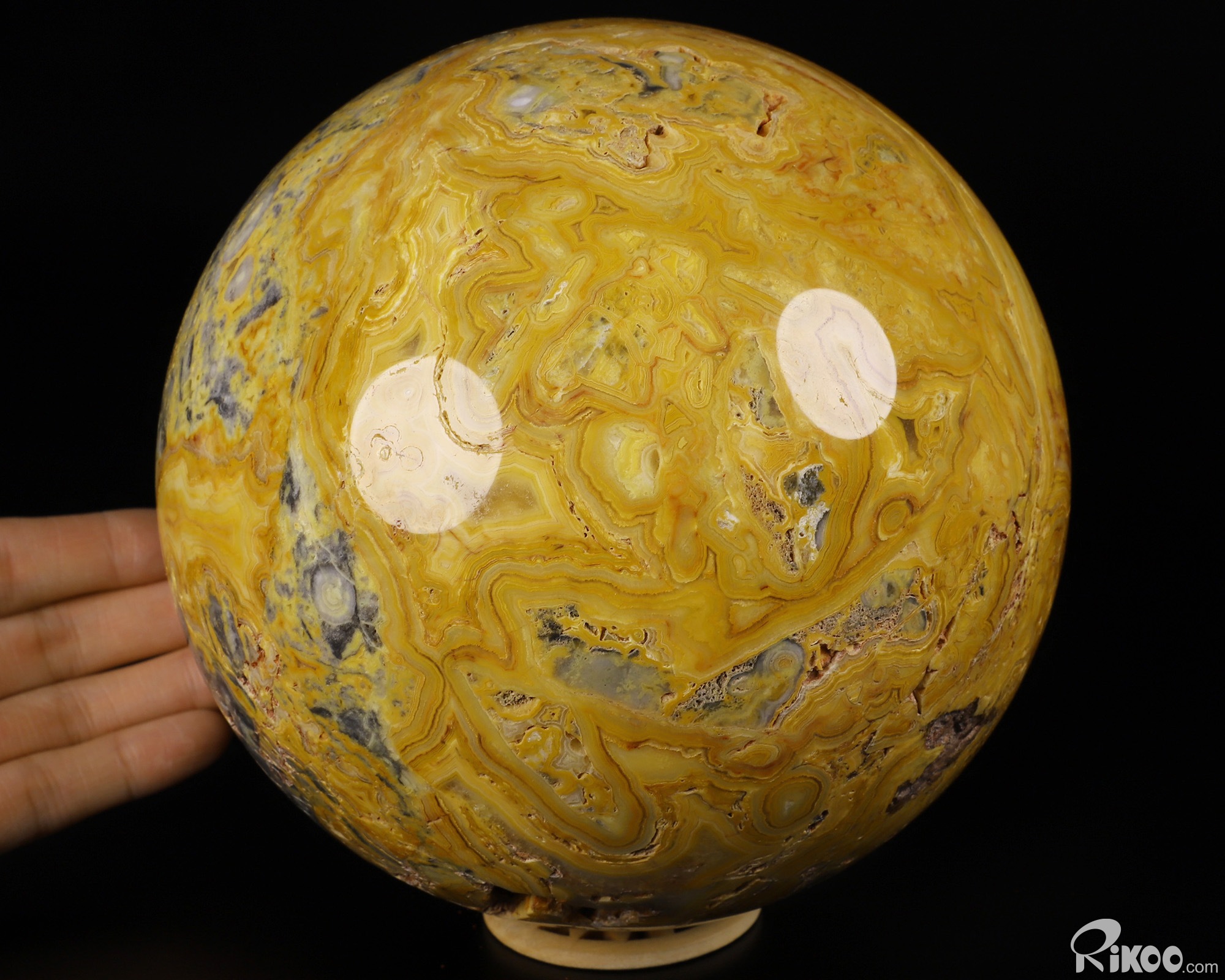 You are looking at a Crazy Lace Agate Ball. The Ball is 5.9 inches long from front to back.
