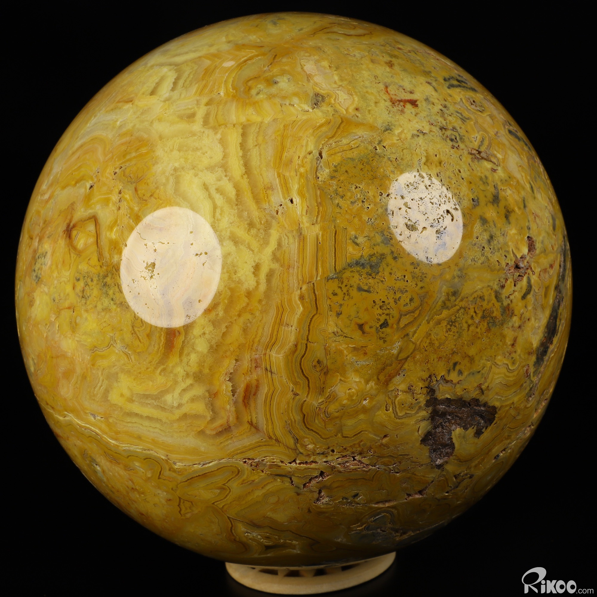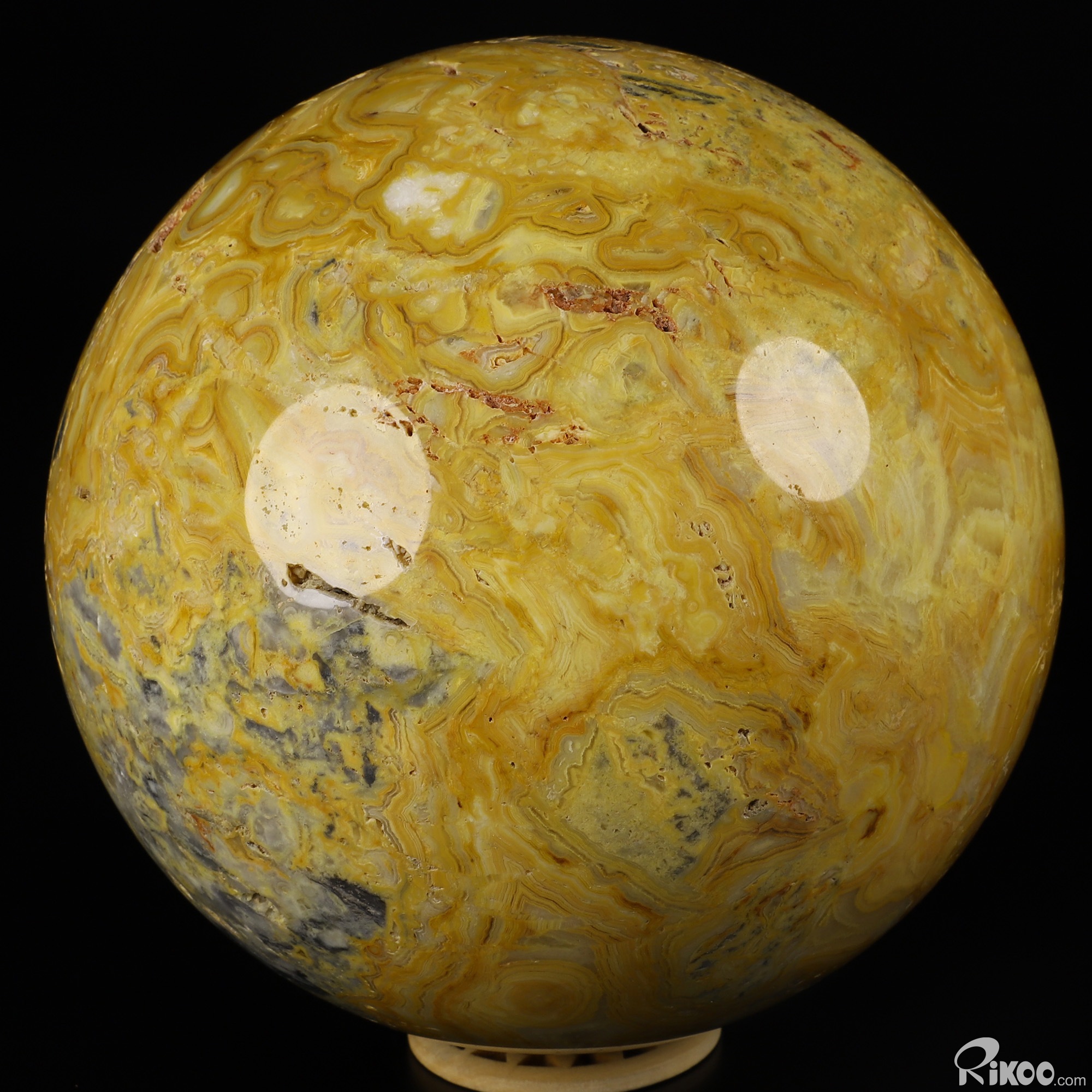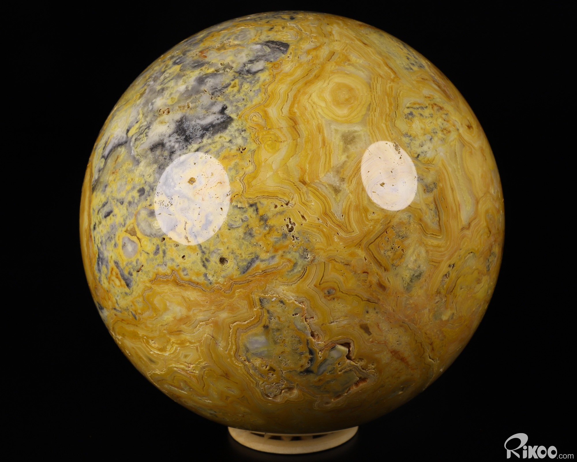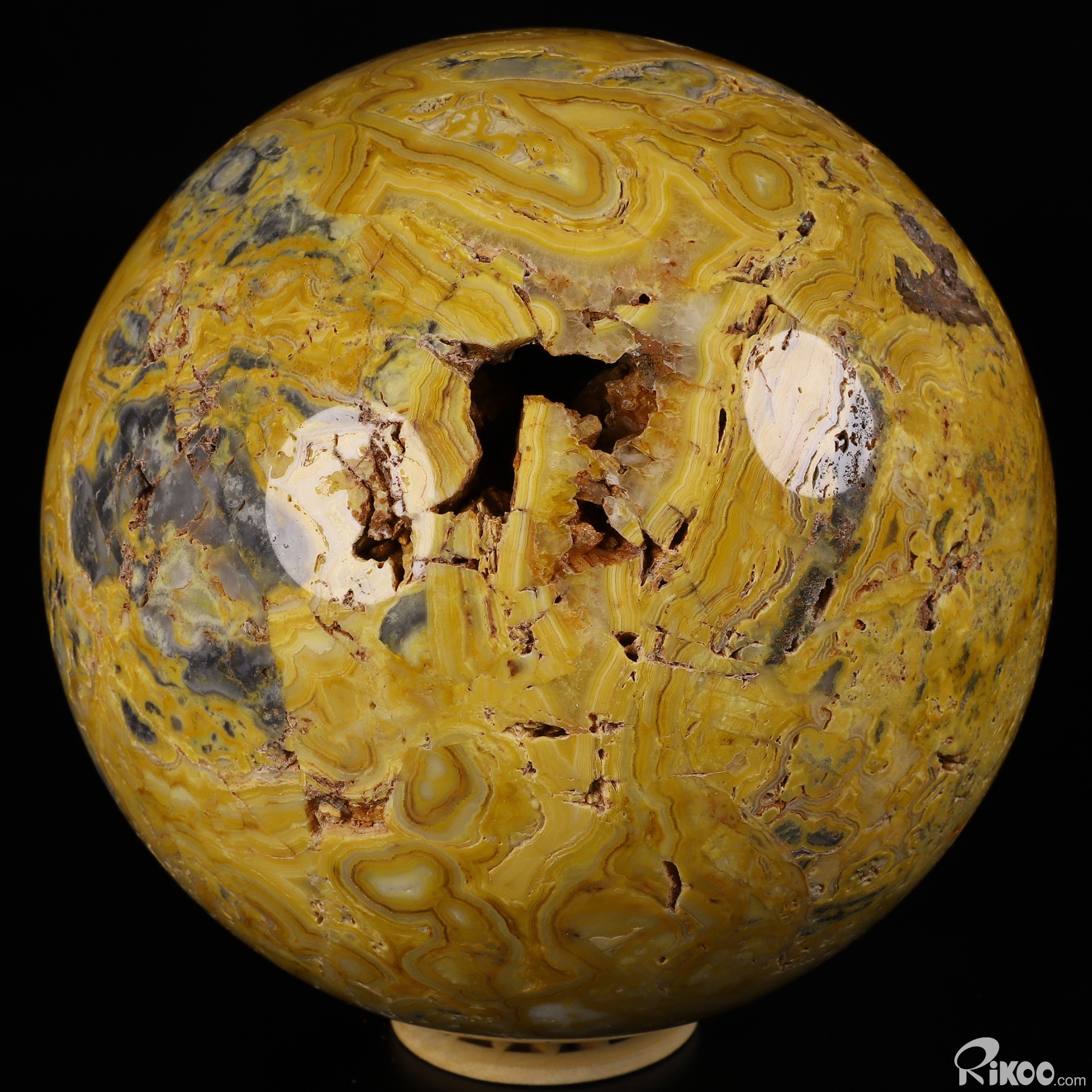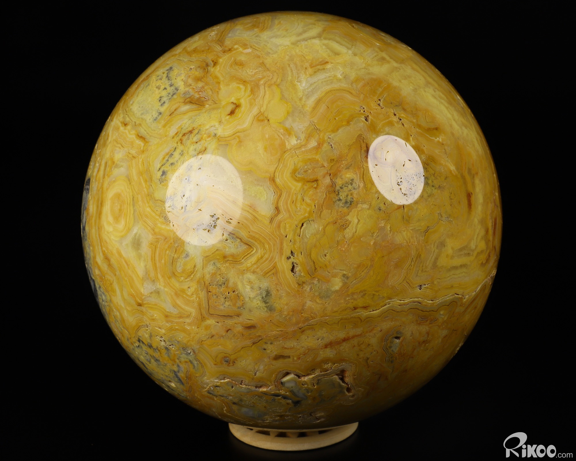 You are looking at a Crazy Lace Agate Ball. The Ball is 5.9 inches long from front to back.