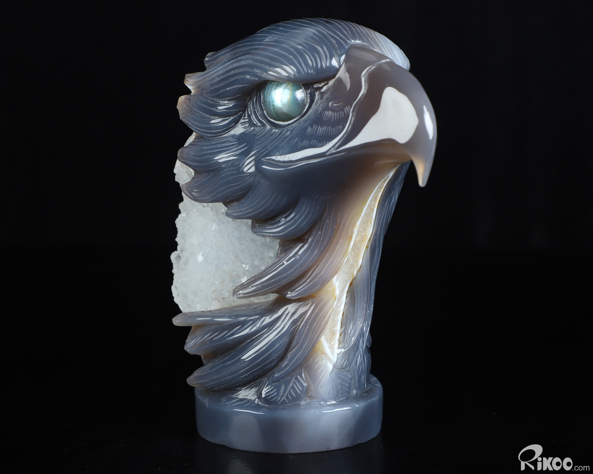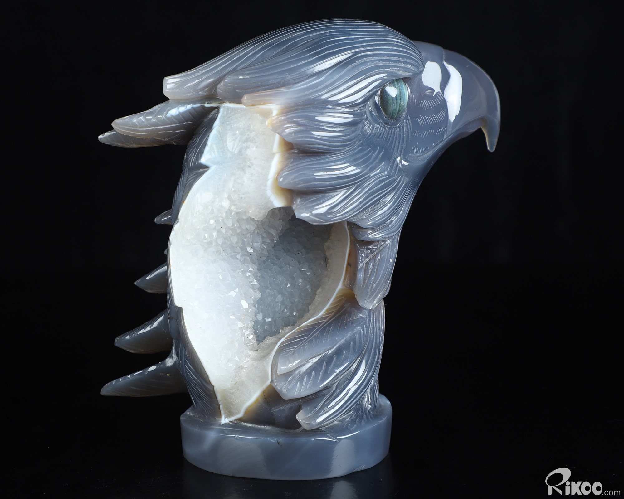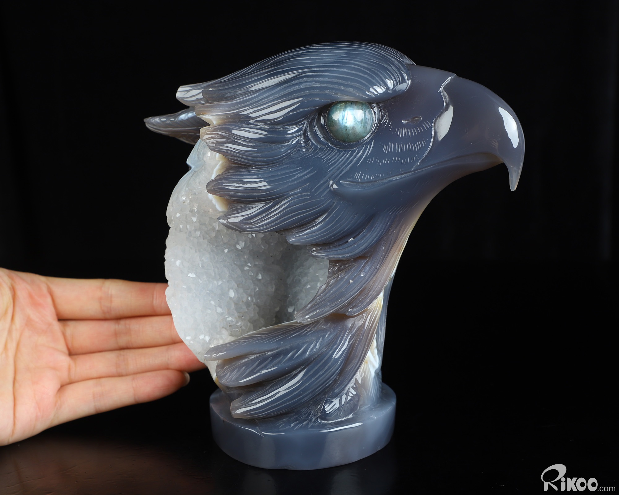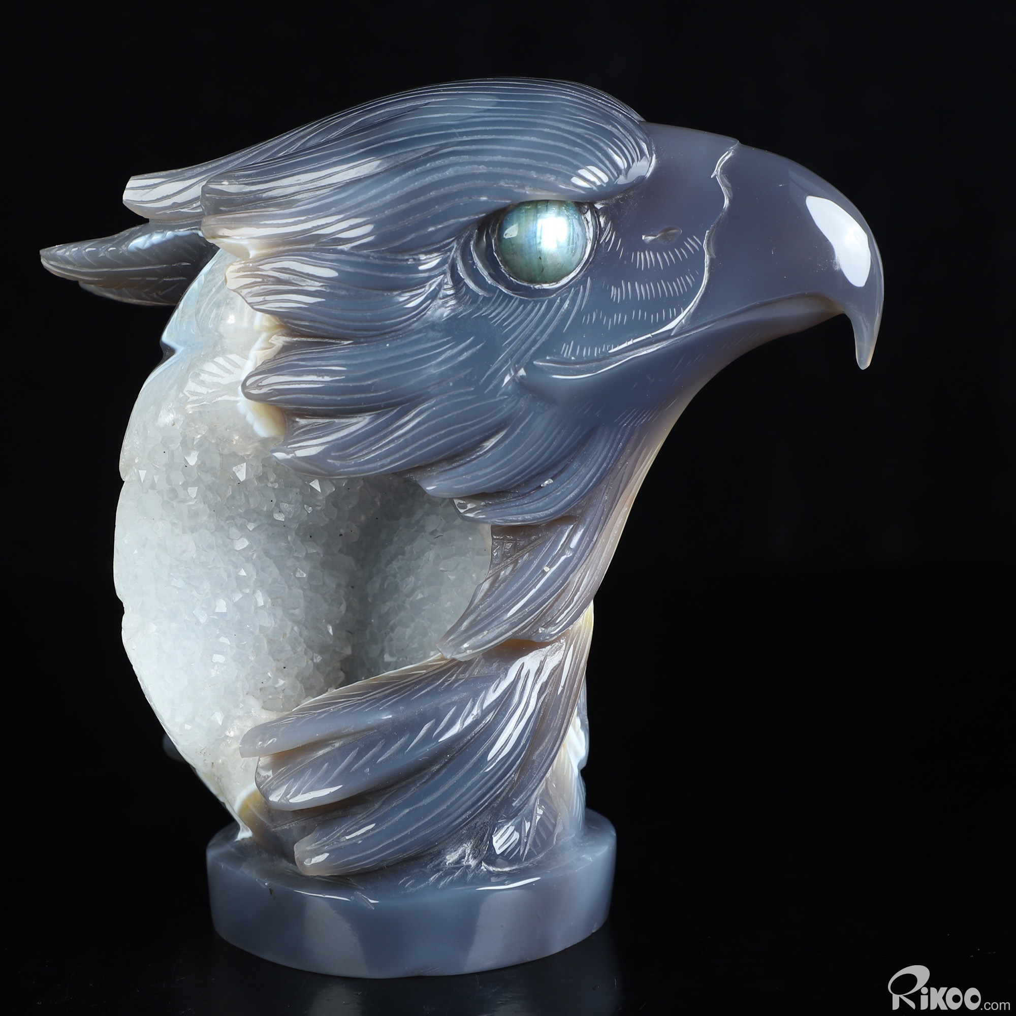 6.3" Agate Geode Hand Carved Crystal Eagle and Labradorite Eyes Sculpture, Crystal Healing