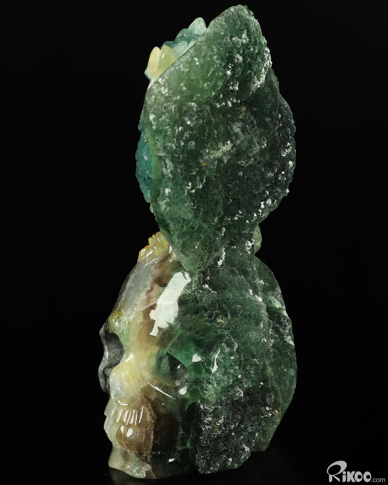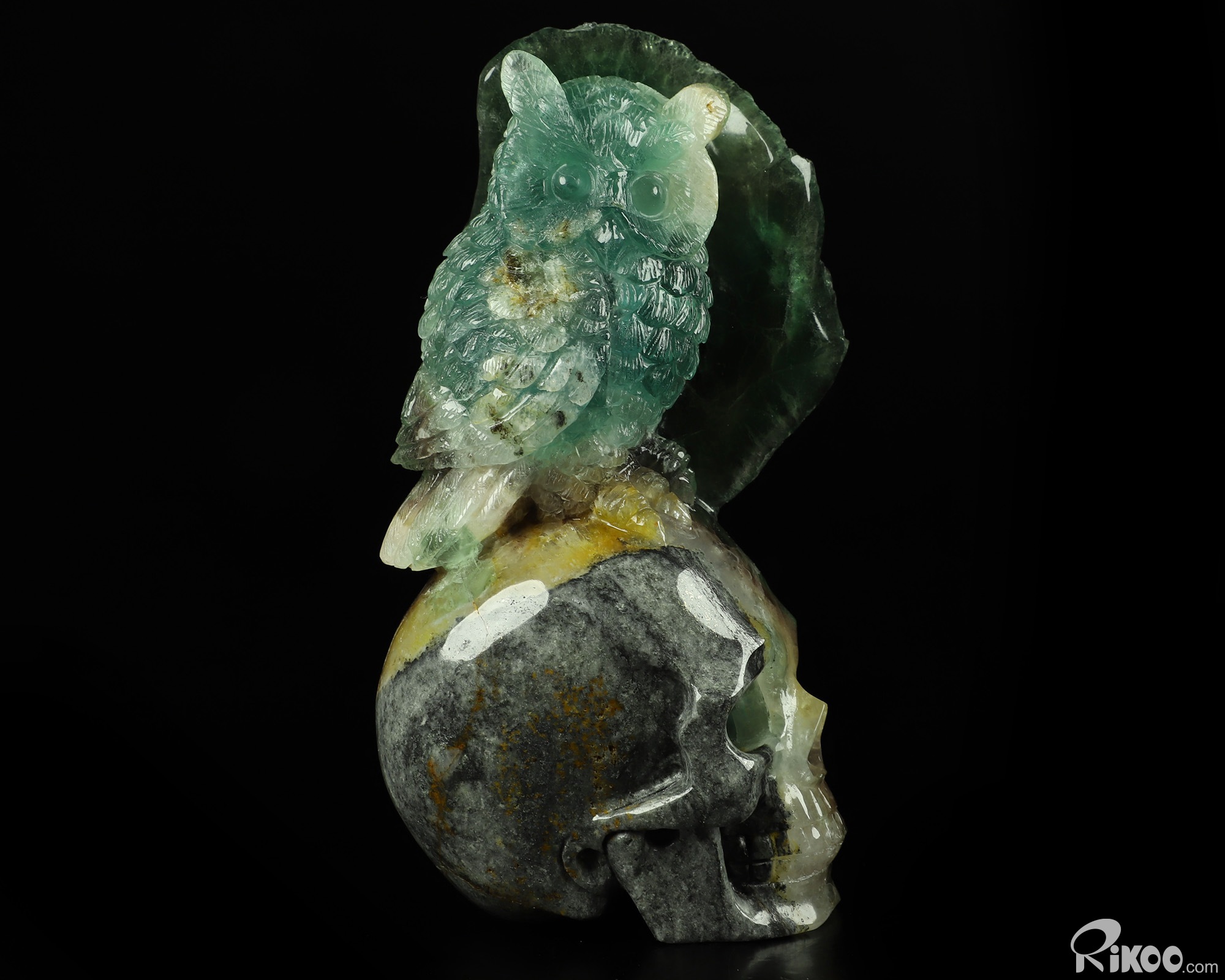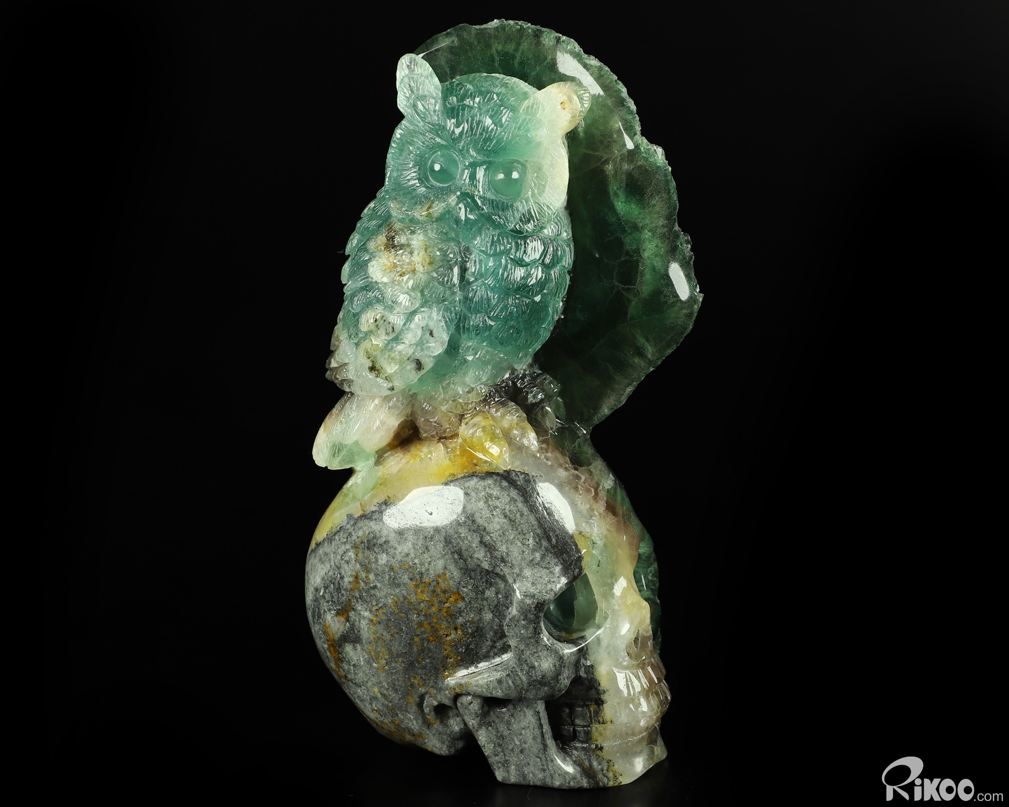 6.4" Fluorite Carved Crystal Owl & Skull Sculpture, Realistic, Crystal Healing