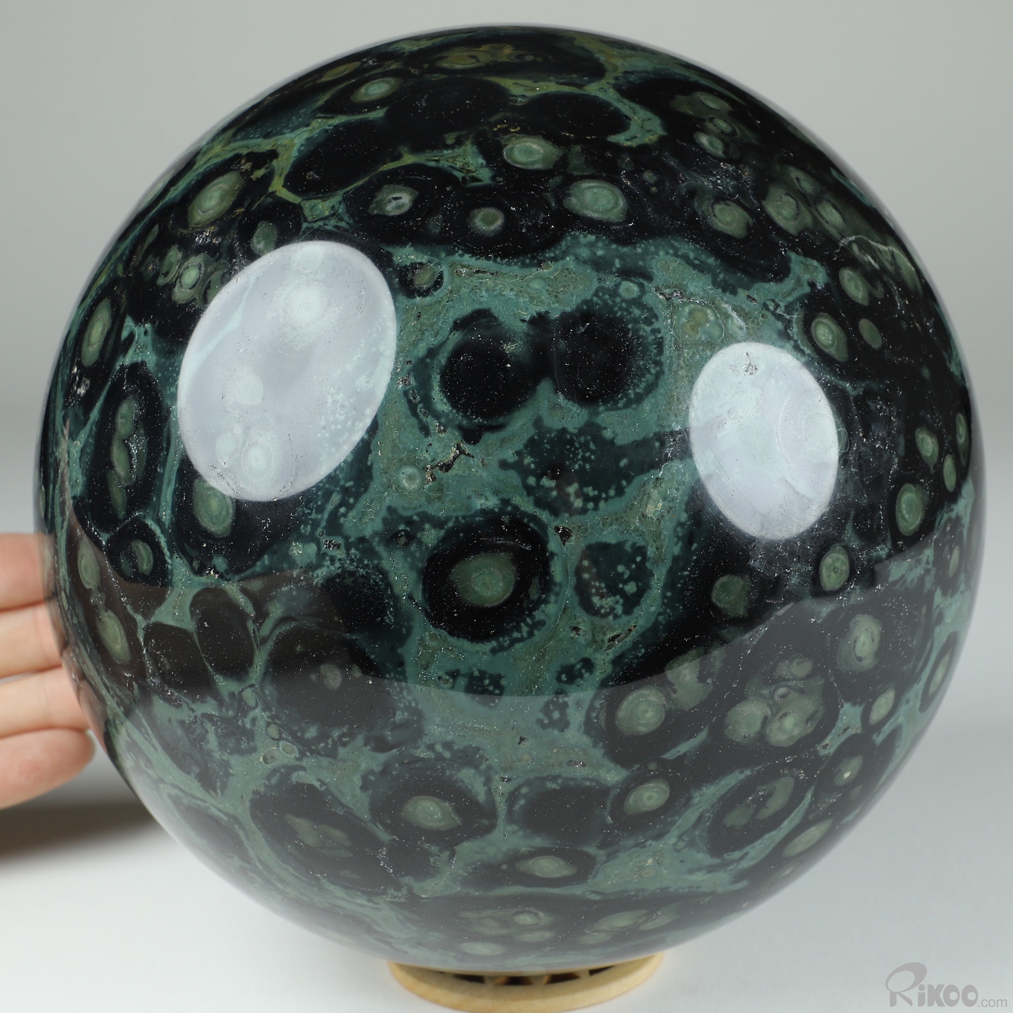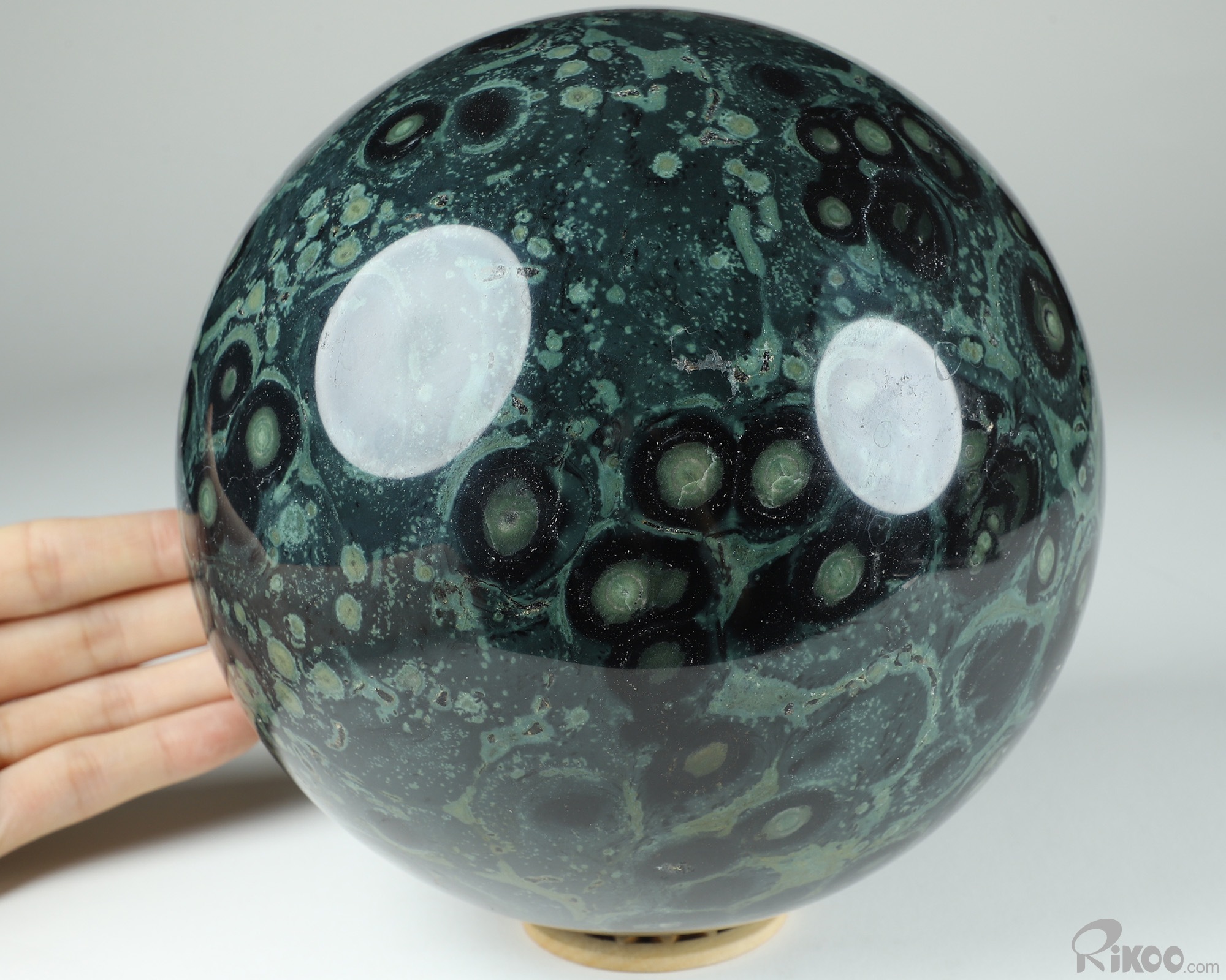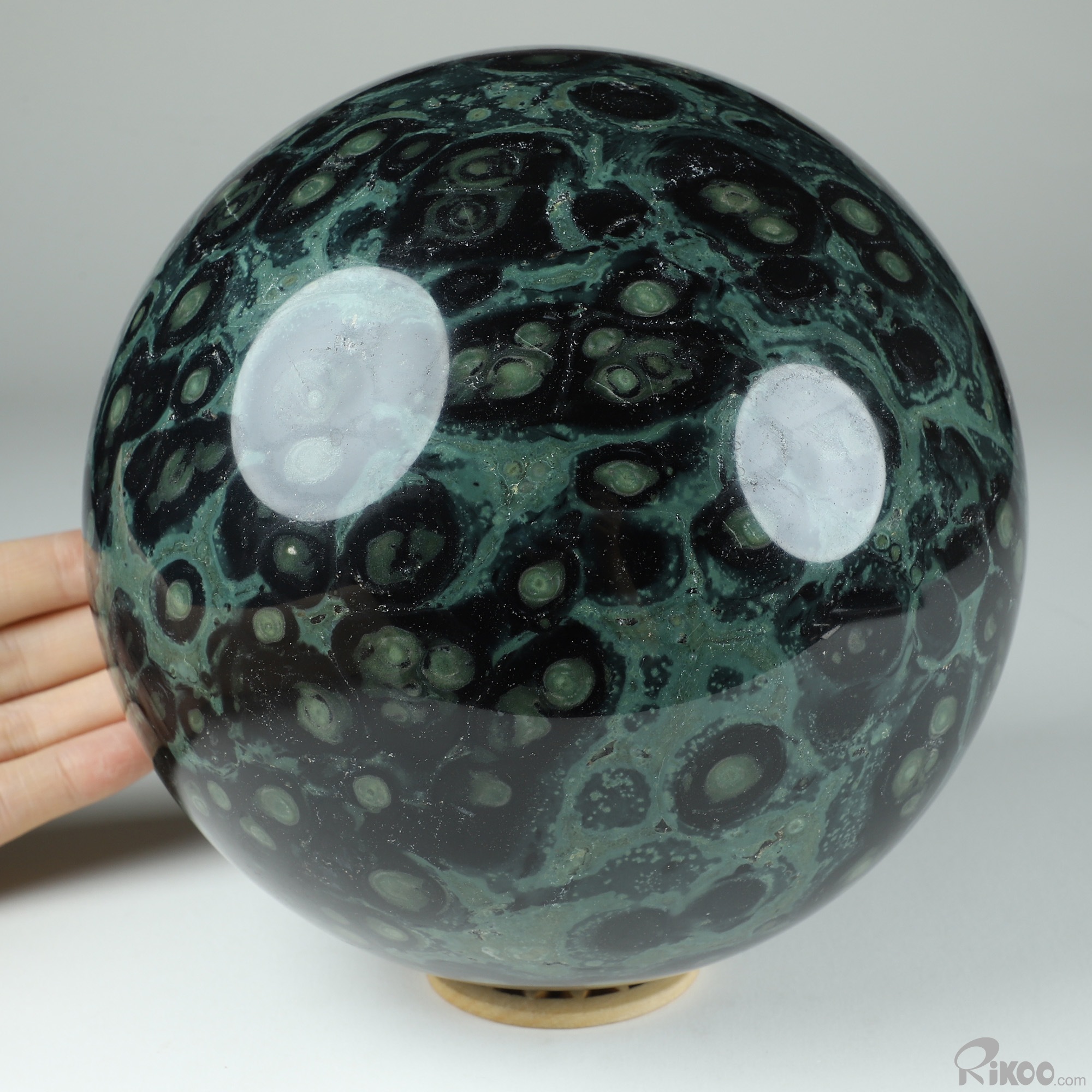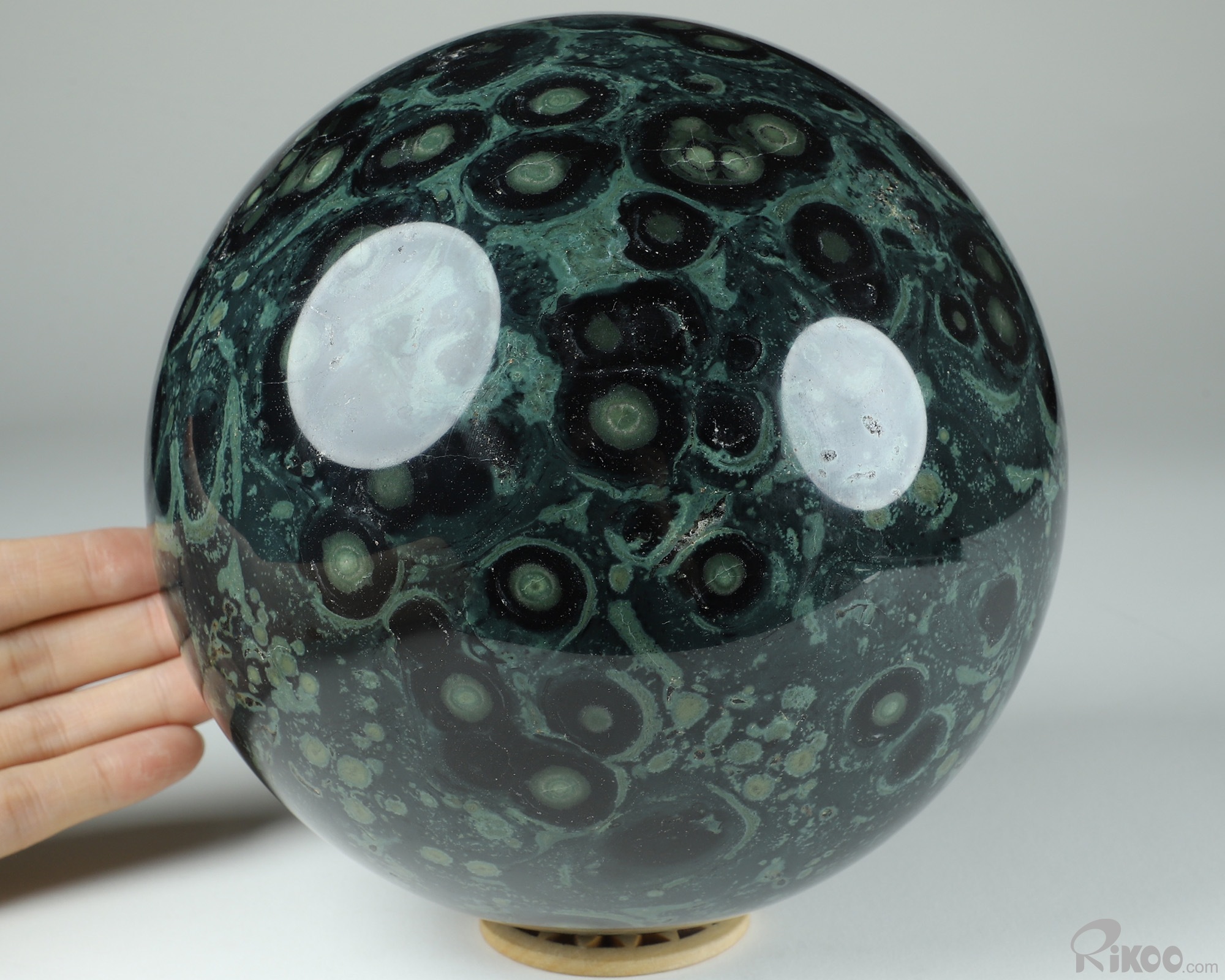 You are looking at a Kambaba Jasper Ball. The Ball is 6.4 inches long from front to back.
