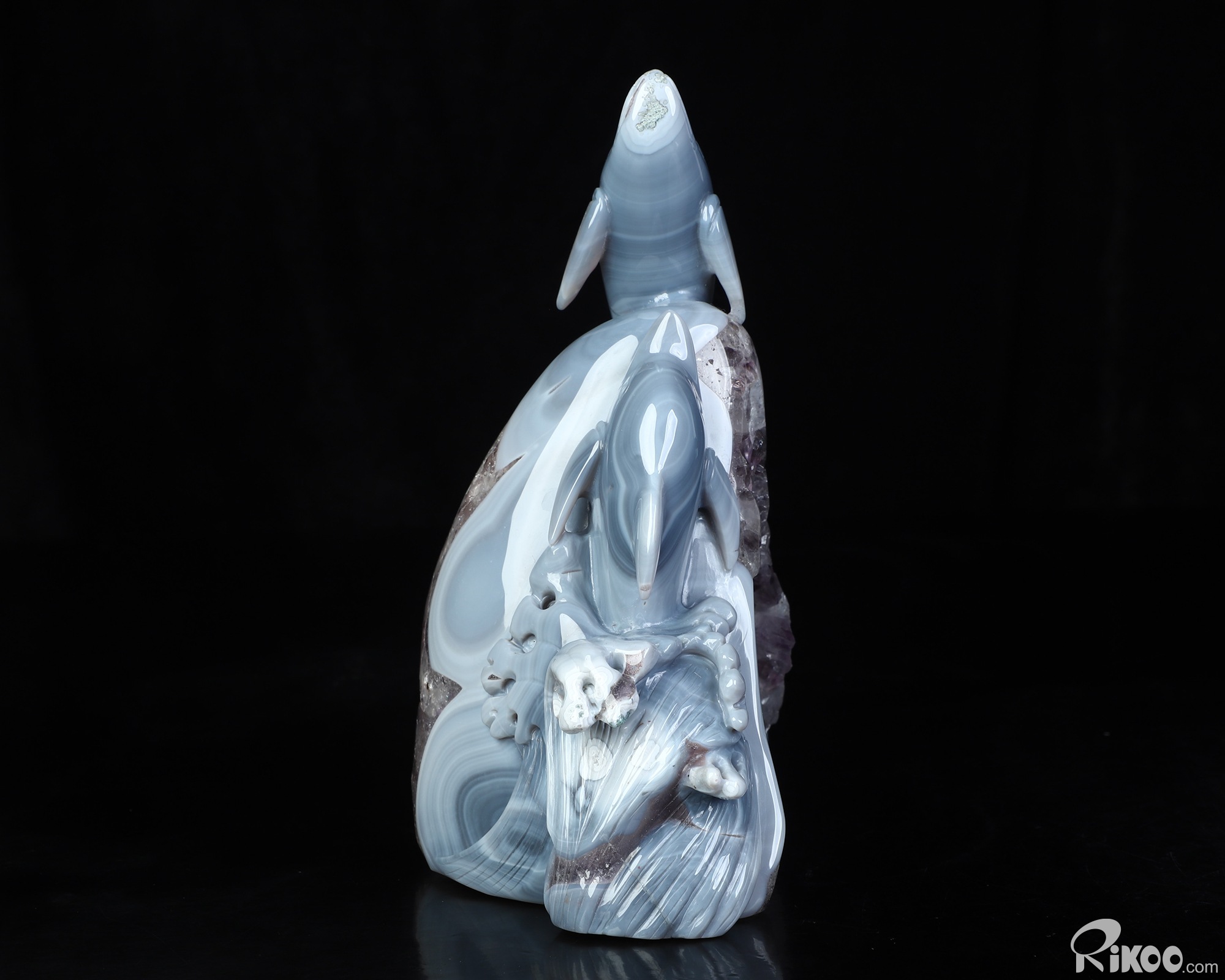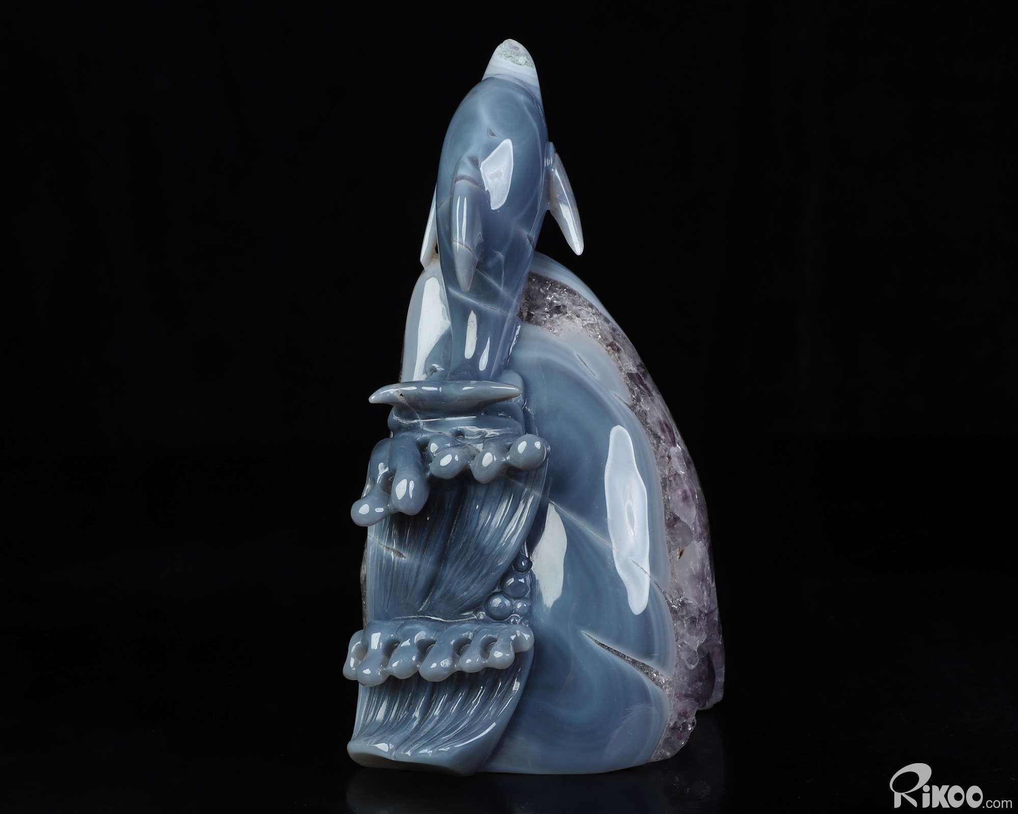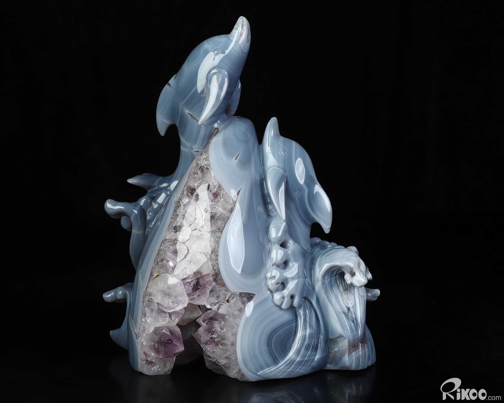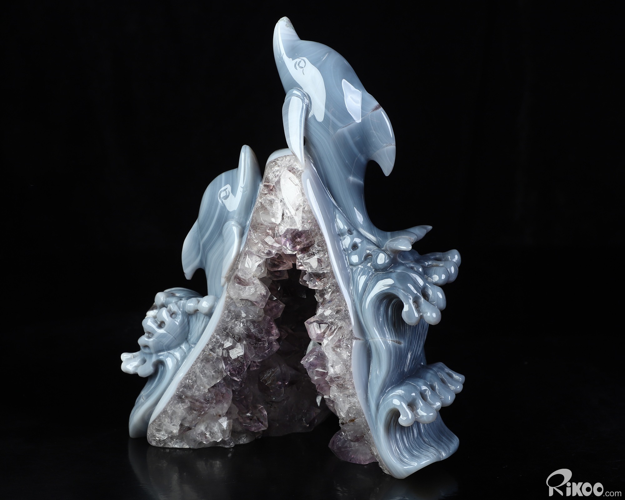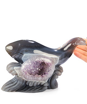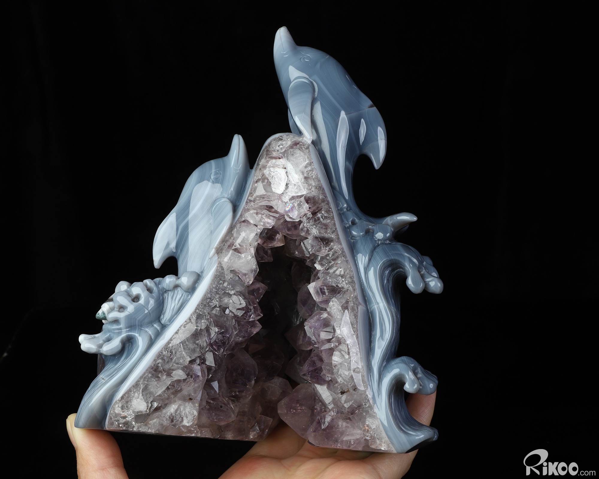 6.6" Agate Amethyst Geode Hand Carved Crystal Dolphin Sculpture, Crystal Healing