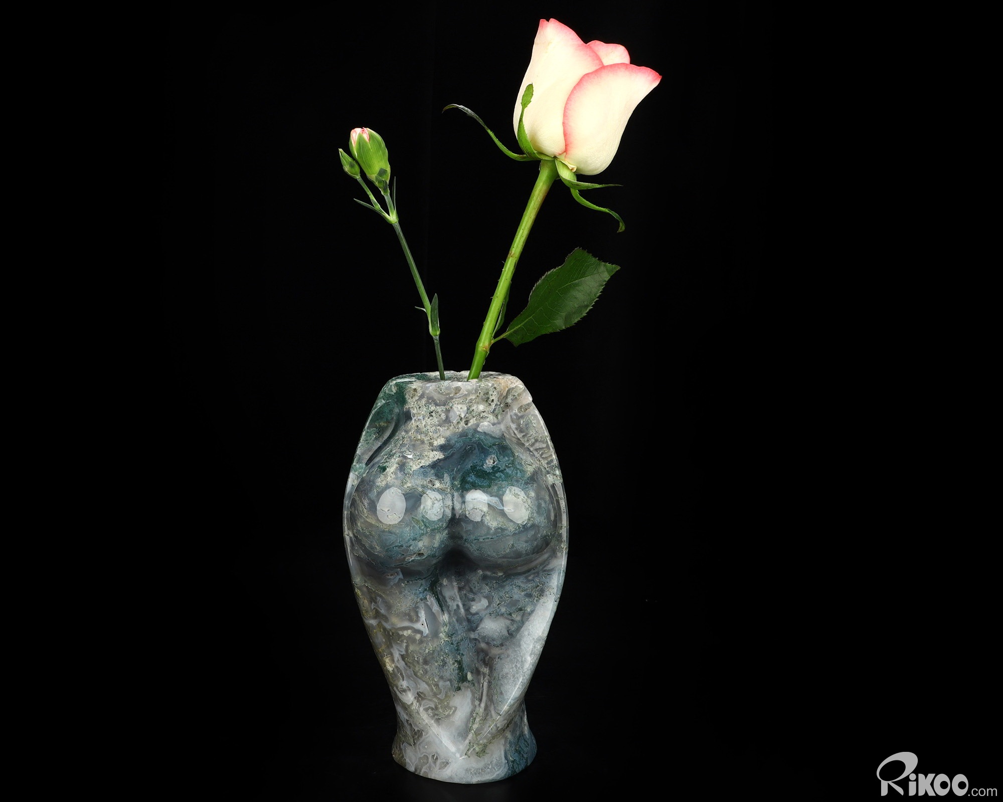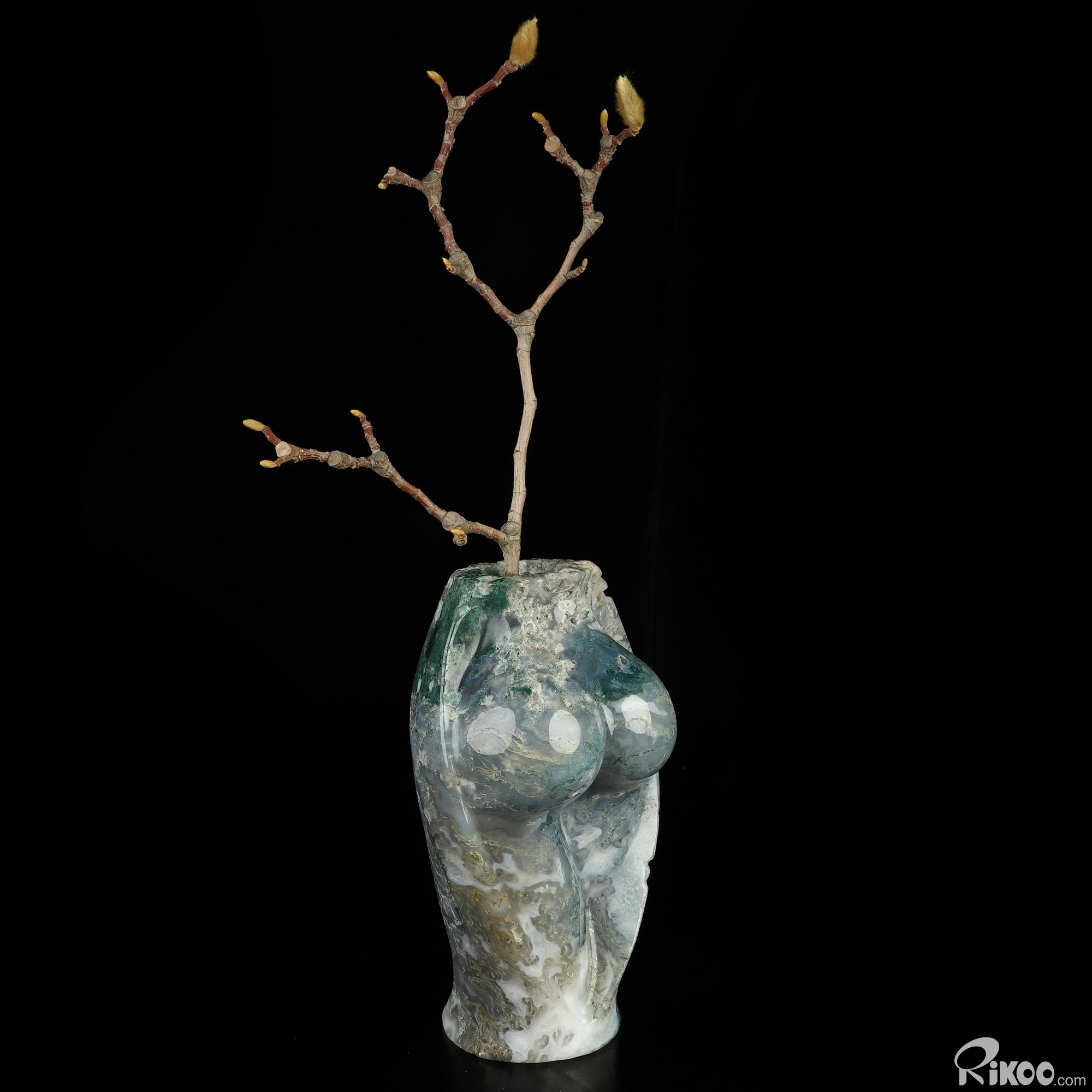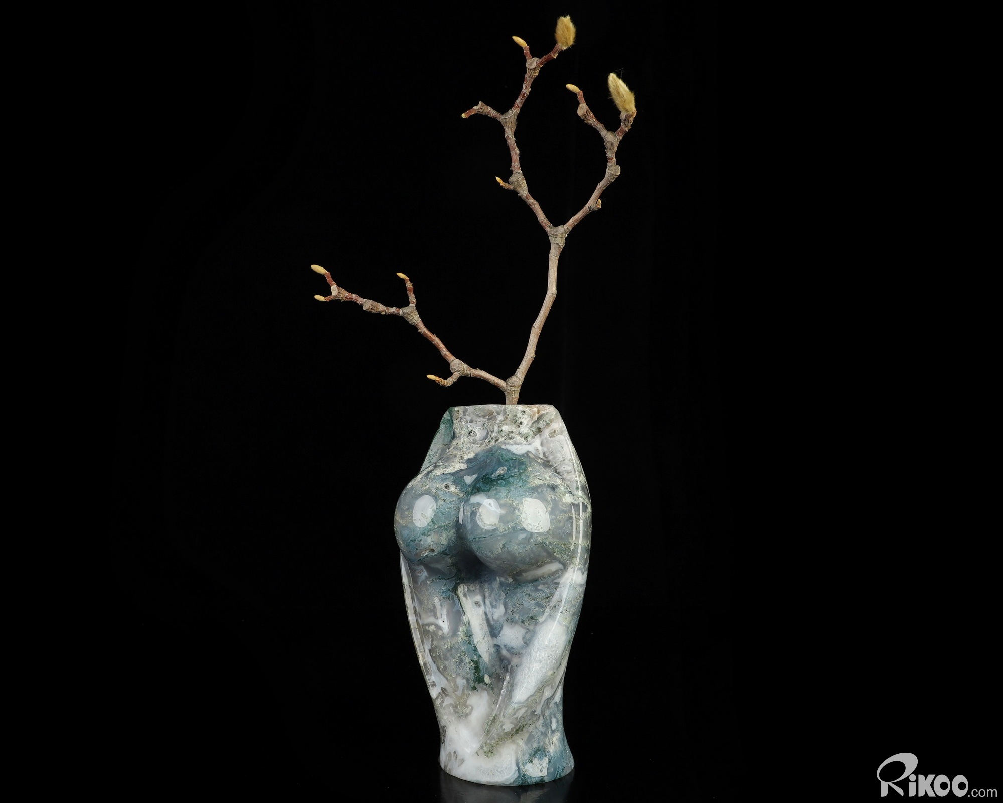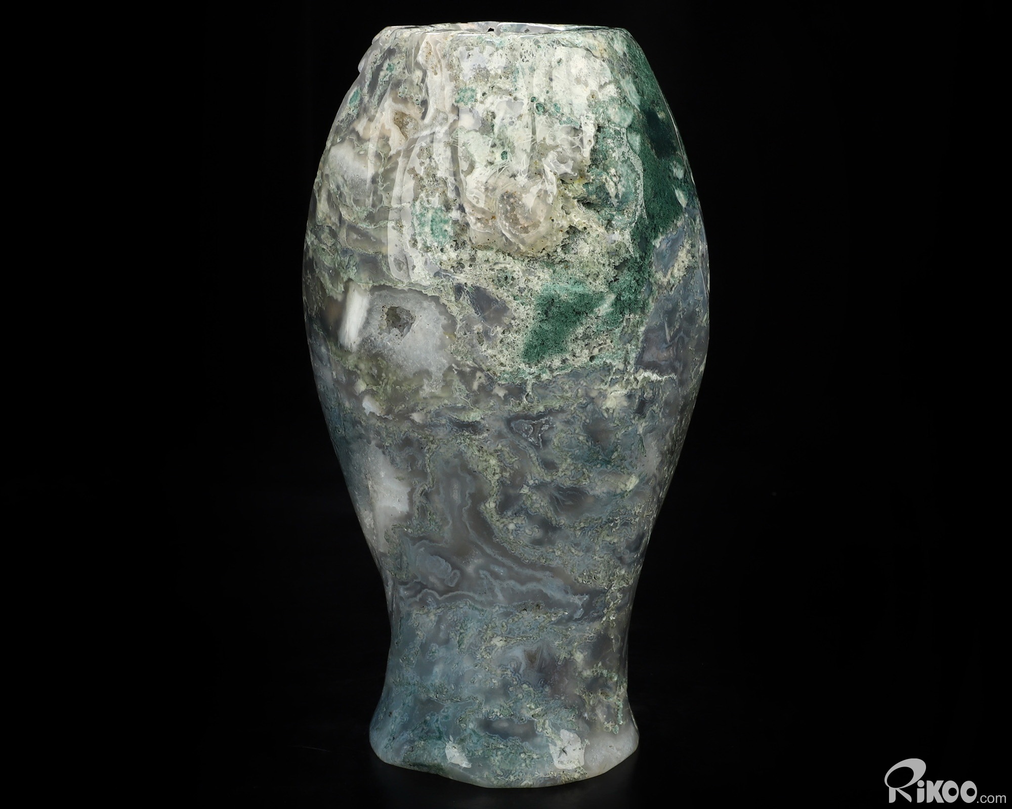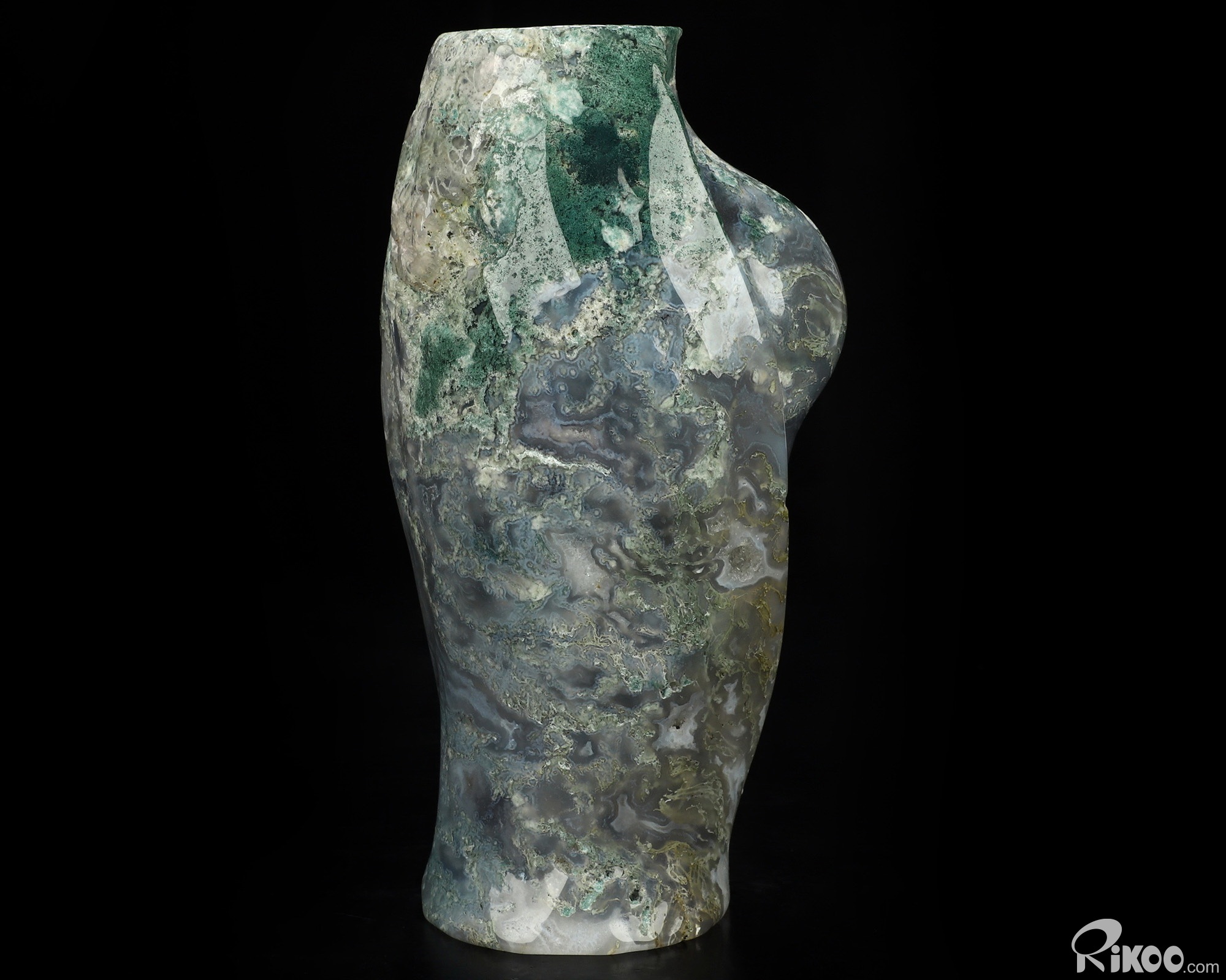 This vase with limited functionality is mainly for display.Connects one to Nature. Translucent, transparent agate containing inclusions of minerals that look like moss or foliage. Improves ego and self-esteem, emotional balance and strengthens positive personality traits. Allows one to see all the beauty one's eyes touch.