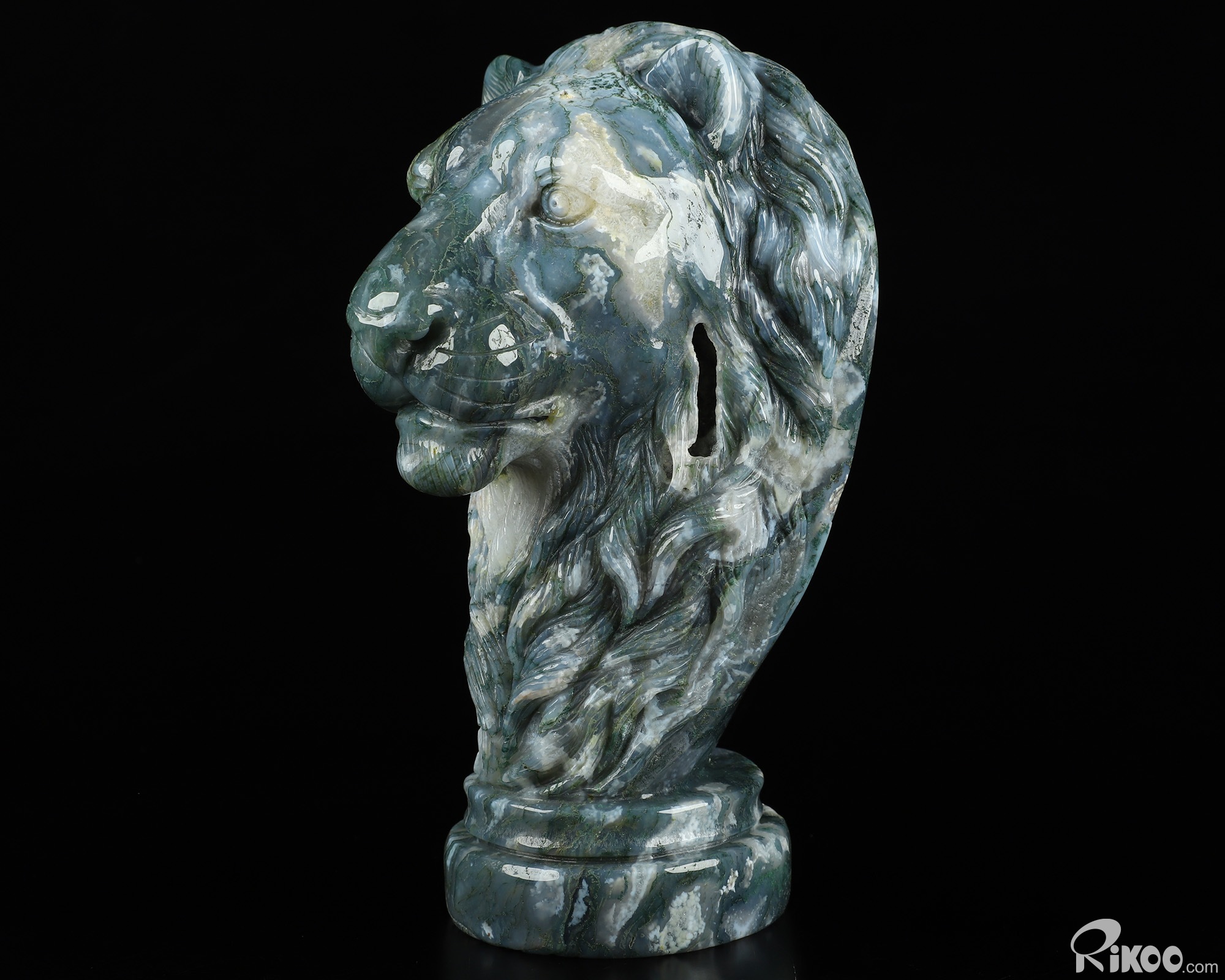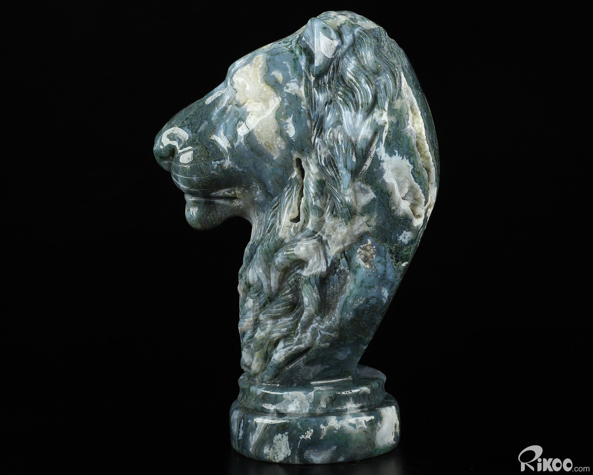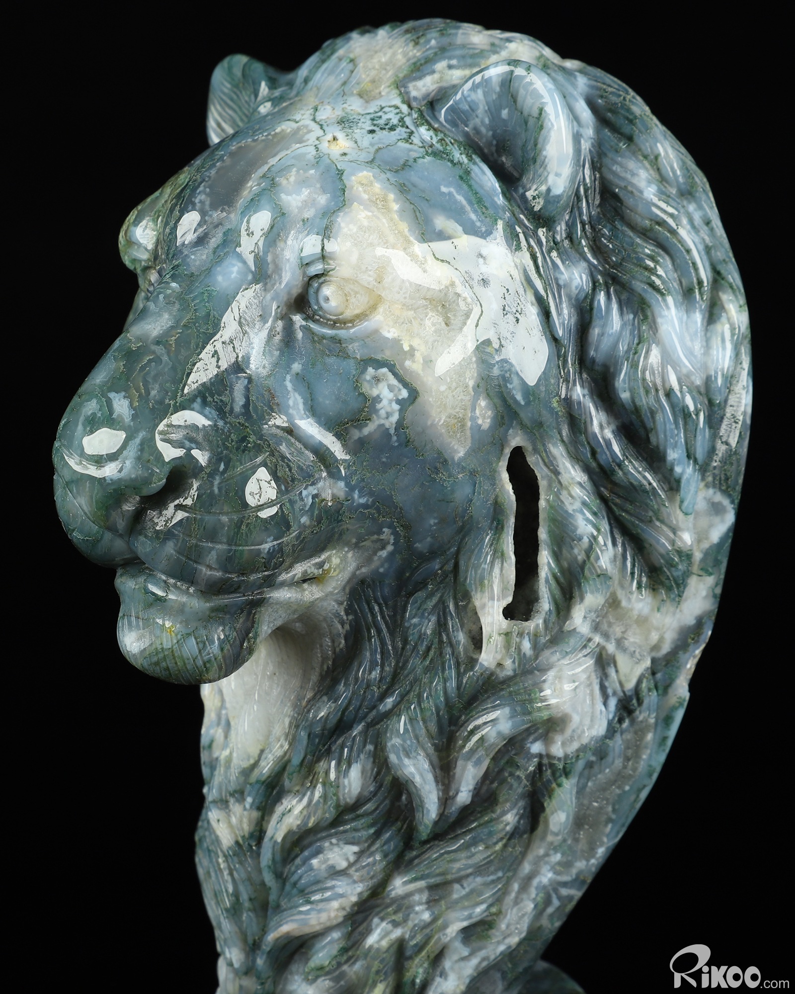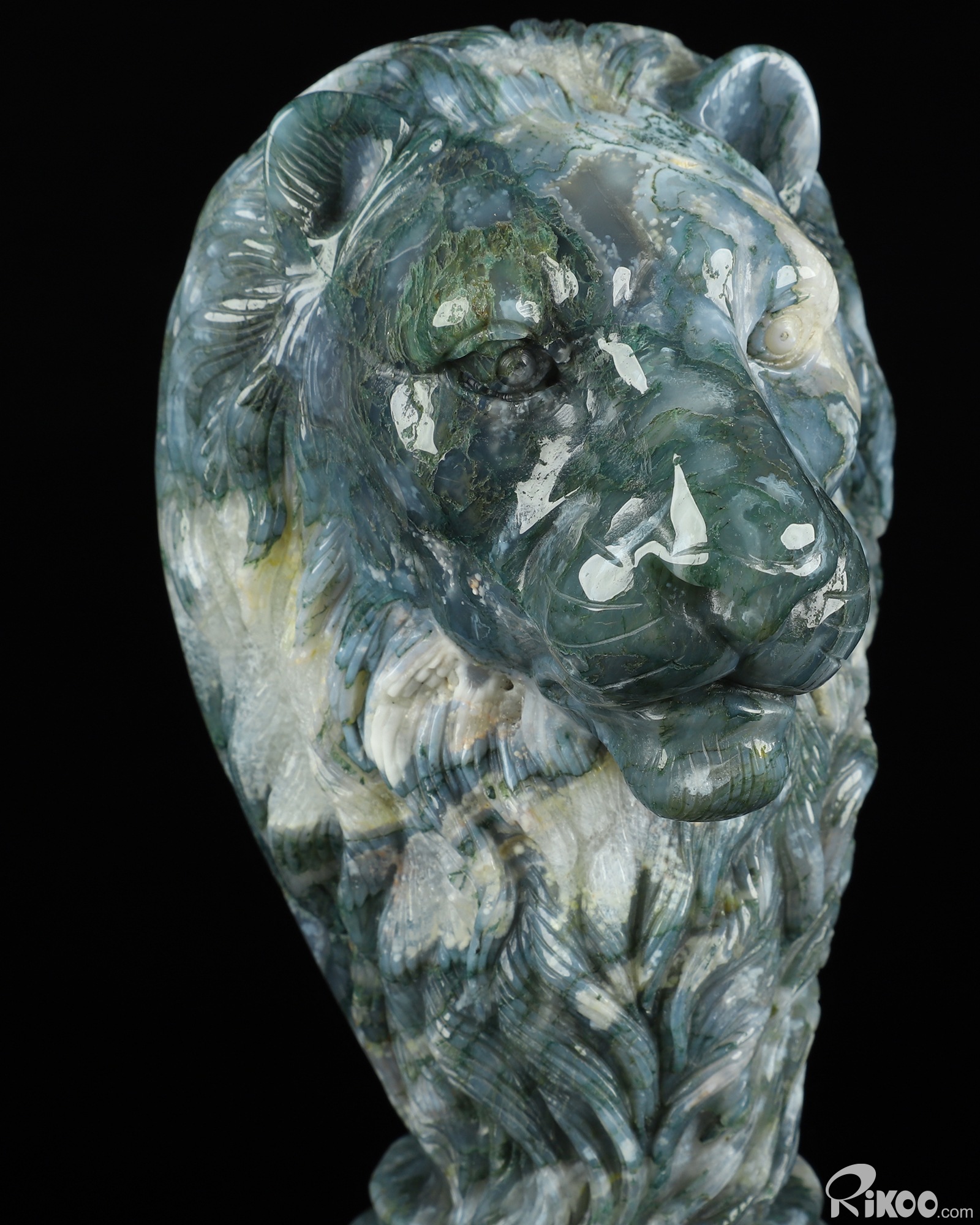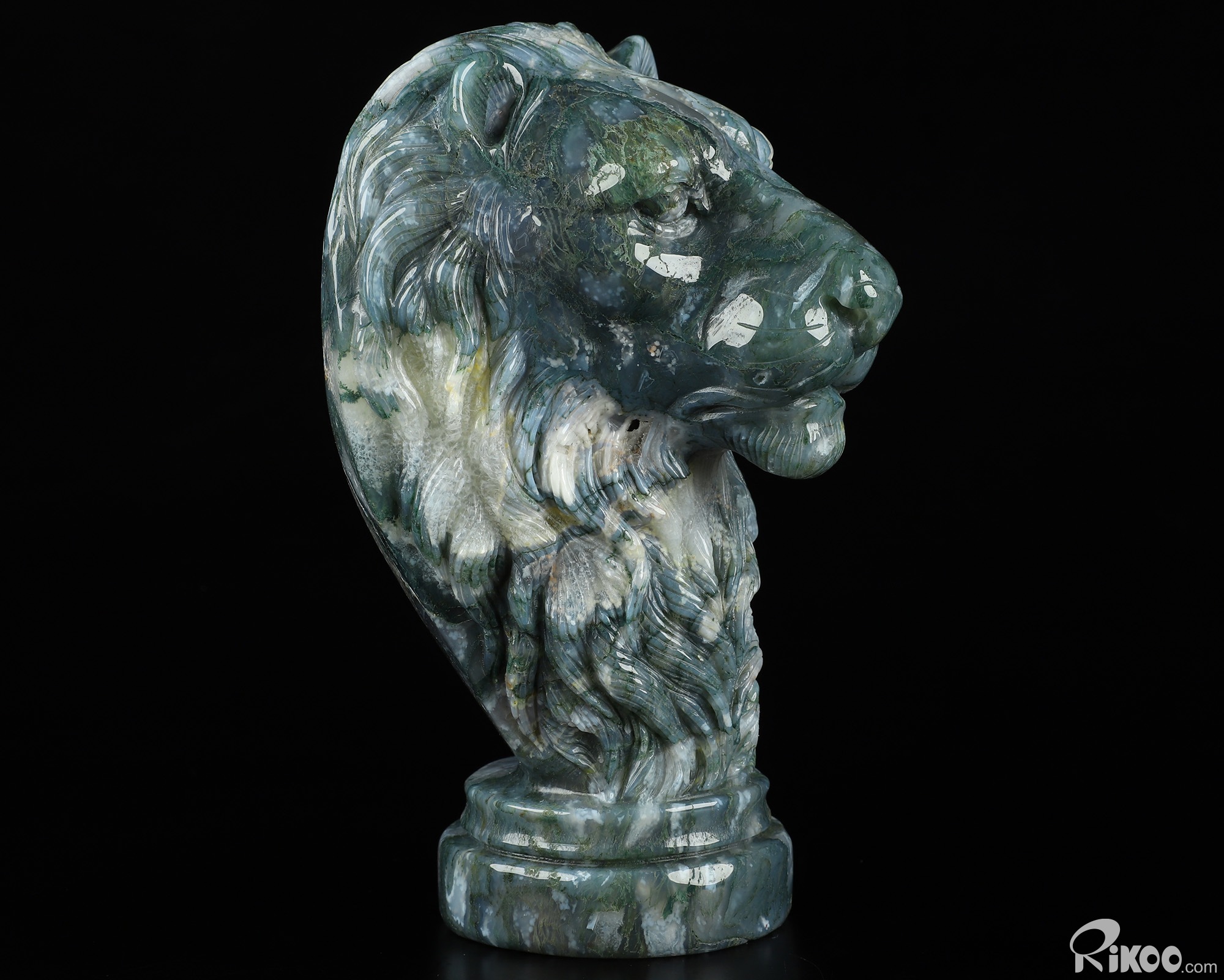 You are looking at a Green Moss Agate Lion. The lion is 6.8 inches long from front to back.